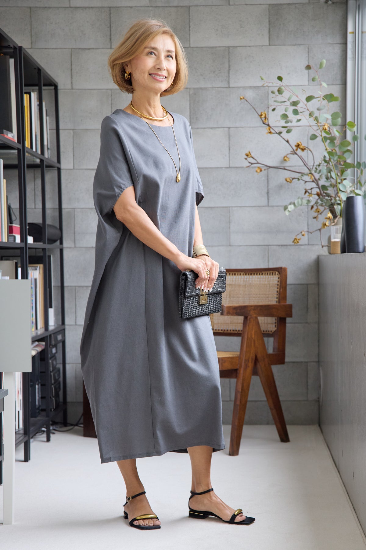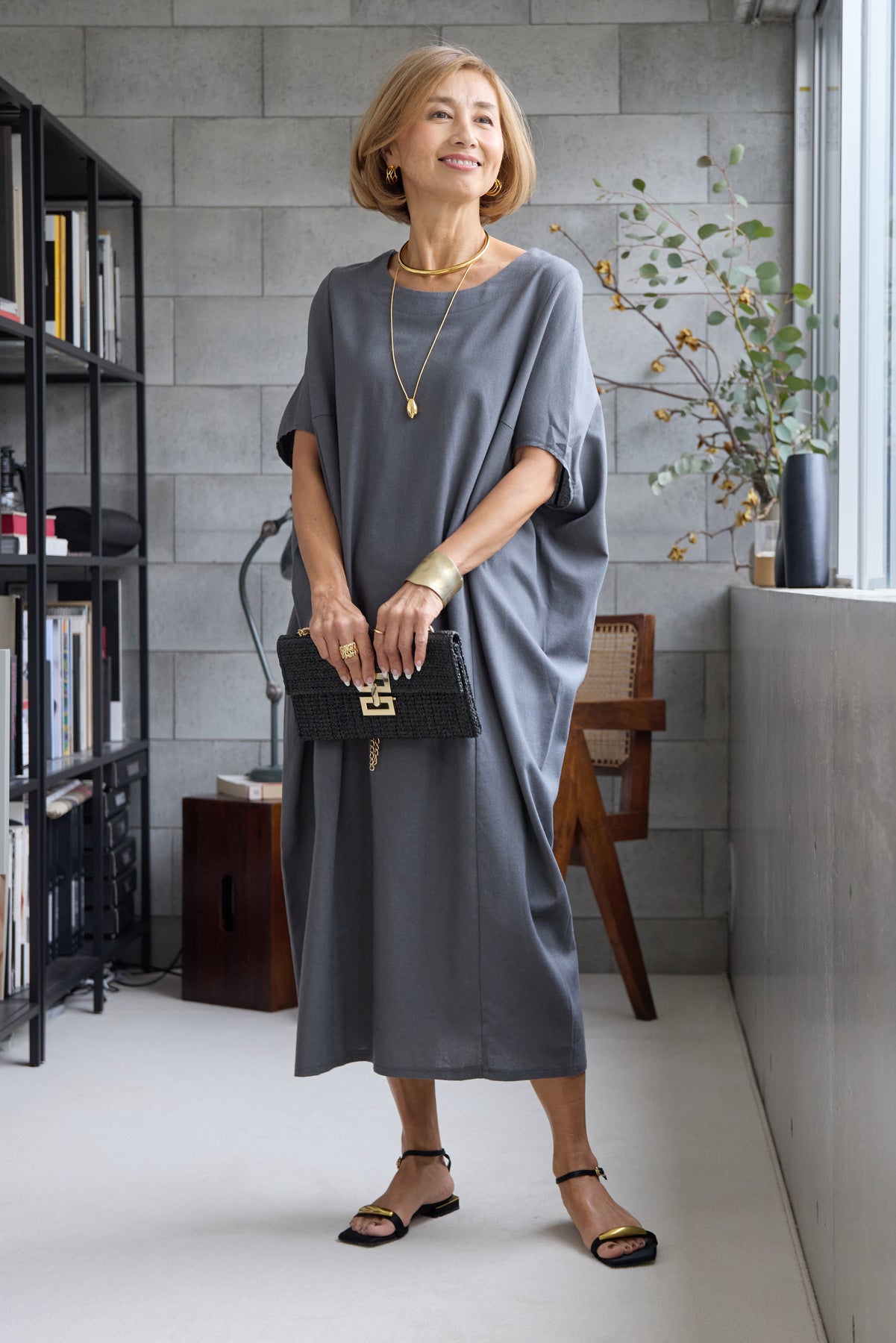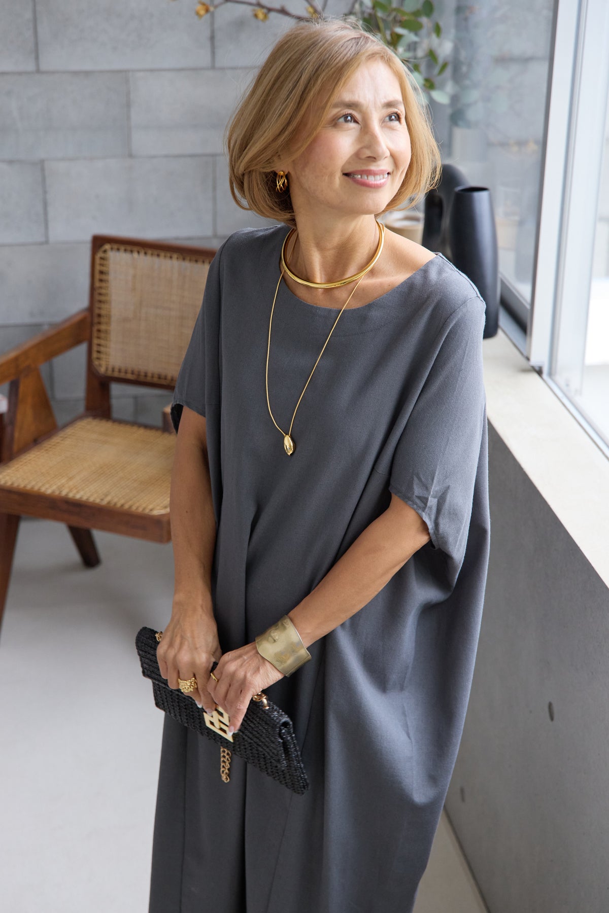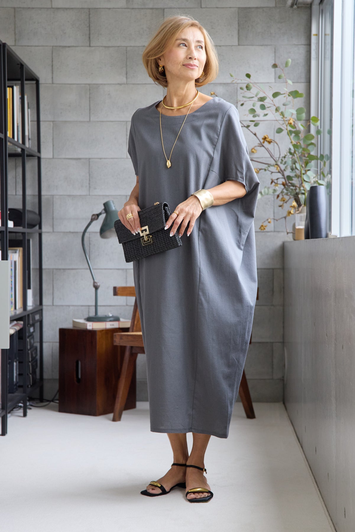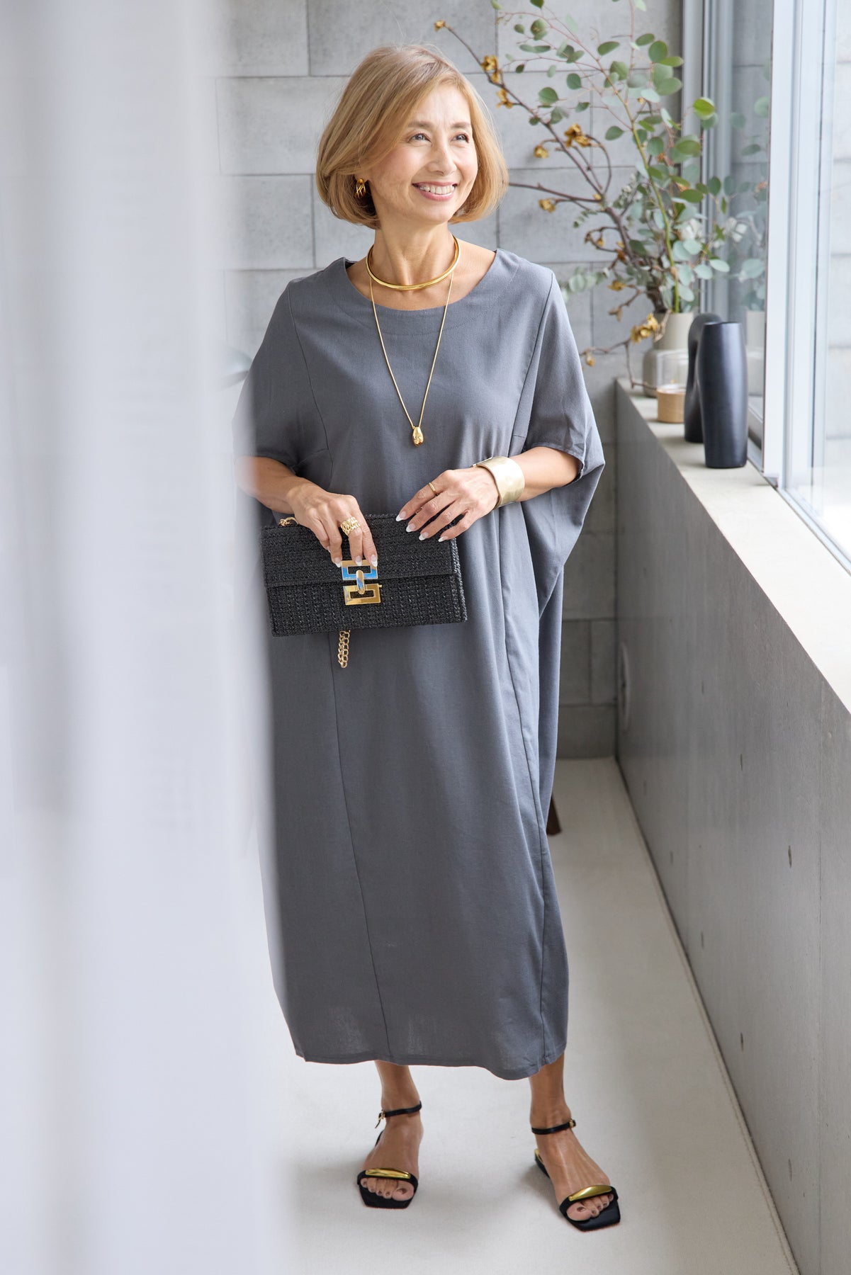 やわらかな丸みを描くコクーンシルエットが印象的な、リネン素材のロングワンピース。身体のラインを拾いにくいゆったりとしたフォルムながら、落ち感のある生地がすっきりとした縦ラインを演出し、リラックス感と上品さを両立します。首元は開きすぎないボートネックでデコルテをきれいに見せ、肩まわりをやさしく覆う袖デザインが腕まわりをさりげなくカバー。脇線を前に振った立体的な切替とコクーンラインが、シンプルながらニュアンスのあるシルエットを生み出しています。通気性に優れたリネン素材はさらりとした肌触りで、暑い季節も快適な着心地です。