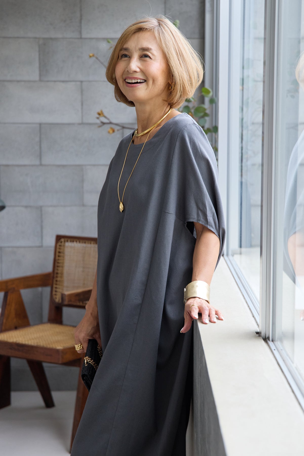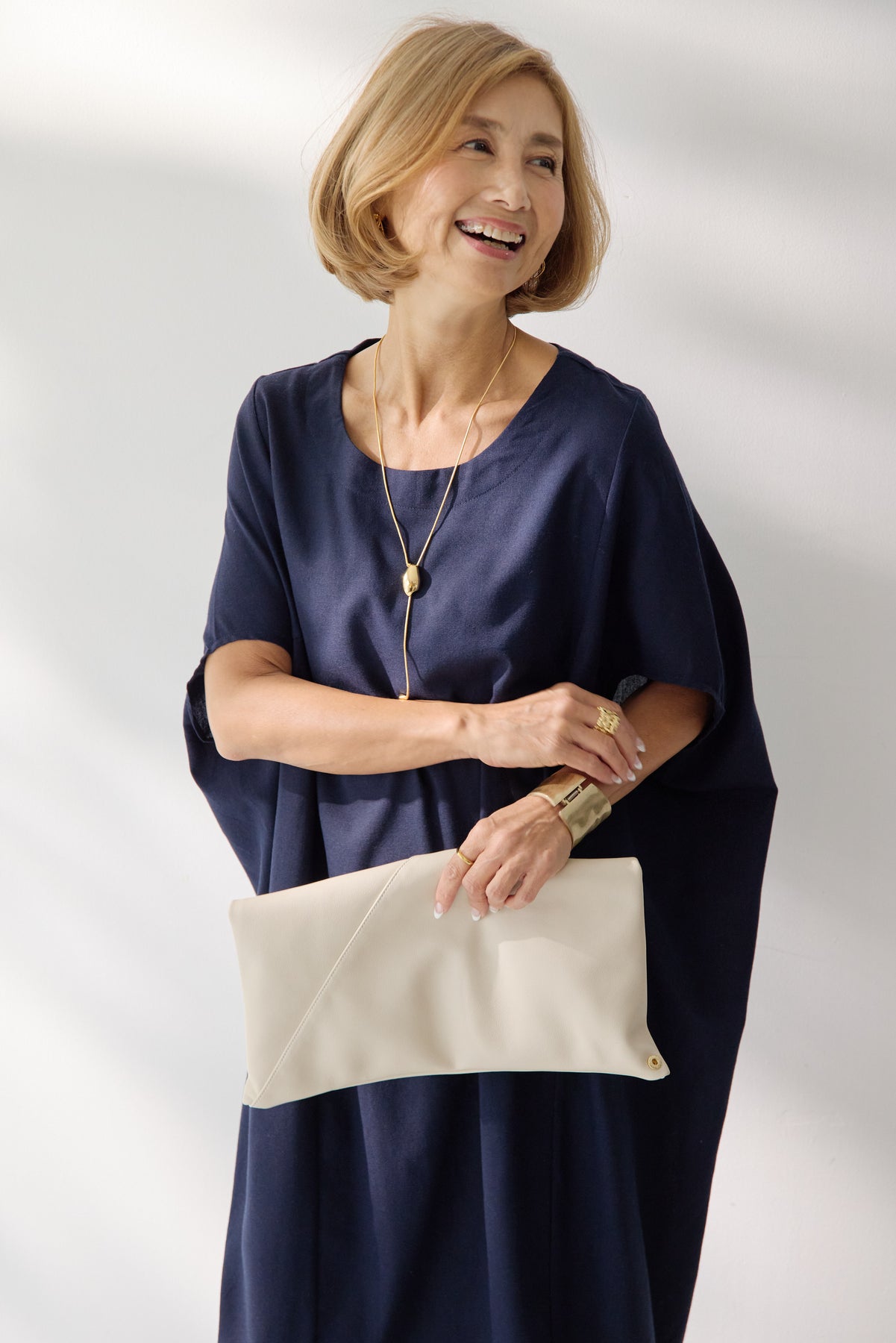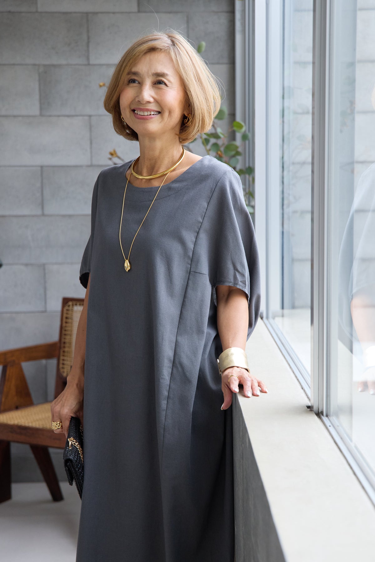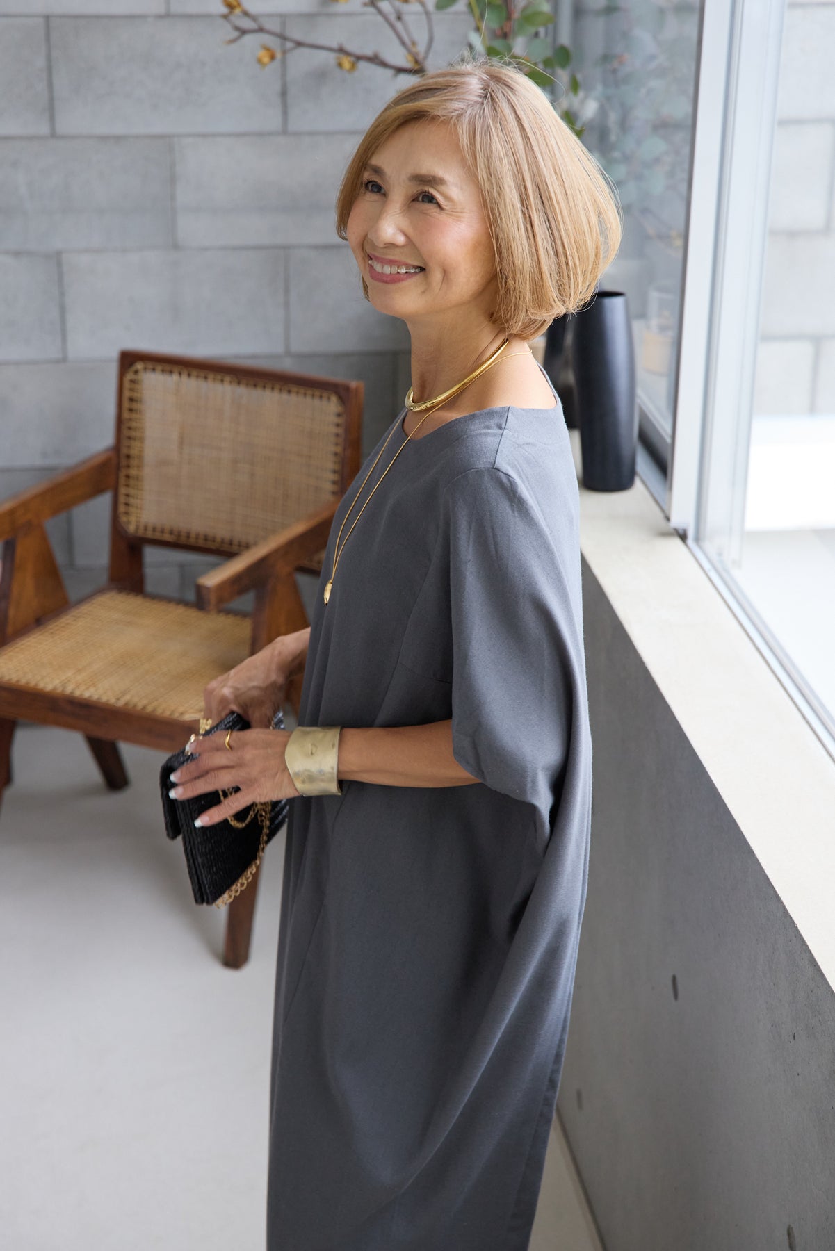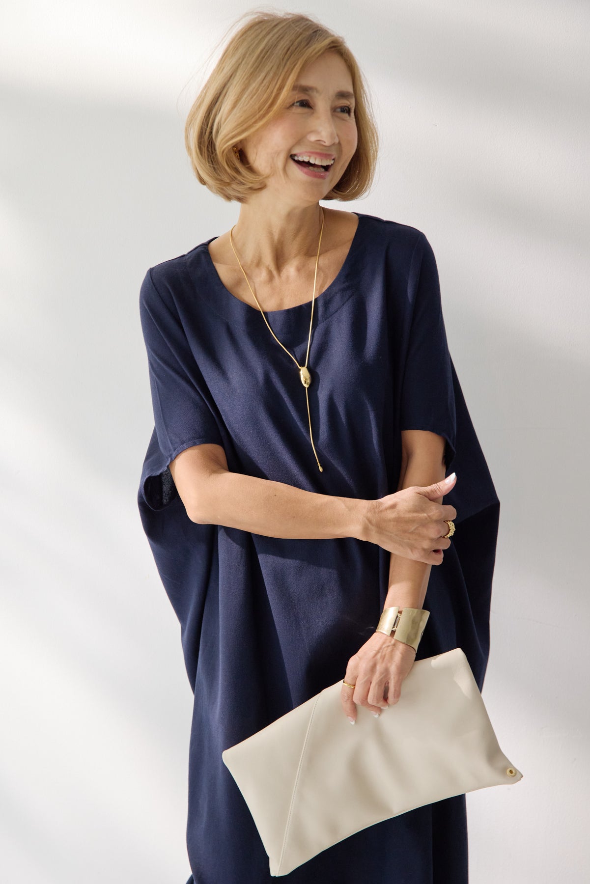 やわらかな丸みを描くコクーンシルエットが印象的な、リネン素材のロングワンピース。身体のラインを拾いにくいゆったりとしたフォルムながら、落ち感のある生地がすっきりとした縦ラインを演出し、リラックス感と上品さを両立します。首元は開きすぎないボートネックでデコルテをきれいに見せ、肩まわりをやさしく覆う袖デザインが腕まわりをさりげなくカバー。脇線を前に振った立体的な切替とコクーンラインが、シンプルながらニュアンスのあるシルエットを生み出しています。通気性に優れたリネン素材はさらりとした肌触りで、暑い季節も快適な着心地です。