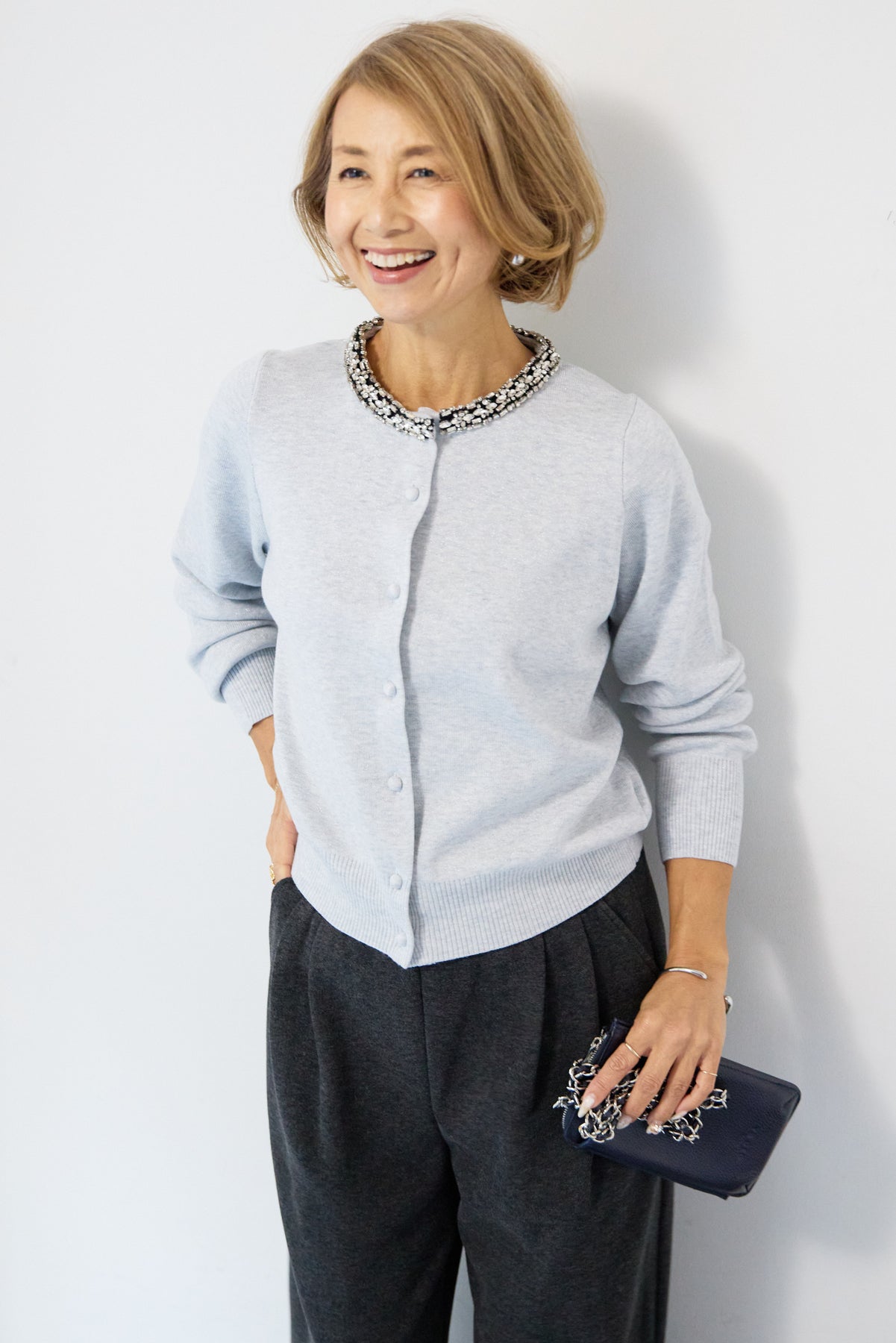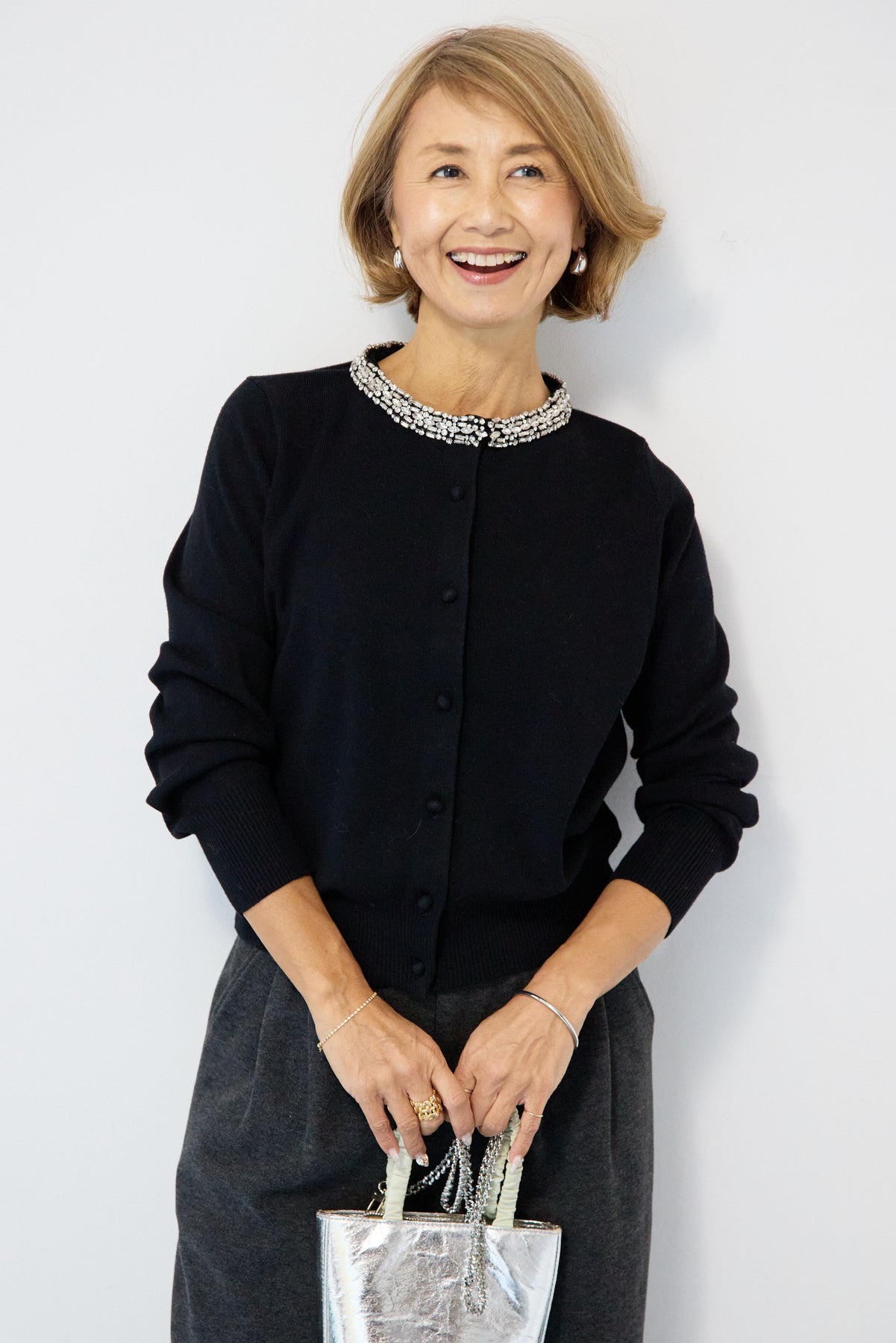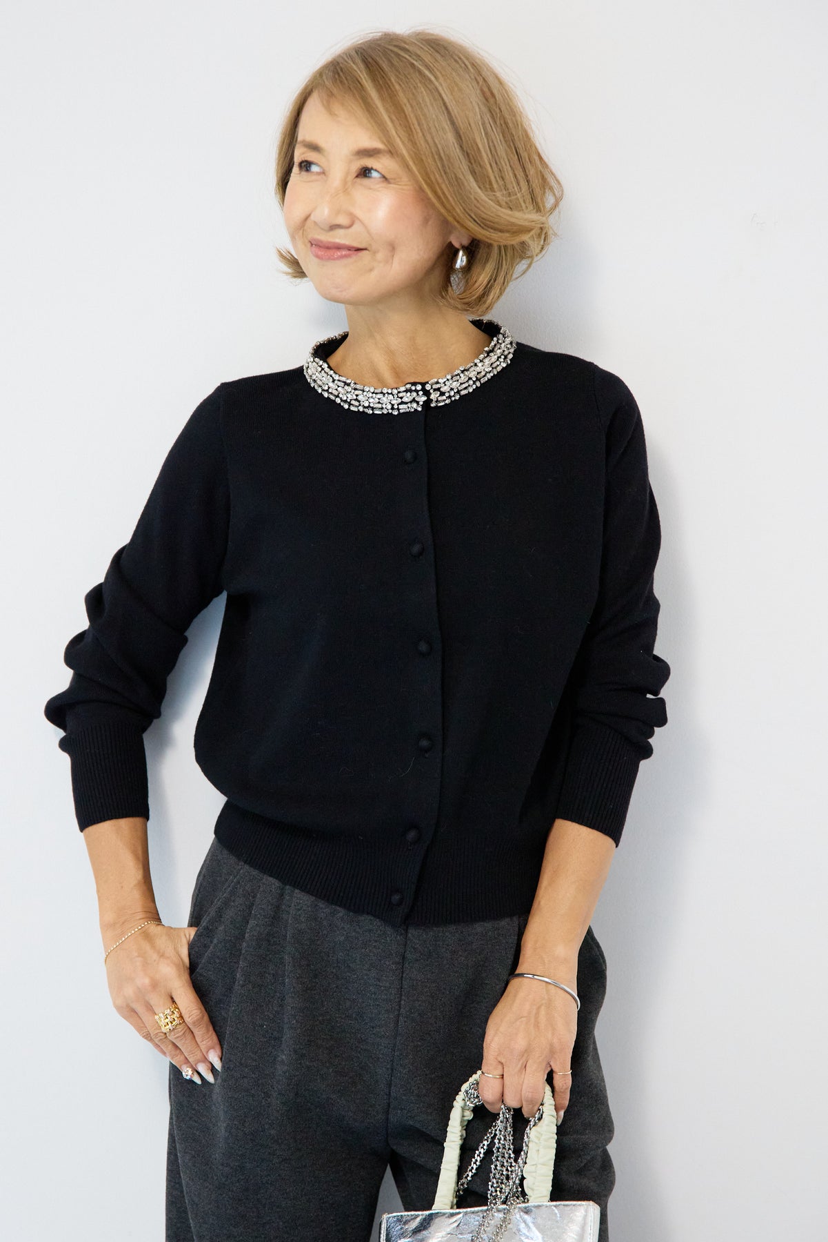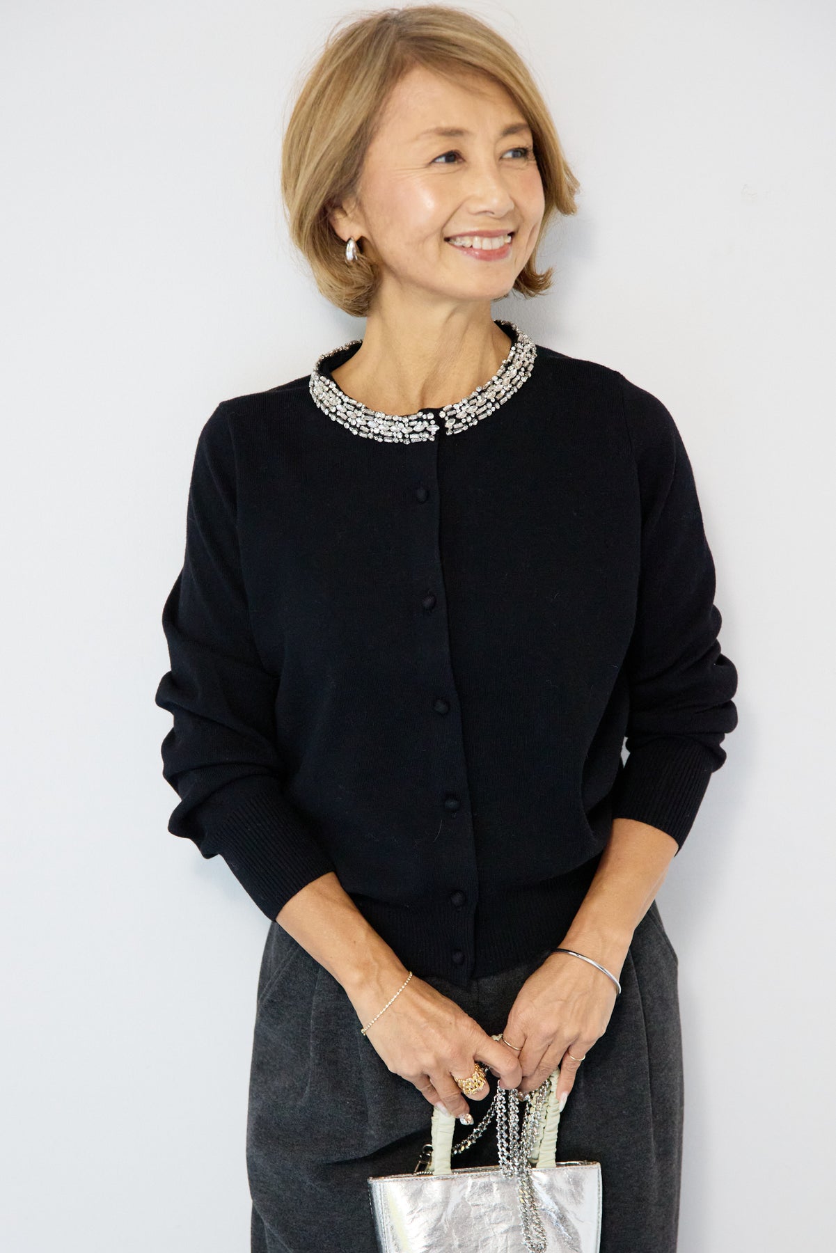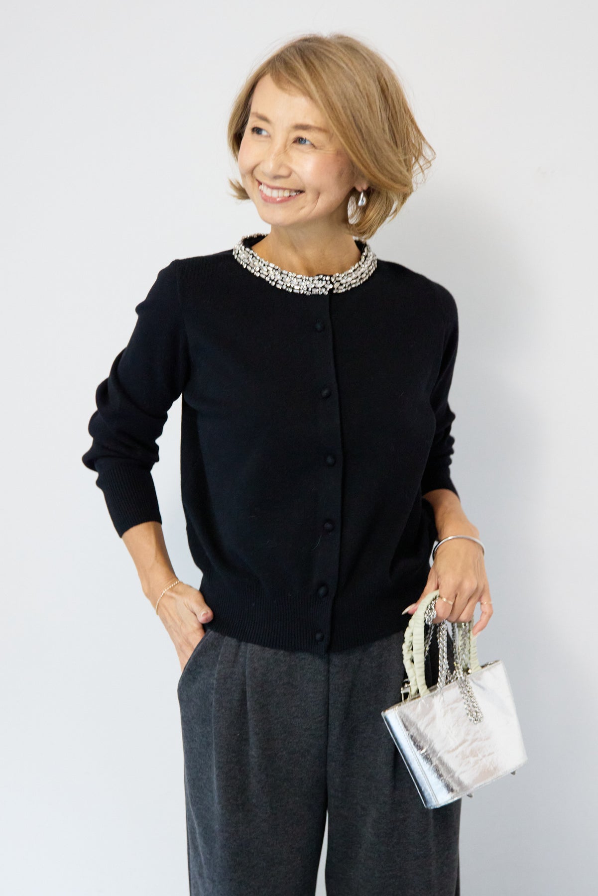 上質なシルク混素材を使用した、ラグジュアリー感あふれるビジューカーディガン。首元には存在感のあるビジューを贅沢にあしらい、シンプルなシルエットに華やかさをプラス。上品な輝きが顔まわりを明るく見せ、アクセサリーいらずでコーデが完成します。柔らかくなめらかな肌触りのニットは、軽さと暖かさを兼ね備えた大人に嬉しい着心地。前立てのくるみボタンやフィット感の良いリブ袖など、細部までこだわった仕立ても魅力です。デイリー使いはもちろん、食事会や特別なシーンにも活躍する1着。