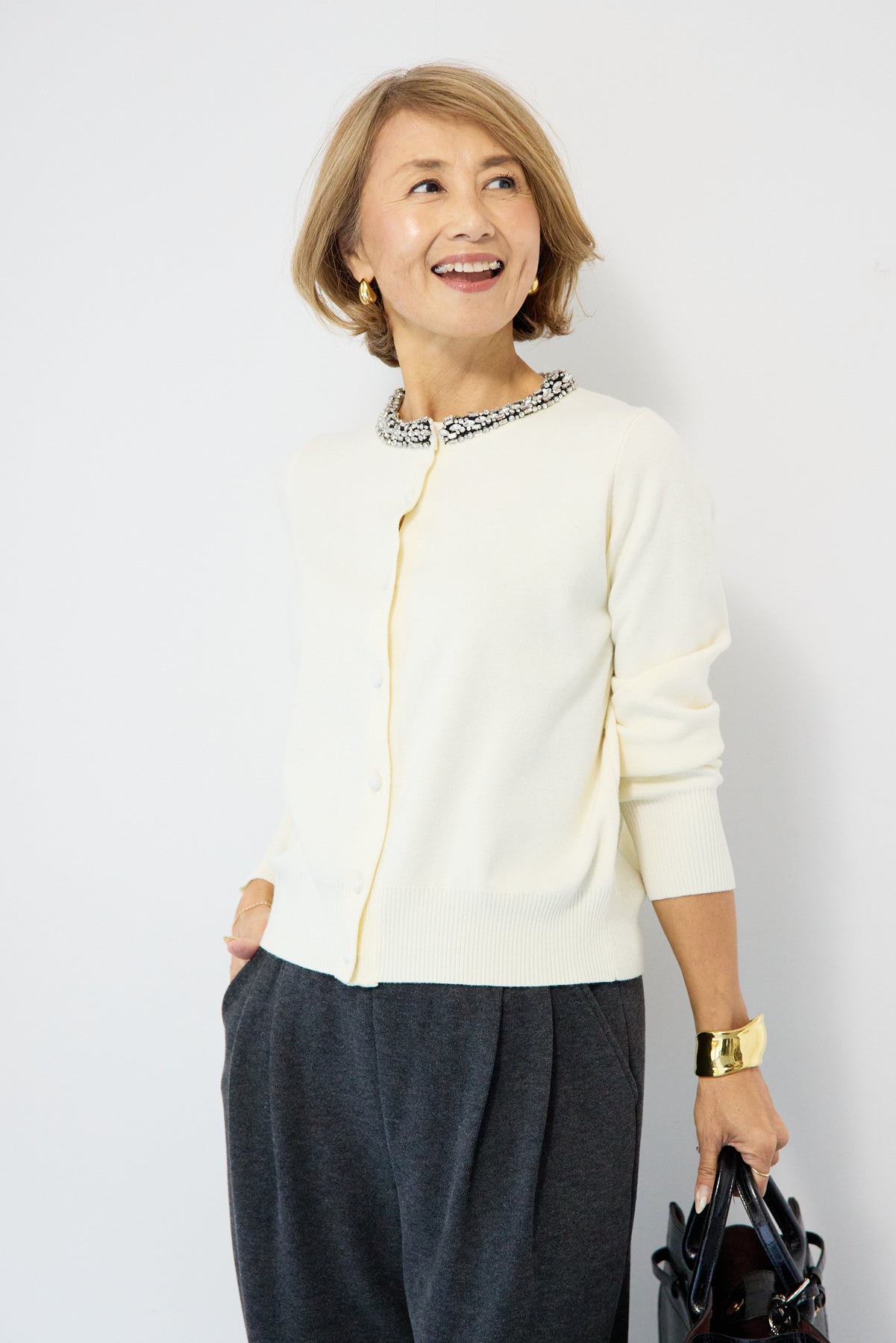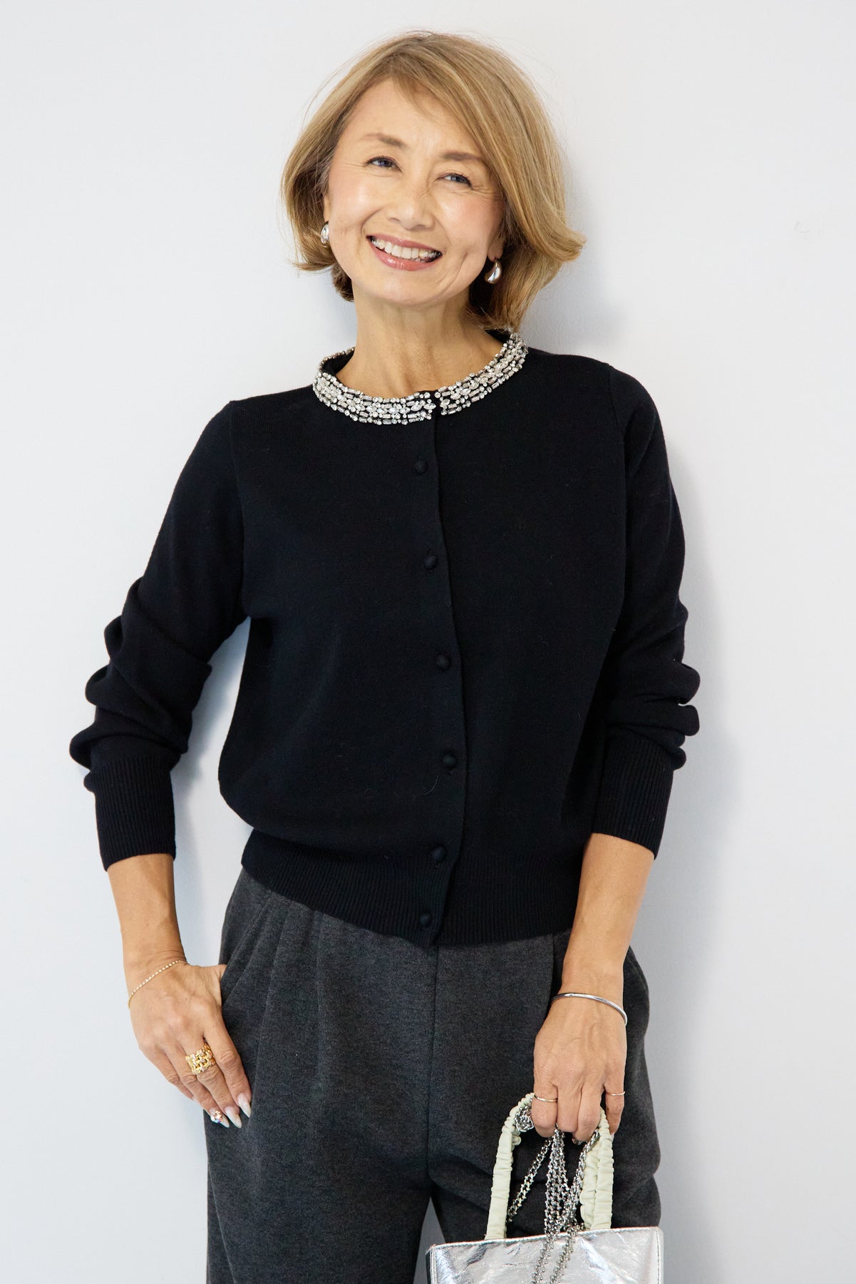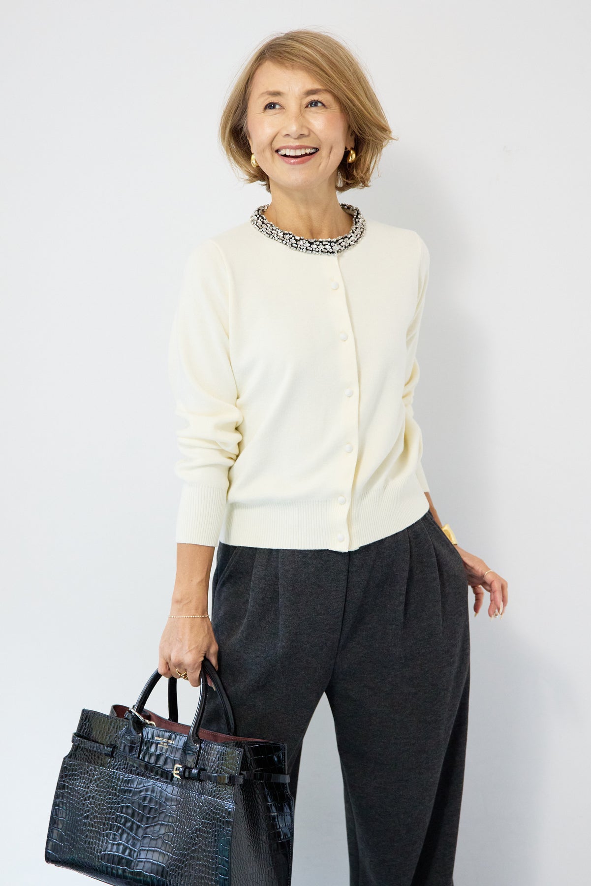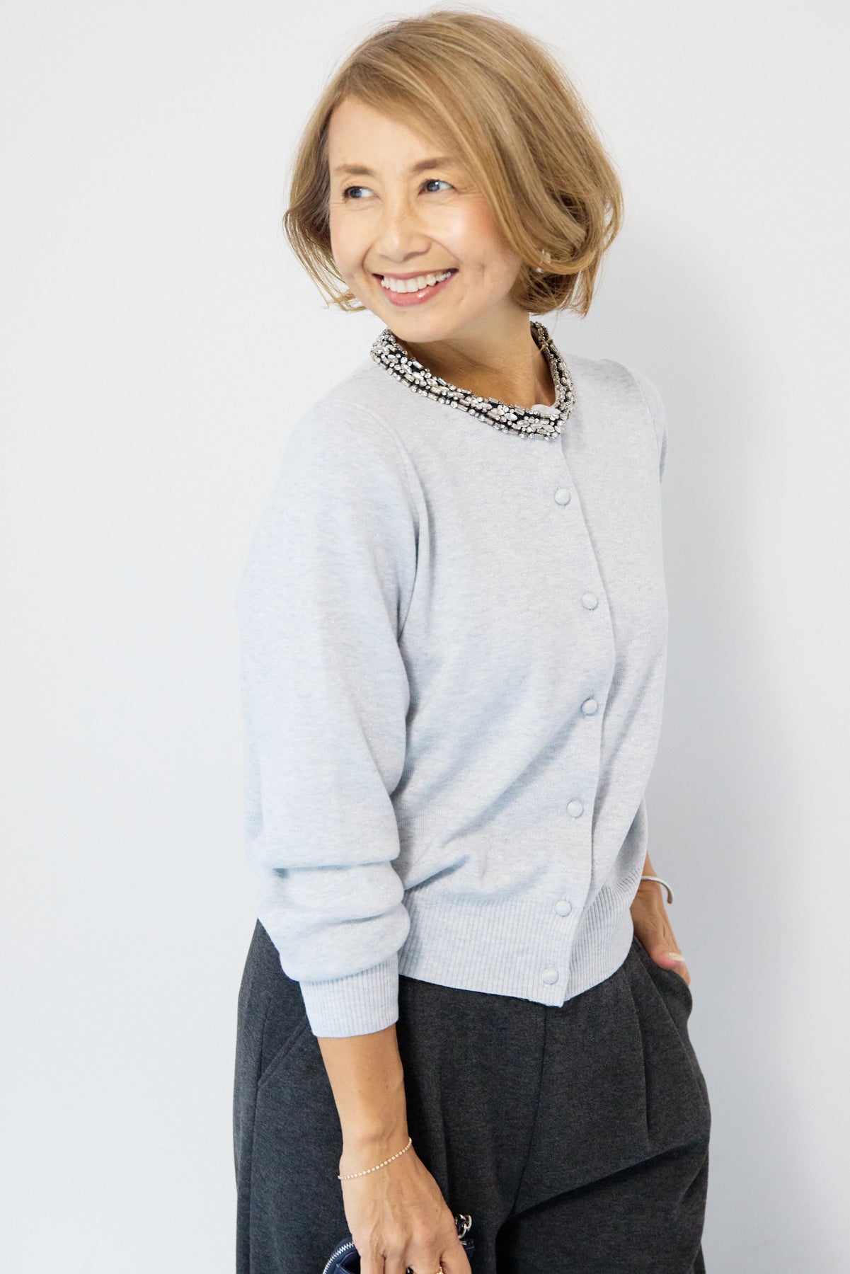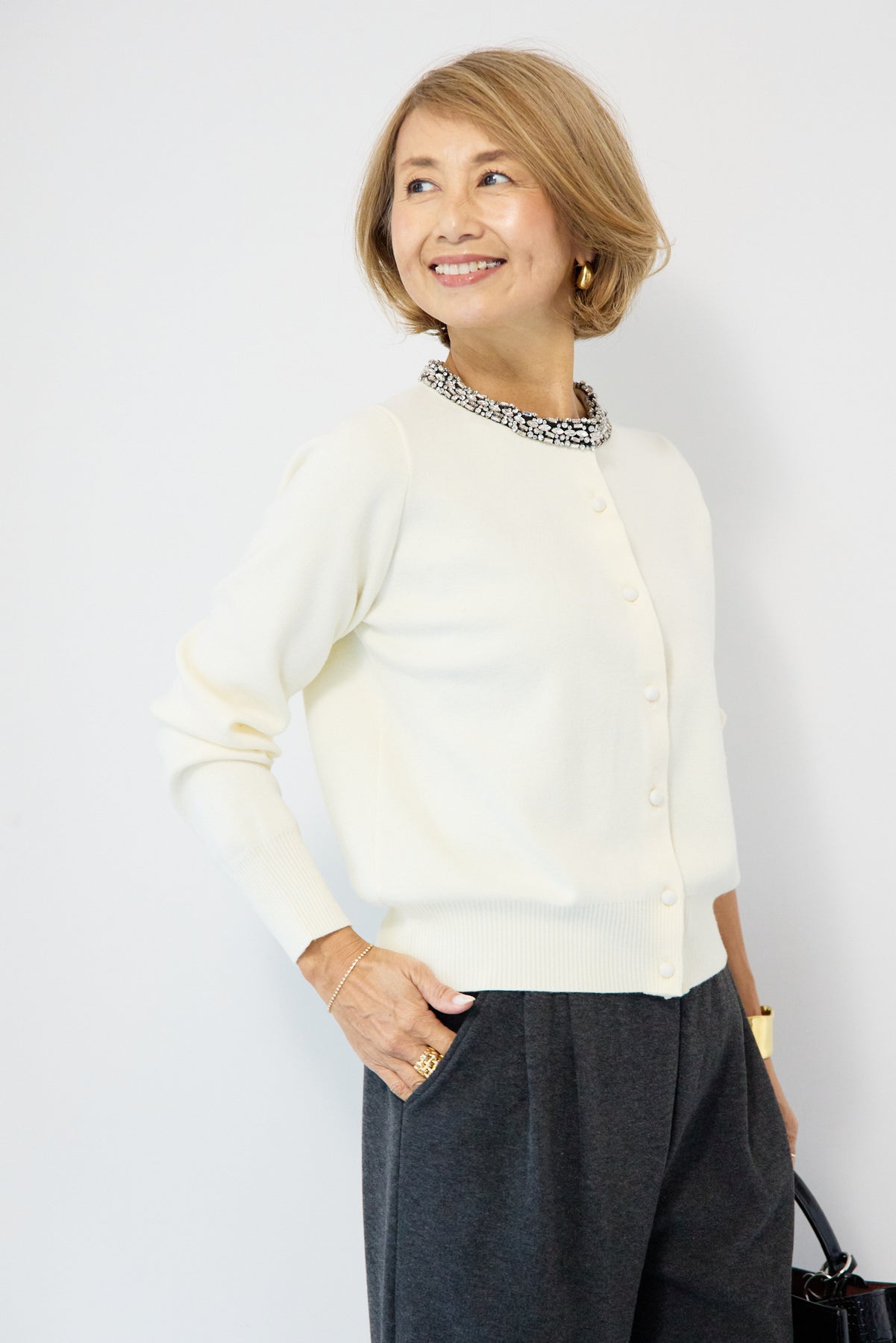 上質なシルク混素材を使用した、ラグジュアリー感あふれるビジューカーディガン。首元には存在感のあるビジューを贅沢にあしらい、シンプルなシルエットに華やかさをプラス。上品な輝きが顔まわりを明るく見せ、アクセサリーいらずでコーデが完成します。柔らかくなめらかな肌触りのニットは、軽さと暖かさを兼ね備えた大人に嬉しい着心地。前立てのくるみボタンやフィット感の良いリブ袖など、細部までこだわった仕立ても魅力です。デイリー使いはもちろん、食事会や特別なシーンにも活躍する1着。