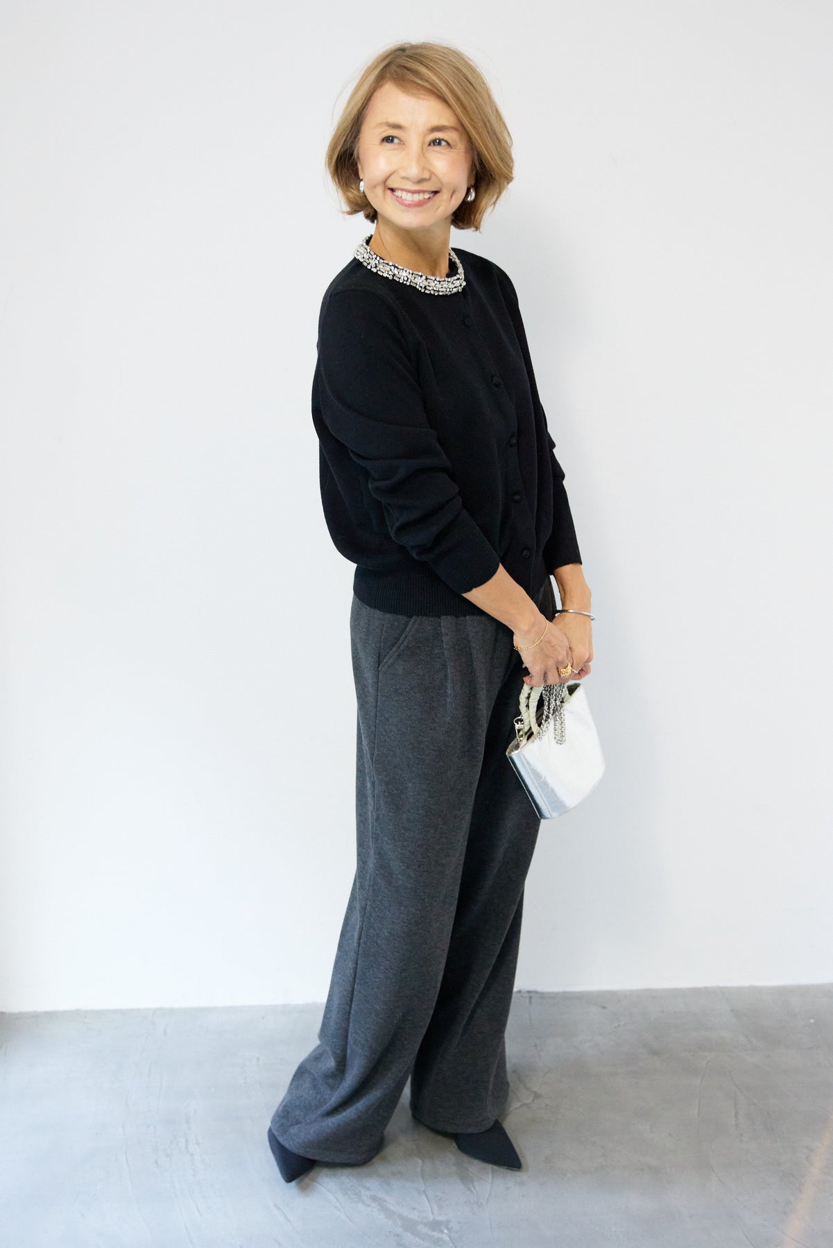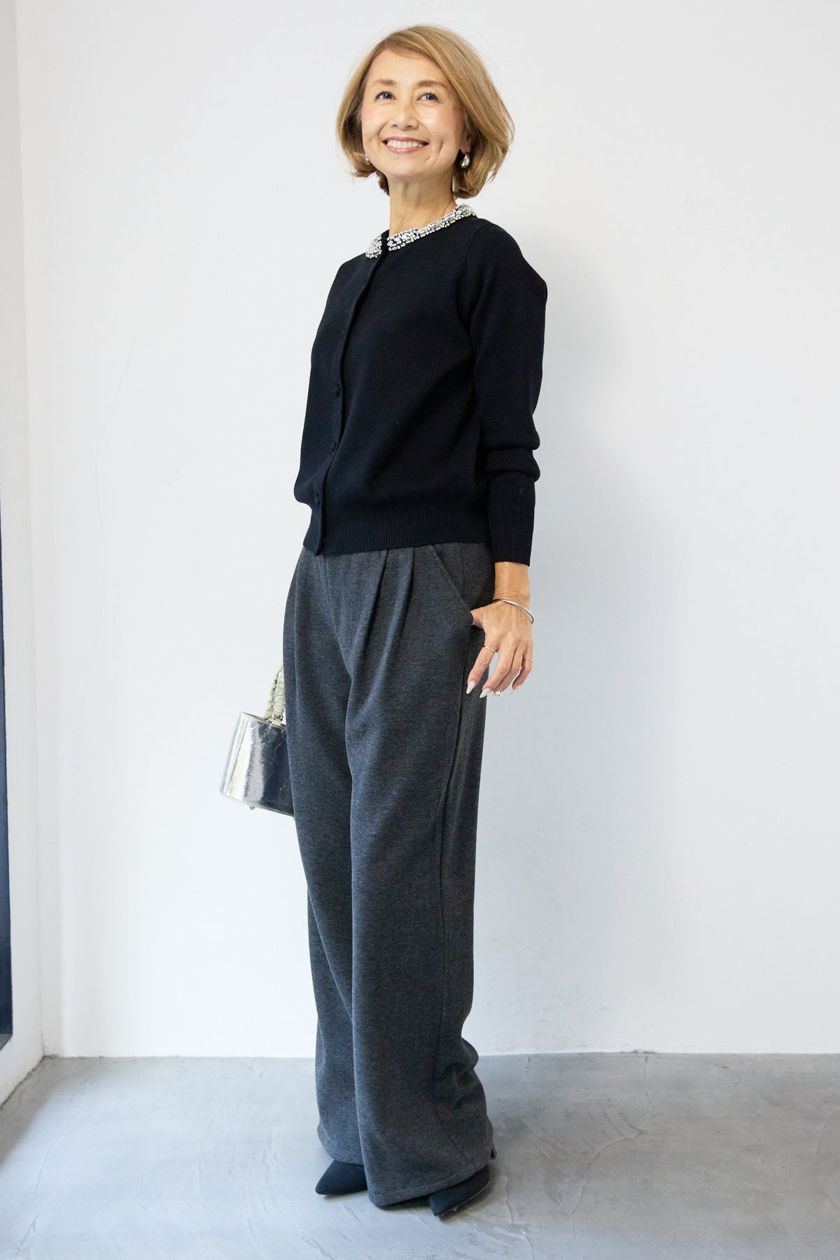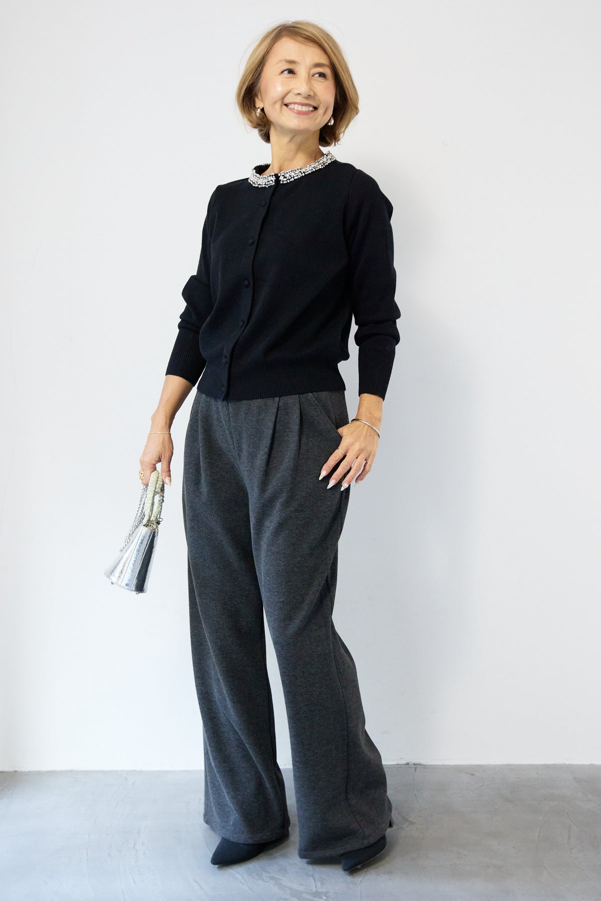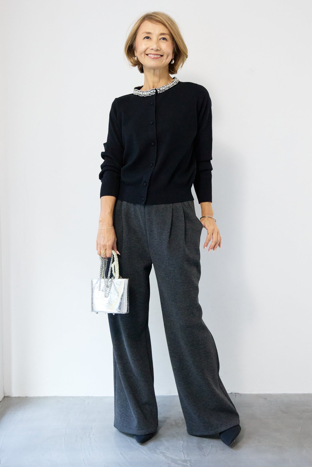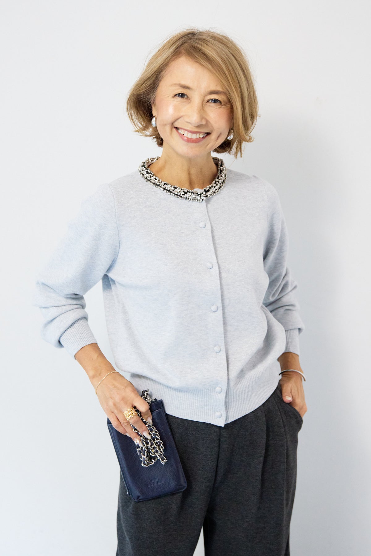 上質なシルク混素材を使用した、ラグジュアリー感あふれるビジューカーディガン。首元には存在感のあるビジューを贅沢にあしらい、シンプルなシルエットに華やかさをプラス。上品な輝きが顔まわりを明るく見せ、アクセサリーいらずでコーデが完成します。柔らかくなめらかな肌触りのニットは、軽さと暖かさを兼ね備えた大人に嬉しい着心地。前立てのくるみボタンやフィット感の良いリブ袖など、細部までこだわった仕立ても魅力です。デイリー使いはもちろん、食事会や特別なシーンにも活躍する1着。