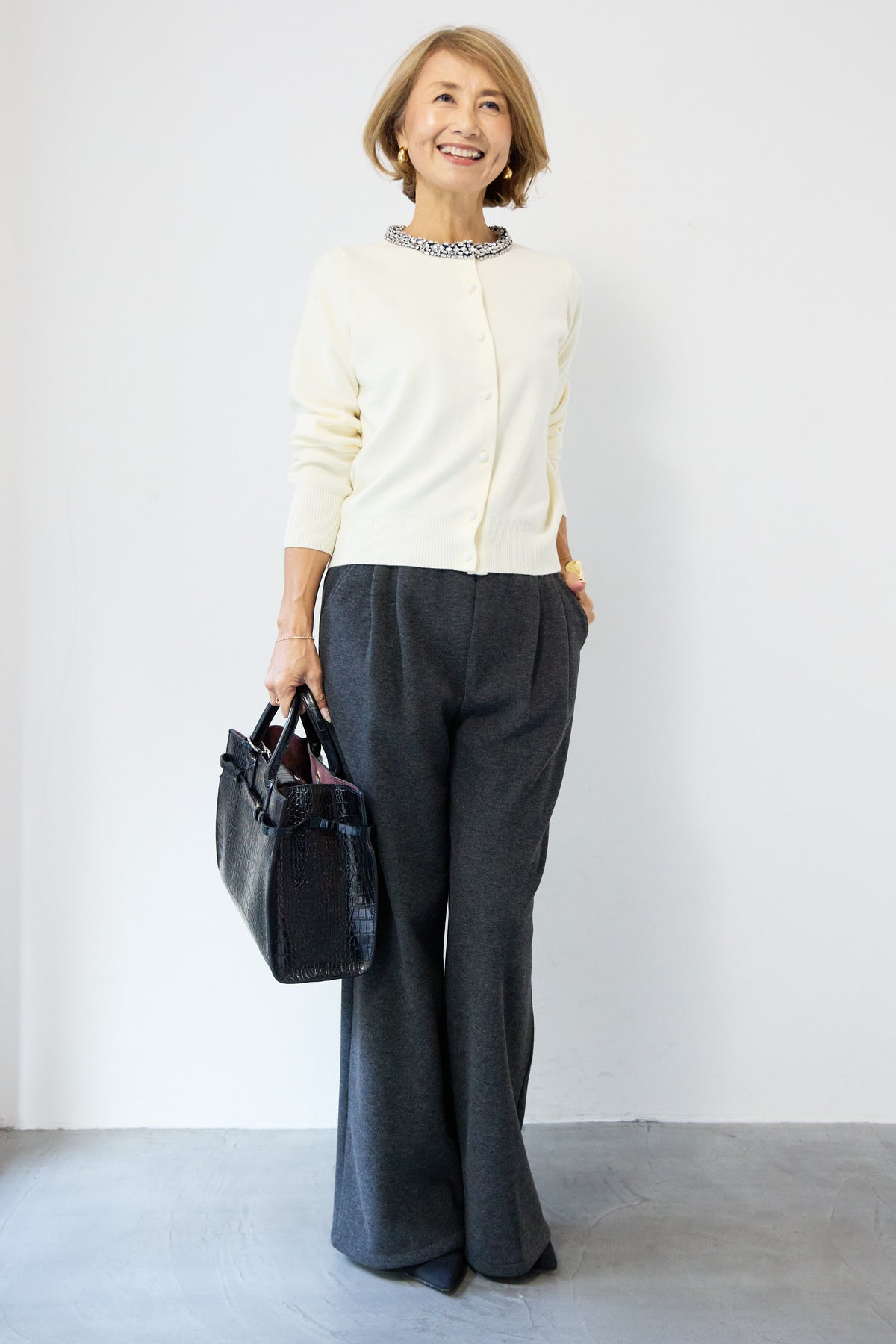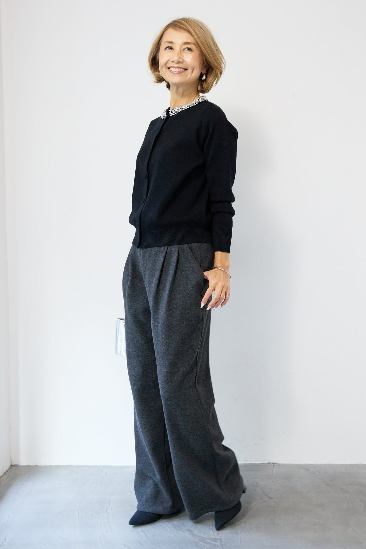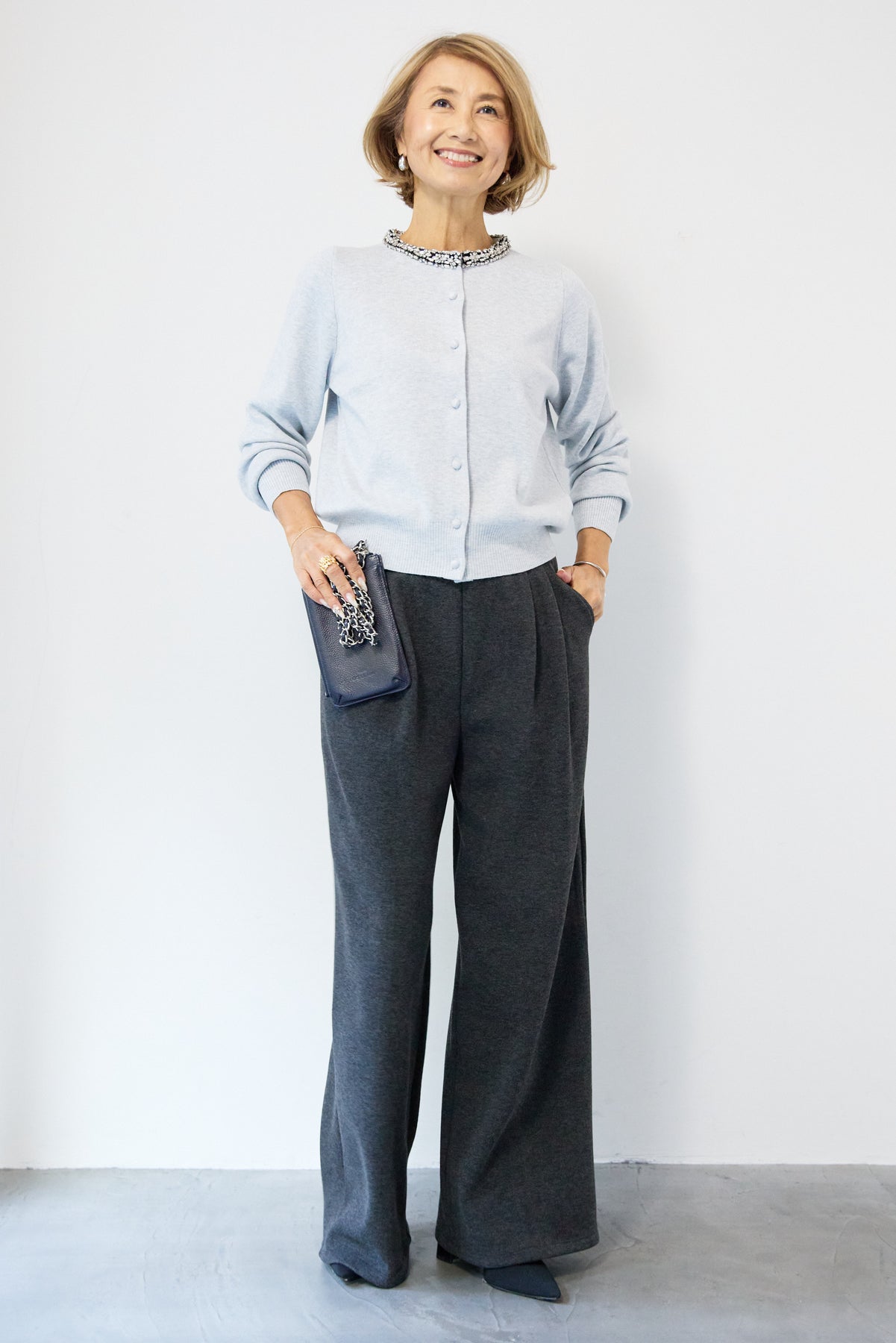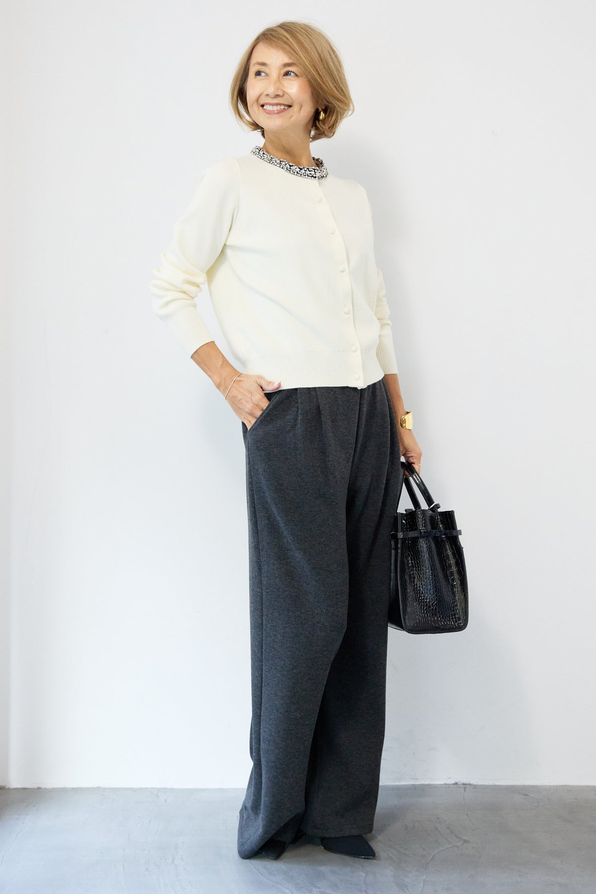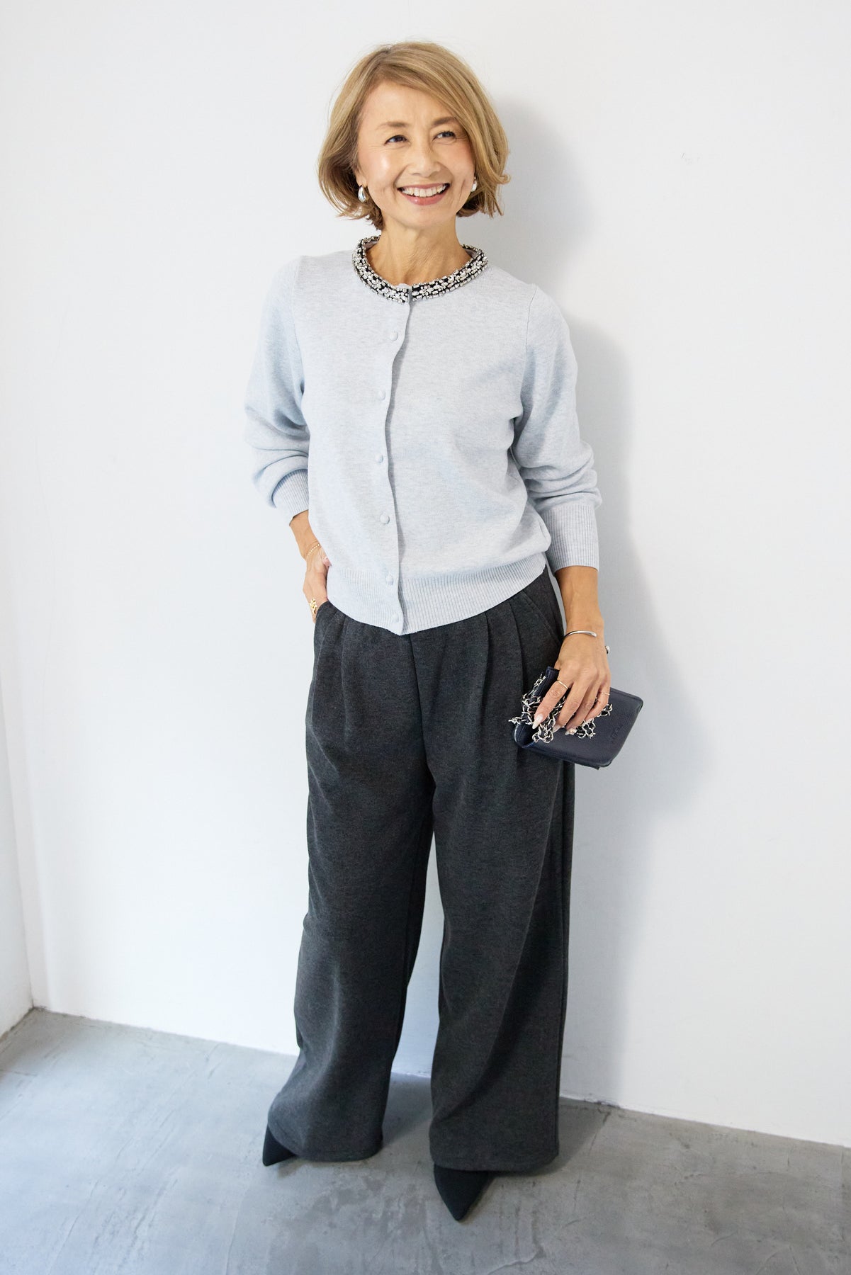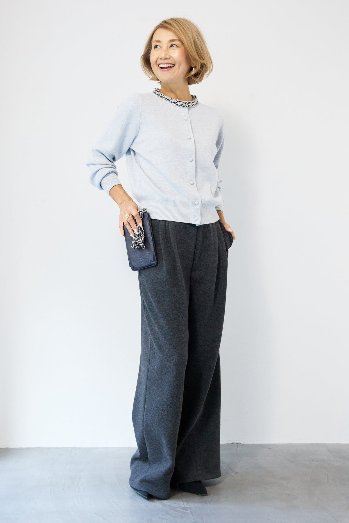 上質なシルク混素材を使用した、ラグジュアリー感あふれるビジューカーディガン。首元には存在感のあるビジューを贅沢にあしらい、シンプルなシルエットに華やかさをプラス。上品な輝きが顔まわりを明るく見せ、アクセサリーいらずでコーデが完成します。柔らかくなめらかな肌触りのニットは、軽さと暖かさを兼ね備えた大人に嬉しい着心地。前立てのくるみボタンやフィット感の良いリブ袖など、細部までこだわった仕立ても魅力です。デイリー使いはもちろん、食事会や特別なシーンにも活躍する1着。