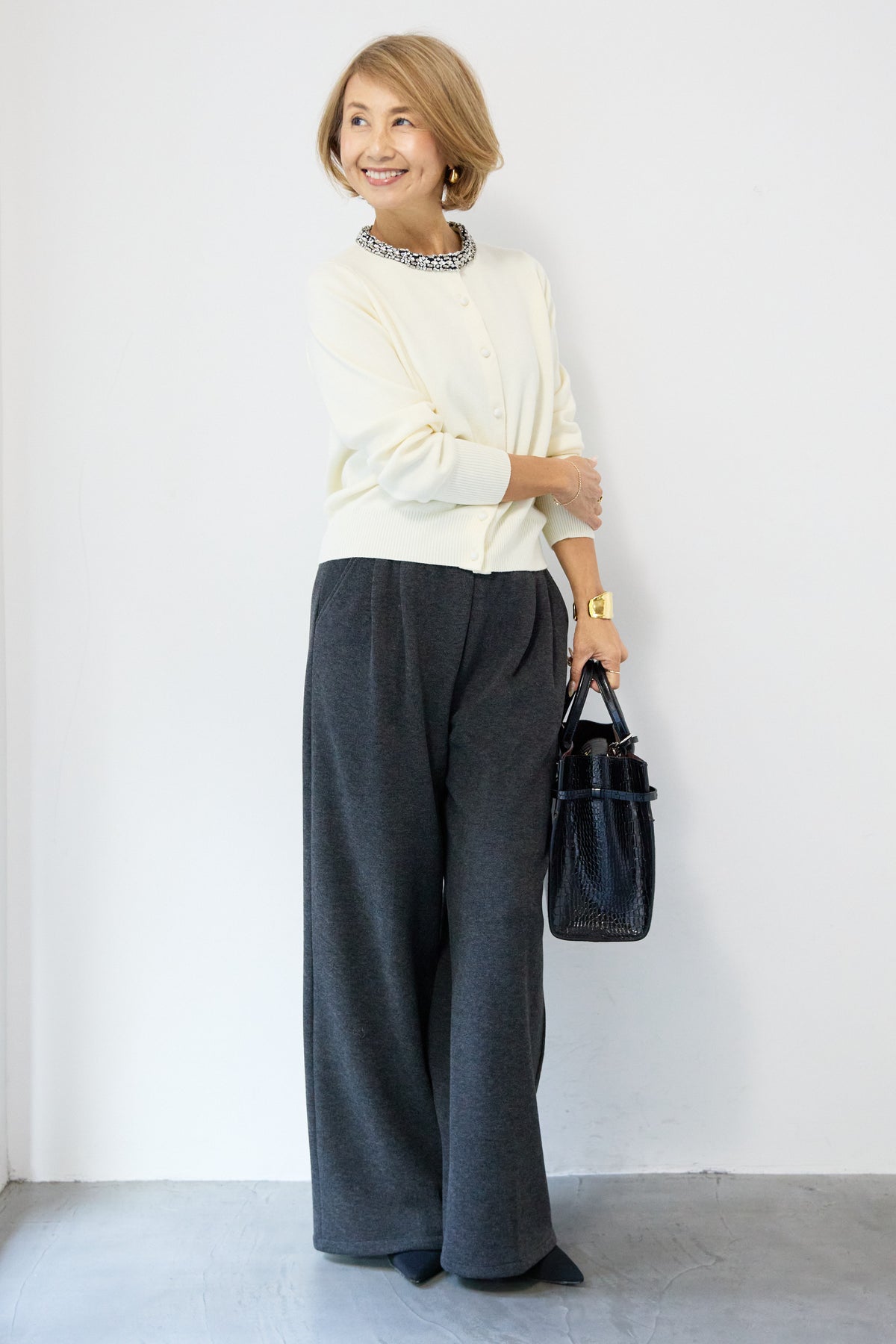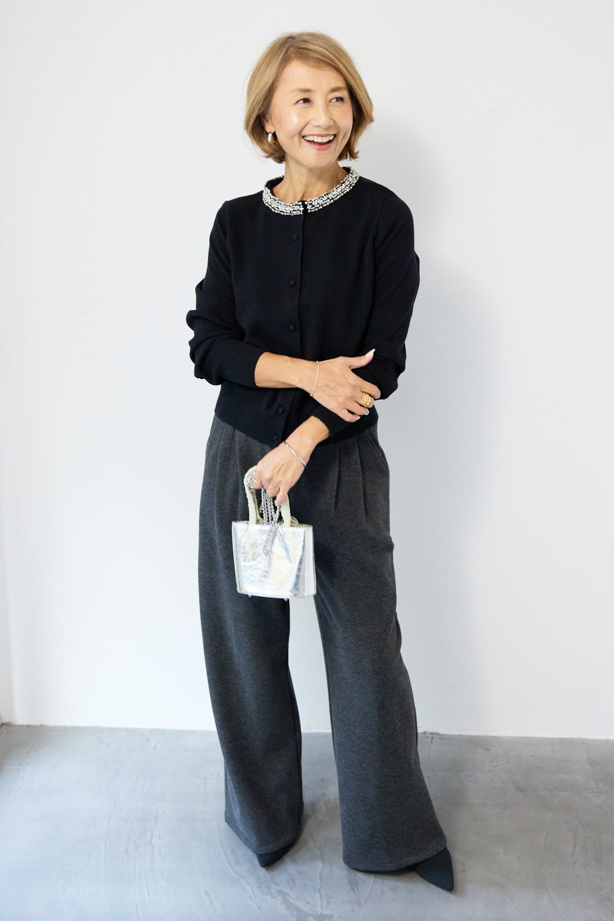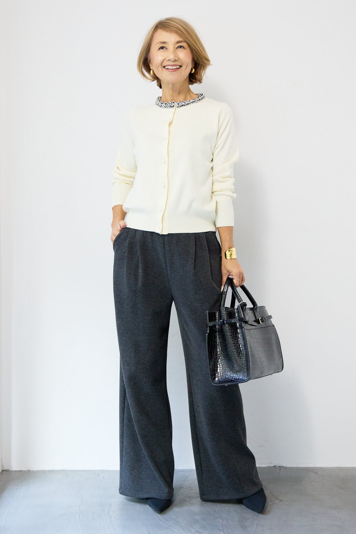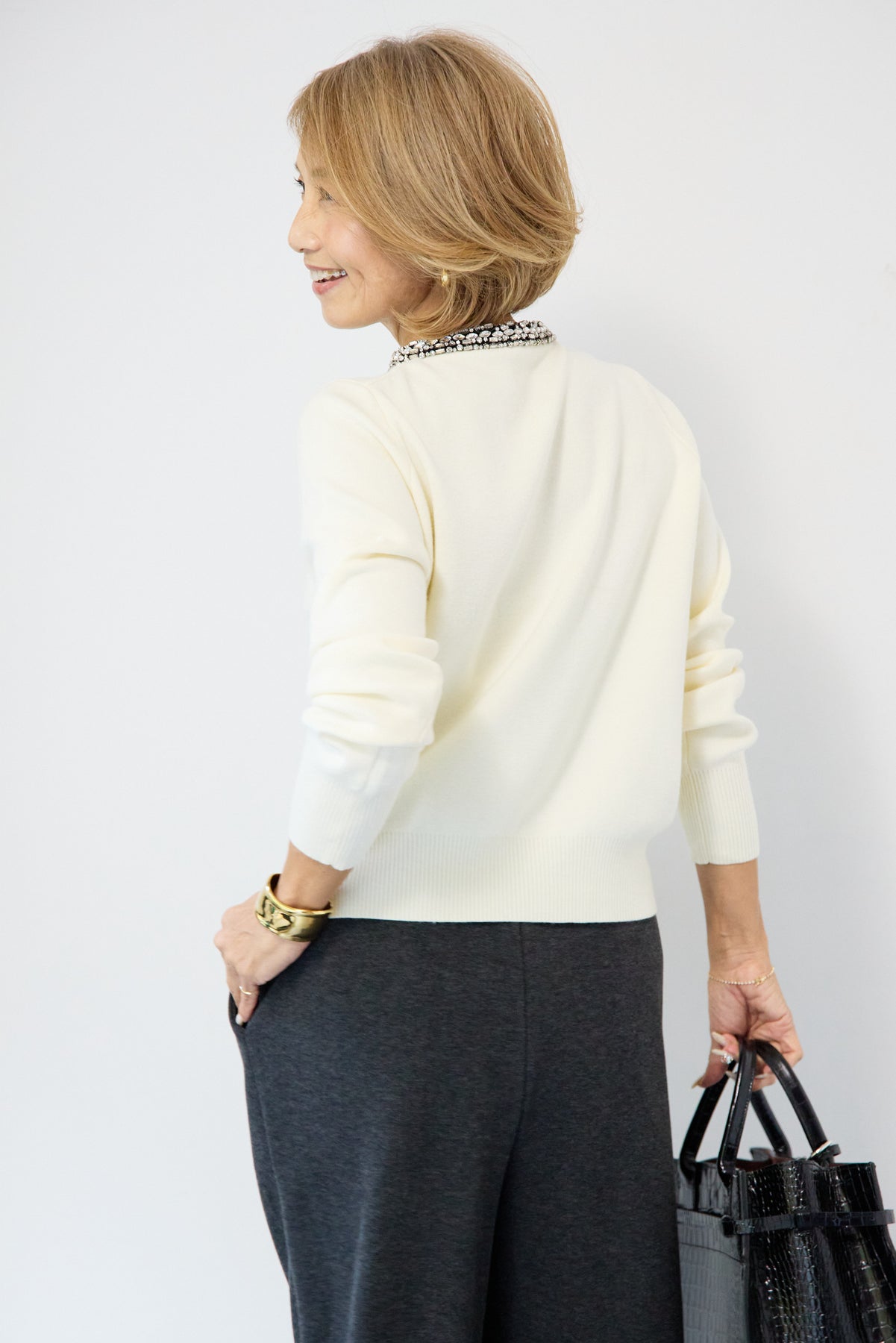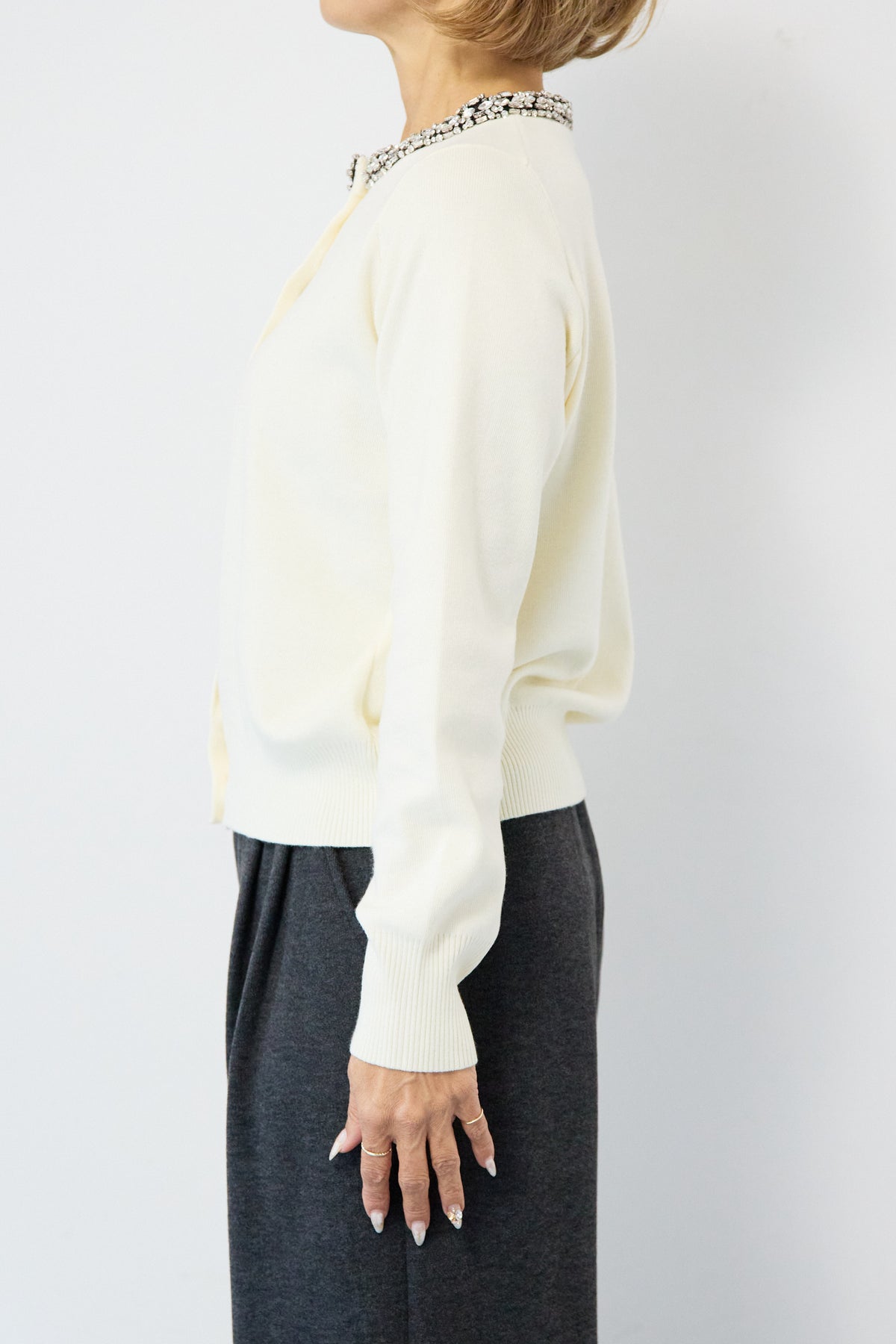 上質なシルク混素材を使用した、ラグジュアリー感あふれるビジューカーディガン。首元には存在感のあるビジューを贅沢にあしらい、シンプルなシルエットに華やかさをプラス。上品な輝きが顔まわりを明るく見せ、アクセサリーいらずでコーデが完成します。柔らかくなめらかな肌触りのニットは、軽さと暖かさを兼ね備えた大人に嬉しい着心地。前立てのくるみボタンやフィット感の良いリブ袖など、細部までこだわった仕立ても魅力です。デイリー使いはもちろん、食事会や特別なシーンにも活躍する1着。