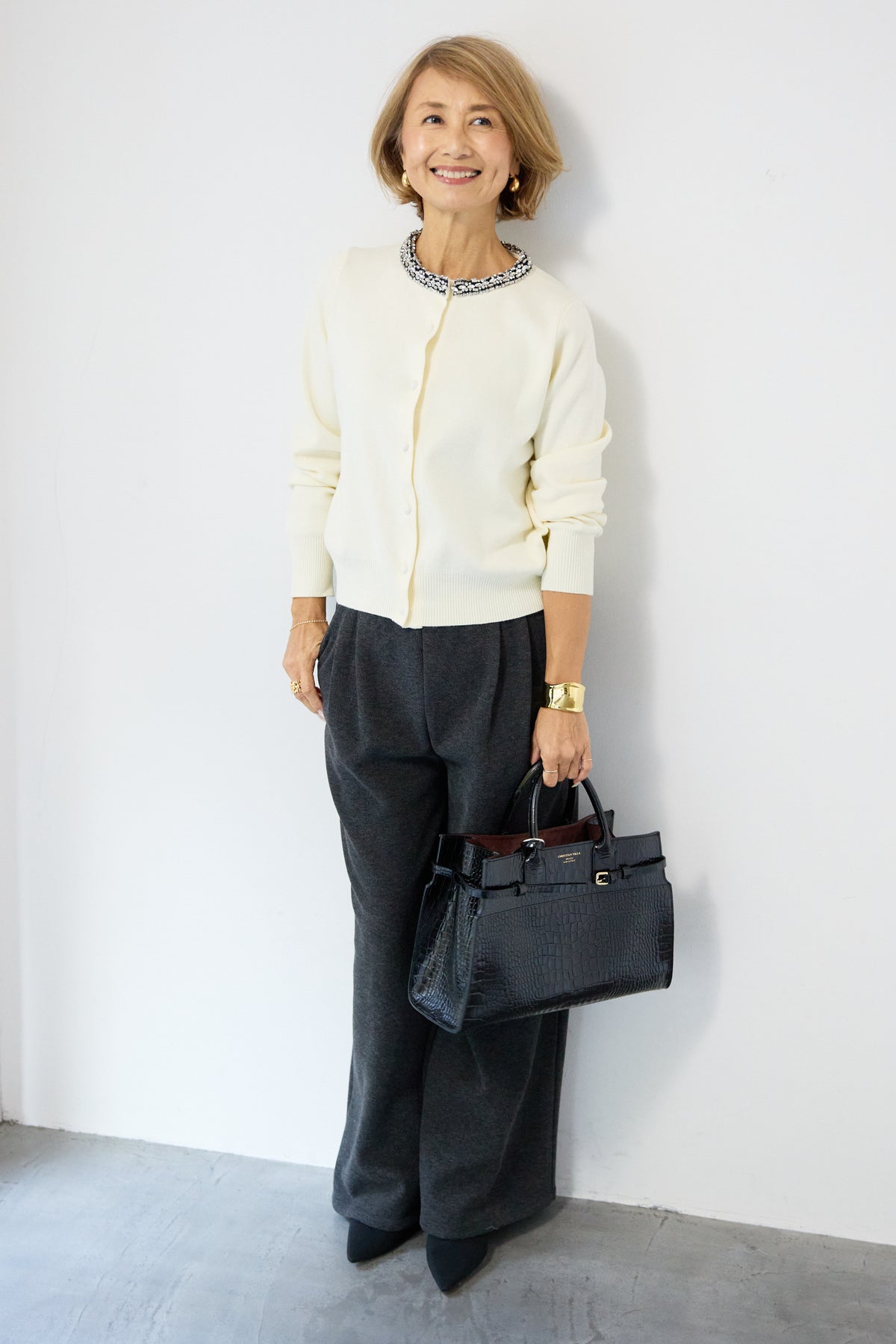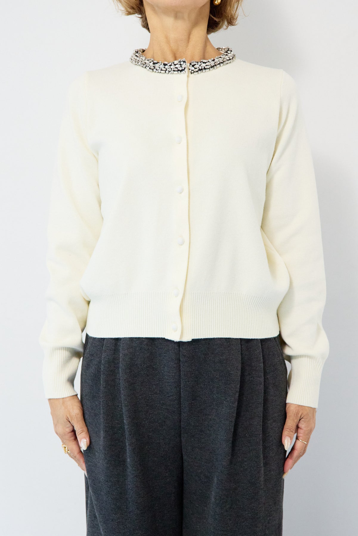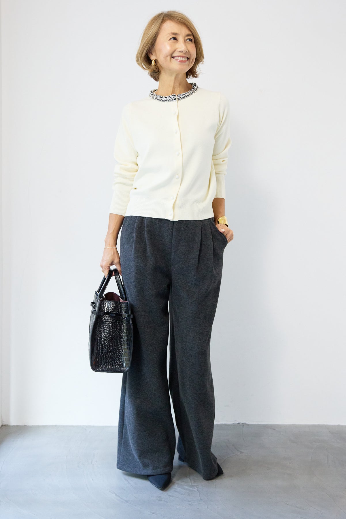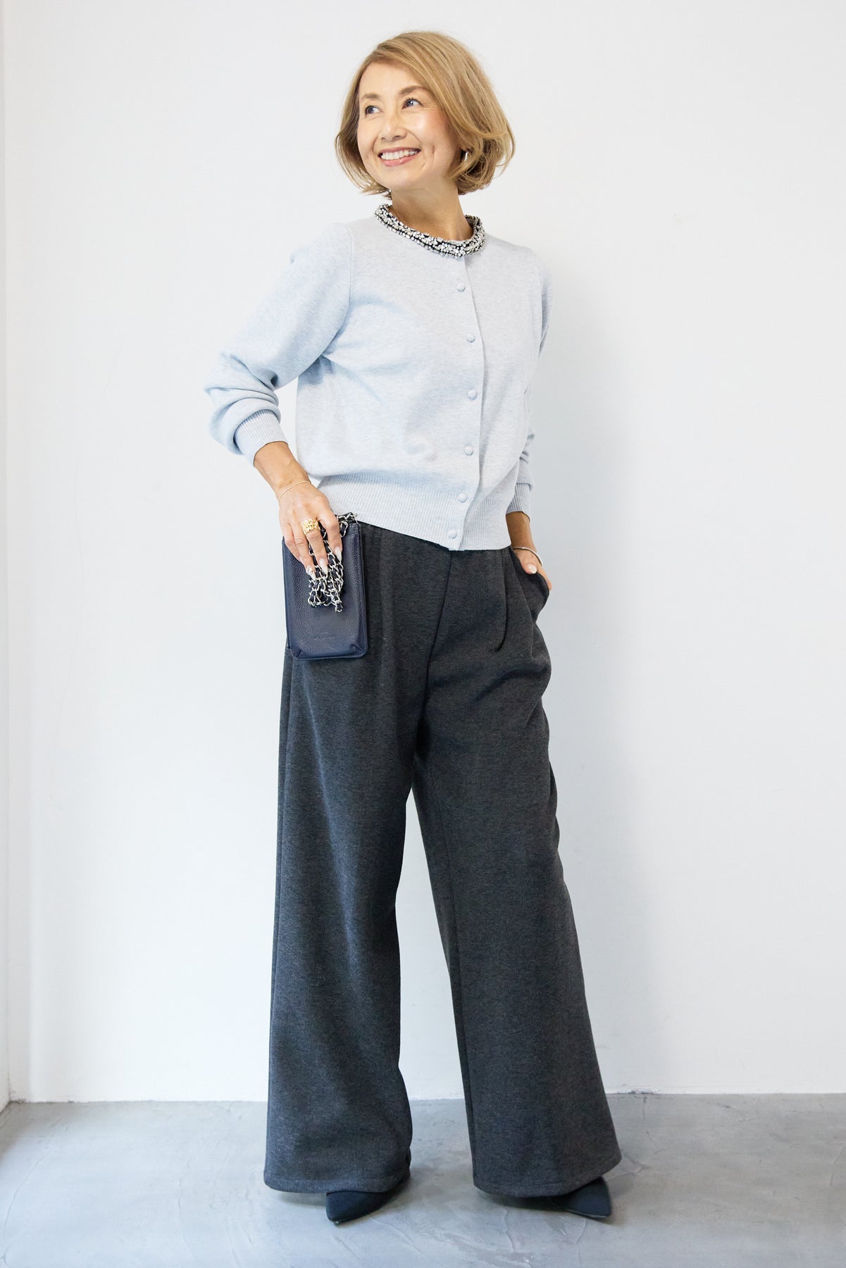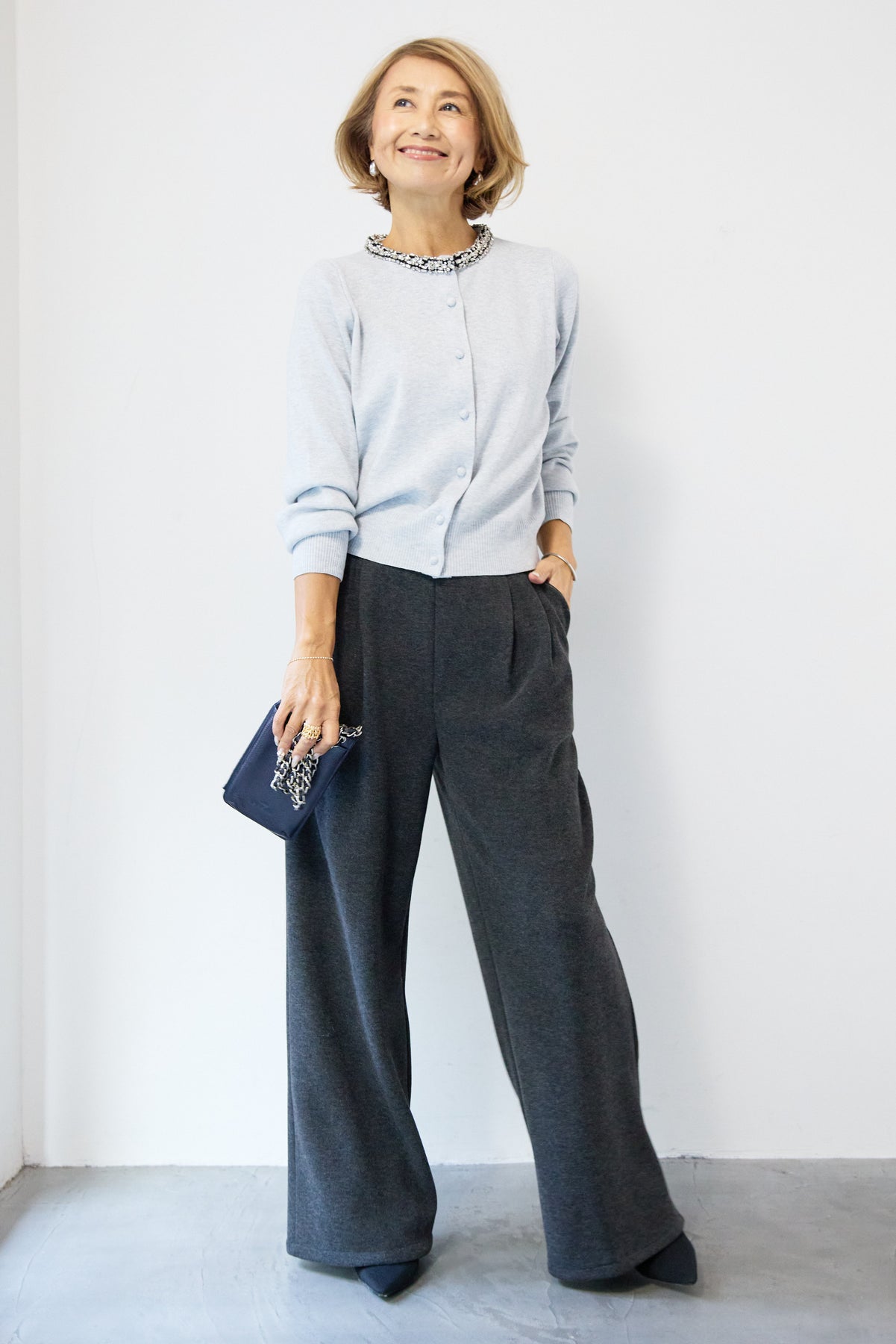 上質なシルク混素材を使用した、ラグジュアリー感あふれるビジューカーディガン。首元には存在感のあるビジューを贅沢にあしらい、シンプルなシルエットに華やかさをプラス。上品な輝きが顔まわりを明るく見せ、アクセサリーいらずでコーデが完成します。柔らかくなめらかな肌触りのニットは、軽さと暖かさを兼ね備えた大人に嬉しい着心地。前立てのくるみボタンやフィット感の良いリブ袖など、細部までこだわった仕立ても魅力です。デイリー使いはもちろん、食事会や特別なシーンにも活躍する1着。