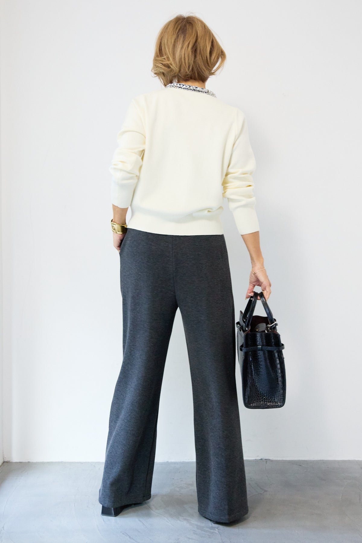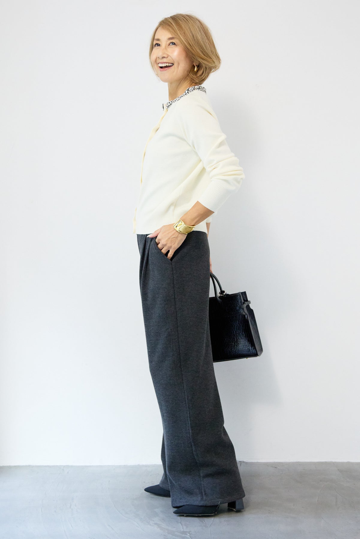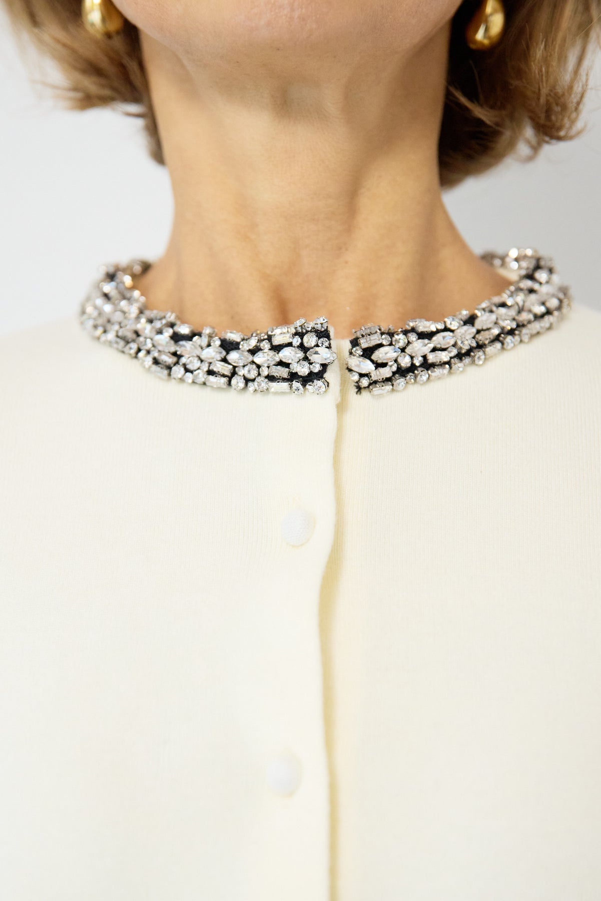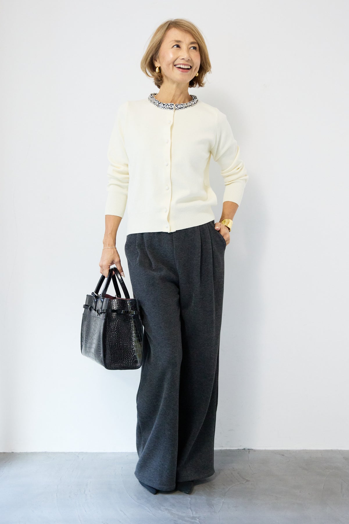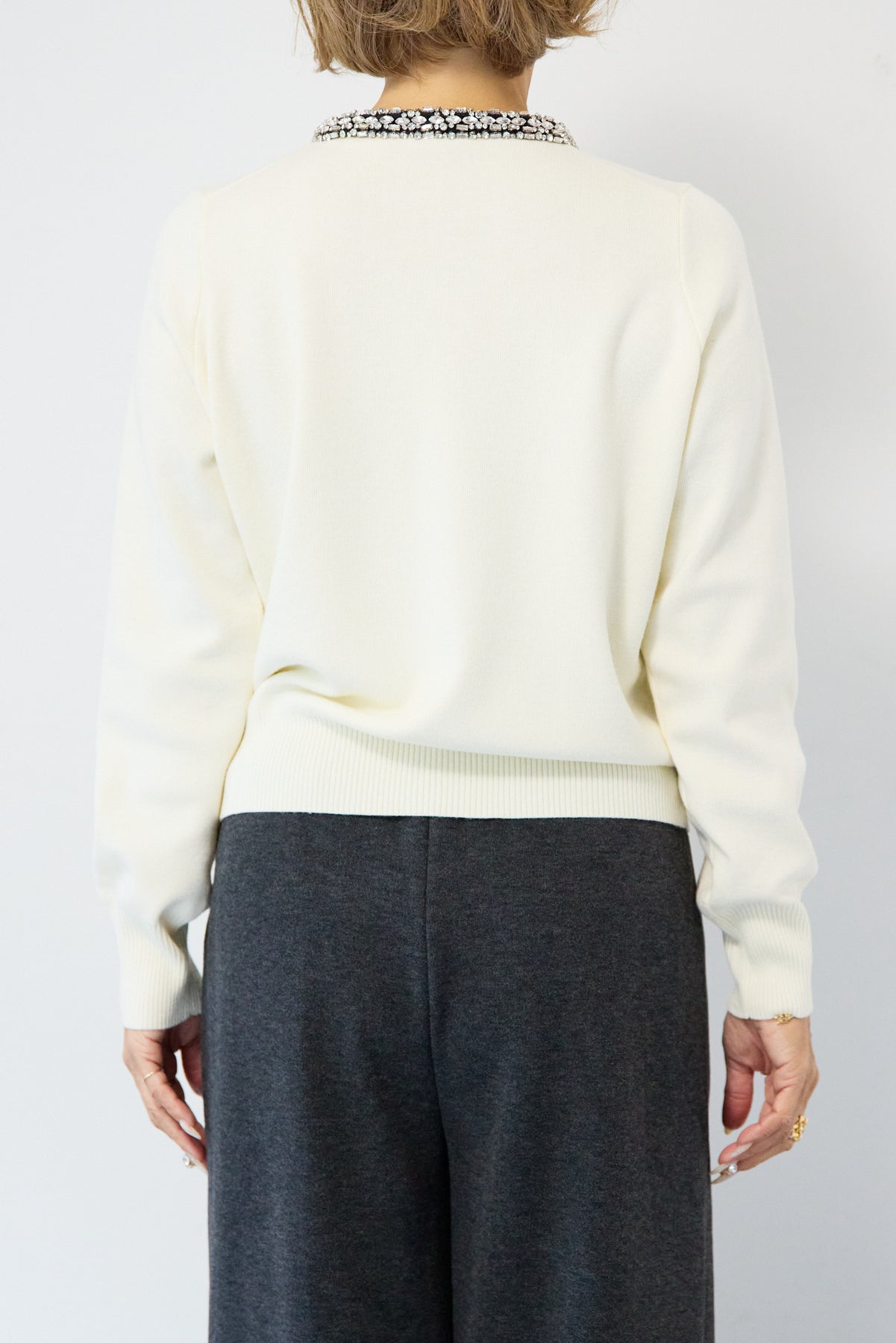 上質なシルク混素材を使用した、ラグジュアリー感あふれるビジューカーディガン。首元には存在感のあるビジューを贅沢にあしらい、シンプルなシルエットに華やかさをプラス。上品な輝きが顔まわりを明るく見せ、アクセサリーいらずでコーデが完成します。柔らかくなめらかな肌触りのニットは、軽さと暖かさを兼ね備えた大人に嬉しい着心地。前立てのくるみボタンやフィット感の良いリブ袖など、細部までこだわった仕立ても魅力です。デイリー使いはもちろん、食事会や特別なシーンにも活躍する1着。