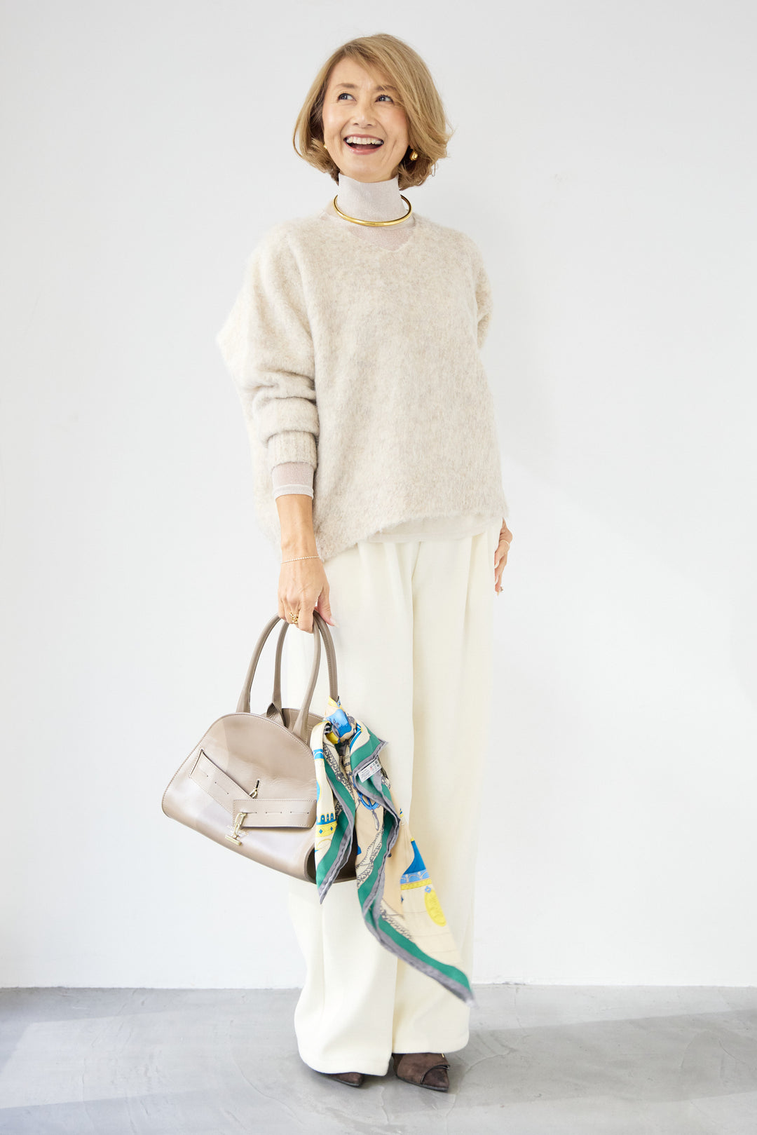 [SET]ヘアリーブークレVネックニット+裏起毛イージーワイドパンツ(2set)