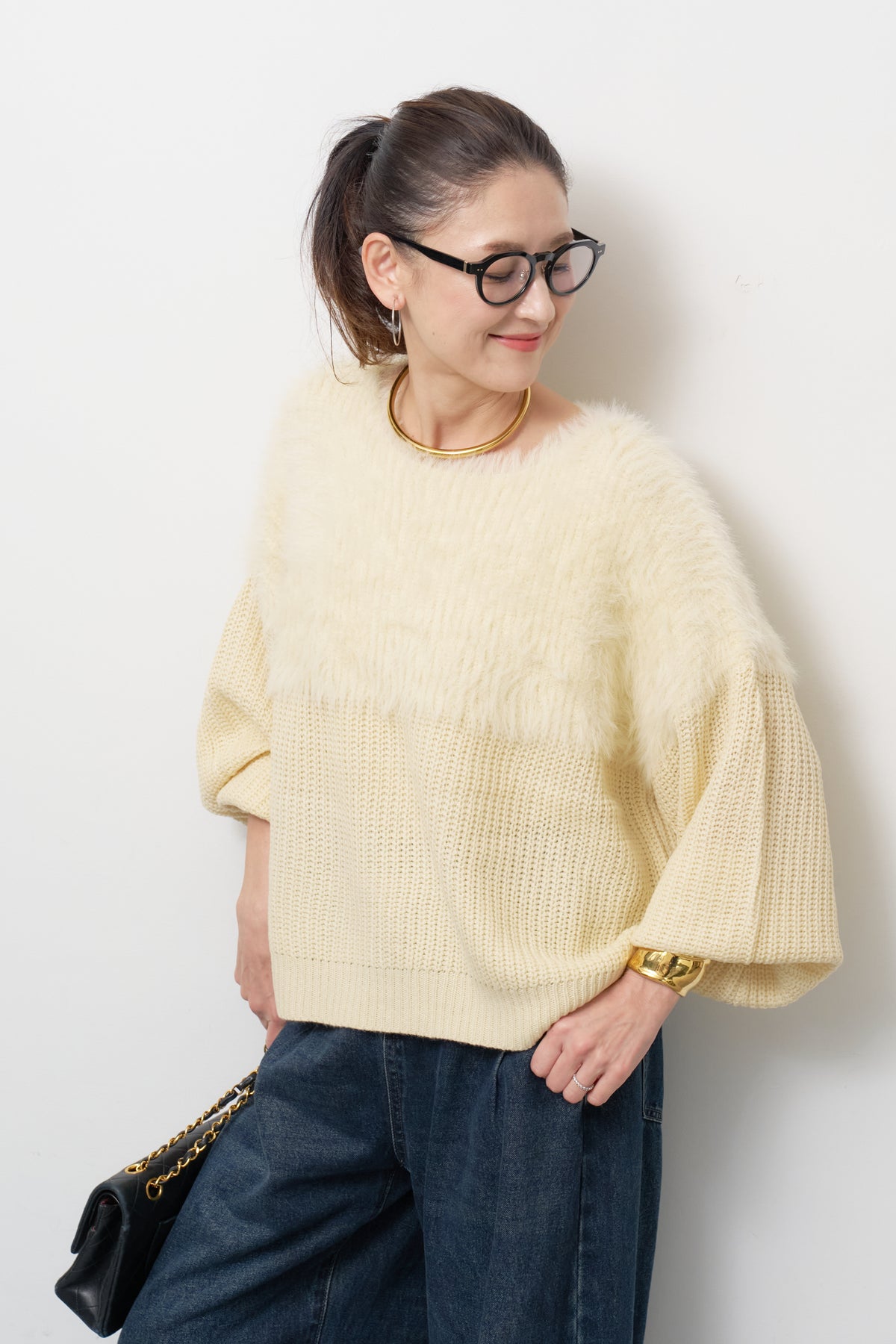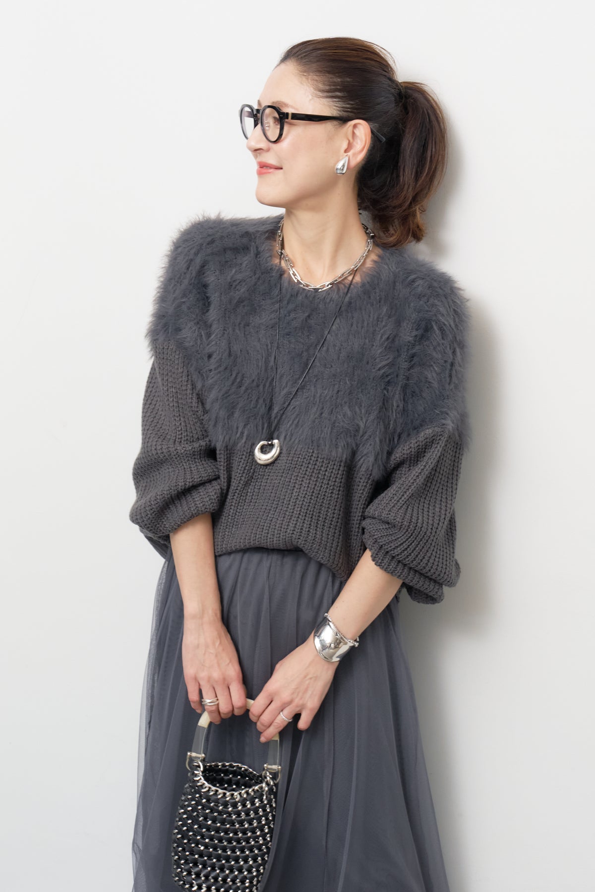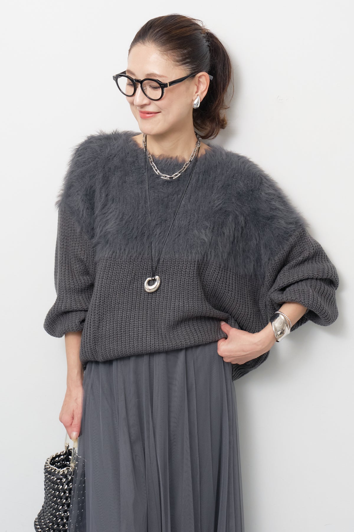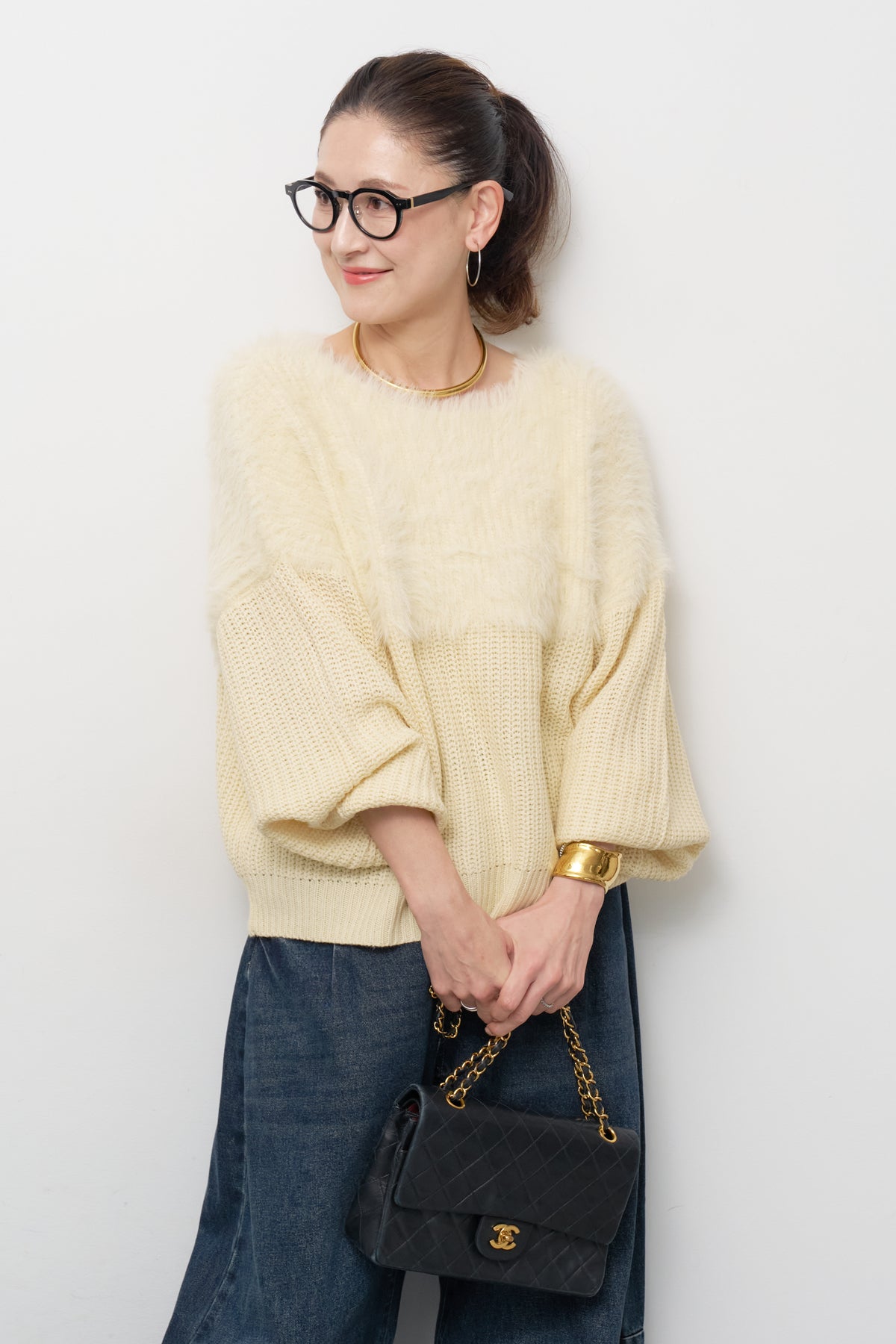 ふんわりとしたシャギー素材と、ざっくり編みのニットを組み合わせた存在感たっぷりの切替デザインニット。肩から胸元にかけて贅沢にあしらわれたシャギーは、顔まわりを華やかに見せつつ、柔らかな表情をプラスしてくれます。身頃は立体感のあるワッフル編みで、程よいゆとりがありボディラインを拾わずリラクシーな着心地。さらに、ぽわんとしたボリュームスリーブが女性らしい抜け感を演出し、スタイリングにトレンド感をプラスします。前後どちらから見ても映える切替デザインは、シンプルなボトムと合わせるだけでコーディネートが完成。スカートと合わせれば品よくエレガントに、パンツと合わせれば大人カジュアルな雰囲気に仕上がります。
