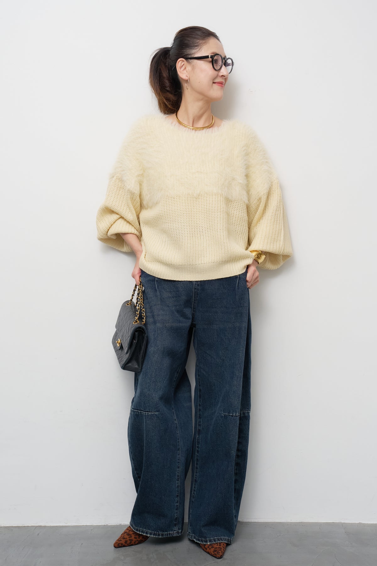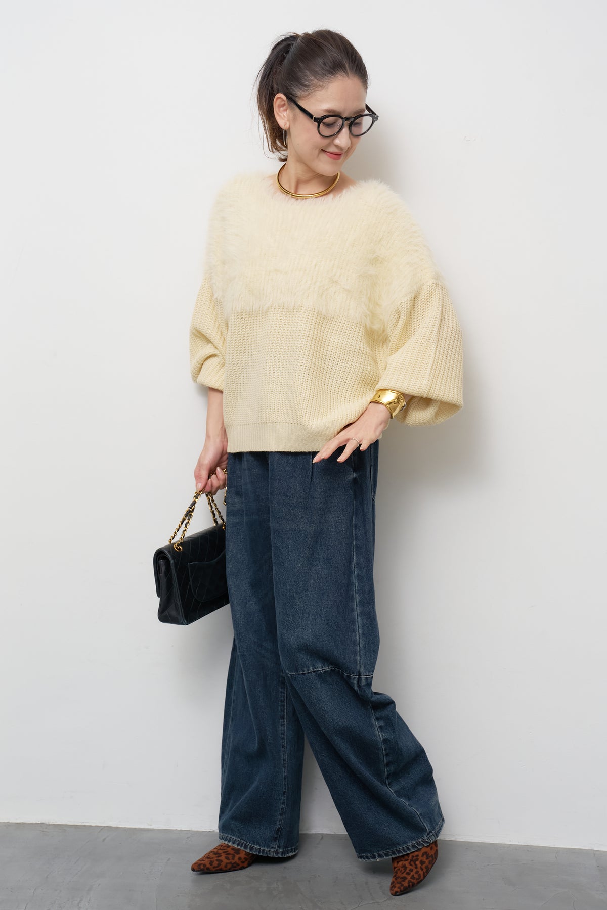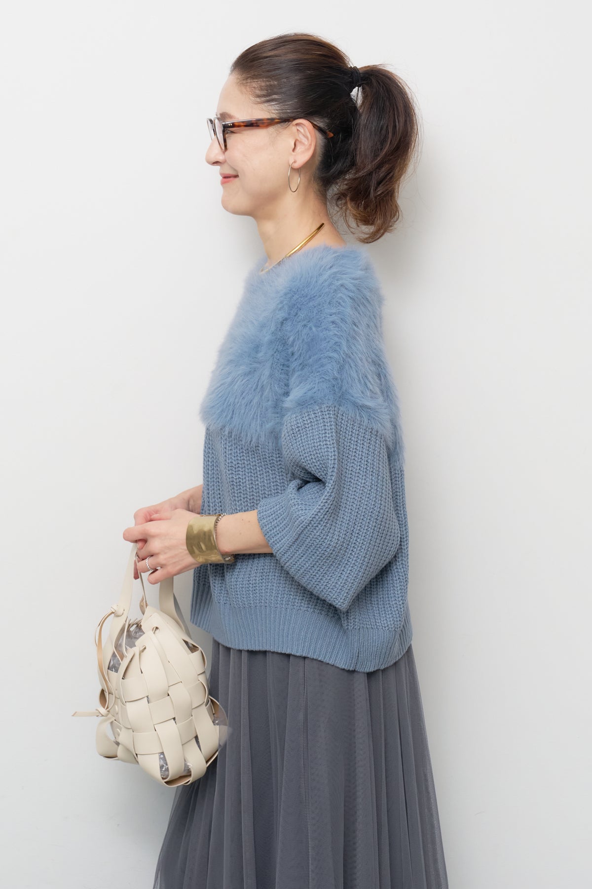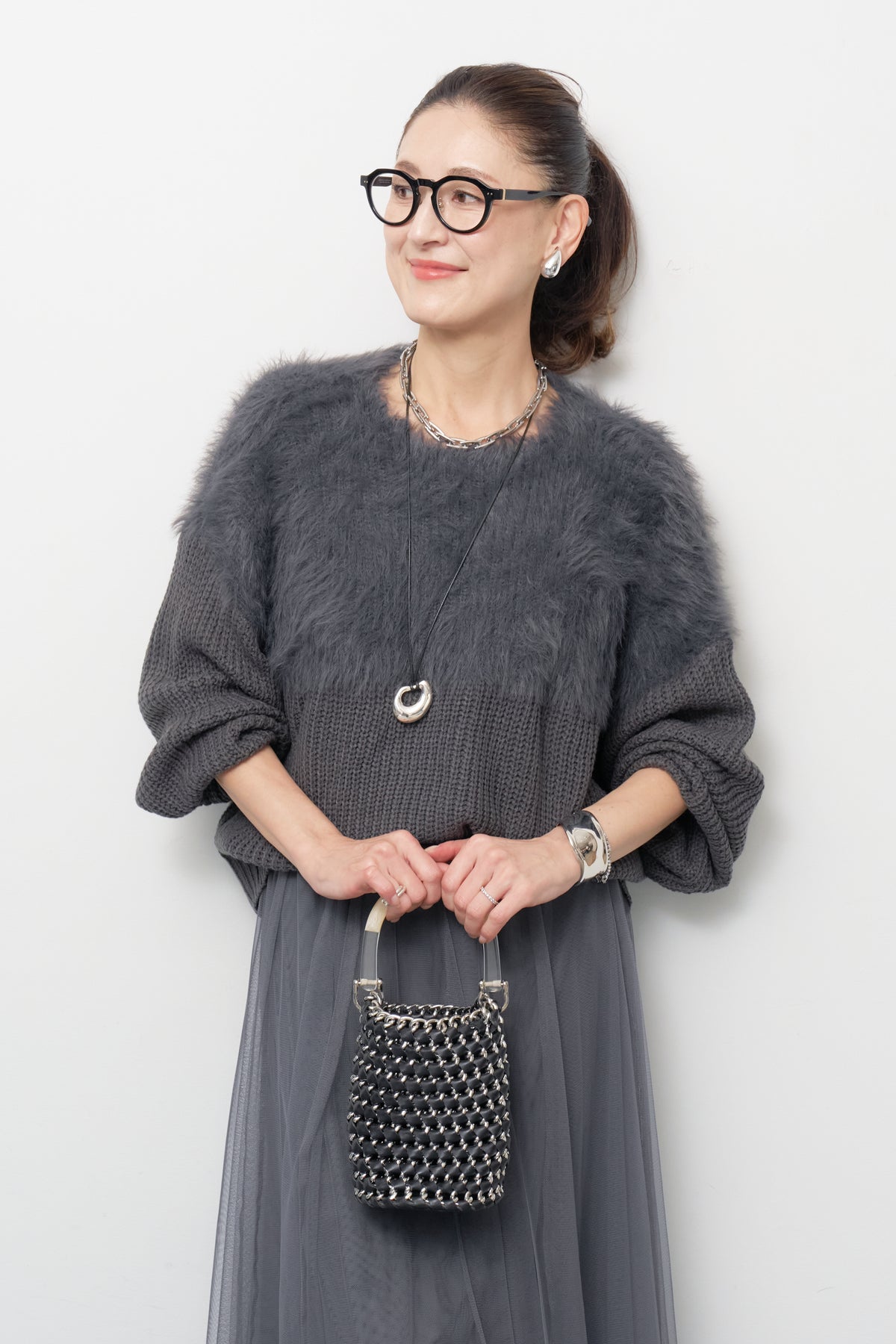 ふんわりとしたシャギー素材と、ざっくり編みのニットを組み合わせた存在感たっぷりの切替デザインニット。肩から胸元にかけて贅沢にあしらわれたシャギーは、顔まわりを華やかに見せつつ、柔らかな表情をプラスしてくれます。身頃は立体感のあるワッフル編みで、程よいゆとりがありボディラインを拾わずリラクシーな着心地。さらに、ぽわんとしたボリュームスリーブが女性らしい抜け感を演出し、スタイリングにトレンド感をプラスします。前後どちらから見ても映える切替デザインは、シンプルなボトムと合わせるだけでコーディネートが完成。スカートと合わせれば品よくエレガントに、パンツと合わせれば大人カジュアルな雰囲気に仕上がります。