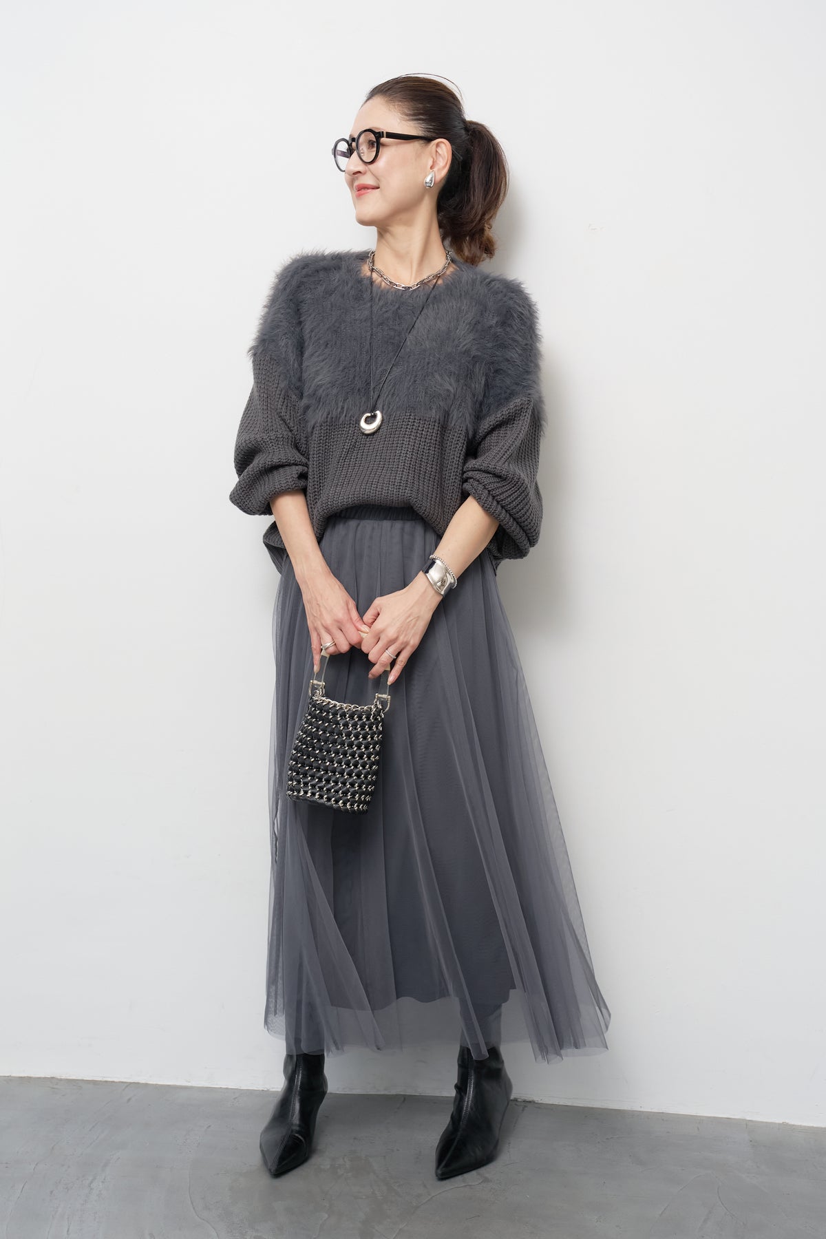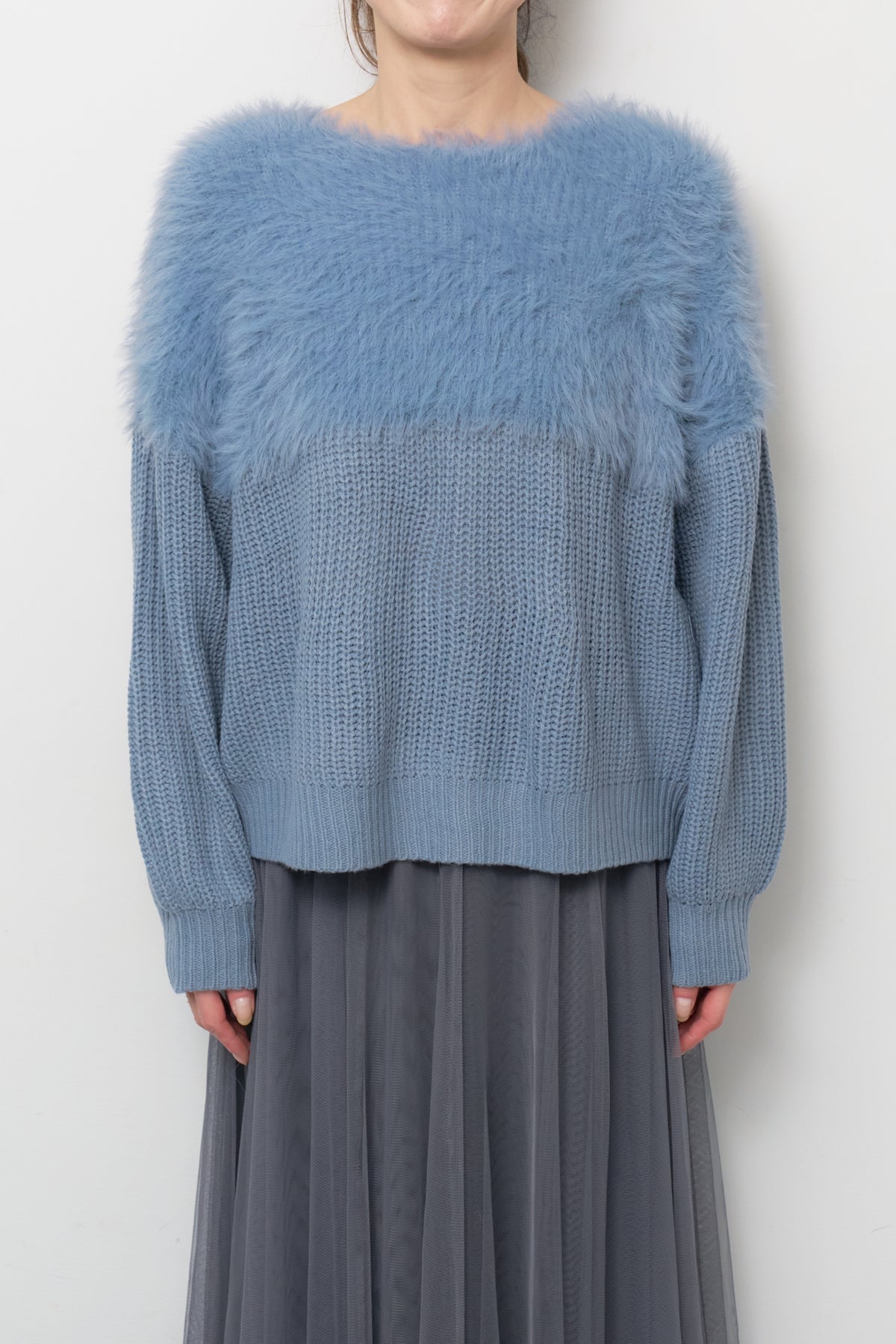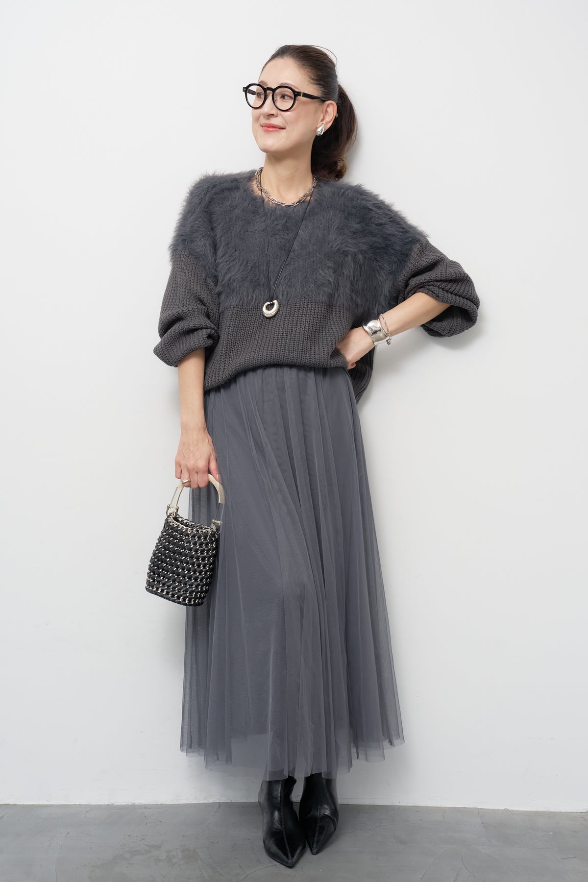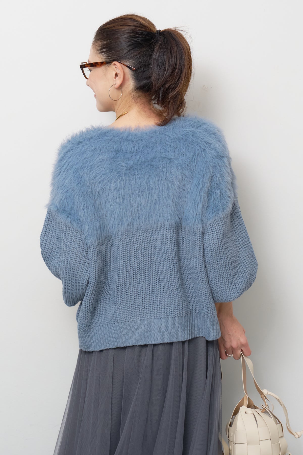 ふんわりとしたシャギー素材と、ざっくり編みのニットを組み合わせた存在感たっぷりの切替デザインニット。肩から胸元にかけて贅沢にあしらわれたシャギーは、顔まわりを華やかに見せつつ、柔らかな表情をプラスしてくれます。身頃は立体感のあるワッフル編みで、程よいゆとりがありボディラインを拾わずリラクシーな着心地。さらに、ぽわんとしたボリュームスリーブが女性らしい抜け感を演出し、スタイリングにトレンド感をプラスします。前後どちらから見ても映える切替デザインは、シンプルなボトムと合わせるだけでコーディネートが完成。スカートと合わせれば品よくエレガントに、パンツと合わせれば大人カジュアルな雰囲気に仕上がります。