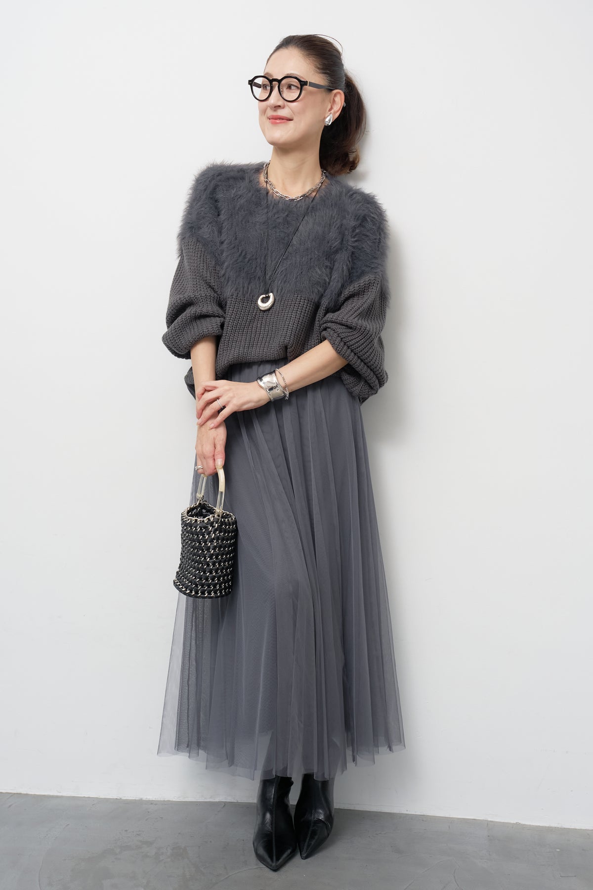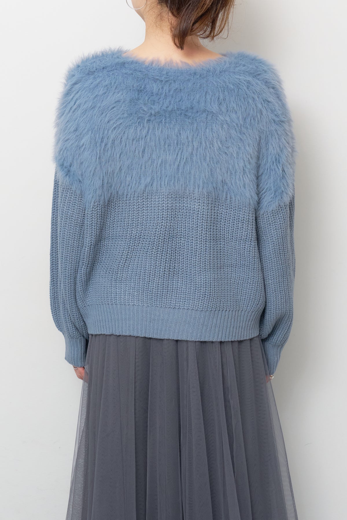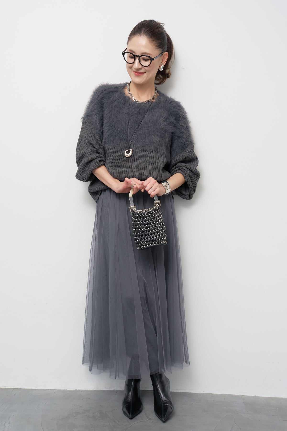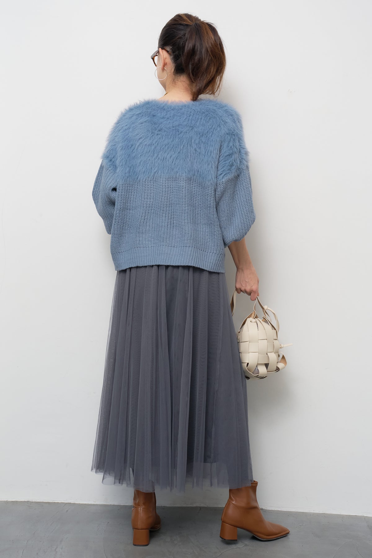 ふんわりとしたシャギー素材と、ざっくり編みのニットを組み合わせた存在感たっぷりの切替デザインニット。肩から胸元にかけて贅沢にあしらわれたシャギーは、顔まわりを華やかに見せつつ、柔らかな表情をプラスしてくれます。身頃は立体感のあるワッフル編みで、程よいゆとりがありボディラインを拾わずリラクシーな着心地。さらに、ぽわんとしたボリュームスリーブが女性らしい抜け感を演出し、スタイリングにトレンド感をプラスします。前後どちらから見ても映える切替デザインは、シンプルなボトムと合わせるだけでコーディネートが完成。スカートと合わせれば品よくエレガントに、パンツと合わせれば大人カジュアルな雰囲気に仕上がります。