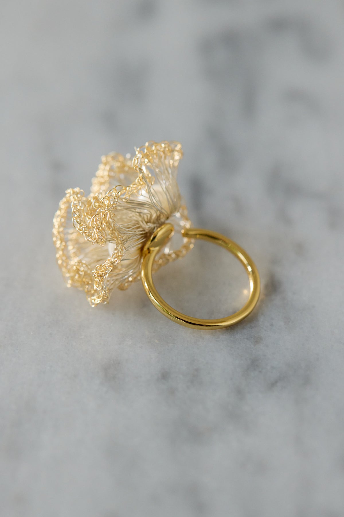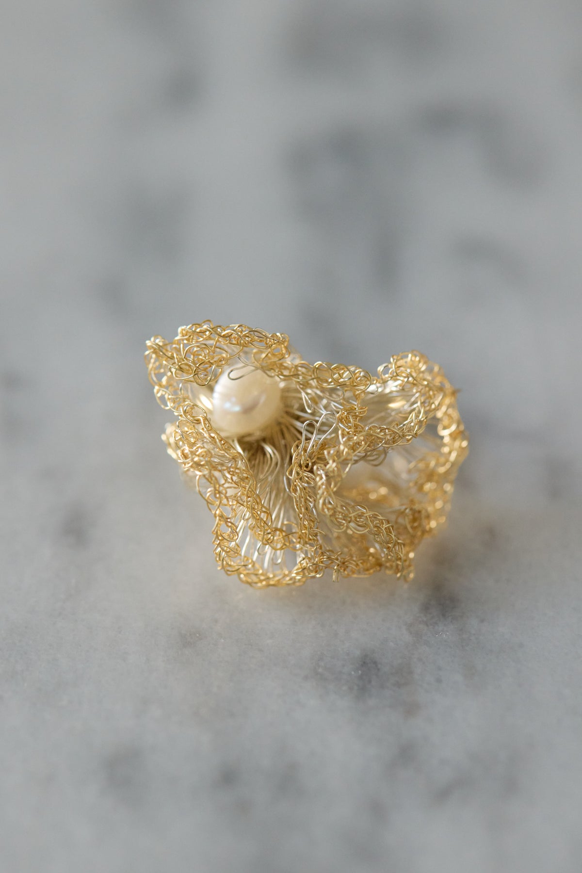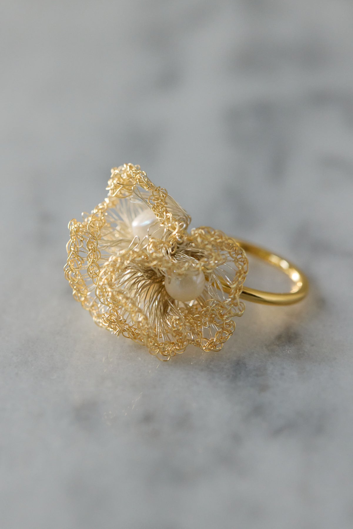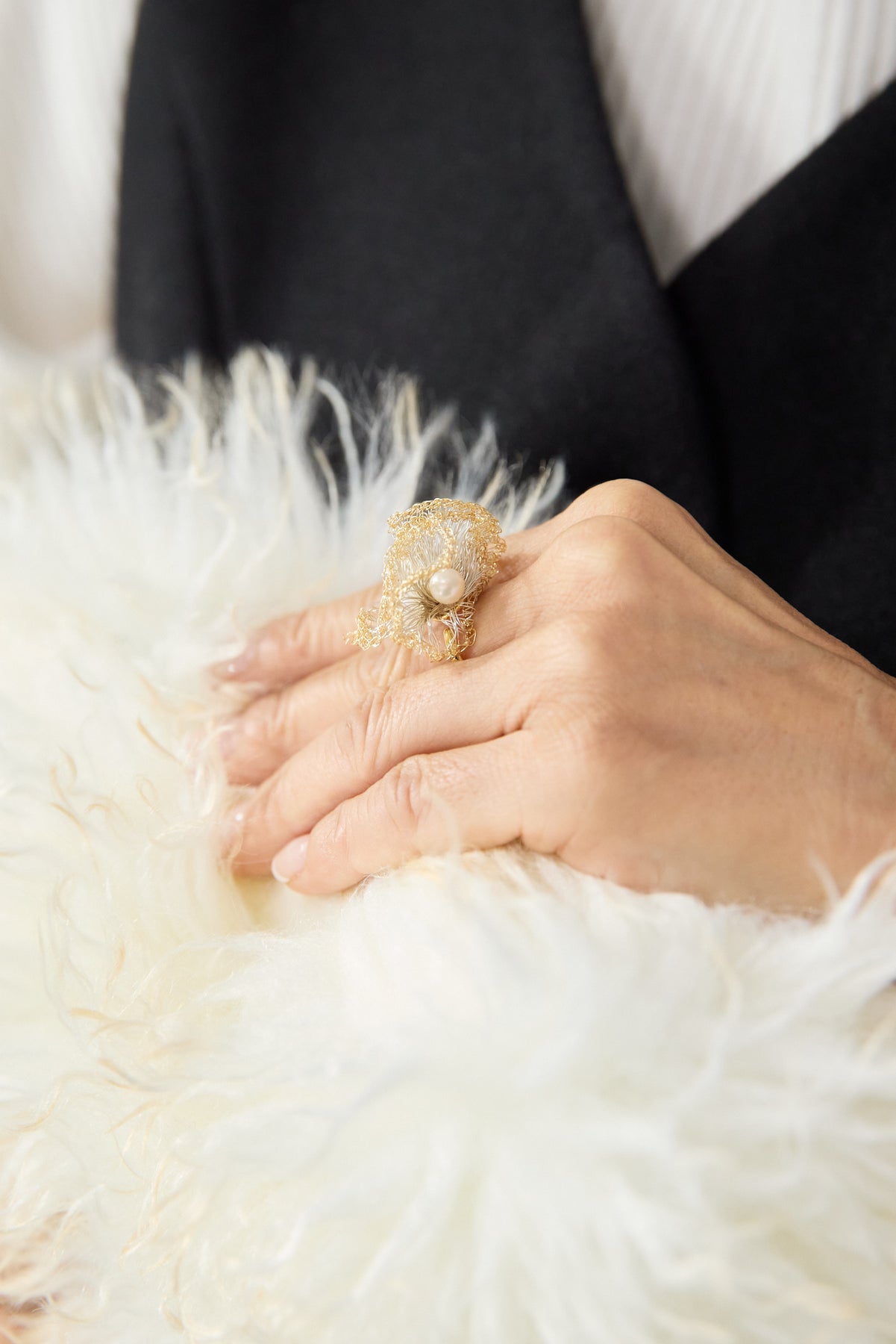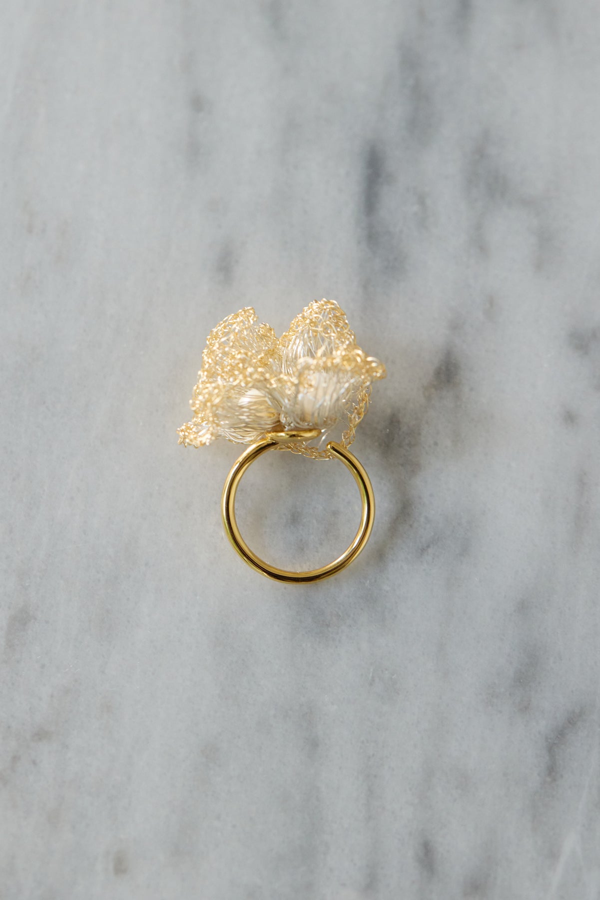 繊細なワイヤーワークで花びらを象った、アートピースのようなフラワーリング。軽やかに空気をまとったような立体的なデザインは、まるで“花が浮いている”かのように指先を彩ります。ワイヤーを丁寧に編み込んで成形された花びらには、中央にパールを添えて上品な華やかさをプラス。動くたびにきらめきが変化し、手元を印象的に演出します。シンプルな装いのアクセントにはもちろん特別な日のドレスアップにもおすすめ。