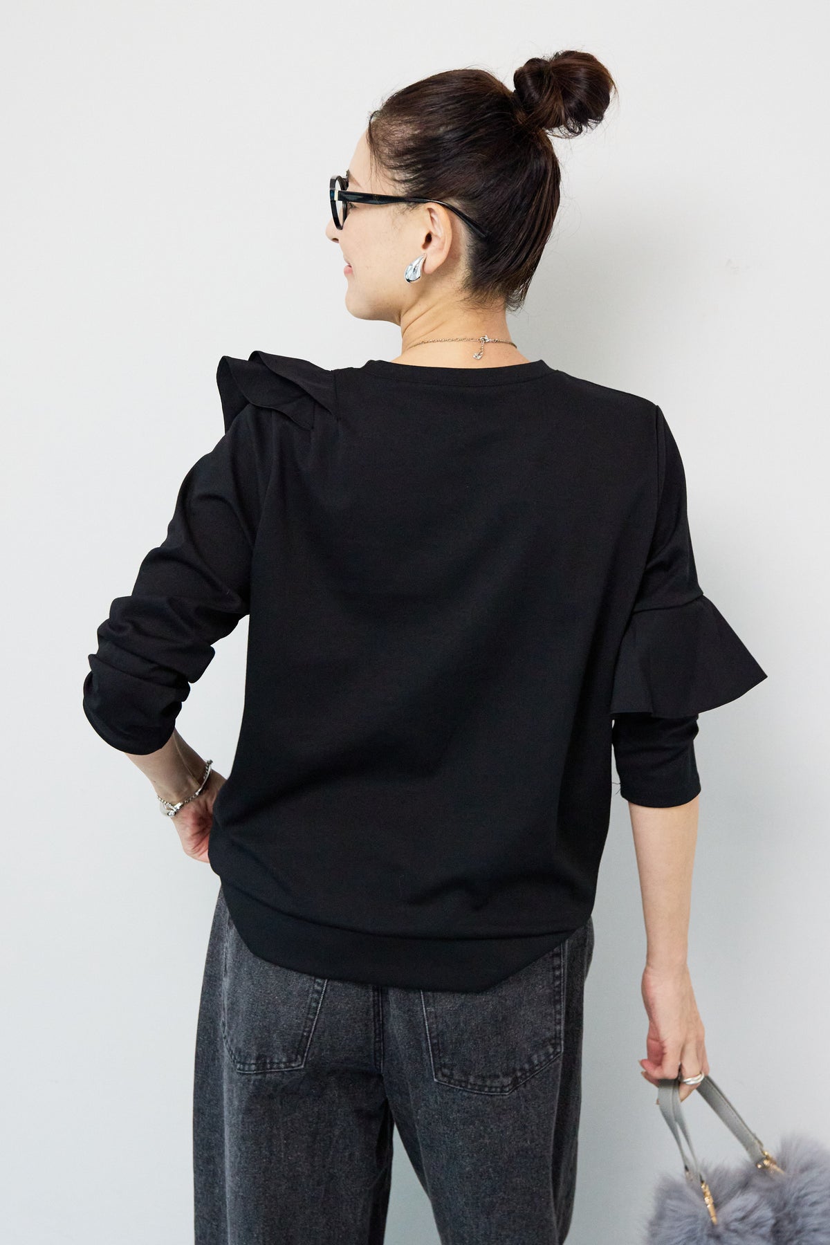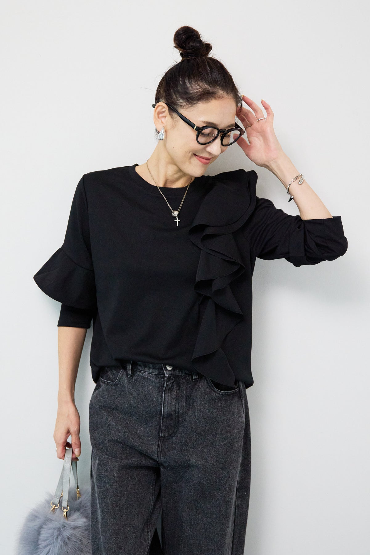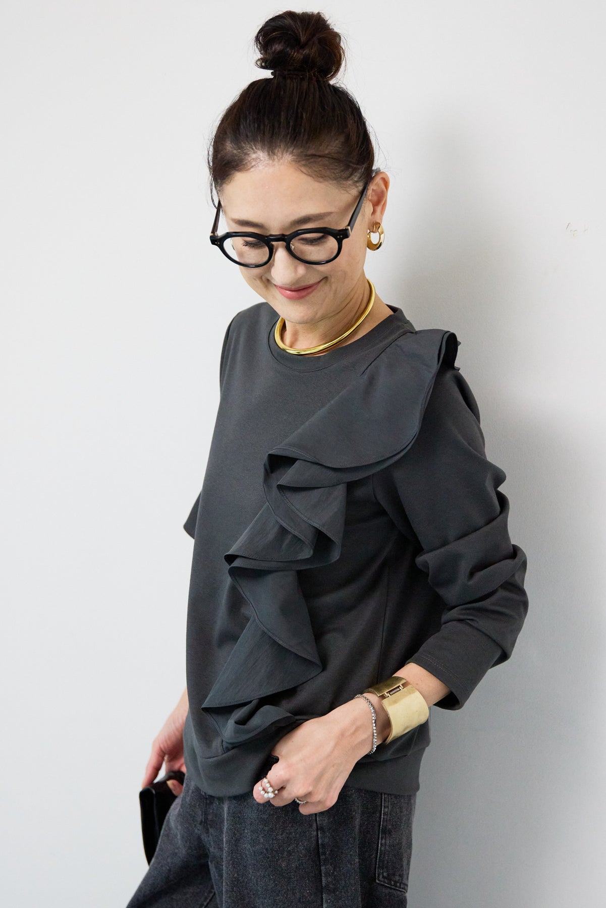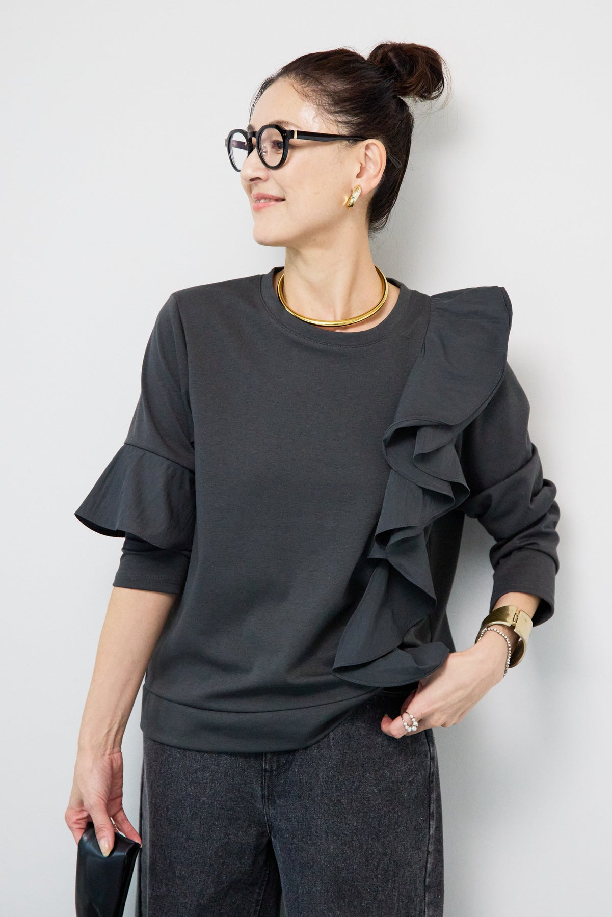 華やかなラッフルフリルが目を引くデザインカットソー。片側に流れるように配されたフリルと袖の切替フリルが立体感を生み出し、シンプルなシルエットに表情を添えます。程よい厚みのカットソー素材で着心地も良く、デイリー使いからきれいめなスタイリングまで対応可能。デニムと合わせてカジュアルに、スカートと合わせてモードに仕上げるなど、幅広い着こなしが楽しめるアイテムです。