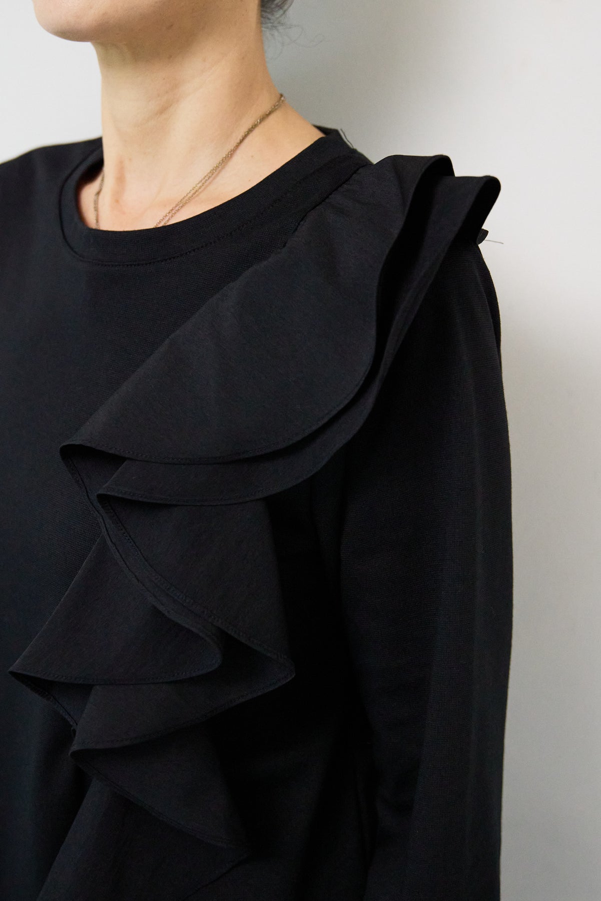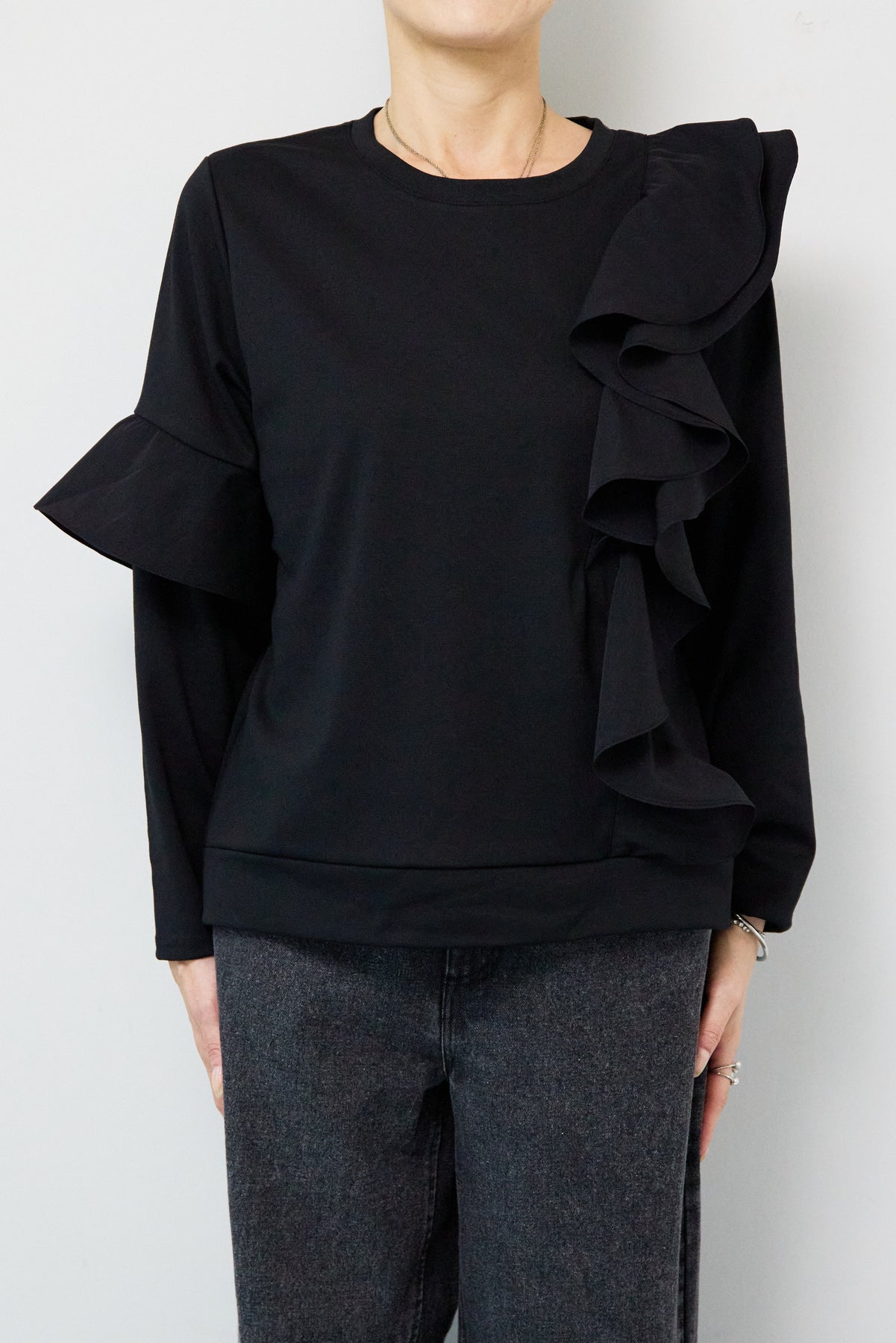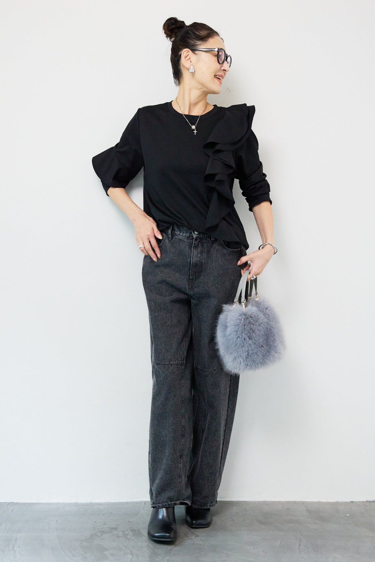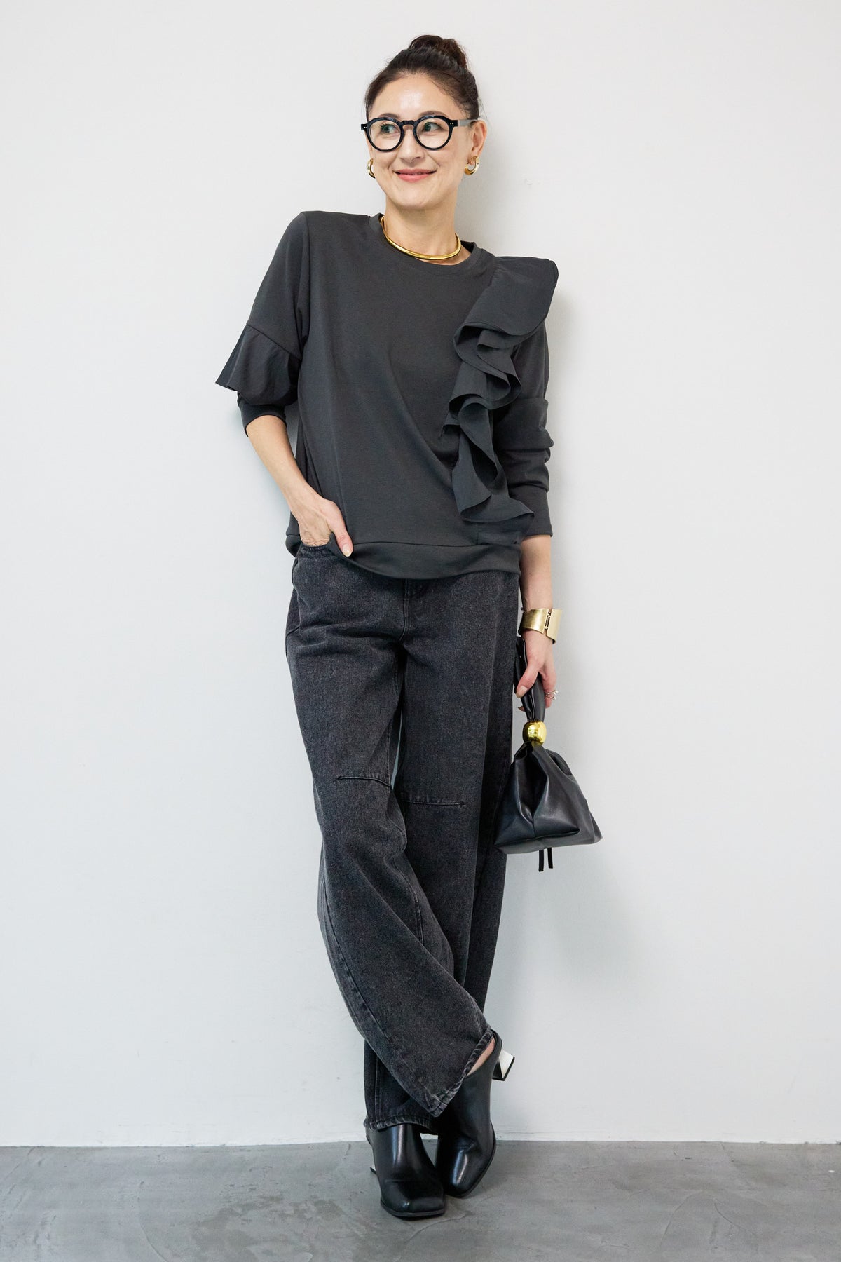華やかなラッフルフリルが目を引くデザインカットソー。片側に流れるように配されたフリルと袖の切替フリルが立体感を生み出し、シンプルなシルエットに表情を添えます。程よい厚みのカットソー素材で着心地も良く、デイリー使いからきれいめなスタイリングまで対応可能。デニムと合わせてカジュアルに、スカートと合わせてモードに仕上げるなど、幅広い着こなしが楽しめるアイテムです。