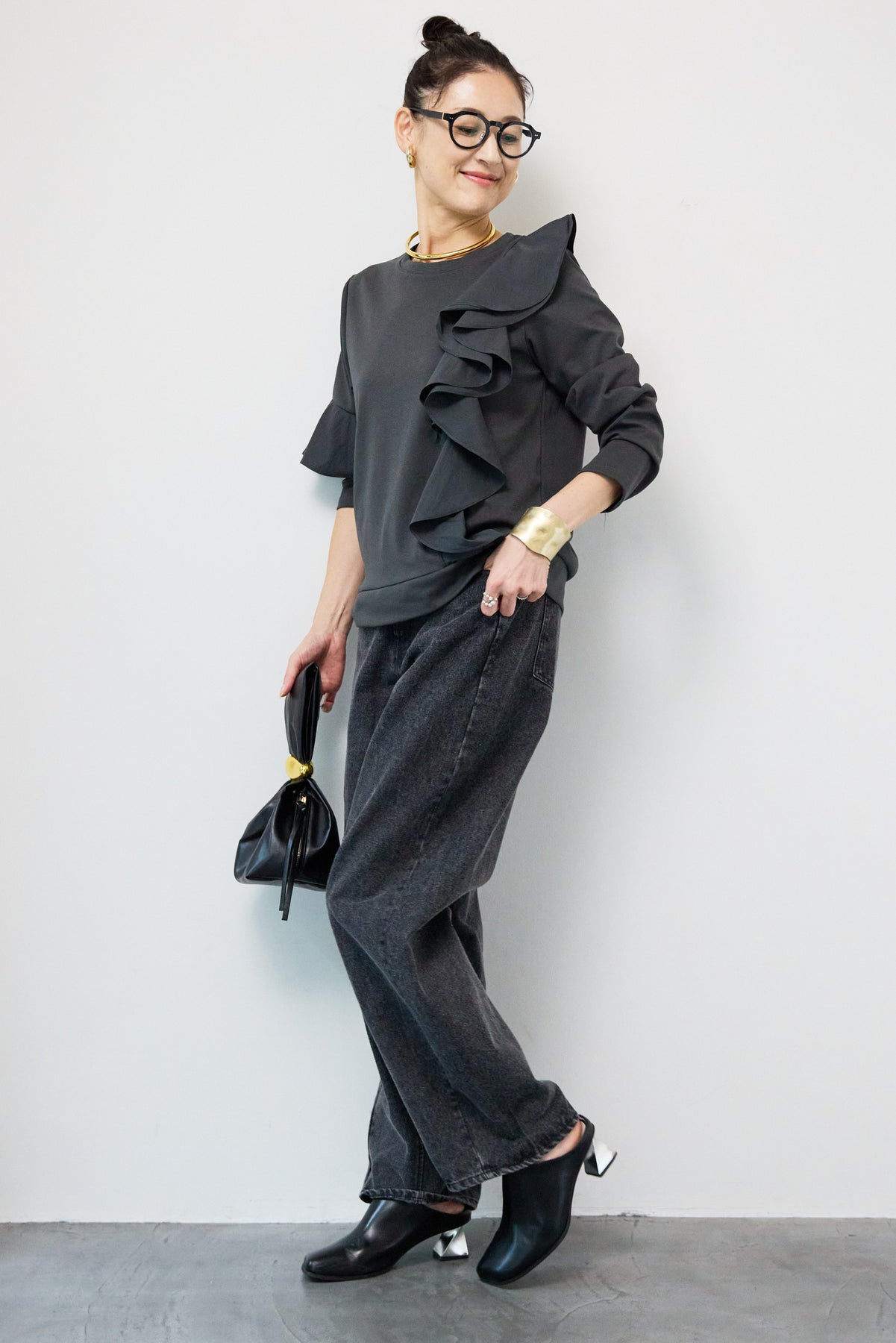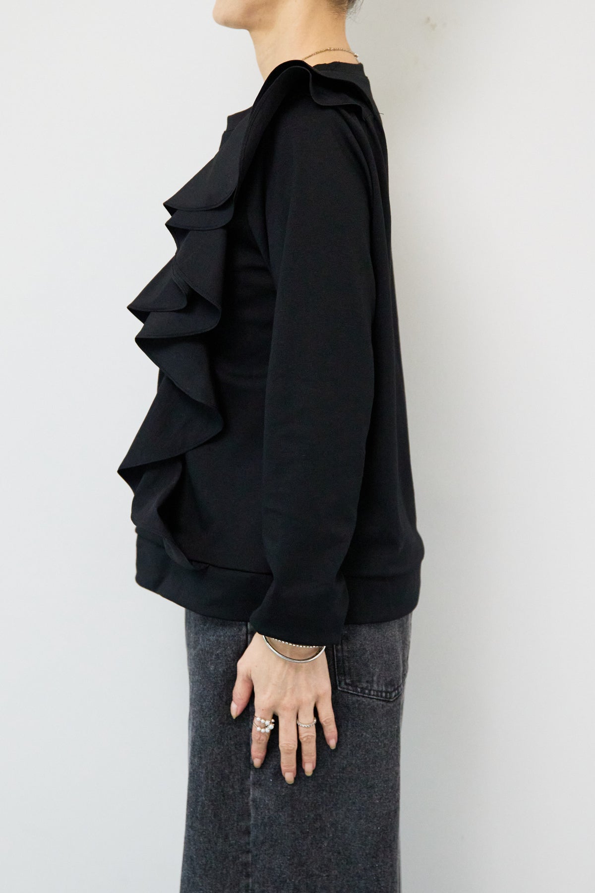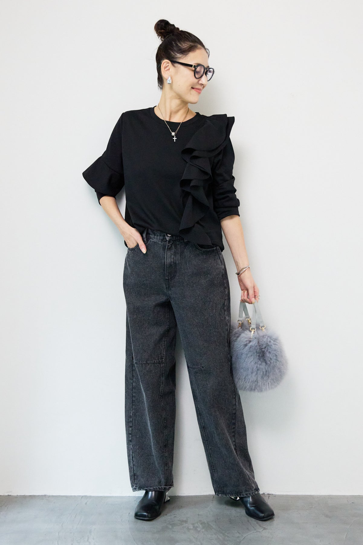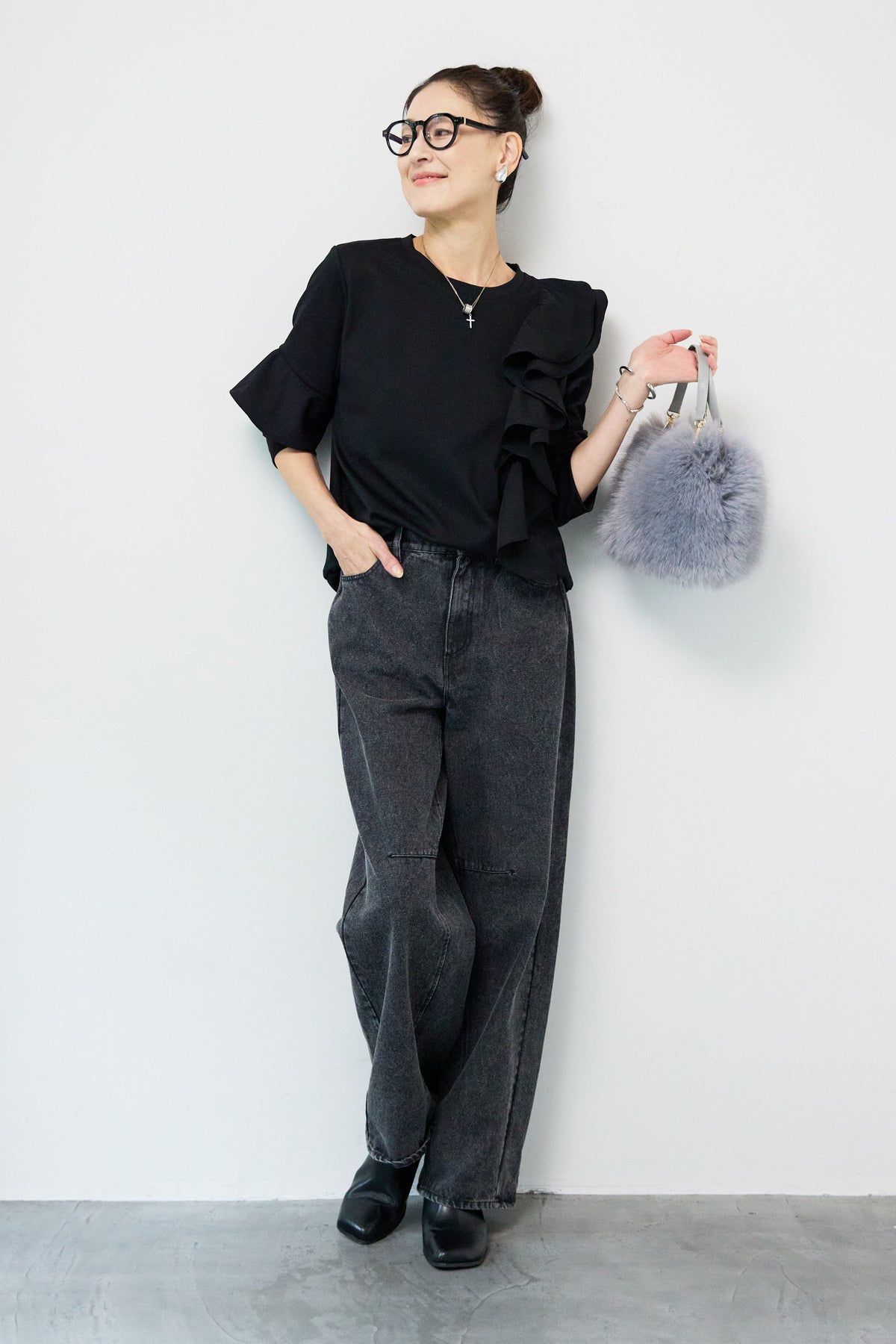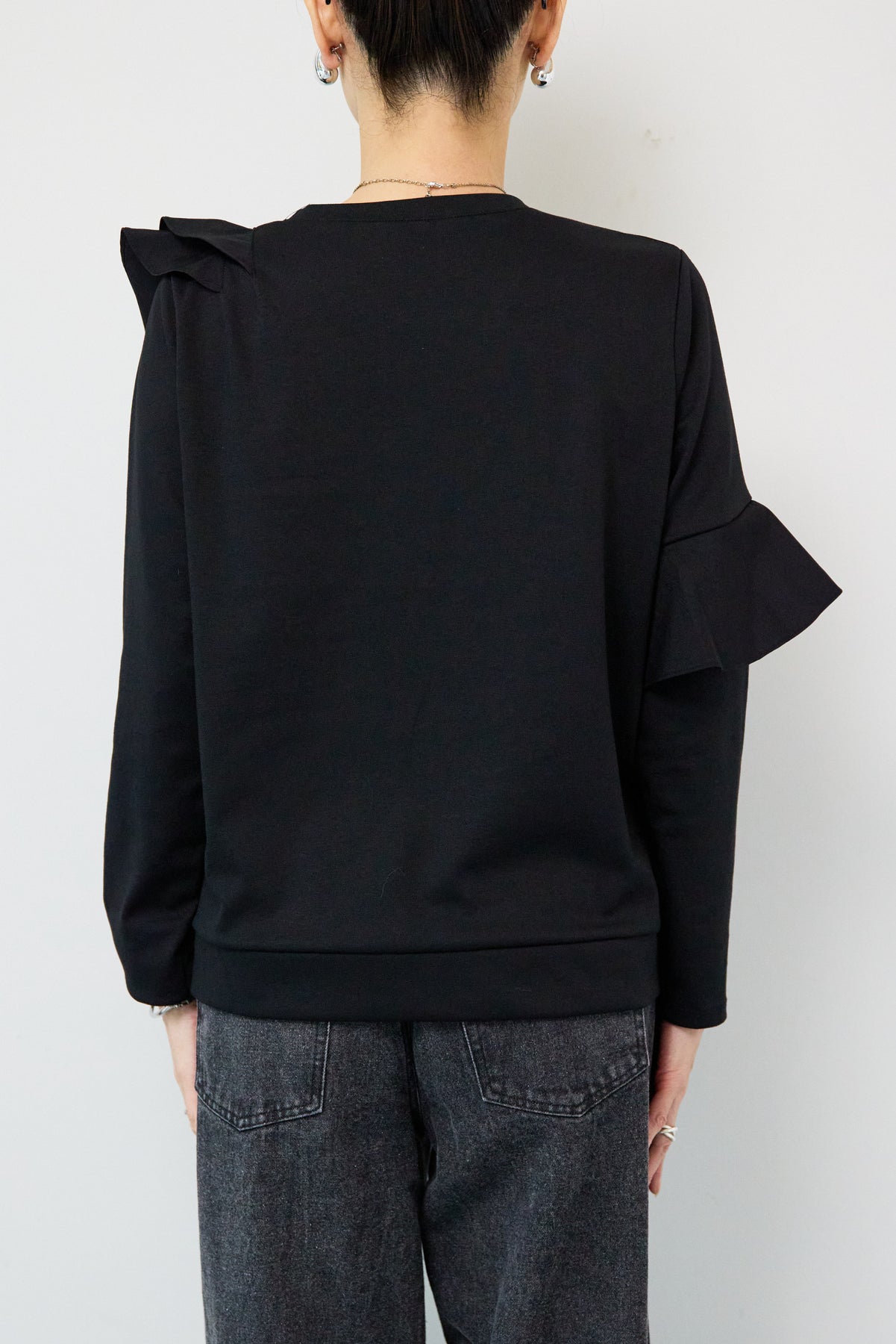 華やかなラッフルフリルが目を引くデザインカットソー。片側に流れるように配されたフリルと袖の切替フリルが立体感を生み出し、シンプルなシルエットに表情を添えます。程よい厚みのカットソー素材で着心地も良く、デイリー使いからきれいめなスタイリングまで対応可能。デニムと合わせてカジュアルに、スカートと合わせてモードに仕上げるなど、幅広い着こなしが楽しめるアイテムです。