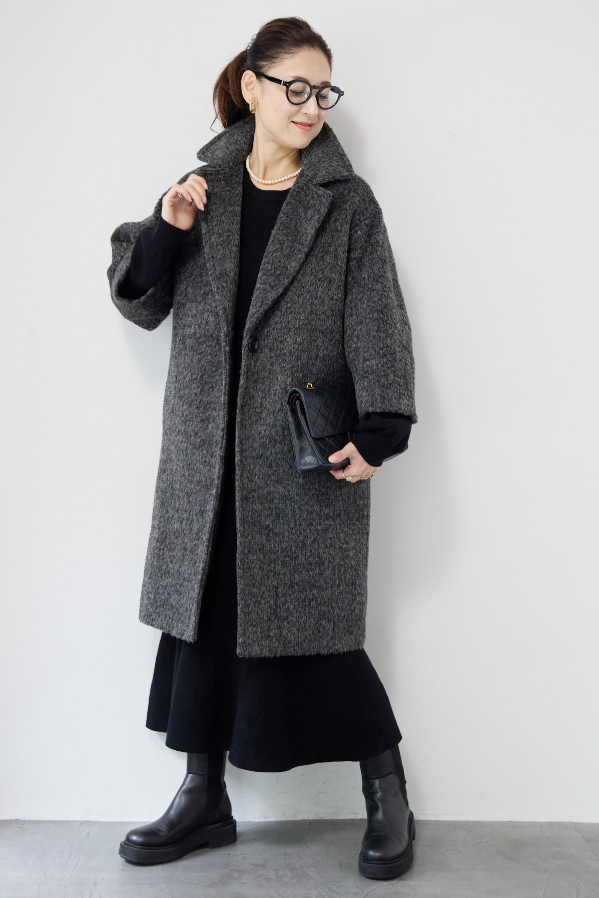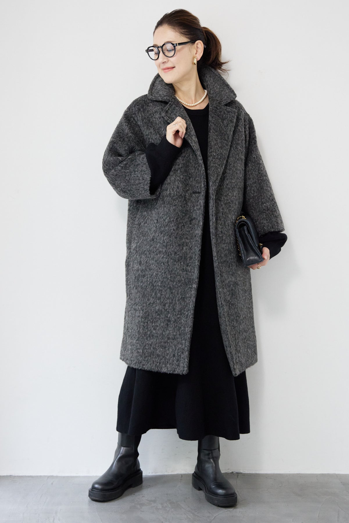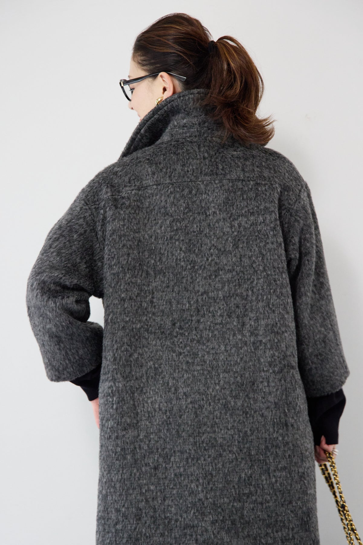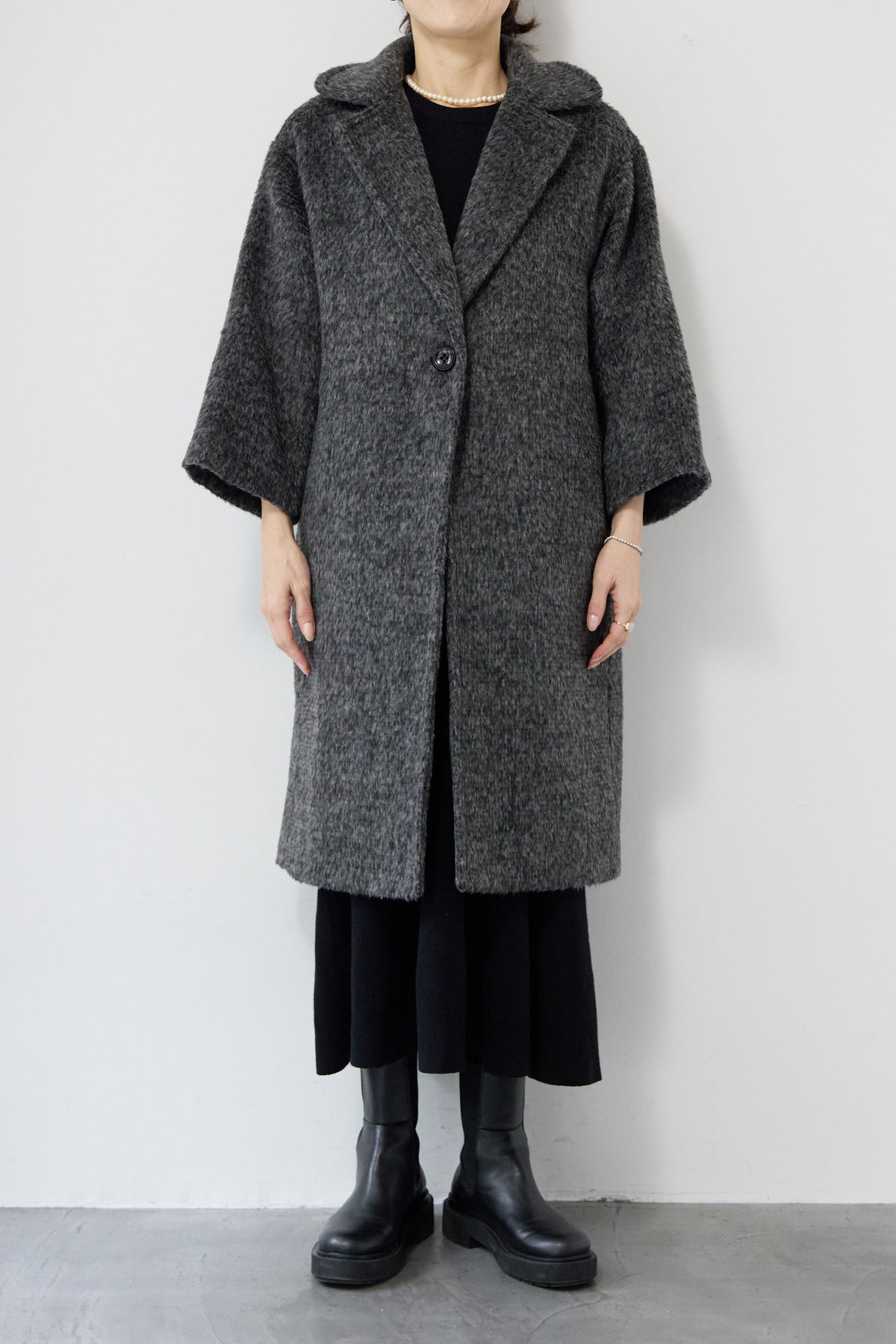 ふんわりとしたシャギー素材が魅力の、大人の雰囲気漂うチェスターコート。ミックスグレーの柔らかな色味とゆとりのあるシルエットが、上品な抜け感を演出します。軽い着心地ながら内側はキルティングでしっかりと暖かく、冬のお出かけにも頼れる一枚。襟は立てても折っても形が決まり、どんなコーデにも馴染む万能アウターです。シンプルながらひと味違う存在感で、毎日のスタイリングに寄り添います。