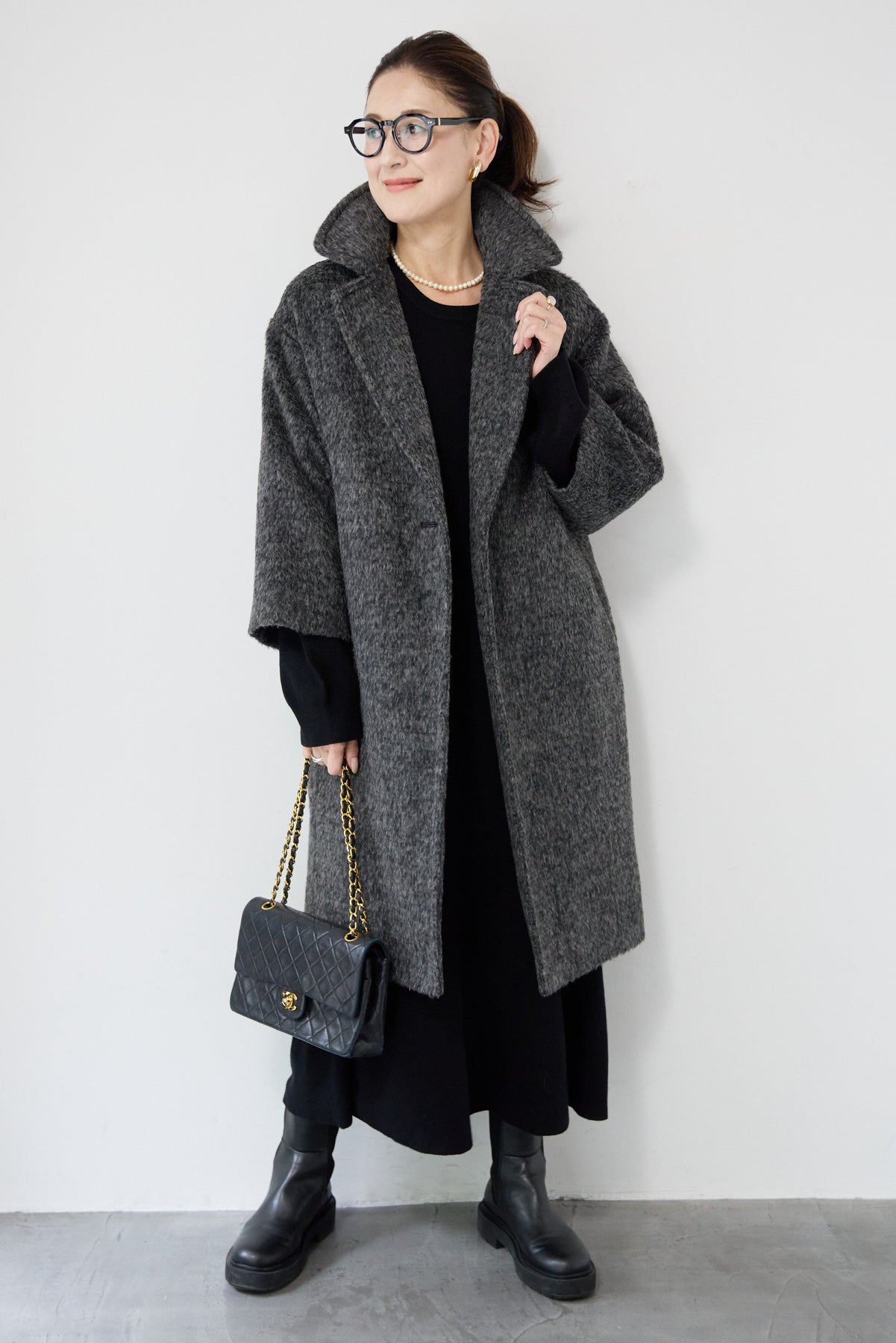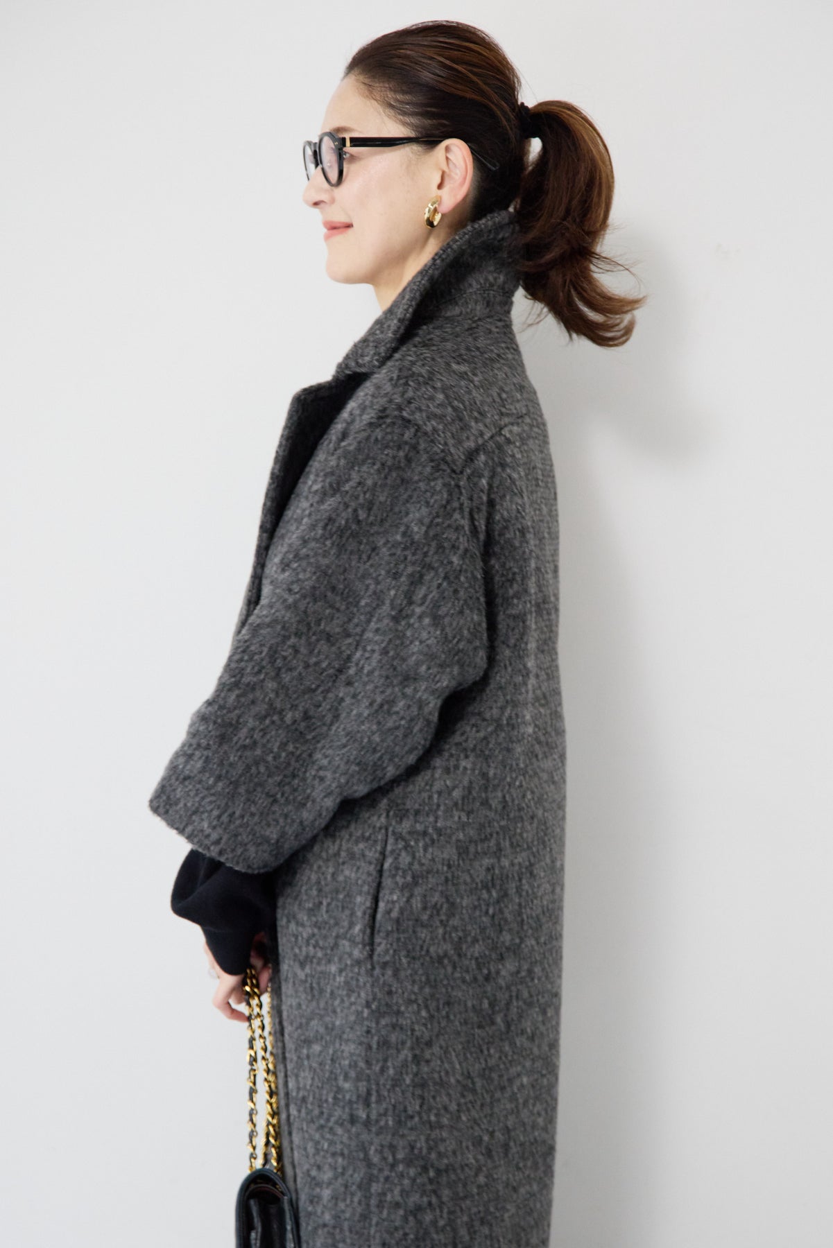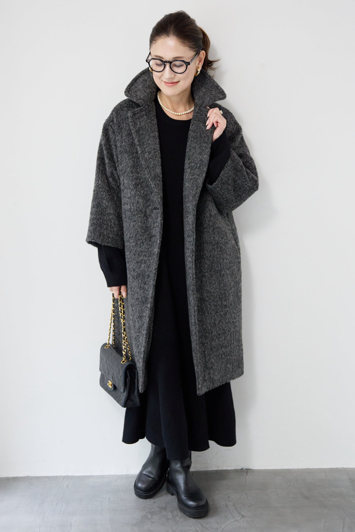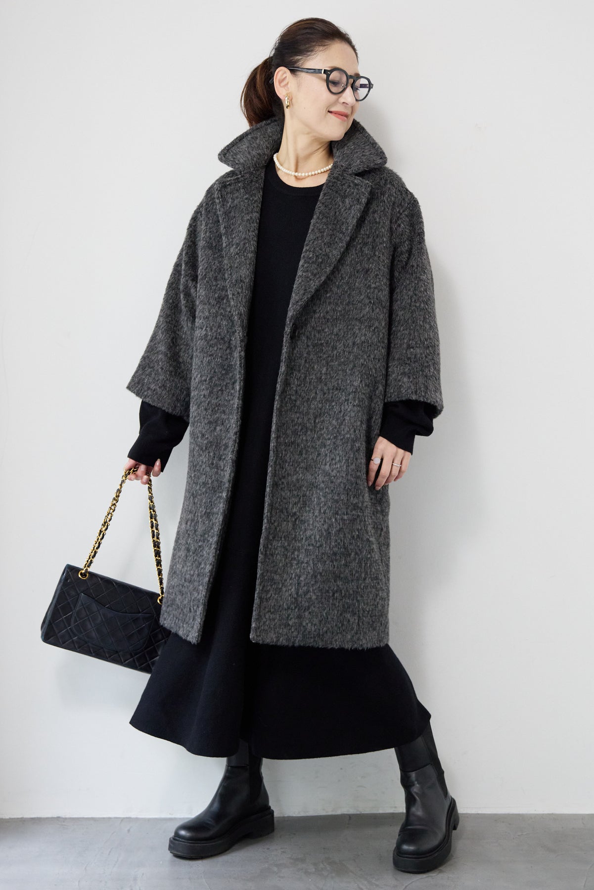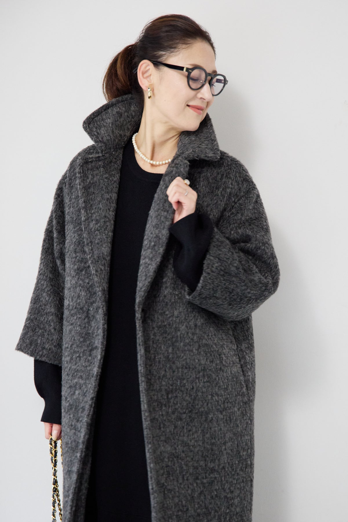 ふんわりとしたシャギー素材が魅力の、大人の雰囲気漂うチェスターコート。ミックスグレーの柔らかな色味とゆとりのあるシルエットが、上品な抜け感を演出します。軽い着心地ながら内側はキルティングでしっかりと暖かく、冬のお出かけにも頼れる一枚。襟は立てても折っても形が決まり、どんなコーデにも馴染む万能アウターです。シンプルながらひと味違う存在感で、毎日のスタイリングに寄り添います。
