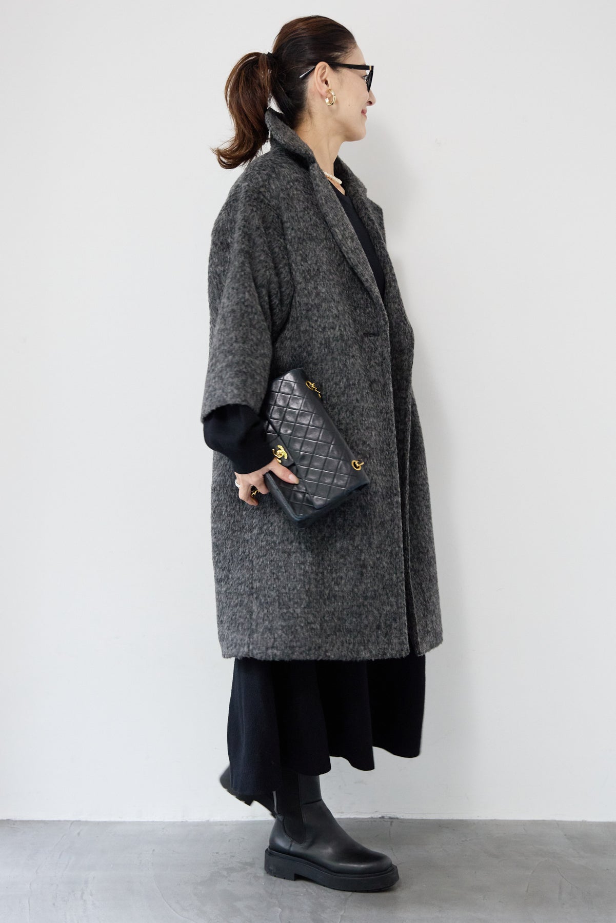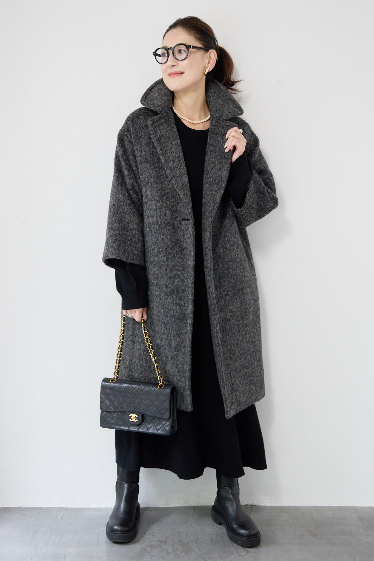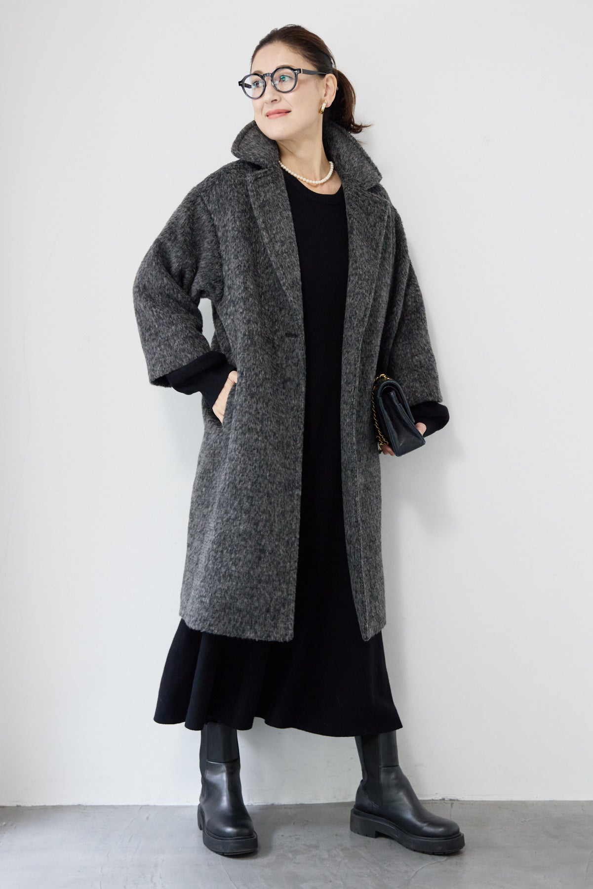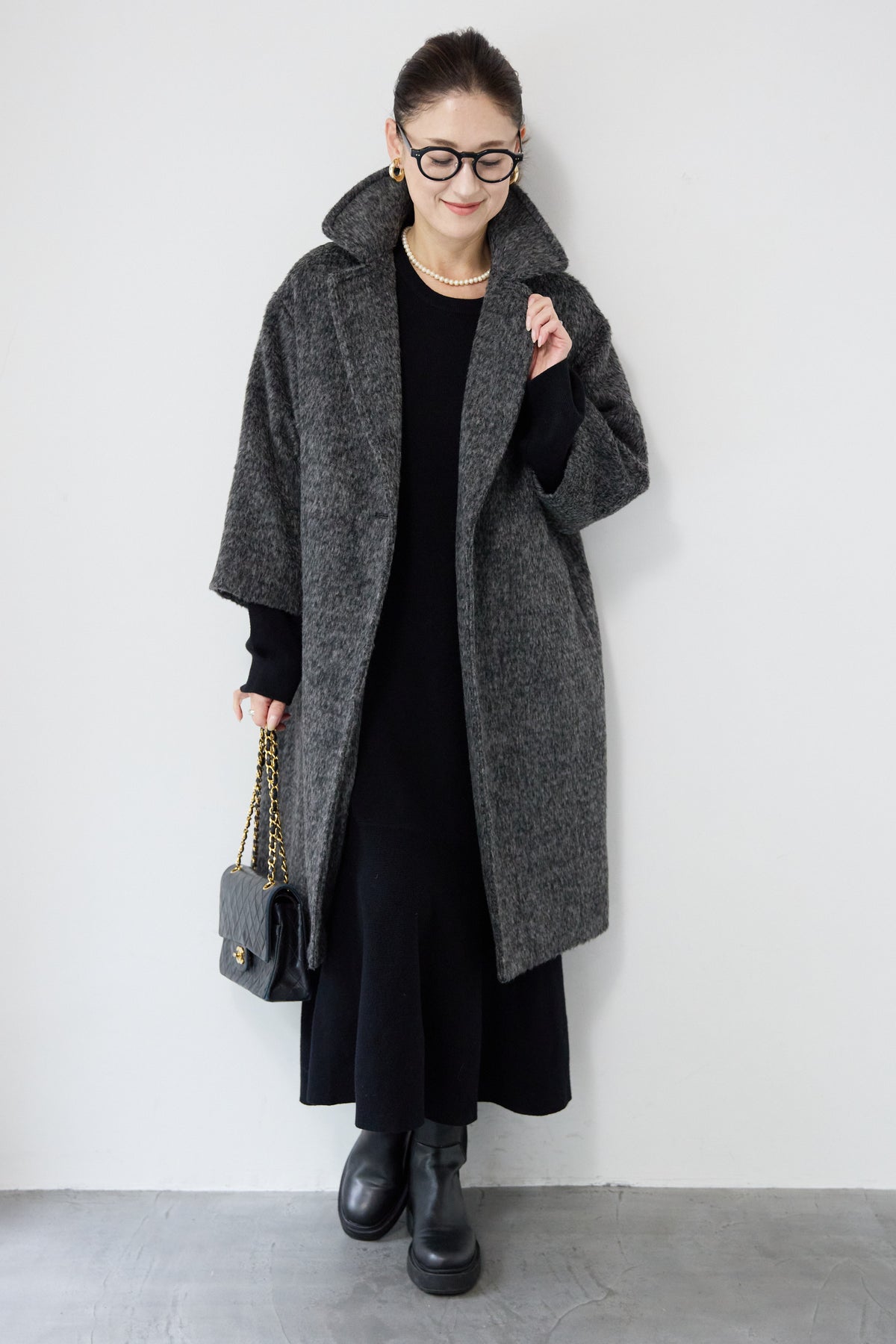 ふんわりとしたシャギー素材が魅力の、大人の雰囲気漂うチェスターコート。ミックスグレーの柔らかな色味とゆとりのあるシルエットが、上品な抜け感を演出します。軽い着心地ながら内側はキルティングでしっかりと暖かく、冬のお出かけにも頼れる一枚。襟は立てても折っても形が決まり、どんなコーデにも馴染む万能アウターです。シンプルながらひと味違う存在感で、毎日のスタイリングに寄り添います。