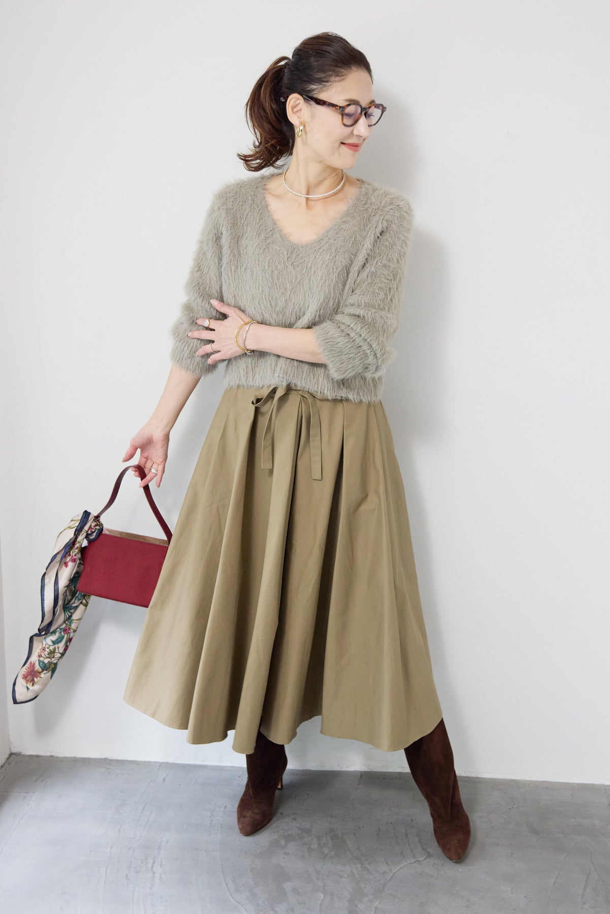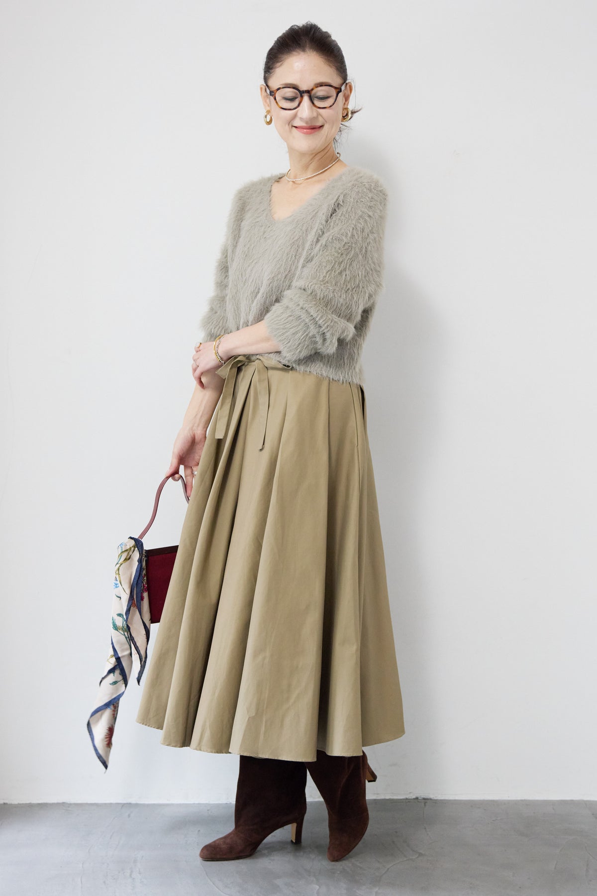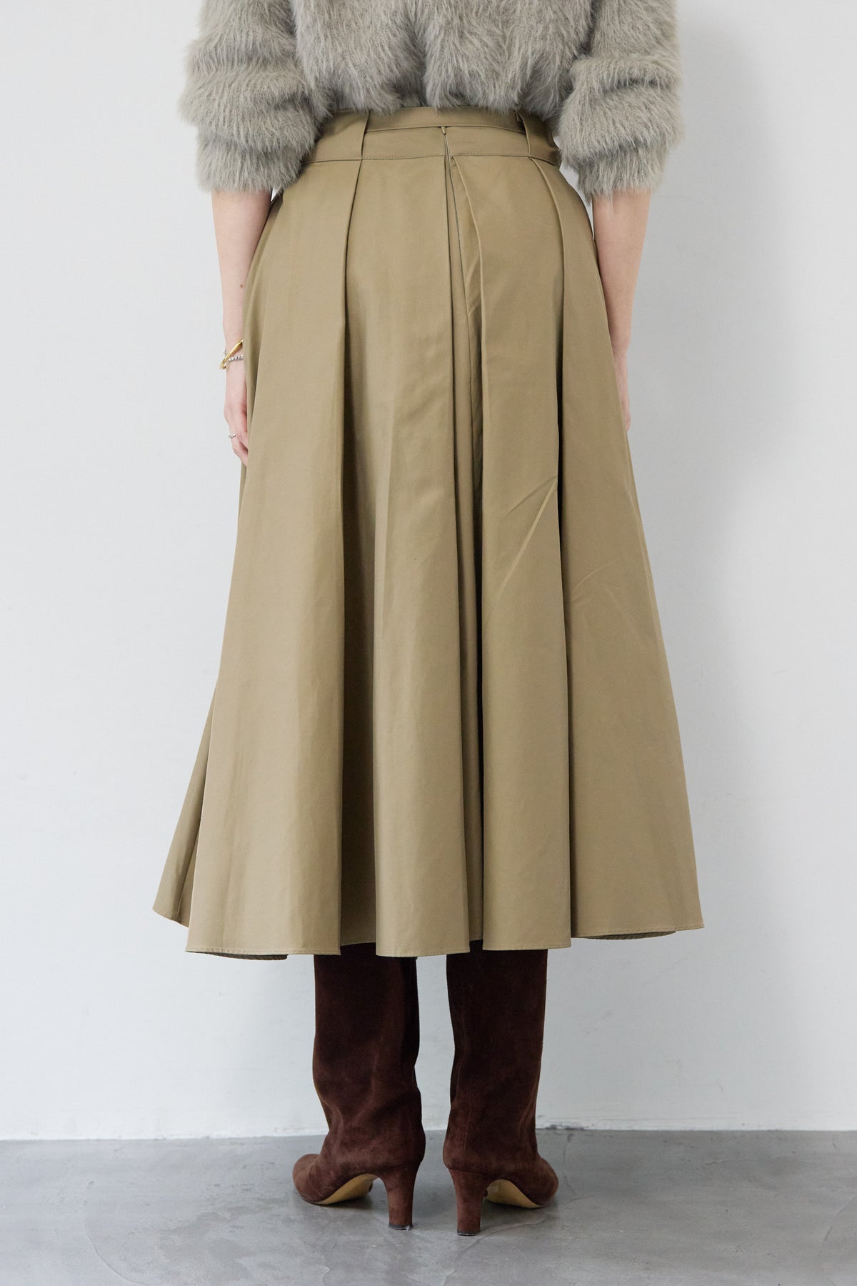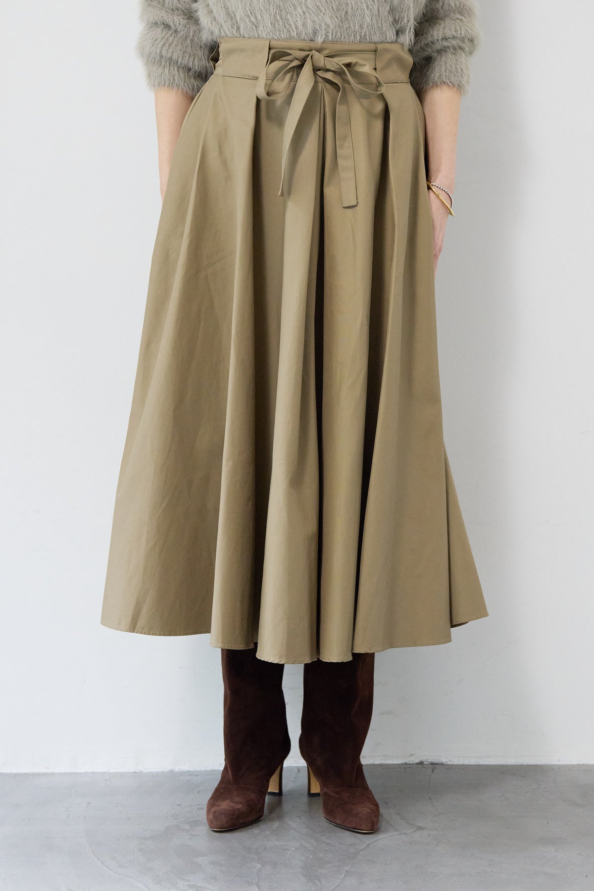 上質なハリ感を持つ素材で仕立てた、エレガントなロングタックスカート。立体的に広がるフレアラインが歩くたびに揺れ、女性らしい美シルエットを演出します。ウエスト周りにはタックをたっぷり入れつつ、すっきりと収まる設計で品のある印象に。同素材のリボンベルト付きで、気分に合わせてアレンジが可能です。フロントのウエストマークはスタイルアップ効果も◎バックスタイルにはコンシールファスナーを採用し、着脱もスムーズに。両サイドには便利なポケット付きで、デイリーにも活躍します。