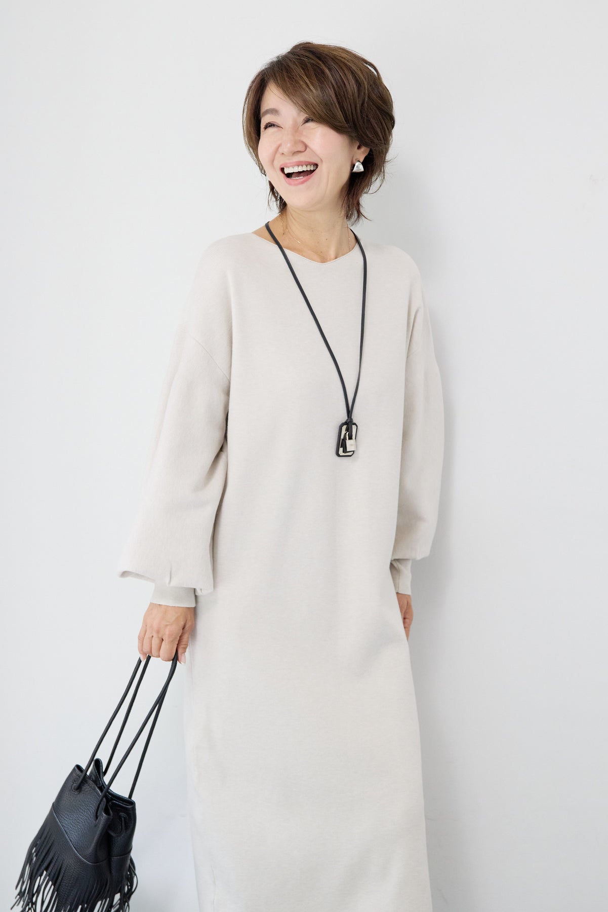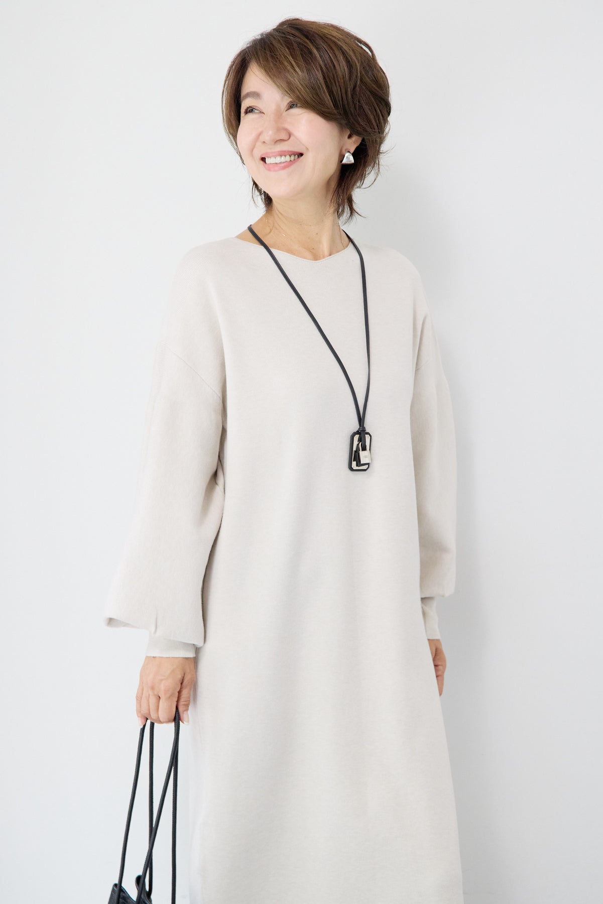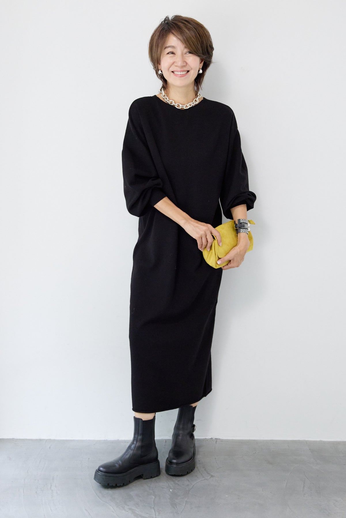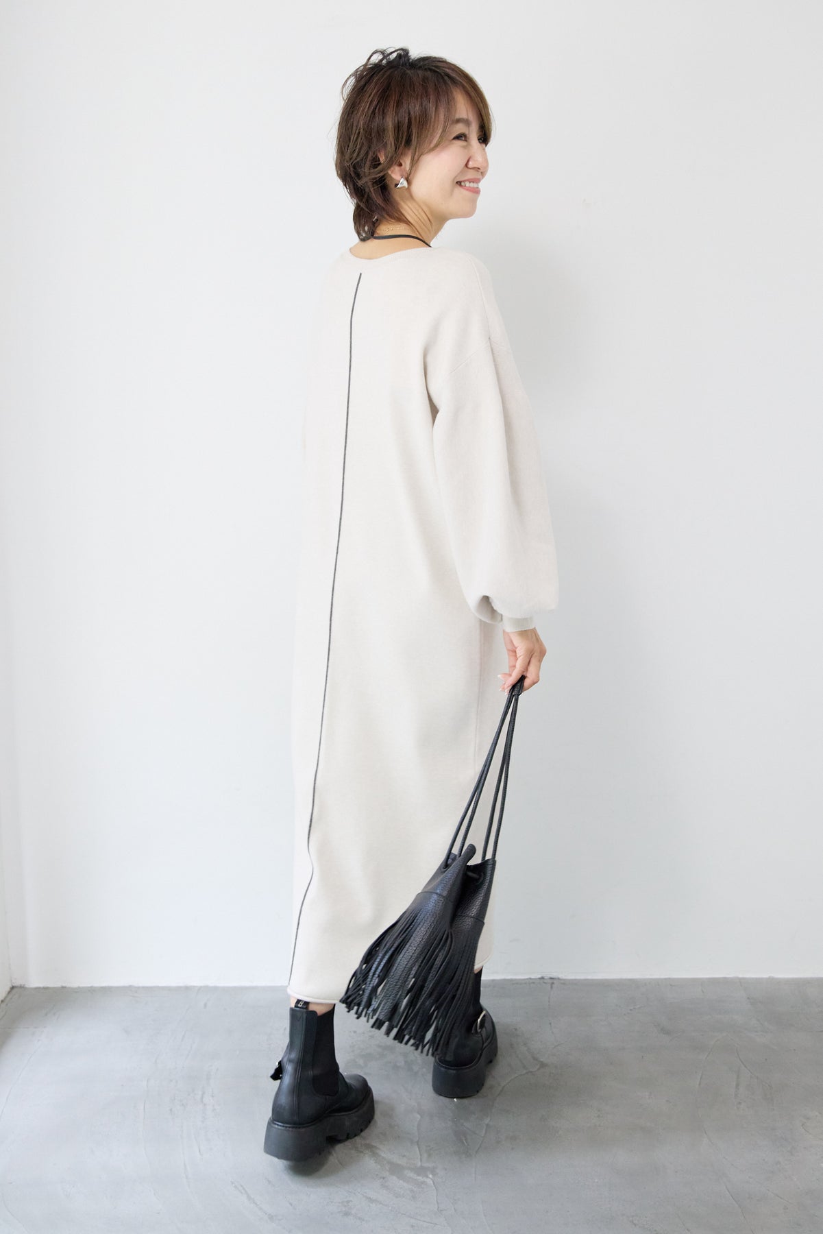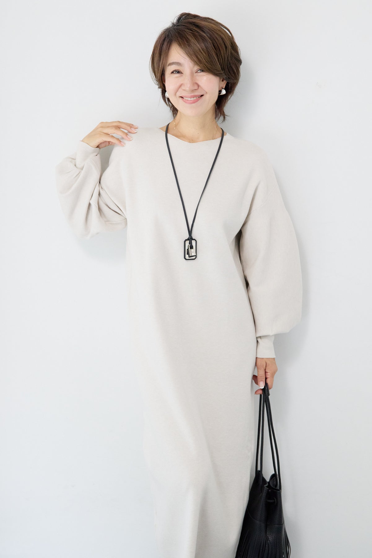 ボリュームスリーブが特徴の一枚で着映えるニットワンピース。2WAYで着用可能でフロントはラウンドネック、バック側はゆるやかなVラインに。シンプルながらも表情豊かで、天竺のカールを生かした配色テープが縦ラインをスッキリと見せてくれます。やわらかくもっちりとした着心地の糸を使用。また静電気が発生しにくい加工をしているため着脱時の不快な静電気を軽減します。コーデに悩んだ時にさっと決まる、カジュアルにも綺麗めにも着こなせるアイテムです。