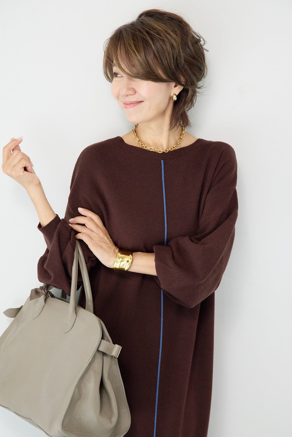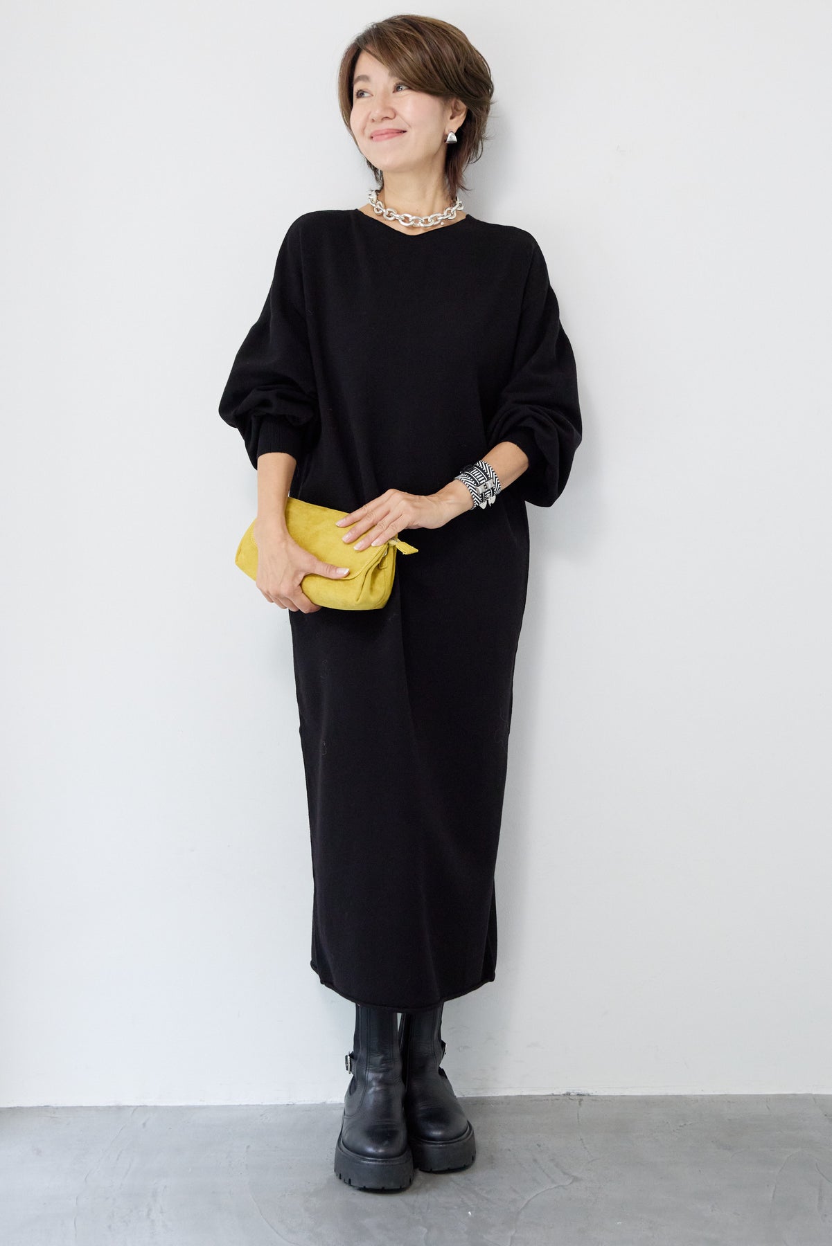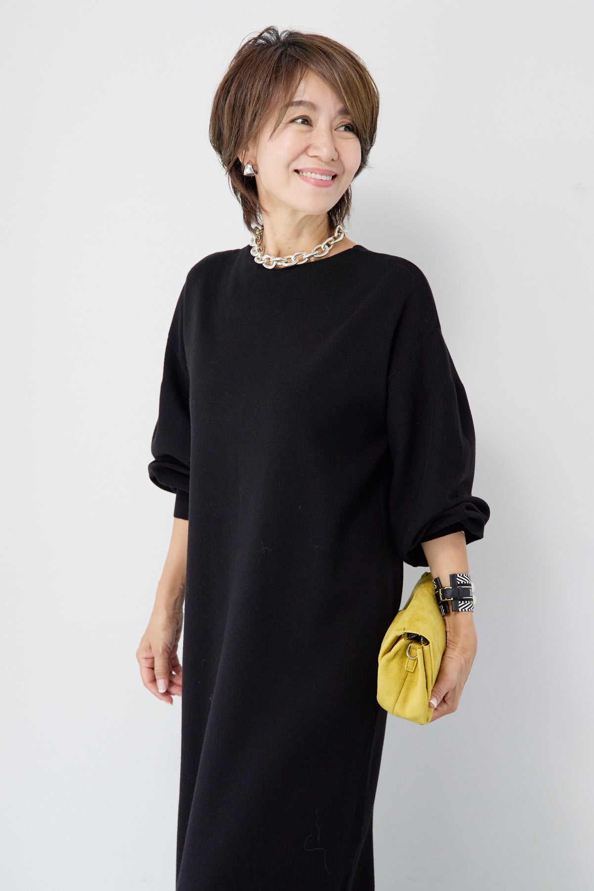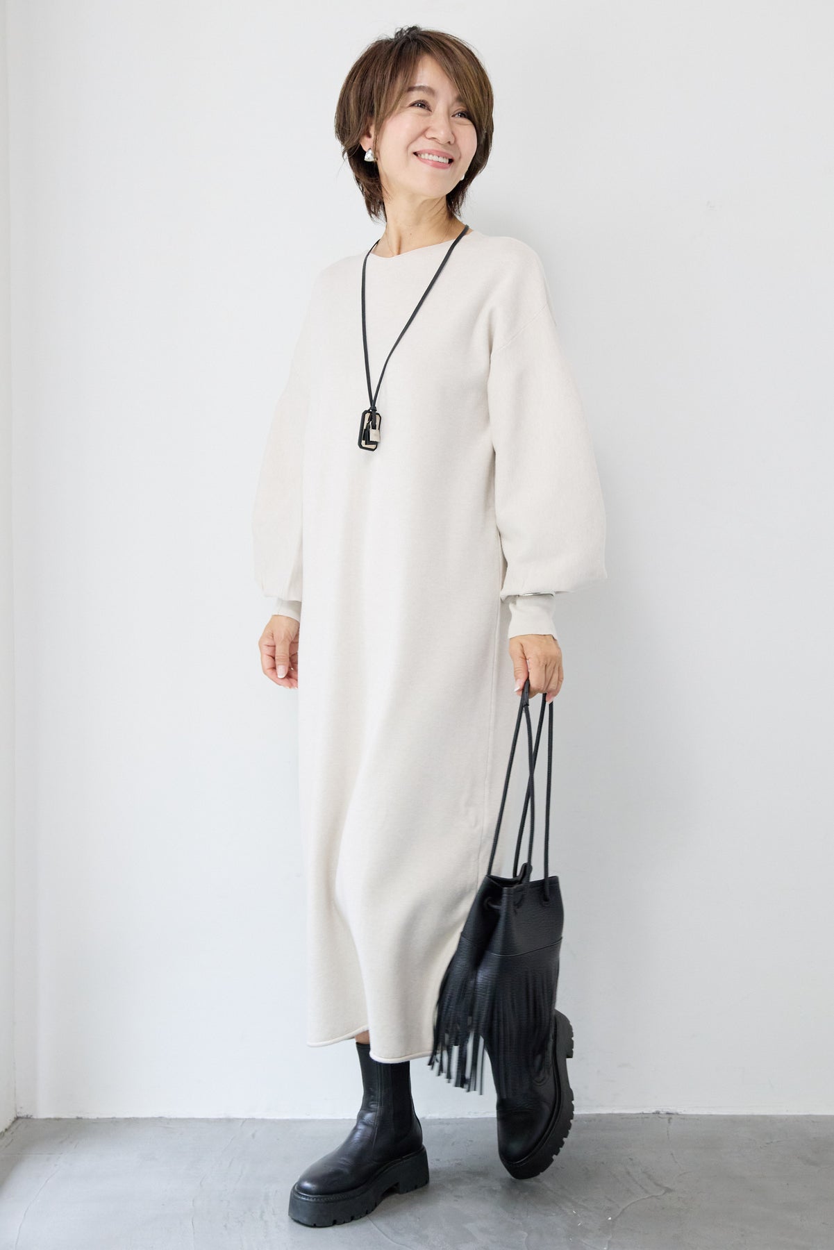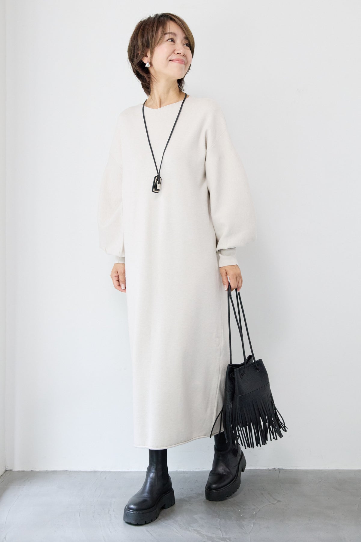 ボリュームスリーブが特徴の一枚で着映えるニットワンピース。2WAYで着用可能でフロントはラウンドネック、バック側はゆるやかなVラインに。シンプルながらも表情豊かで、天竺のカールを生かした配色テープが縦ラインをスッキリと見せてくれます。やわらかくもっちりとした着心地の糸を使用。また静電気が発生しにくい加工をしているため着脱時の不快な静電気を軽減します。コーデに悩んだ時にさっと決まる、カジュアルにも綺麗めにも着こなせるアイテムです。