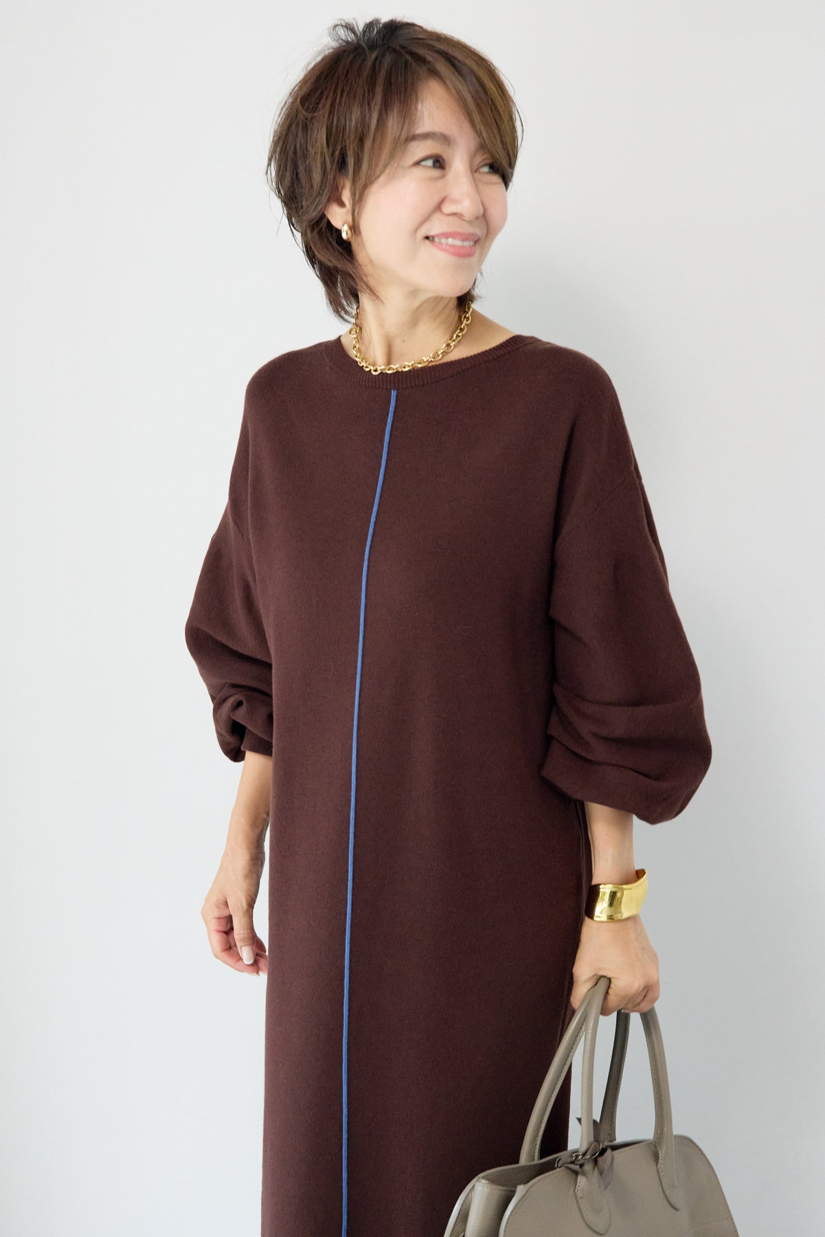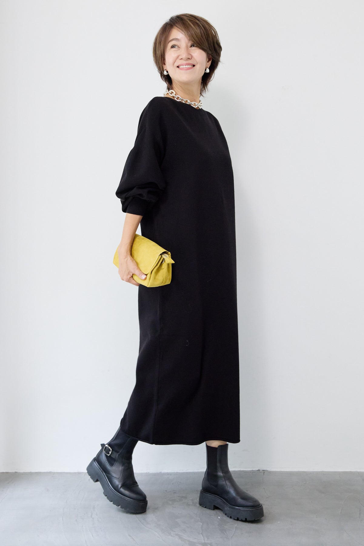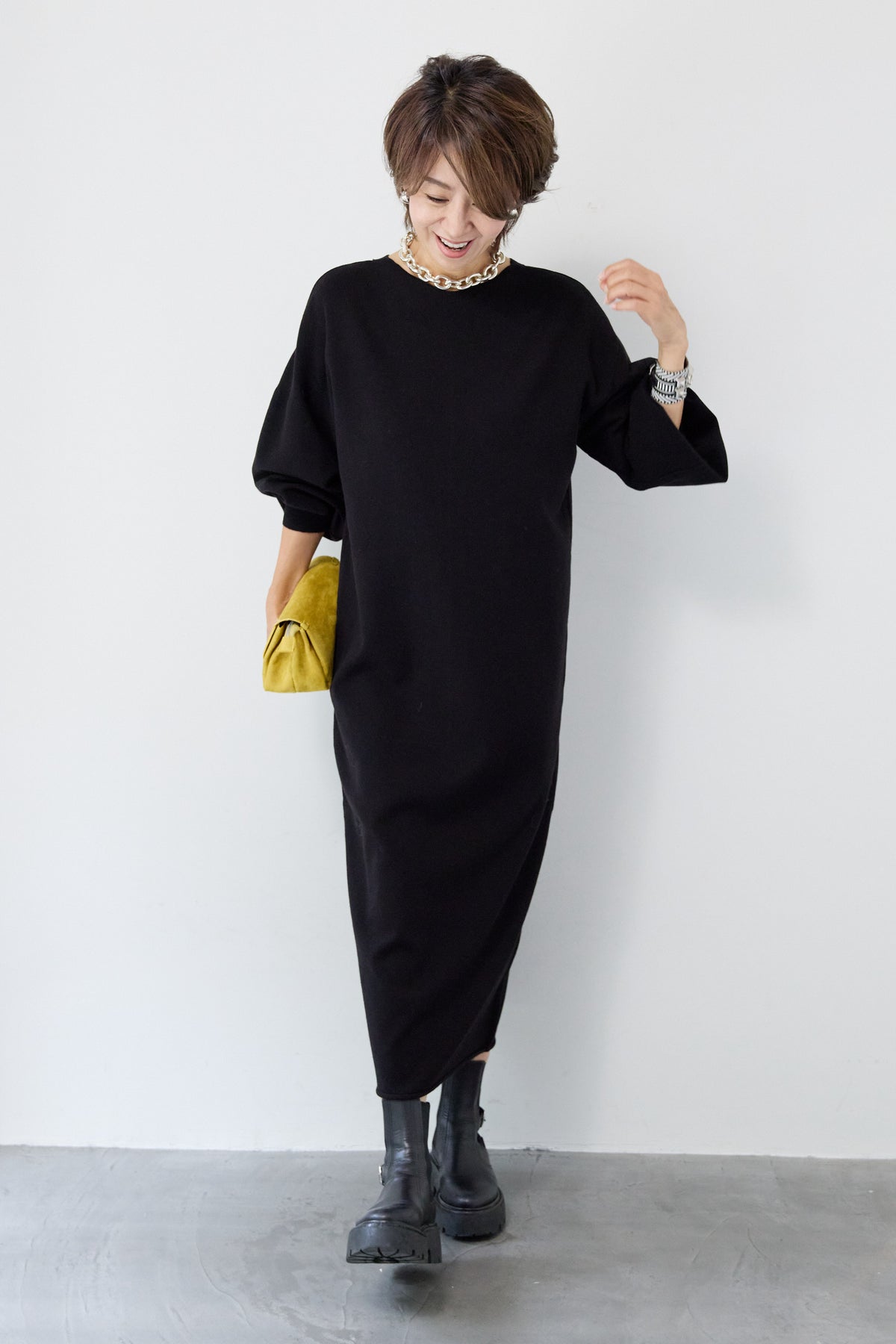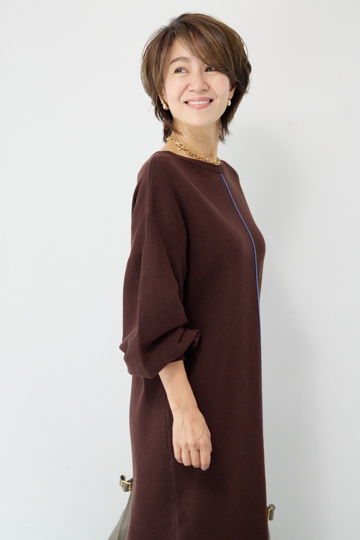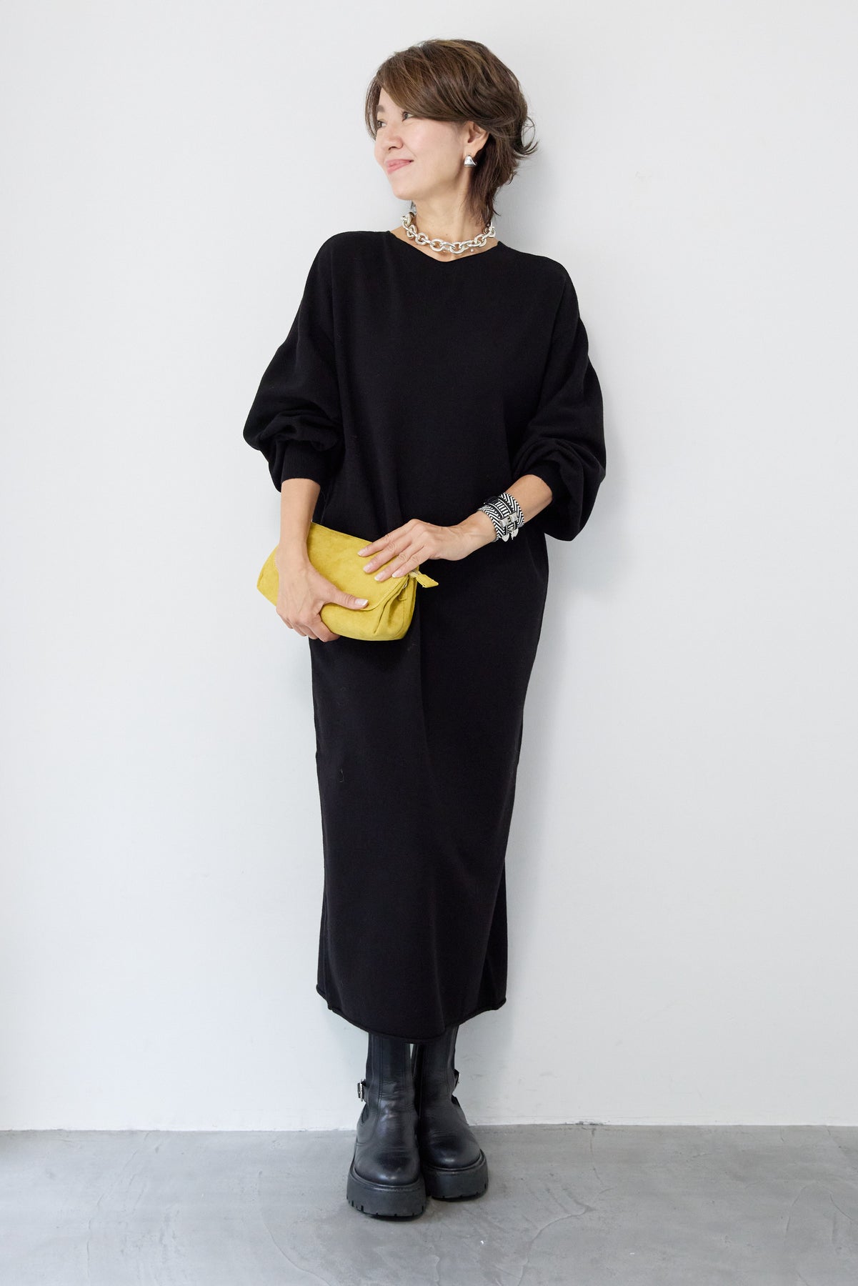ボリュームスリーブが特徴の一枚で着映えるニットワンピース。2WAYで着用可能でフロントはラウンドネック、バック側はゆるやかなVラインに。シンプルながらも表情豊かで、天竺のカールを生かした配色テープが縦ラインをスッキリと見せてくれます。やわらかくもっちりとした着心地の糸を使用。また静電気が発生しにくい加工をしているため着脱時の不快な静電気を軽減します。コーデに悩んだ時にさっと決まる、カジュアルにも綺麗めにも着こなせるアイテムです。