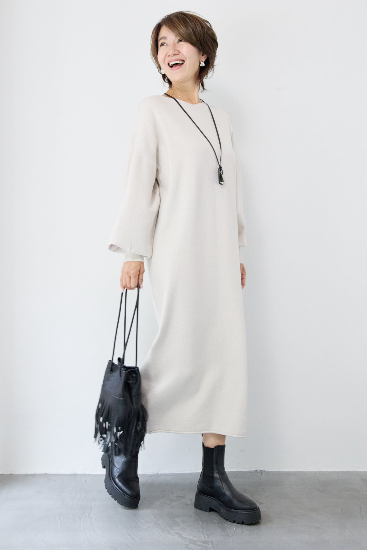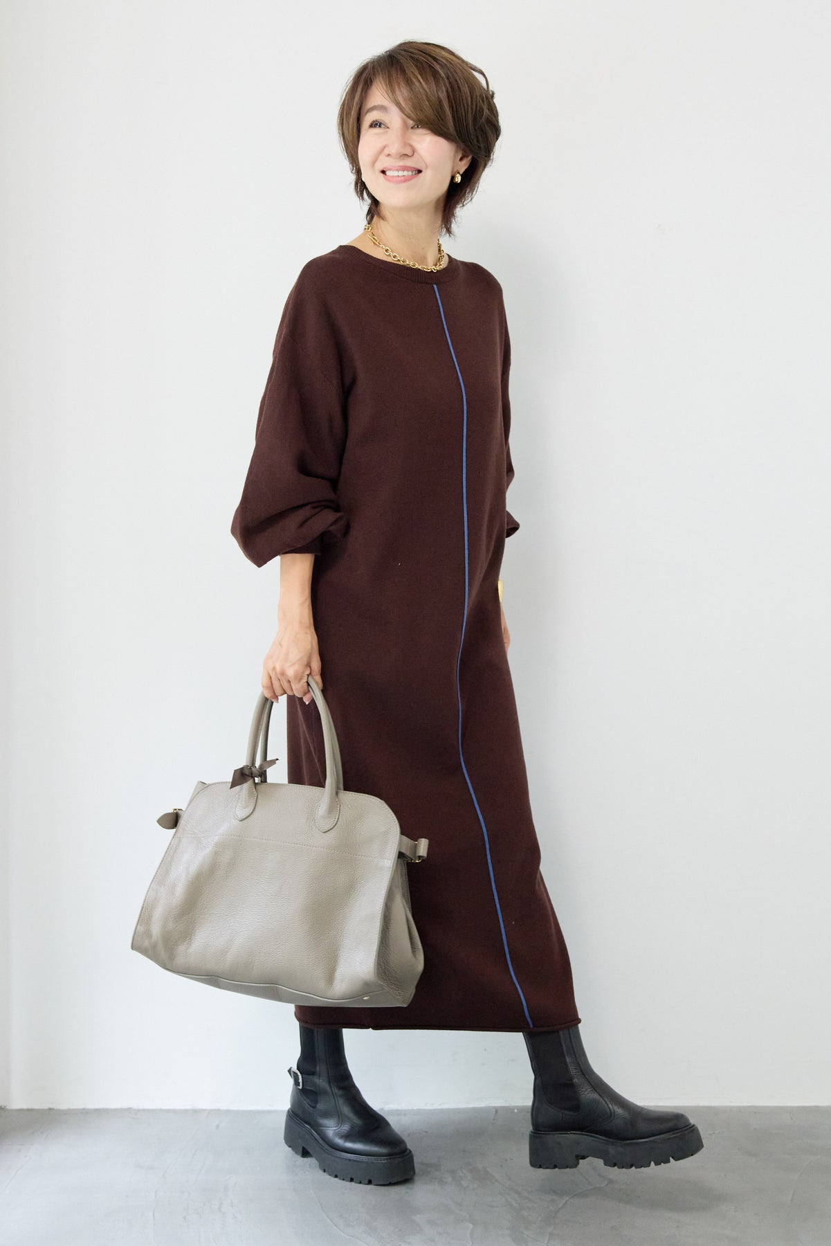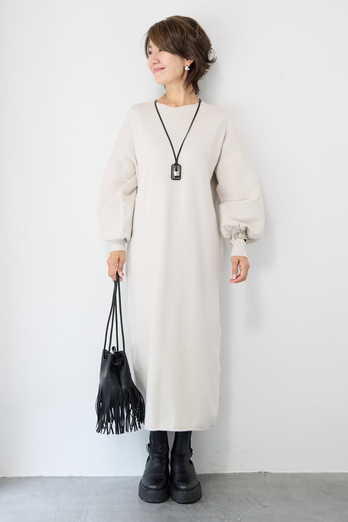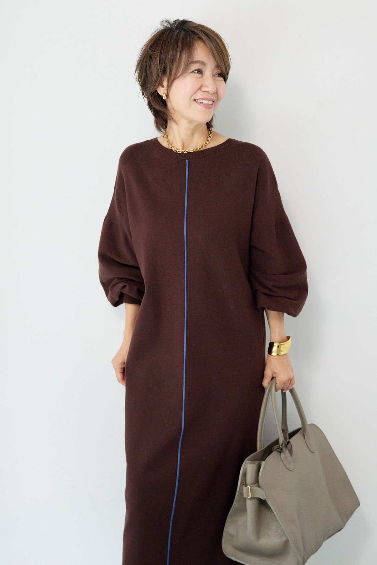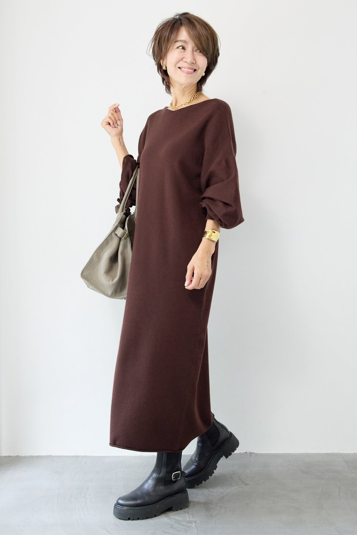 ボリュームスリーブが特徴の一枚で着映えるニットワンピース。2WAYで着用可能でフロントはラウンドネック、バック側はゆるやかなVラインに。シンプルながらも表情豊かで、天竺のカールを生かした配色テープが縦ラインをスッキリと見せてくれます。やわらかくもっちりとした着心地の糸を使用。また静電気が発生しにくい加工をしているため着脱時の不快な静電気を軽減します。コーデに悩んだ時にさっと決まる、カジュアルにも綺麗めにも着こなせるアイテムです。