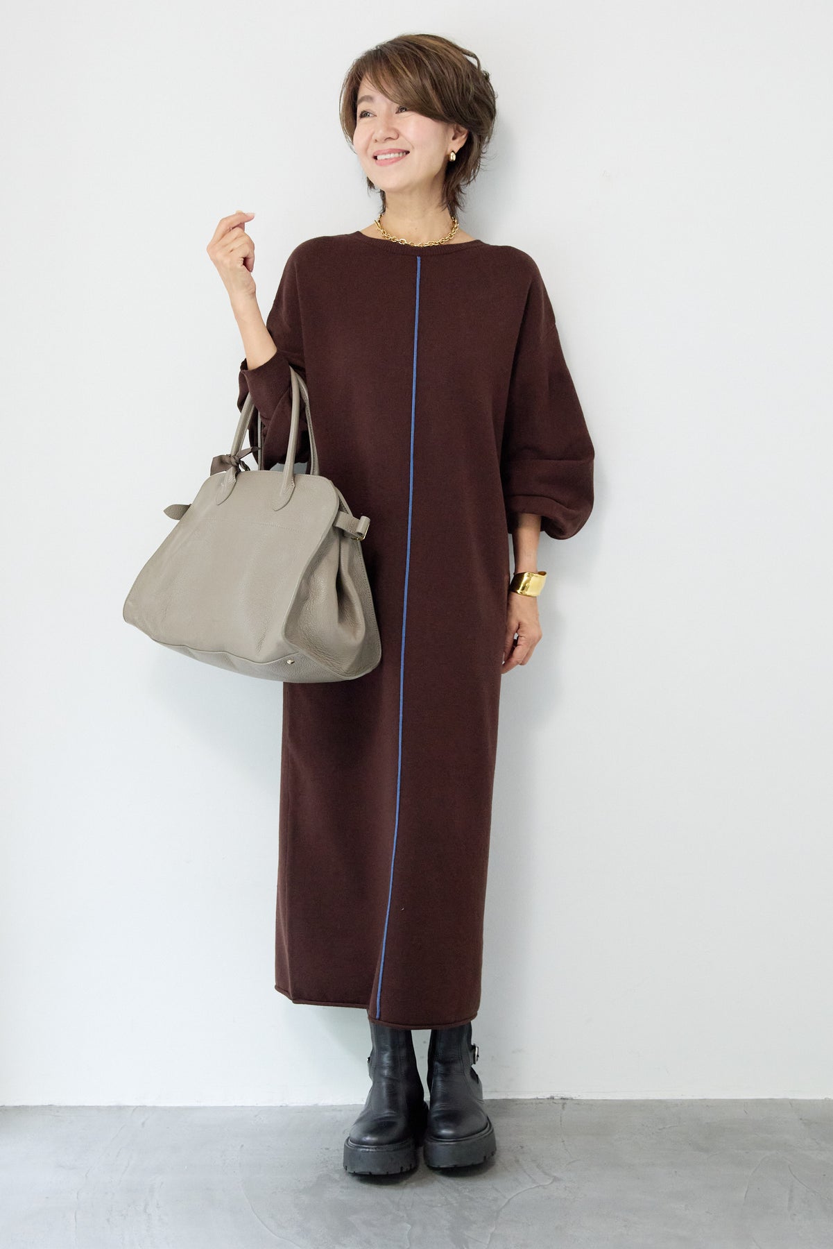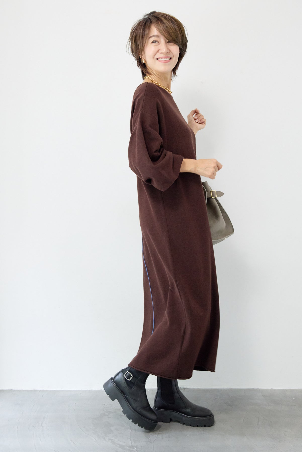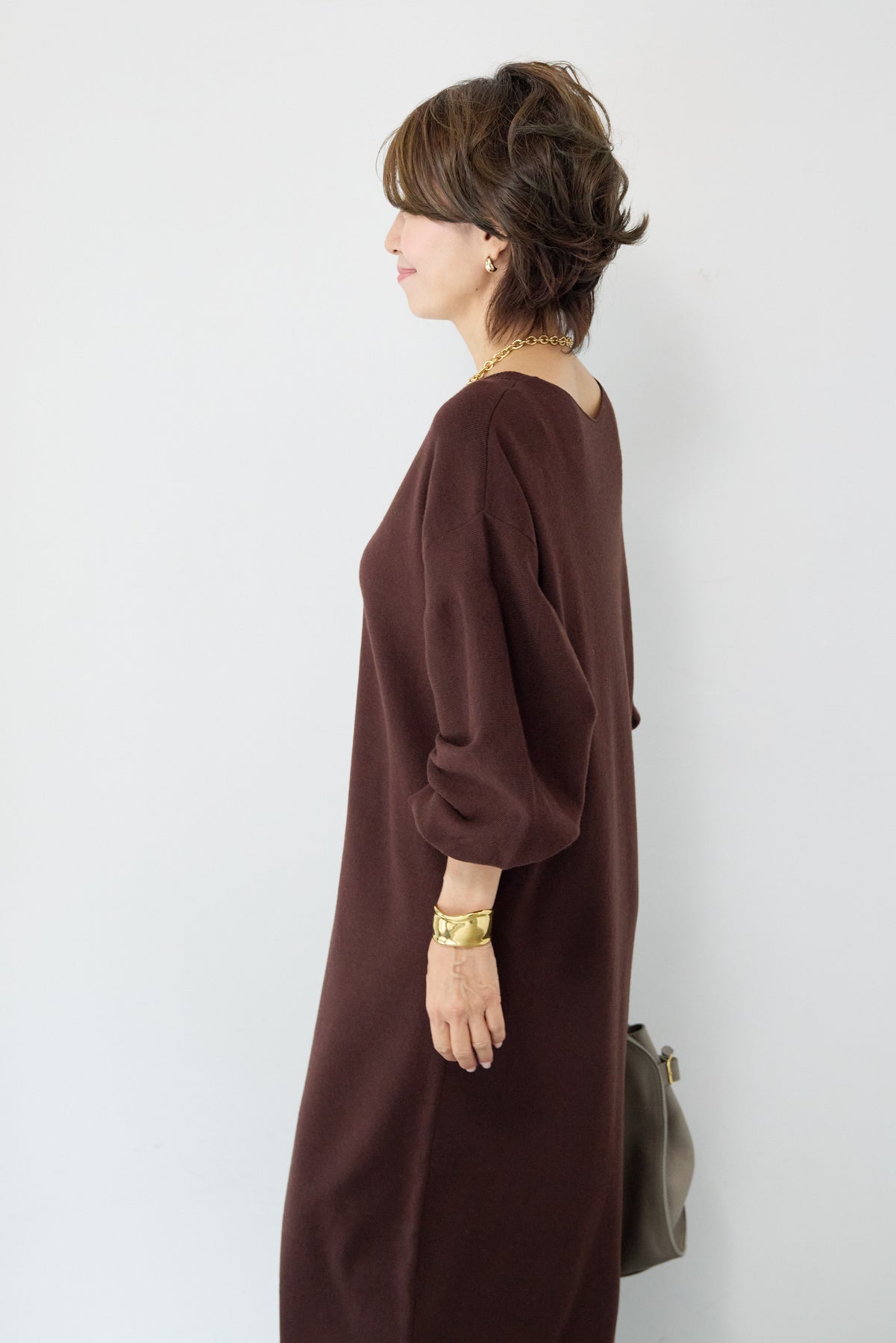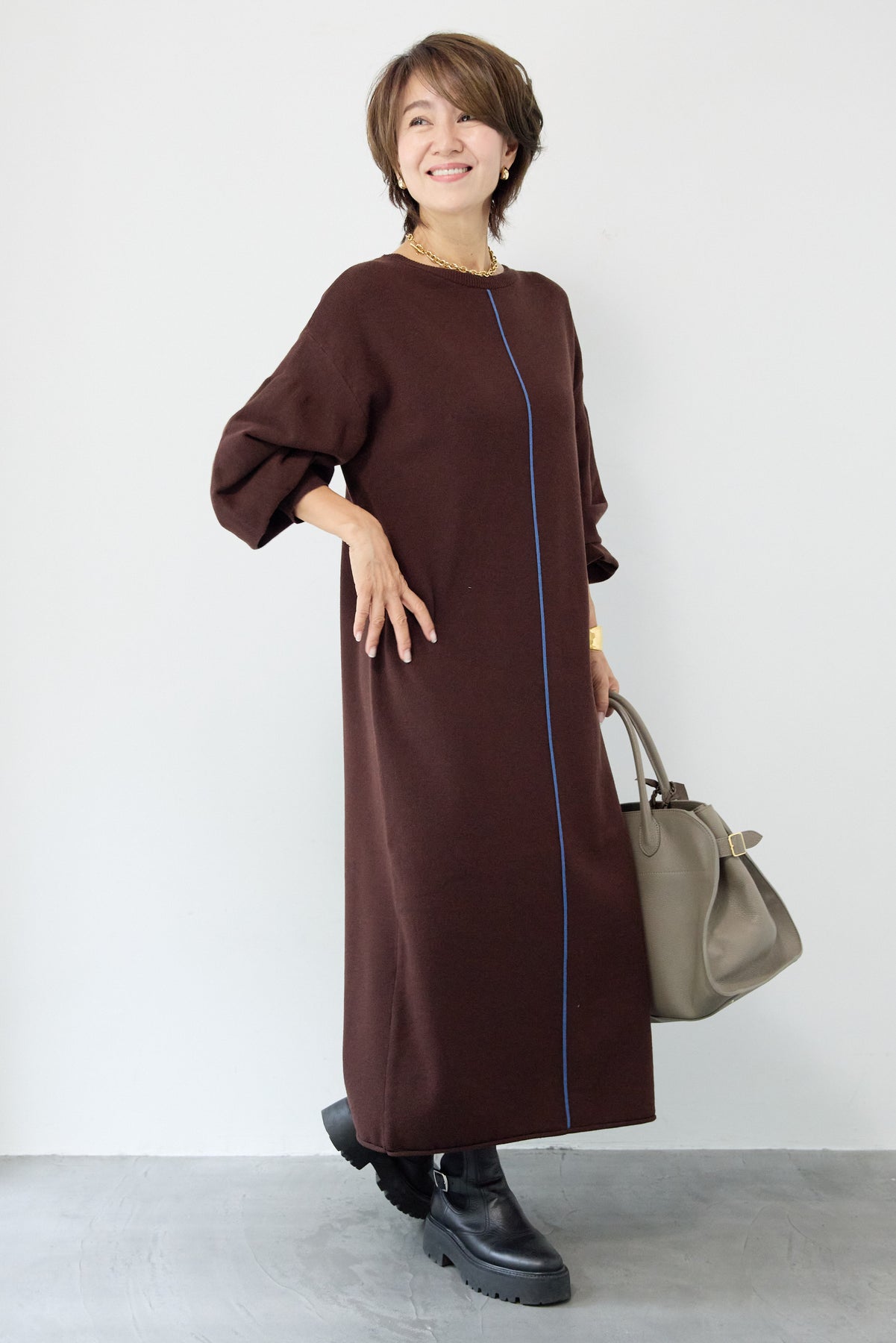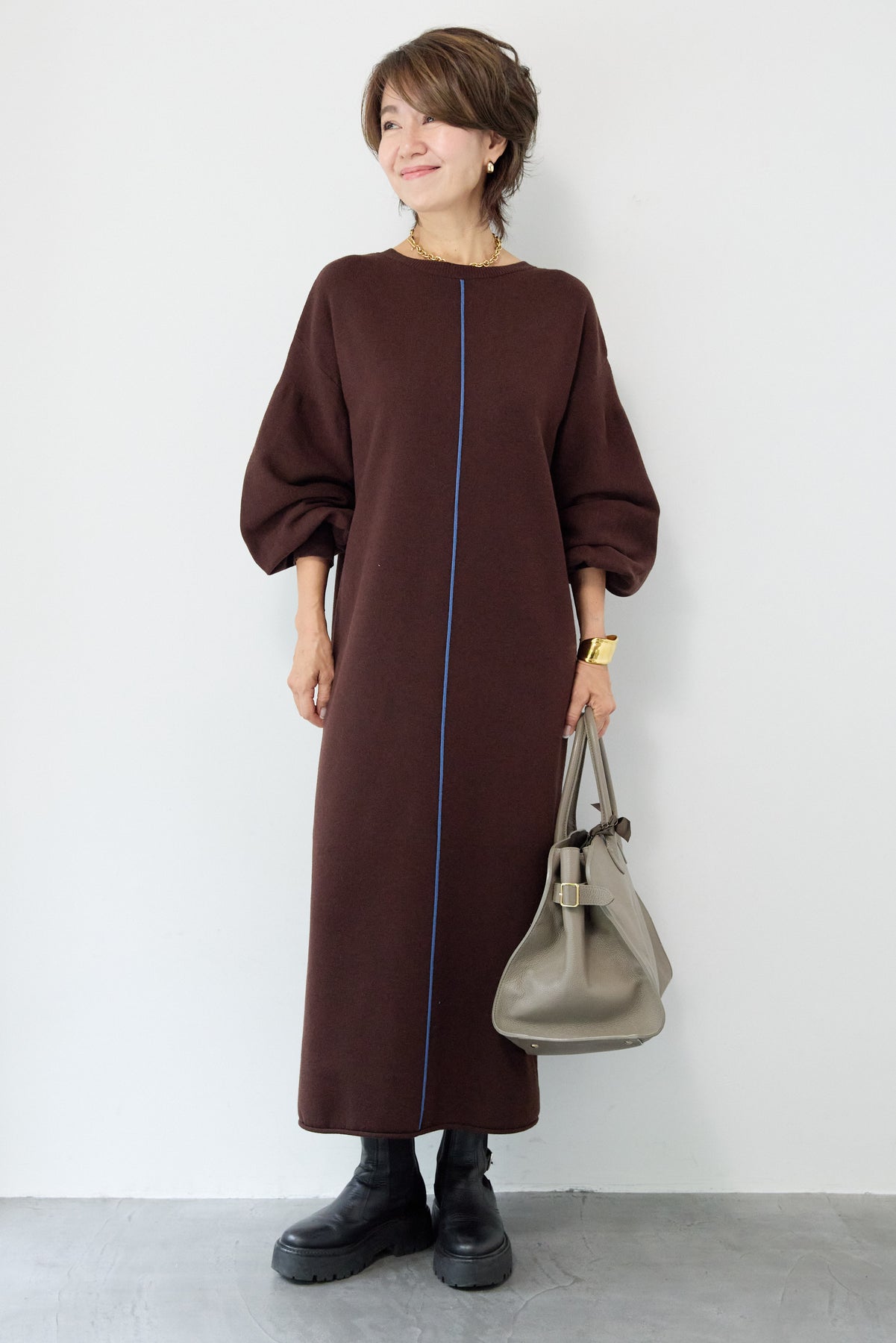 ボリュームスリーブが特徴の一枚で着映えるニットワンピース。2WAYで着用可能でフロントはラウンドネック、バック側はゆるやかなVラインに。シンプルながらも表情豊かで、天竺のカールを生かした配色テープが縦ラインをスッキリと見せてくれます。やわらかくもっちりとした着心地の糸を使用。また静電気が発生しにくい加工をしているため着脱時の不快な静電気を軽減します。コーデに悩んだ時にさっと決まる、カジュアルにも綺麗めにも着こなせるアイテムです。
