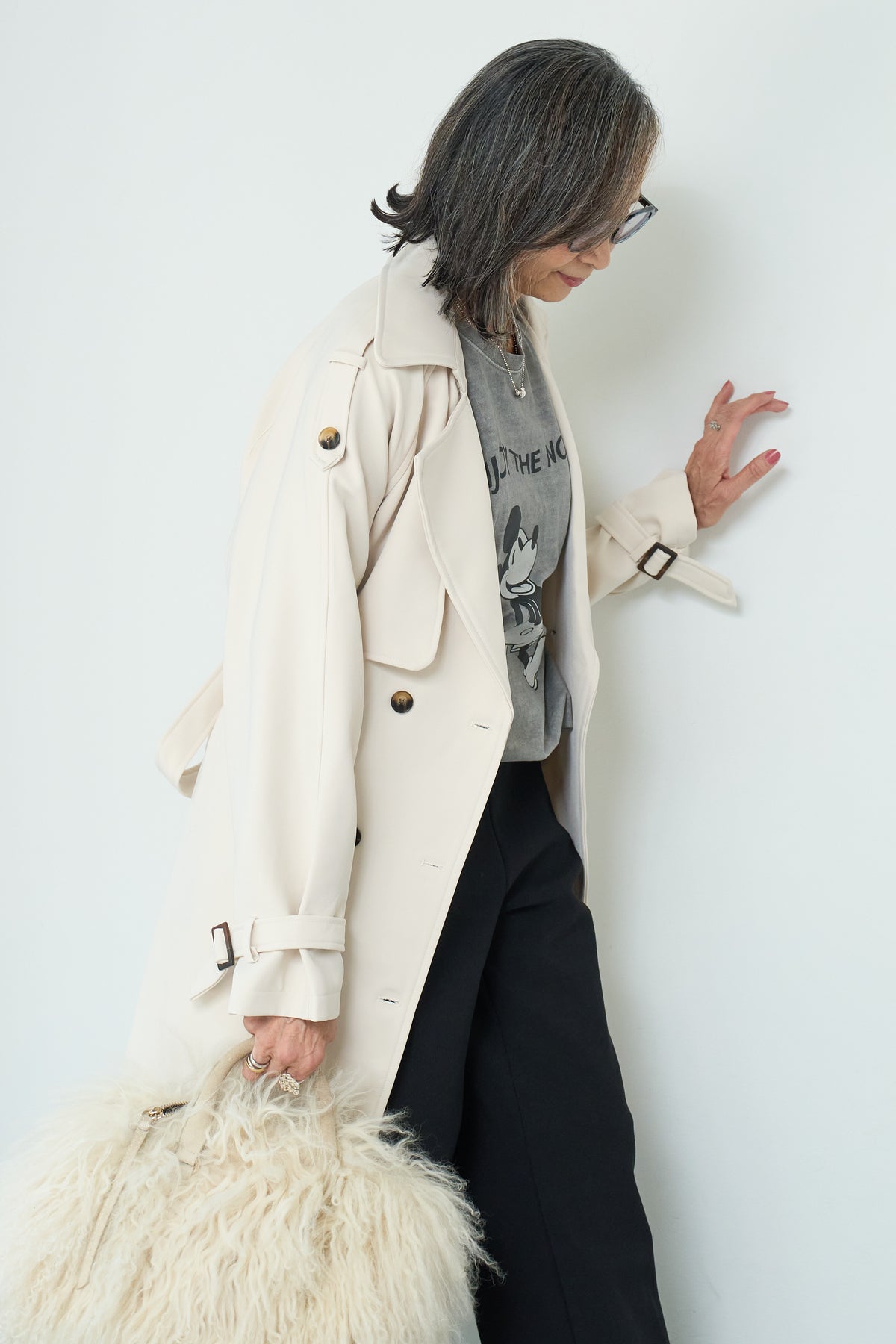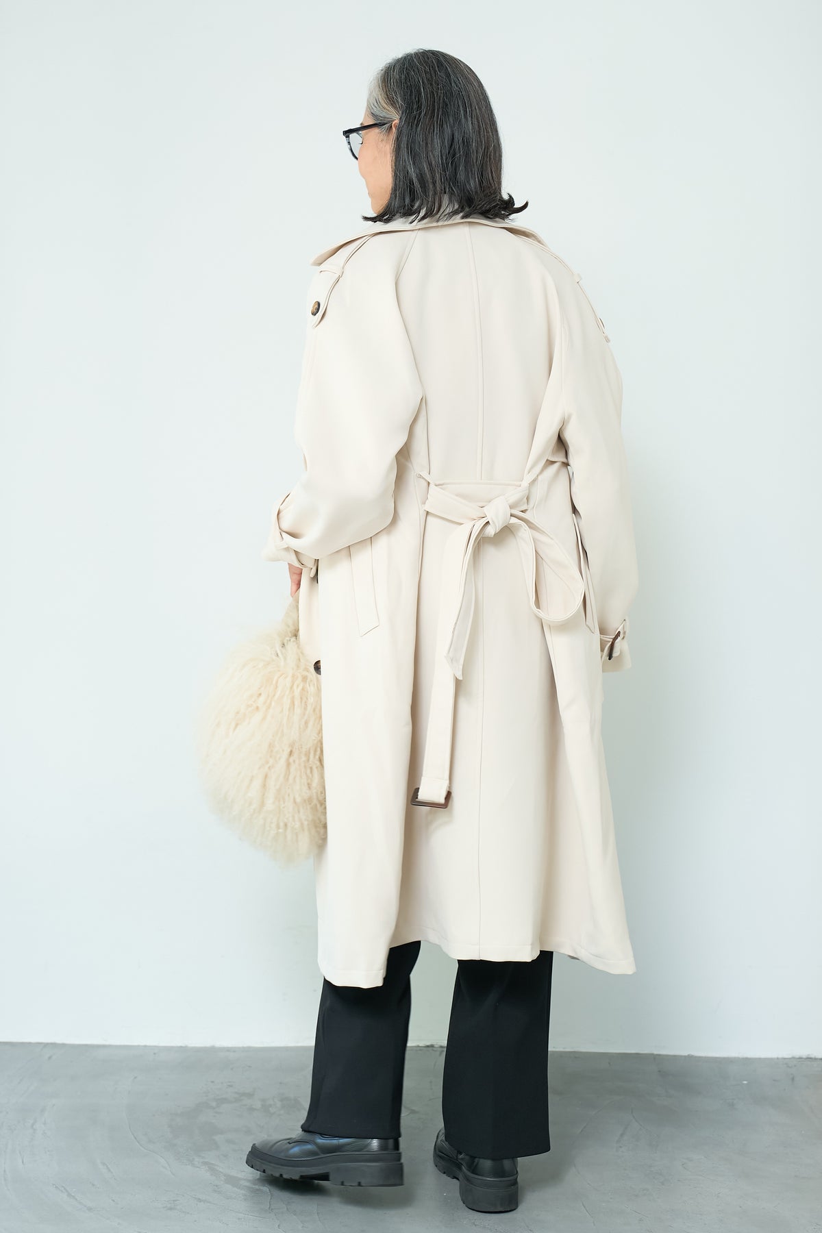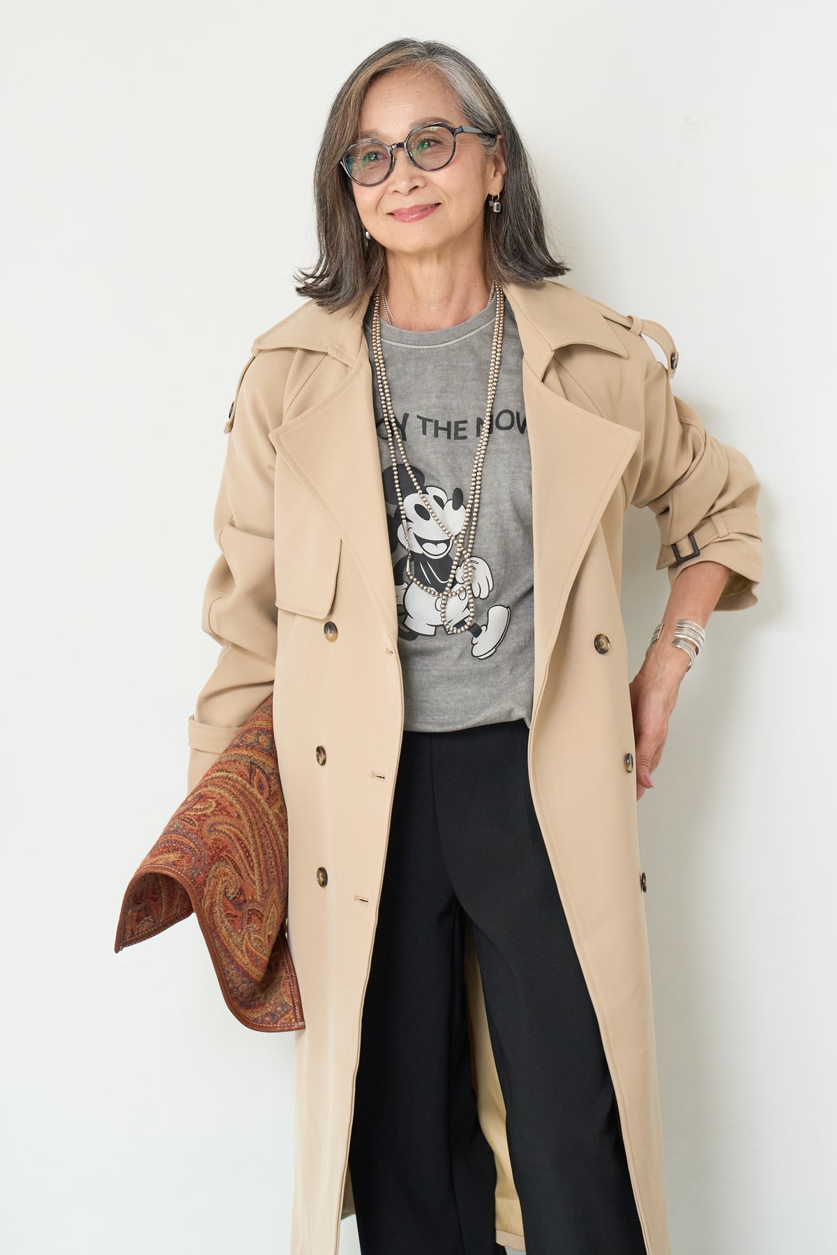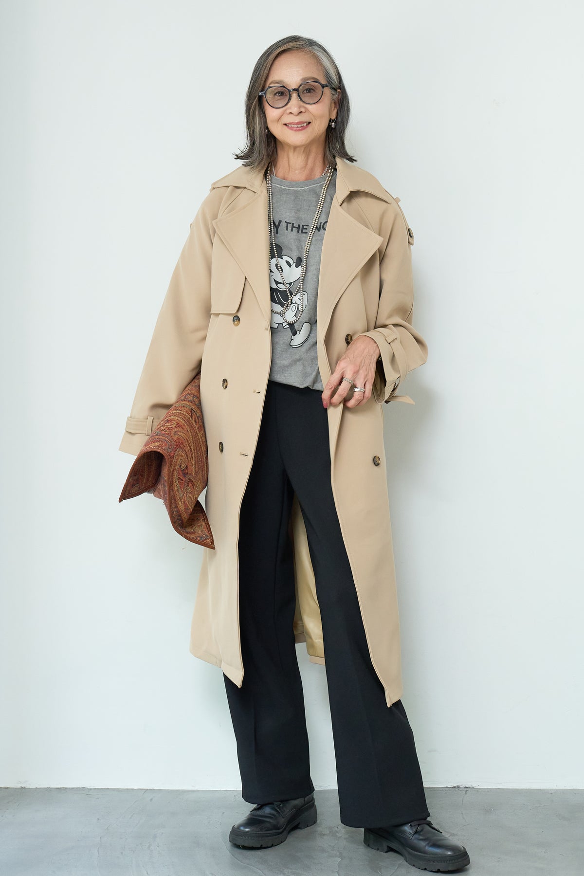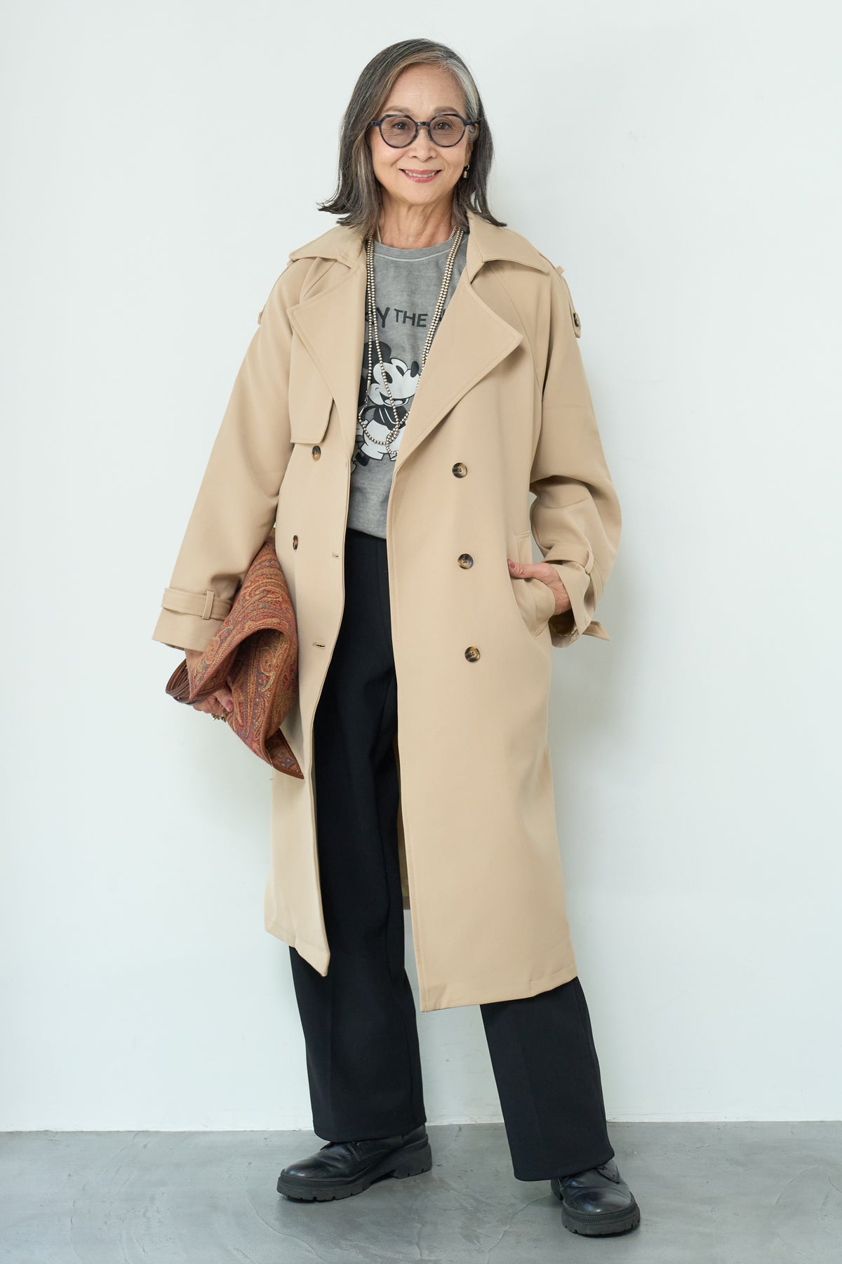 クラシックな佇まいに現代的なシルエットを取り入れたロングトレンチコート。ダブルボタンとウエストベルトが全体を引き締め、羽織るだけで品のある雰囲気に仕上がります。エポーレットや袖口のベルトディテールなど、伝統的なトレンチの要素を取り入れつつ、柔らかな素材感で軽やかに着られるのも魅力。膝下までの丈感が体を包み込み、オンからオフまで幅広いシーンで活躍する一枚です。