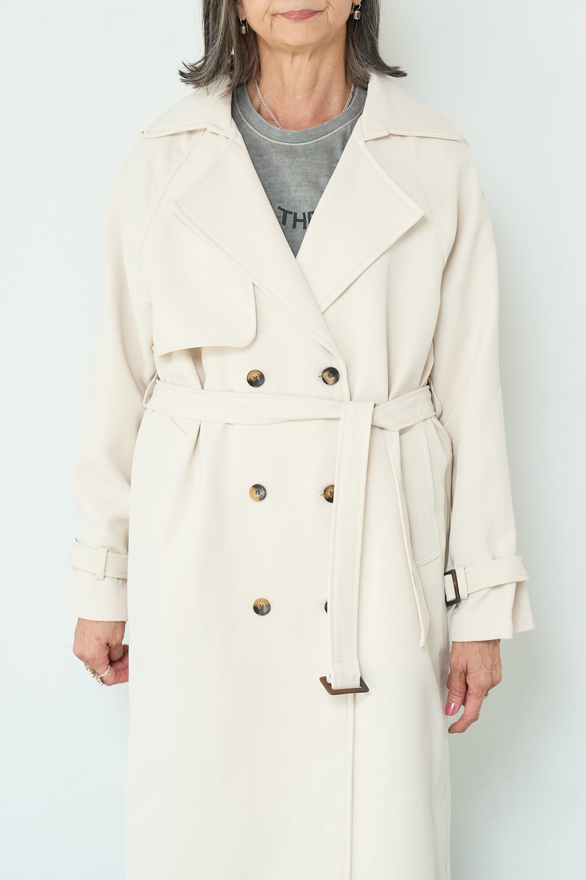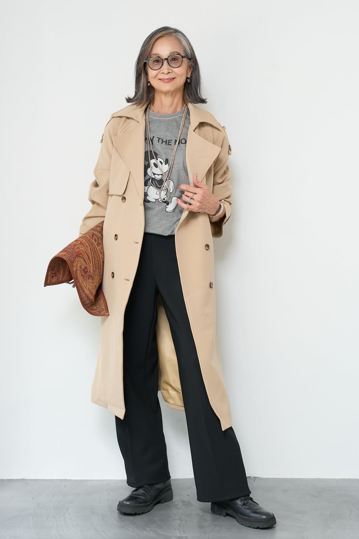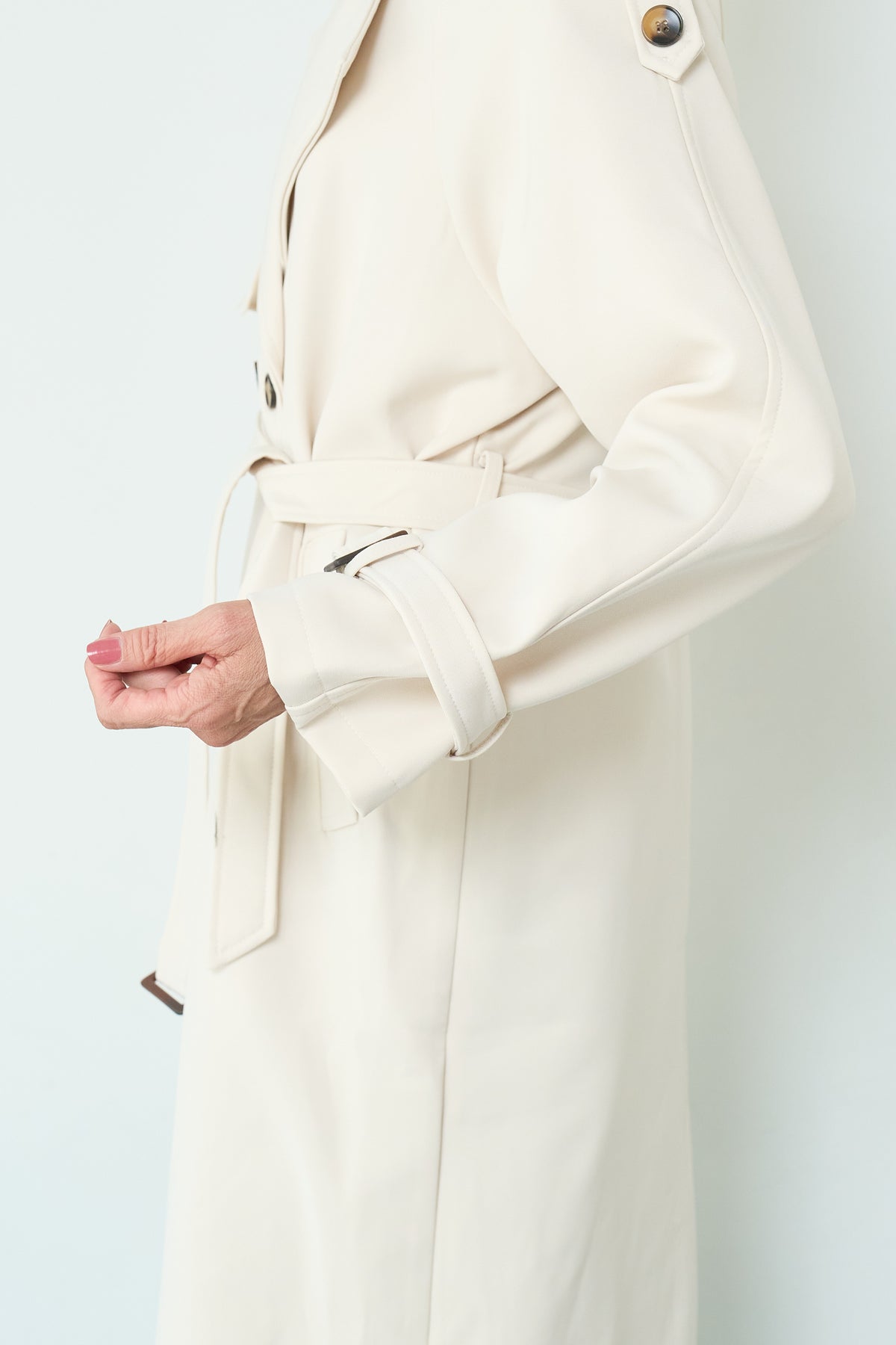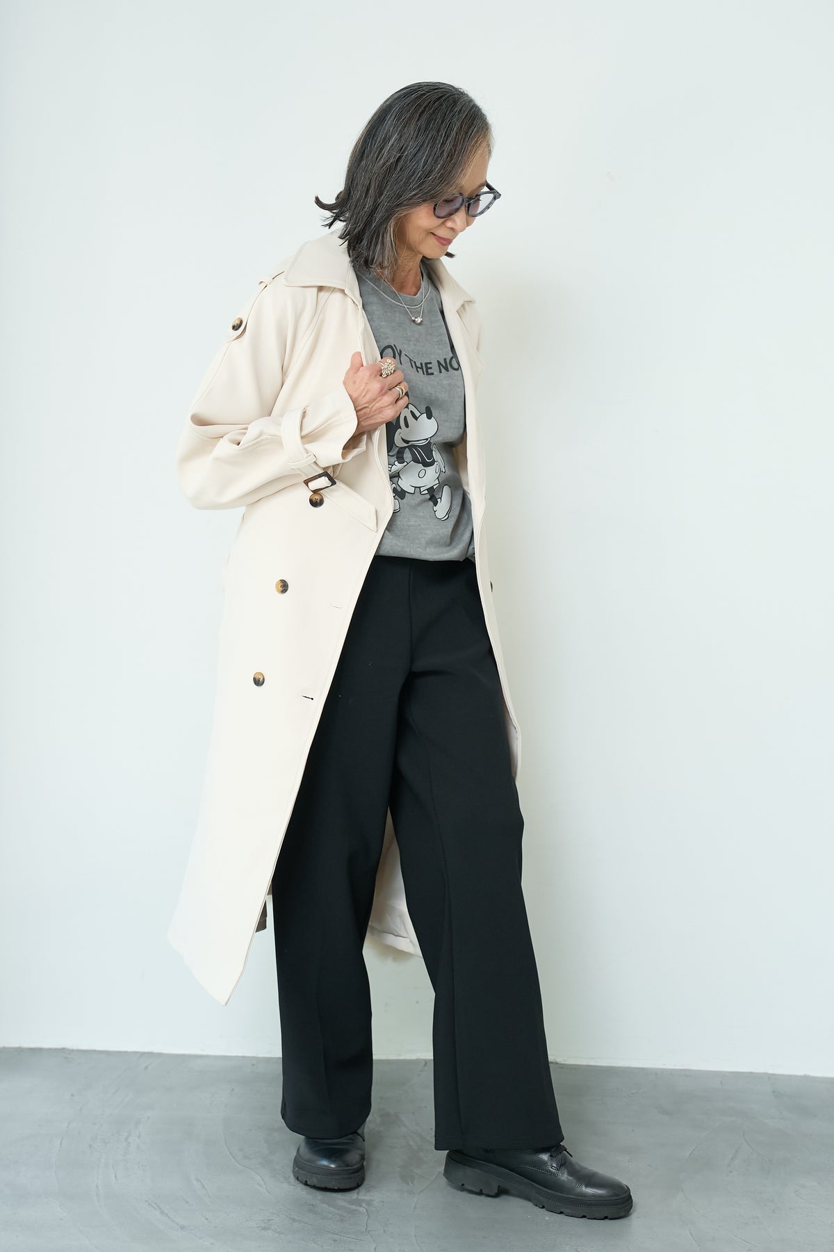 クラシックな佇まいに現代的なシルエットを取り入れたロングトレンチコート。ダブルボタンとウエストベルトが全体を引き締め、羽織るだけで品のある雰囲気に仕上がります。エポーレットや袖口のベルトディテールなど、伝統的なトレンチの要素を取り入れつつ、柔らかな素材感で軽やかに着られるのも魅力。膝下までの丈感が体を包み込み、オンからオフまで幅広いシーンで活躍する一枚です。