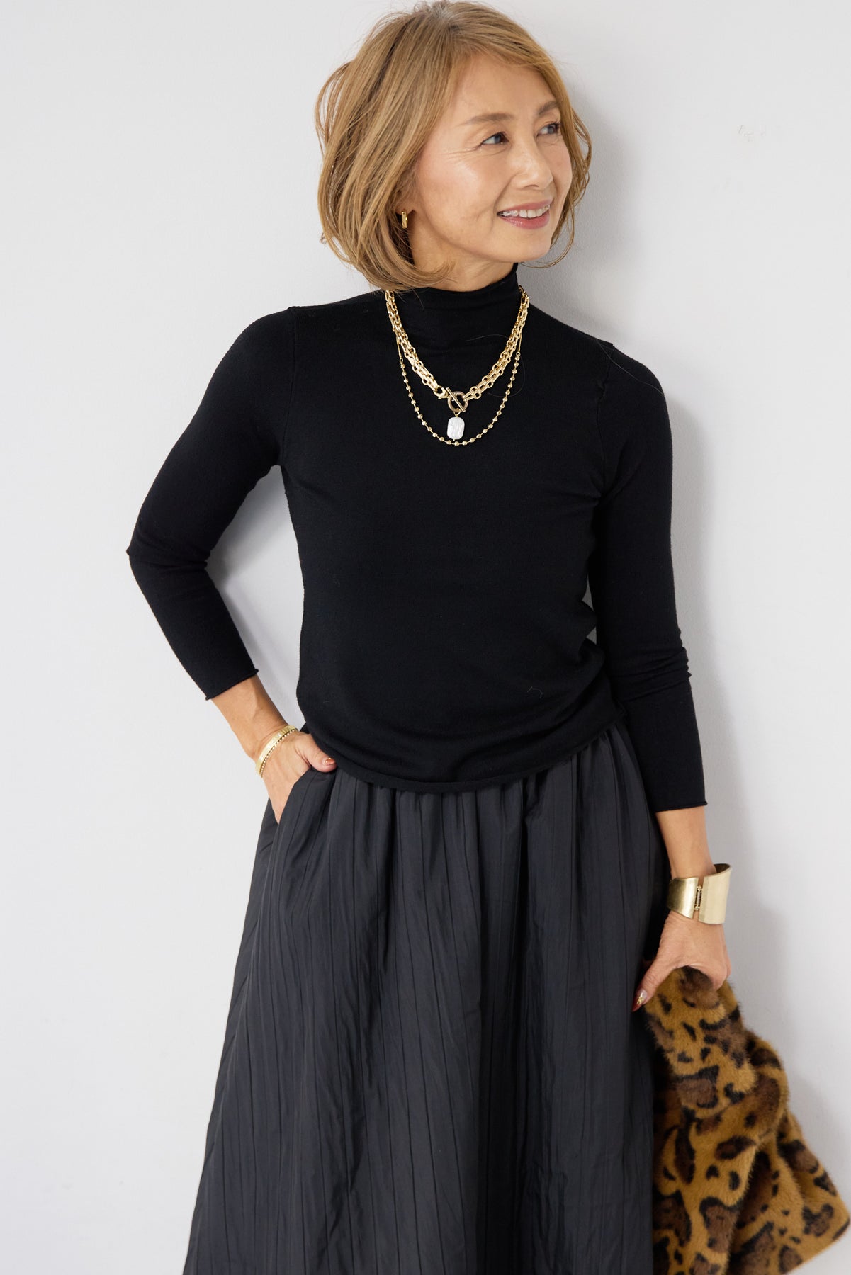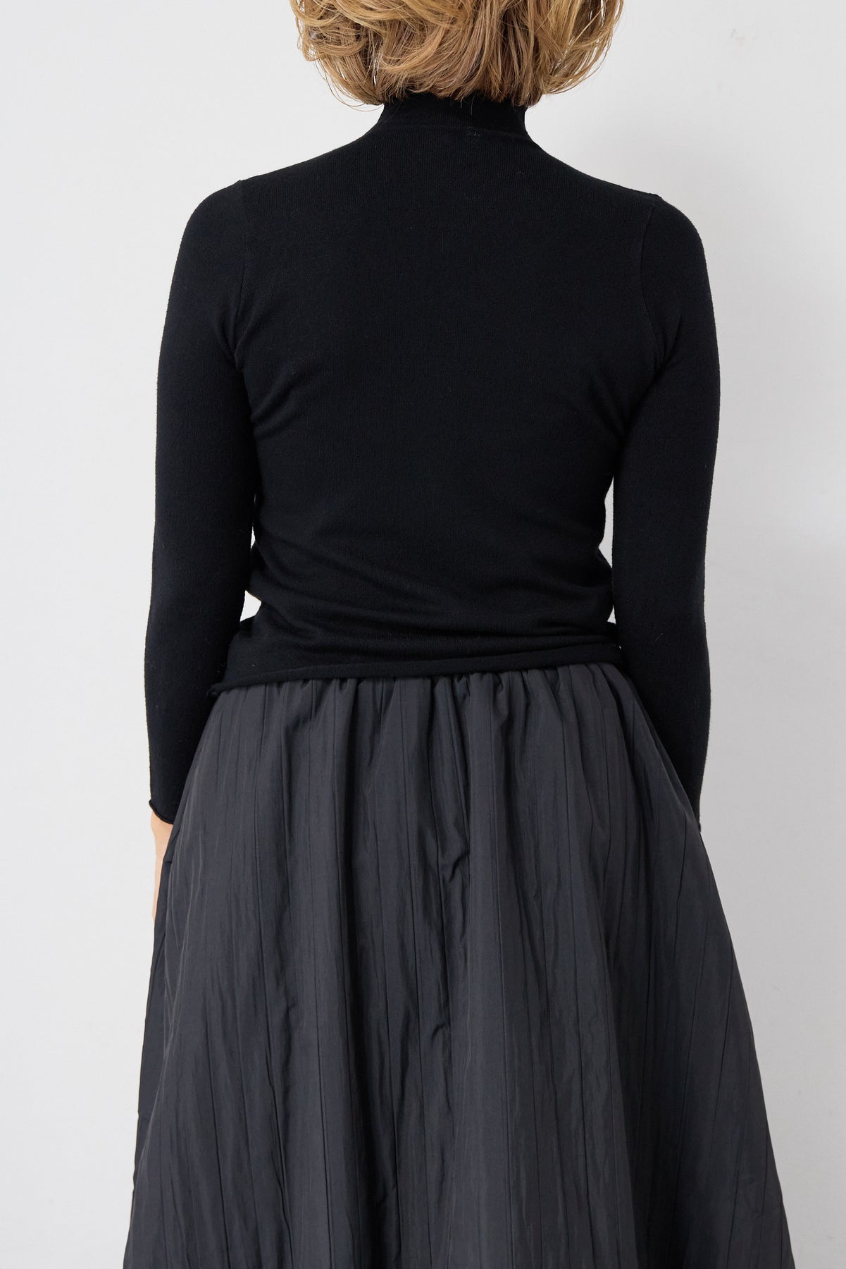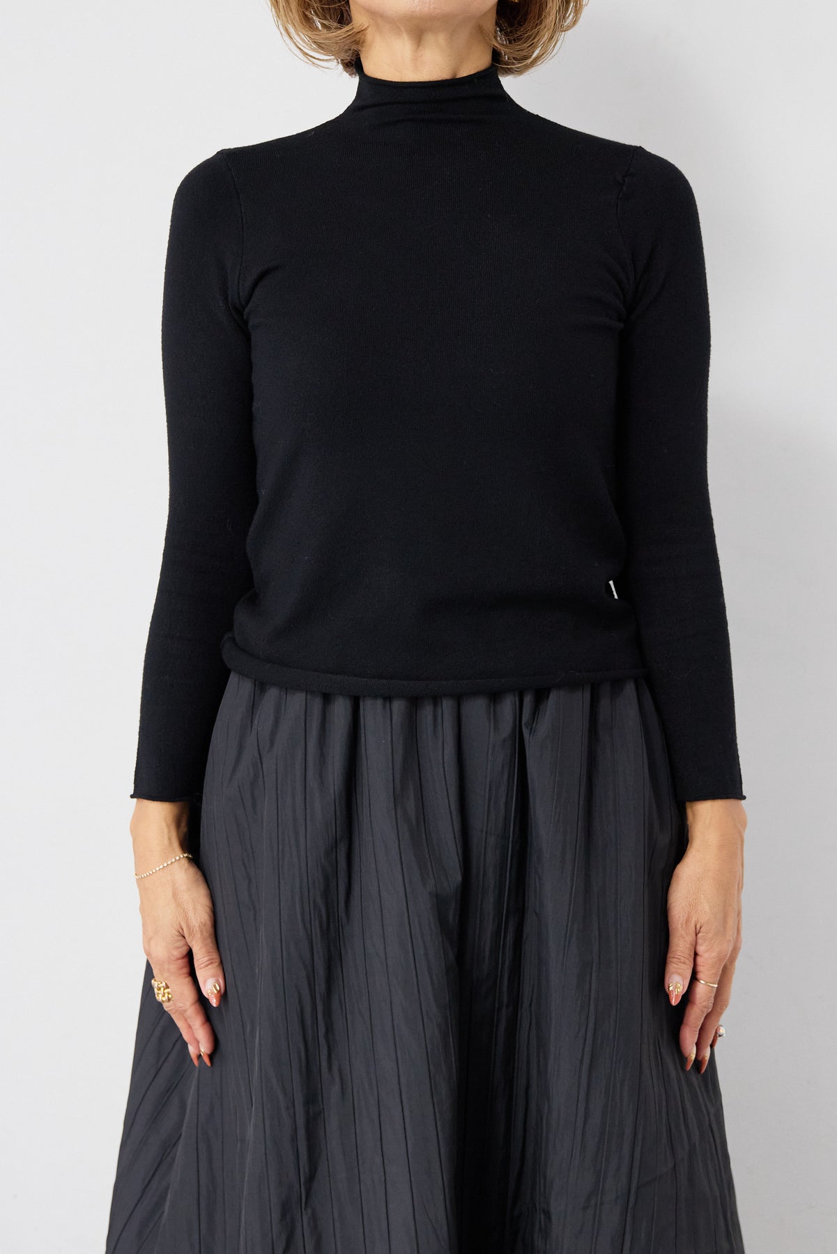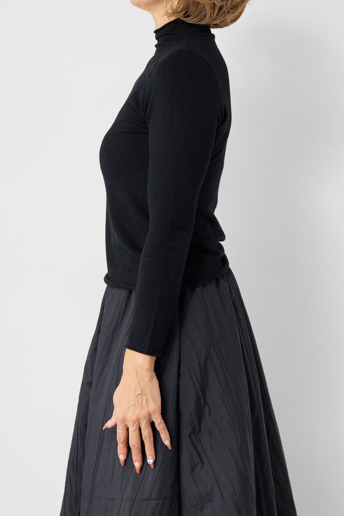 シンプルで洗練された印象を与える、ロールエッジデザインのタートルニット。首元・袖口・裾にあしらったさりげないロール仕様が、ミニマルな中に柔らかなニュアンスをプラスします。程よくフィットするシルエットながら、身体のラインを拾いすぎない絶妙なサイズ感。一枚で着てもインナーとしても使いやすく、ジャケットやカーディガン、ジャンパースカートの下にもすっきりと収まります。肌触りの良いニット素材は、なめらかでチクチク感が少なく、長時間の着用も快適。ベーシックなブラックカラーは、オン・オフ問わず幅広いスタイリングに対応し、ワードローブに欠かせない一着です。