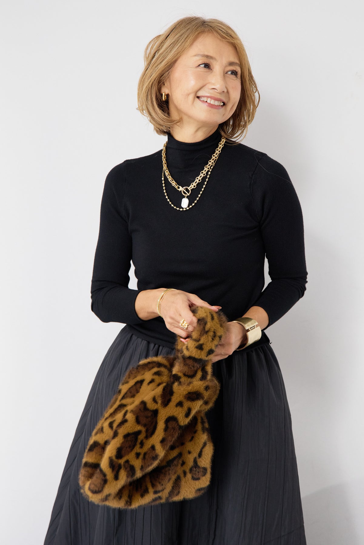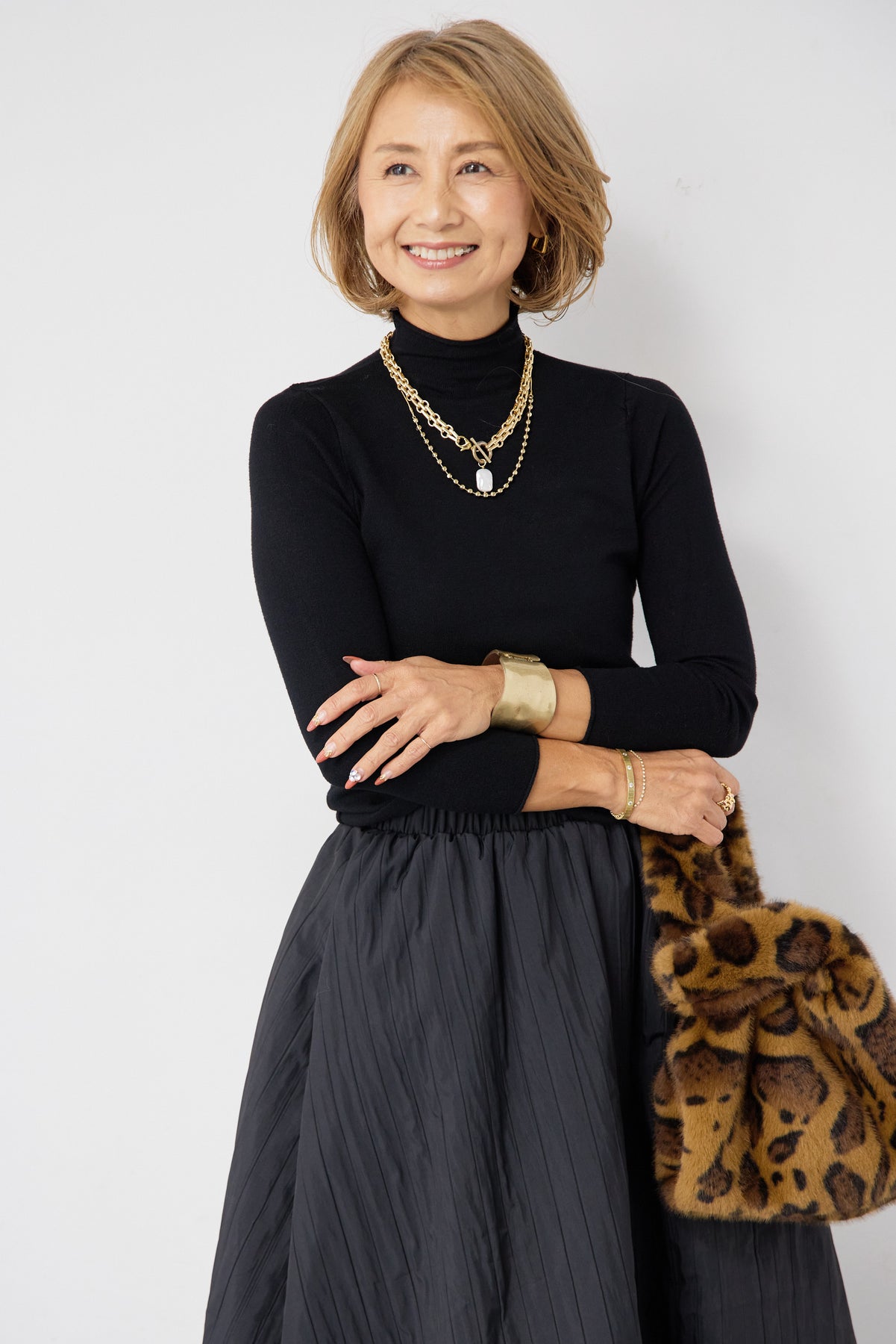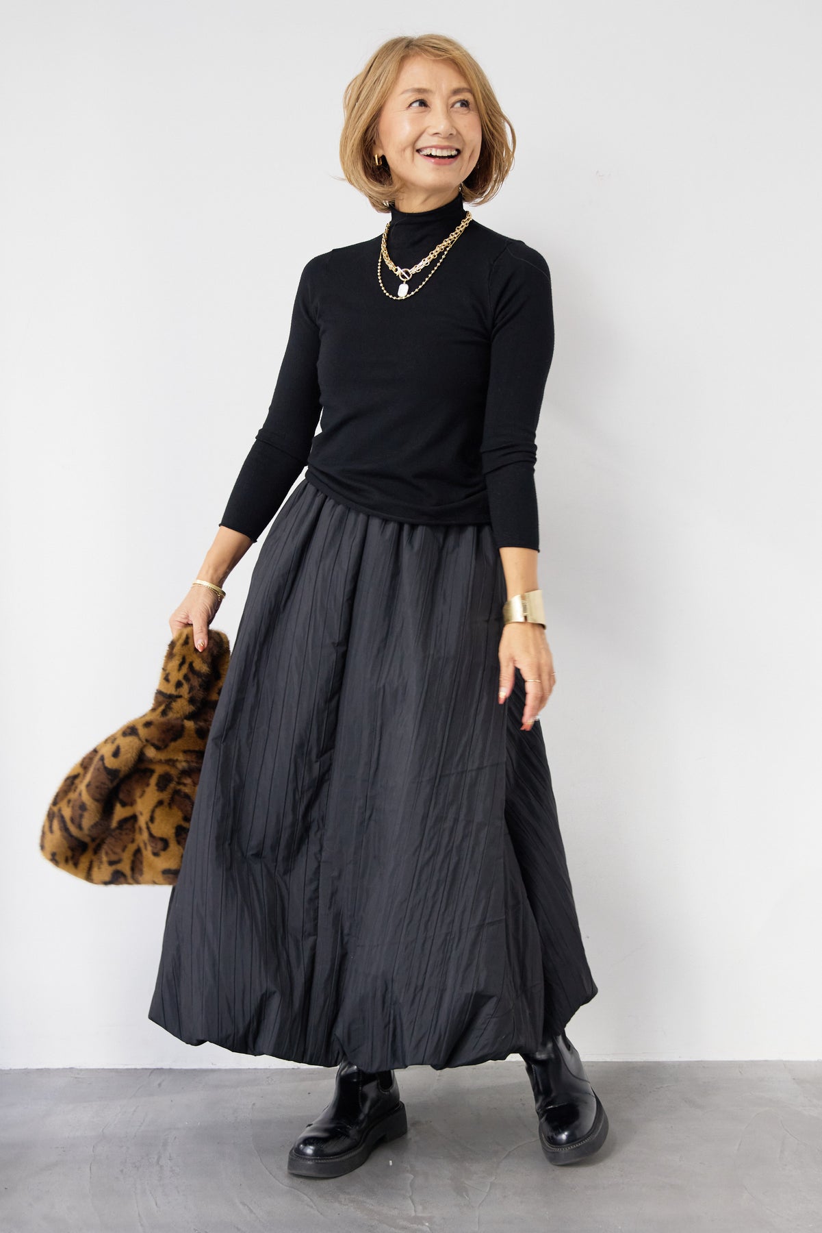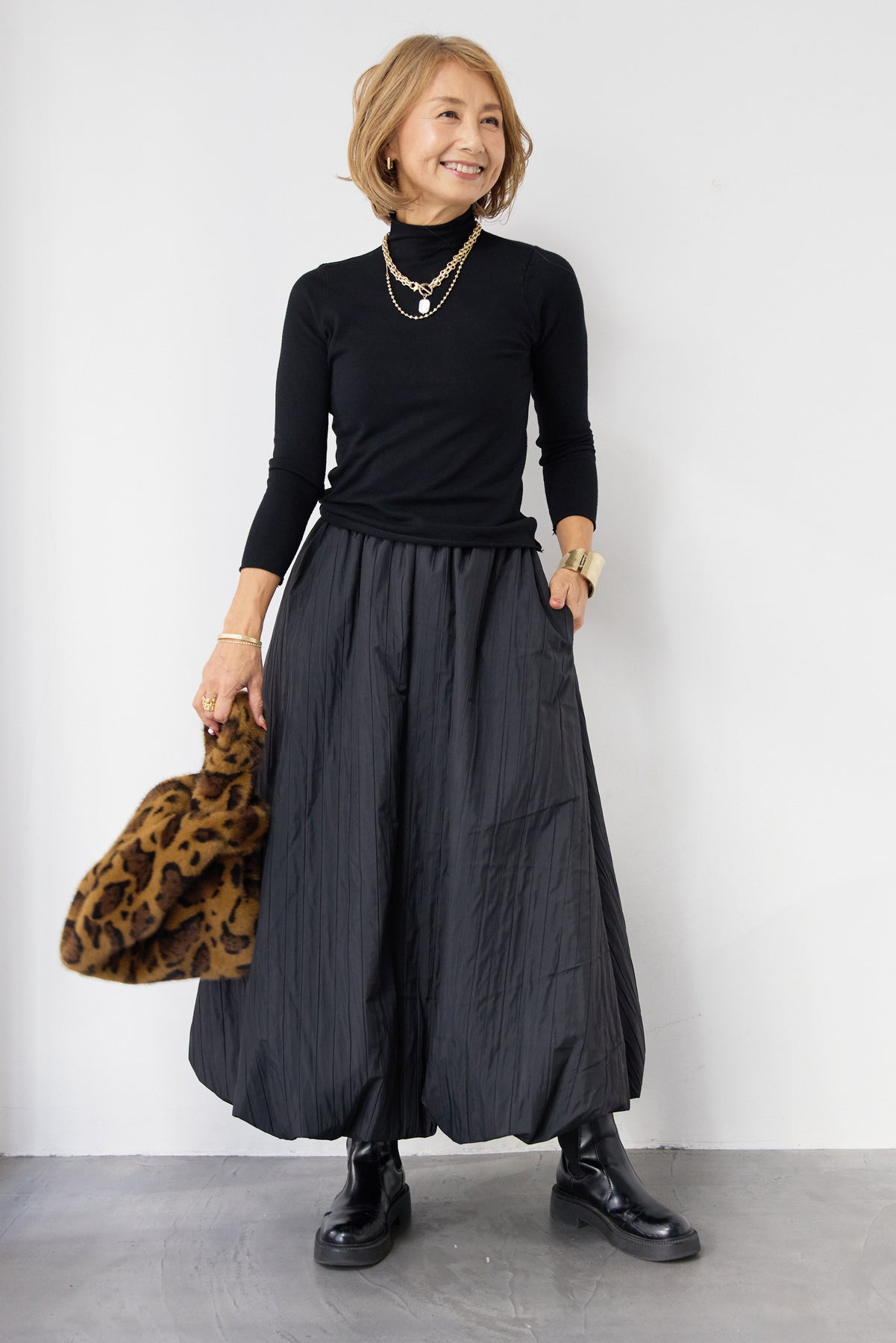 シンプルで洗練された印象を与える、ロールエッジデザインのタートルニット。首元・袖口・裾にあしらったさりげないロール仕様が、ミニマルな中に柔らかなニュアンスをプラスします。程よくフィットするシルエットながら、身体のラインを拾いすぎない絶妙なサイズ感。一枚で着てもインナーとしても使いやすく、ジャケットやカーディガン、ジャンパースカートの下にもすっきりと収まります。肌触りの良いニット素材は、なめらかでチクチク感が少なく、長時間の着用も快適。ベーシックなブラックカラーは、オン・オフ問わず幅広いスタイリングに対応し、ワードローブに欠かせない一着です。