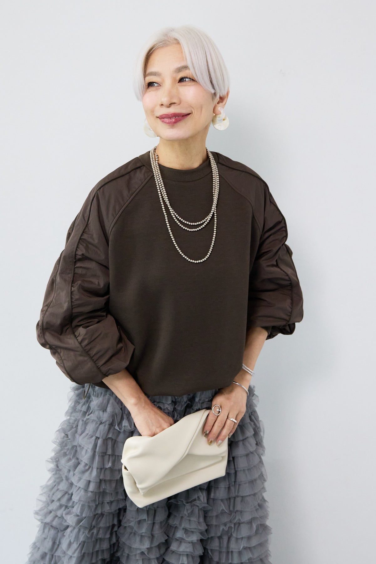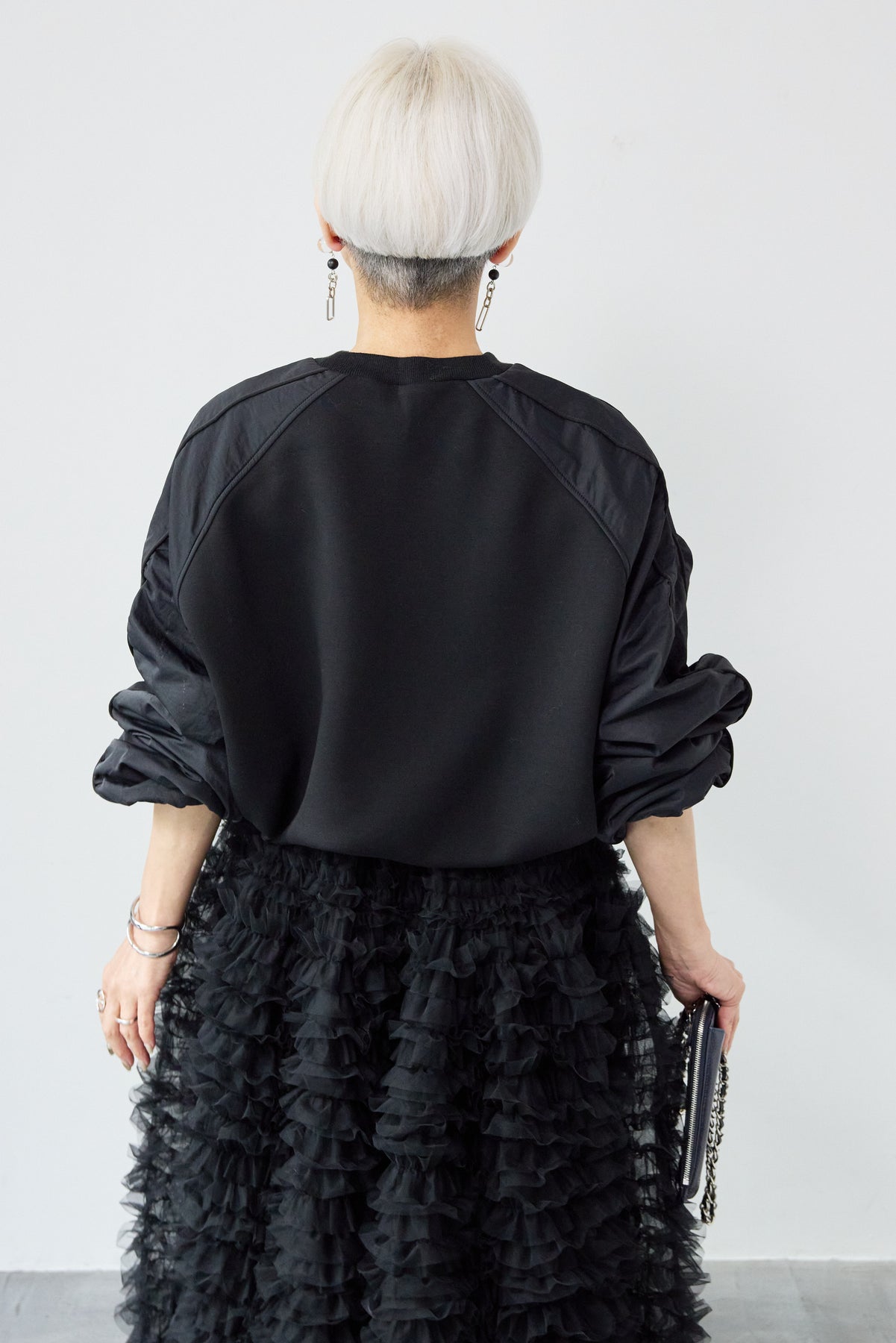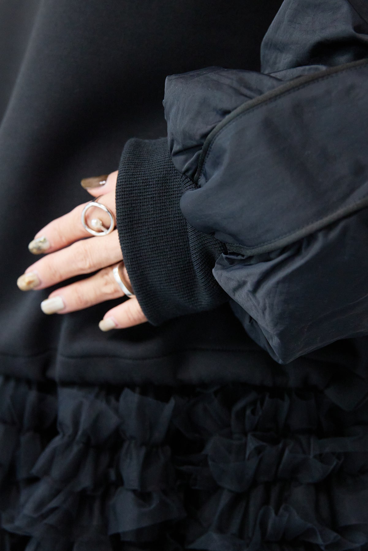 ・素材:(表地)ポリエステル80%,レーヨン14%,ポリウレタン6%  (別布)ナイロン100%  リブ:ポリエステル99%,ポリウレタン1%  (袖裏地)ポリエステル100%
