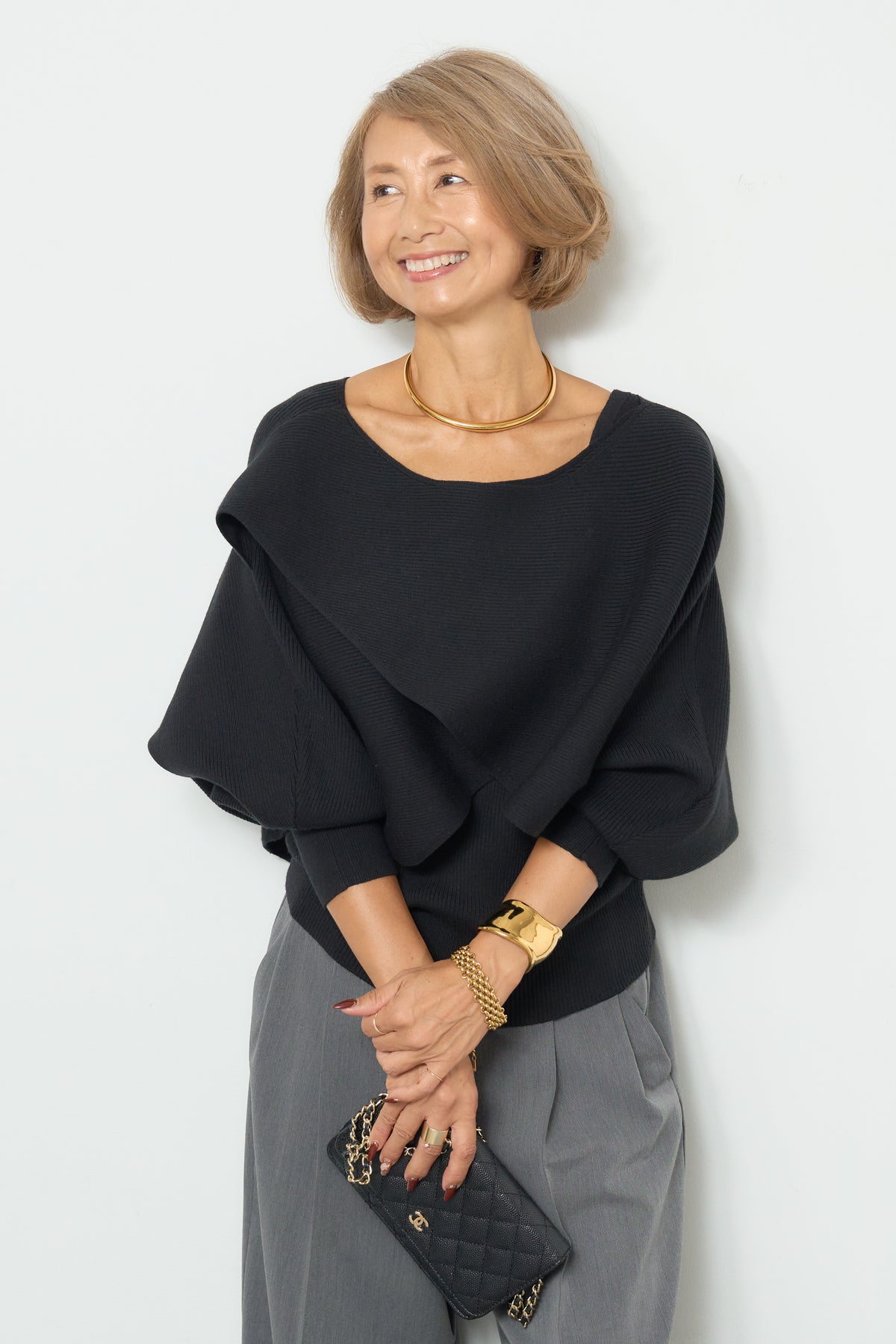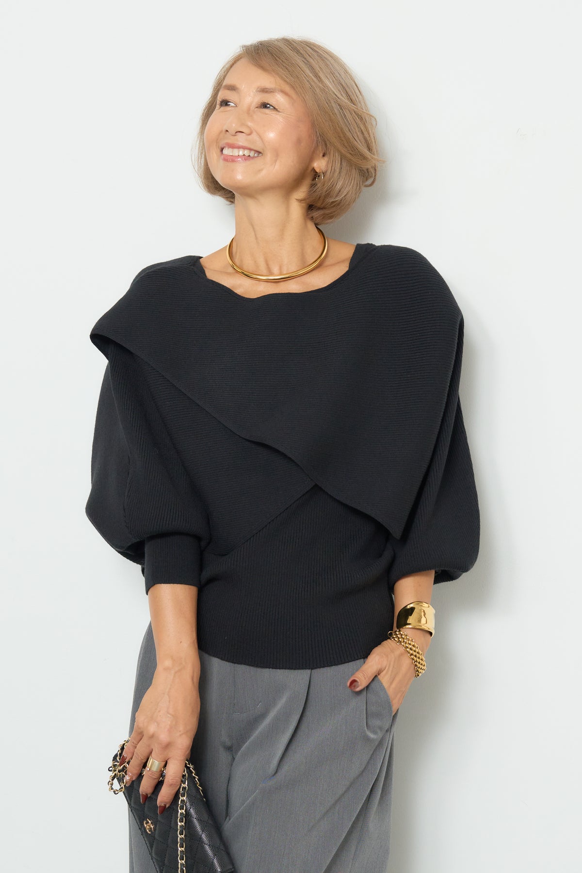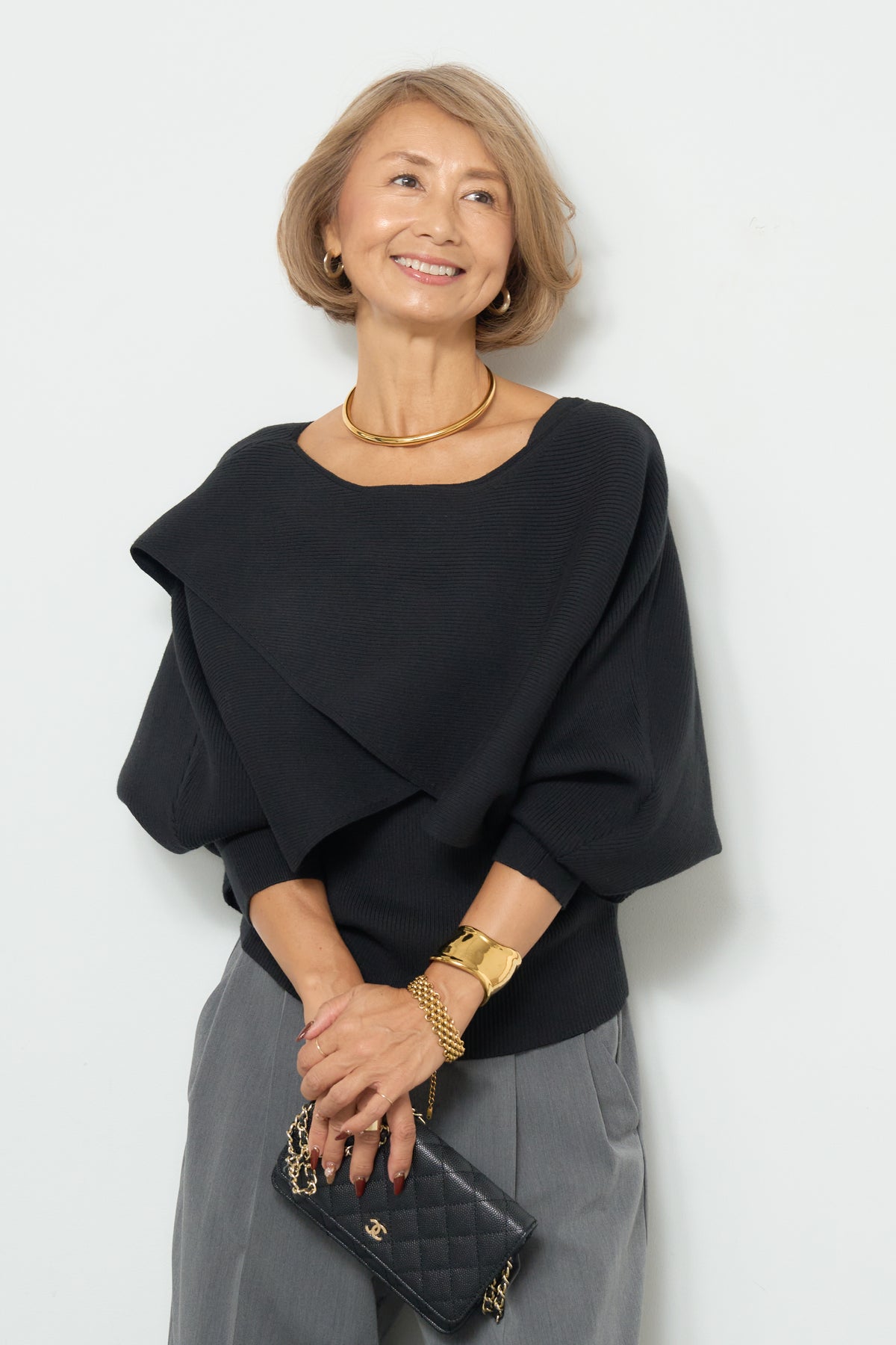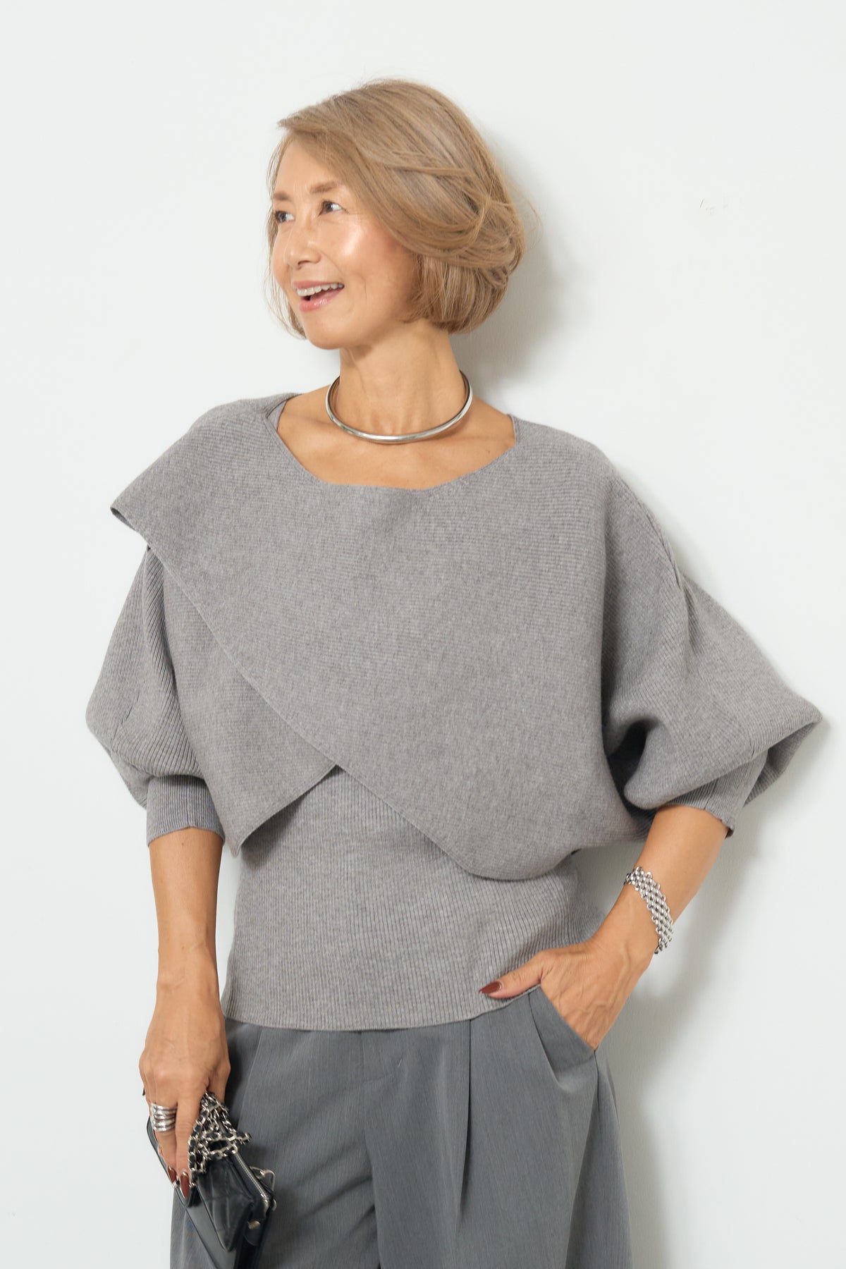 アシンメトリーなケープデザインが目を惹くニットと、シンプルなリブタンクトップの2点セット。レイヤードで着用すればモードな雰囲気を演出でき、単品使いでは幅広いコーディネートに活躍します。程よくゆとりのあるシルエットとリブ編みの伸縮性で、快適な着心地を実現。オンオフ問わずシーズンレスで使える万能アイテムです。