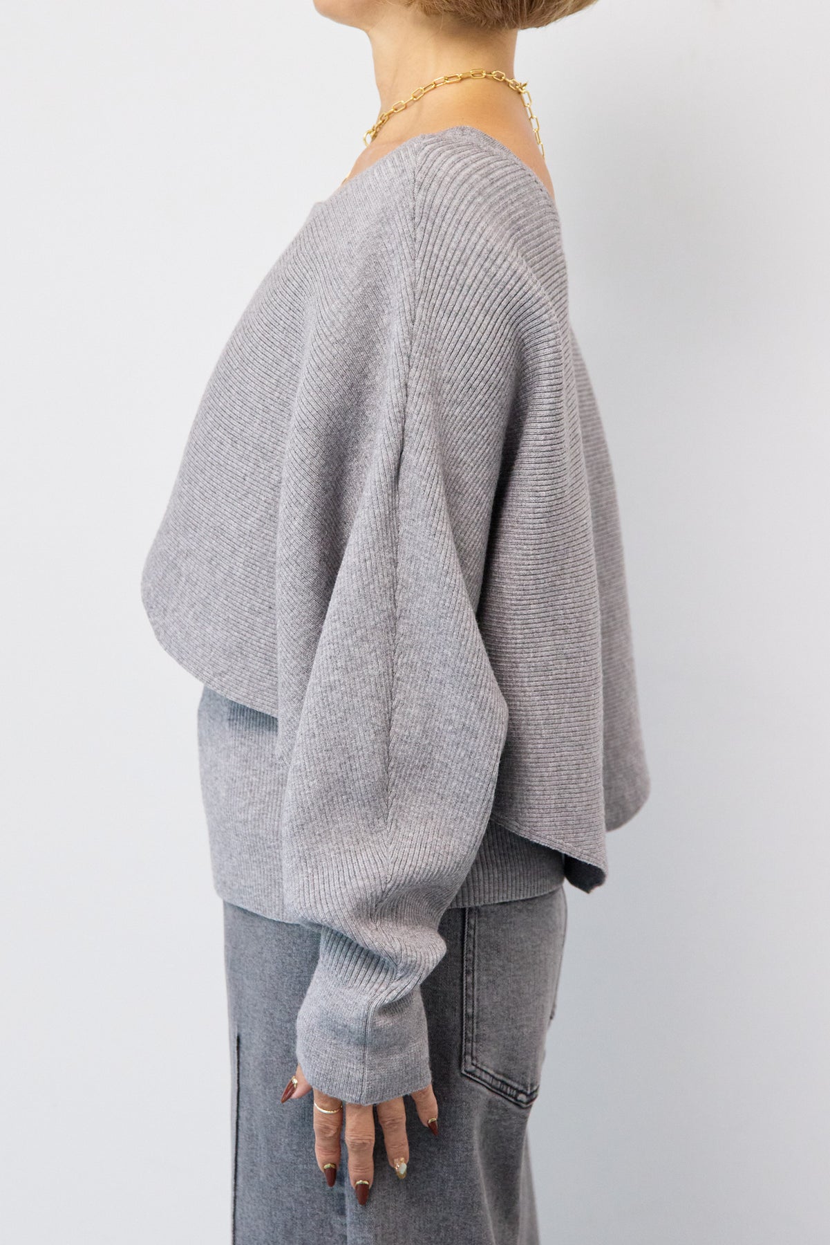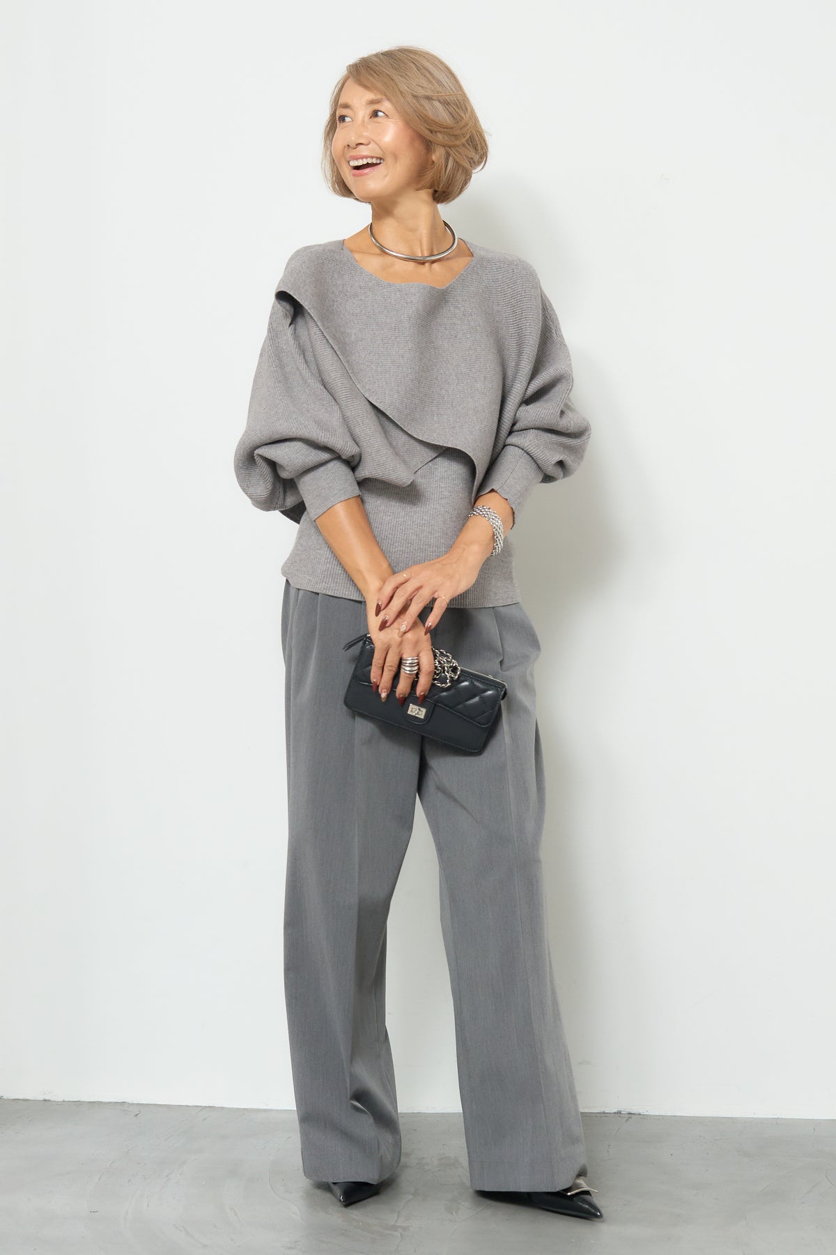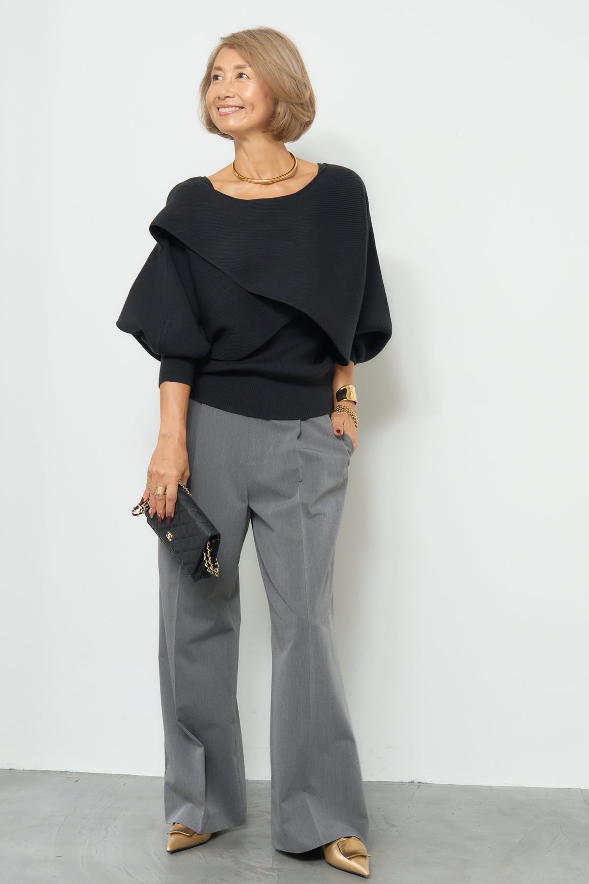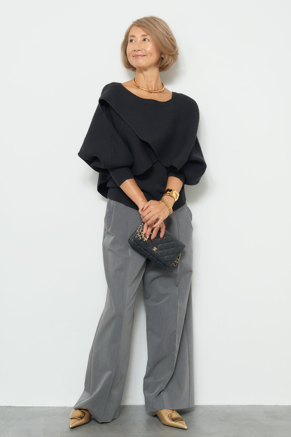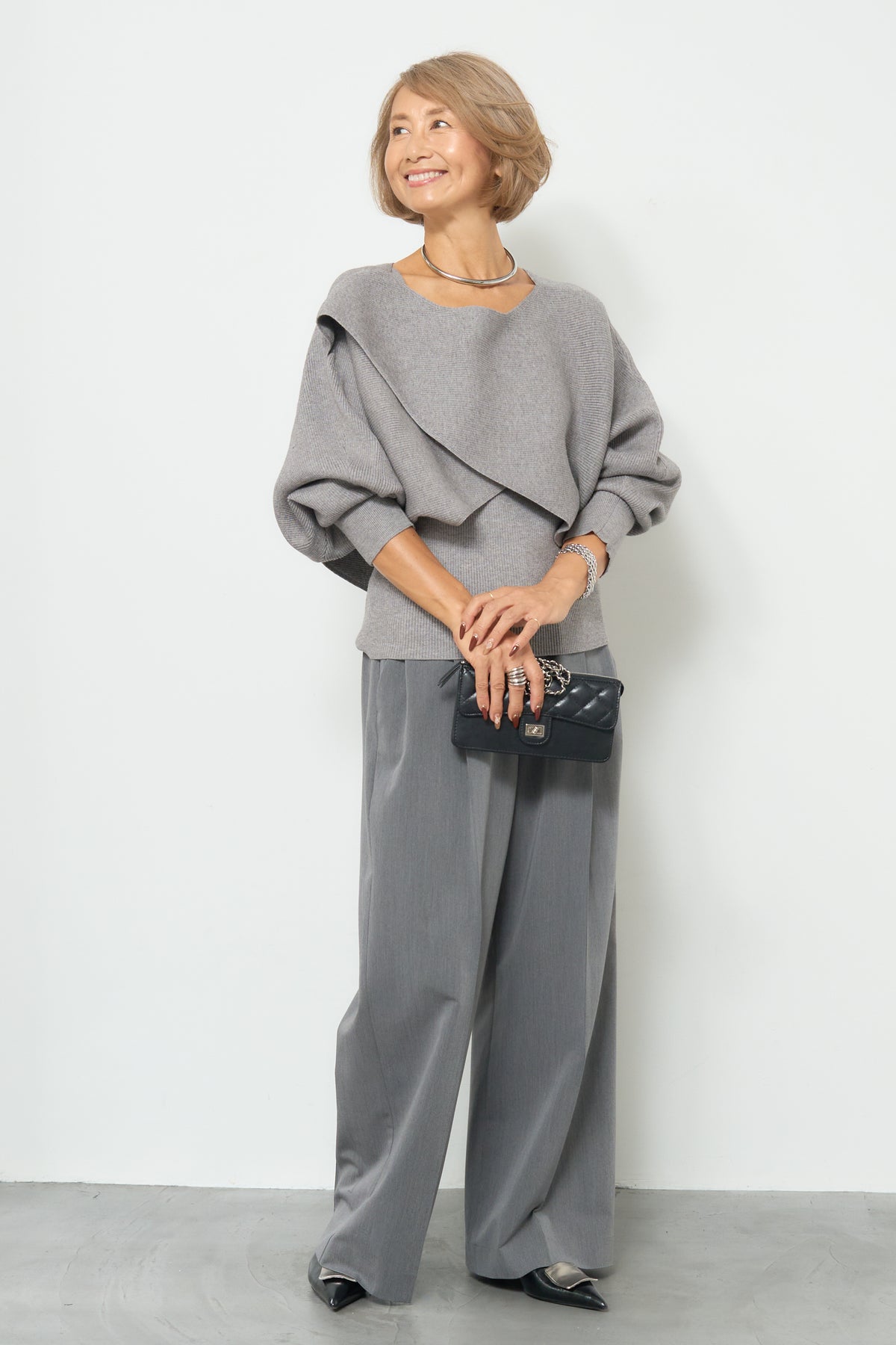 アシンメトリーなケープデザインが目を惹くニットと、シンプルなリブタンクトップの2点セット。レイヤードで着用すればモードな雰囲気を演出でき、単品使いでは幅広いコーディネートに活躍します。程よくゆとりのあるシルエットとリブ編みの伸縮性で、快適な着心地を実現。オンオフ問わずシーズンレスで使える万能アイテムです。
