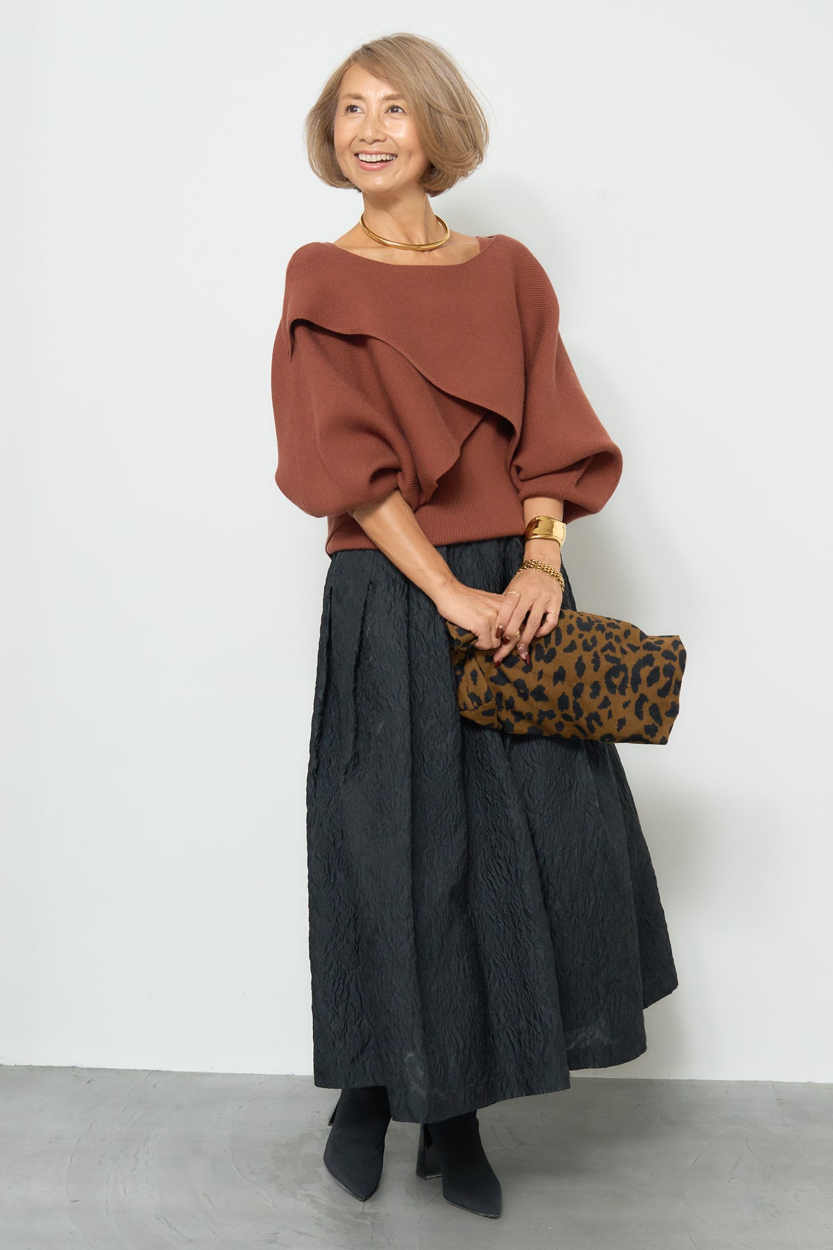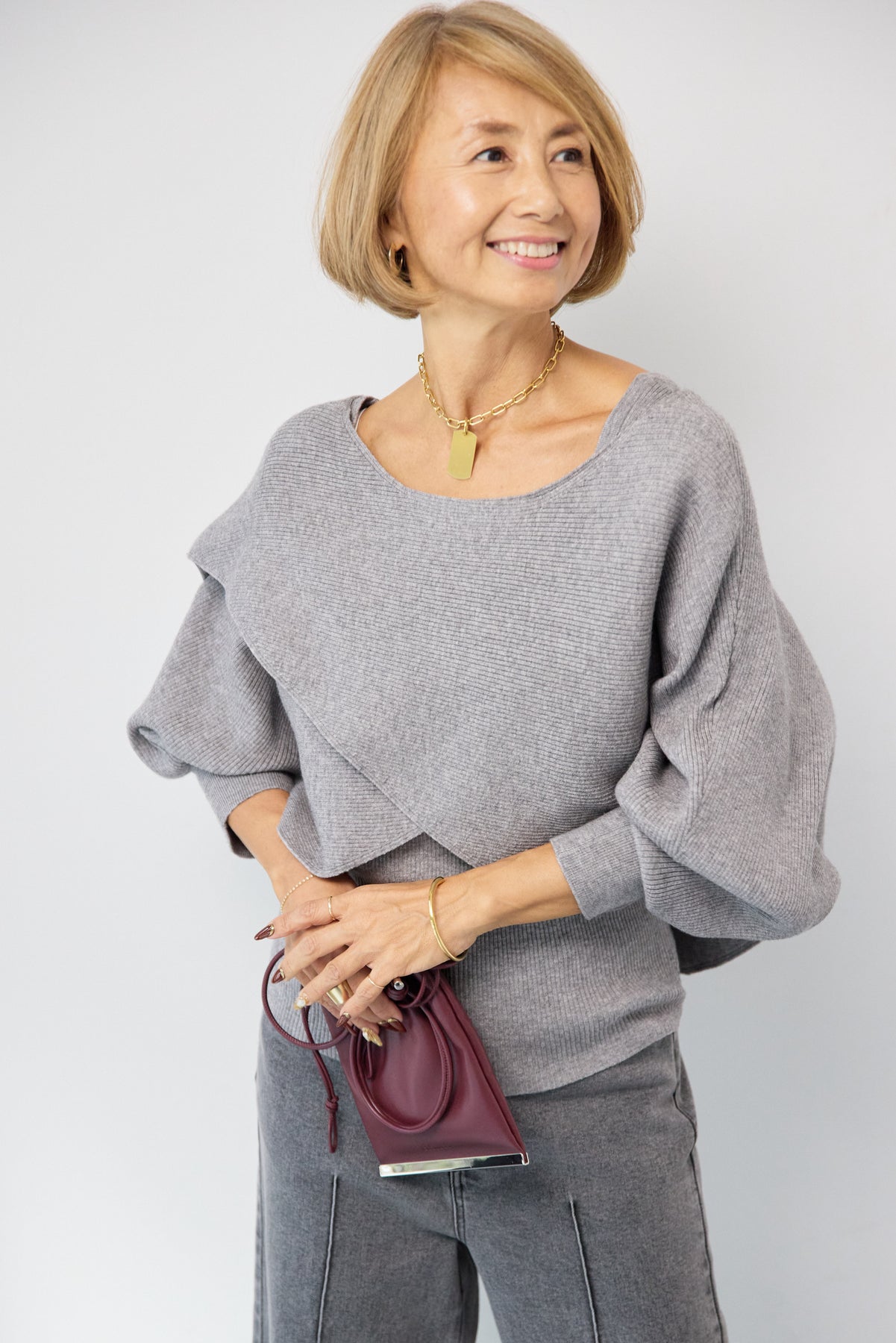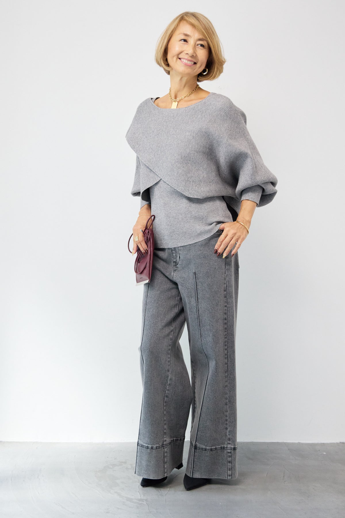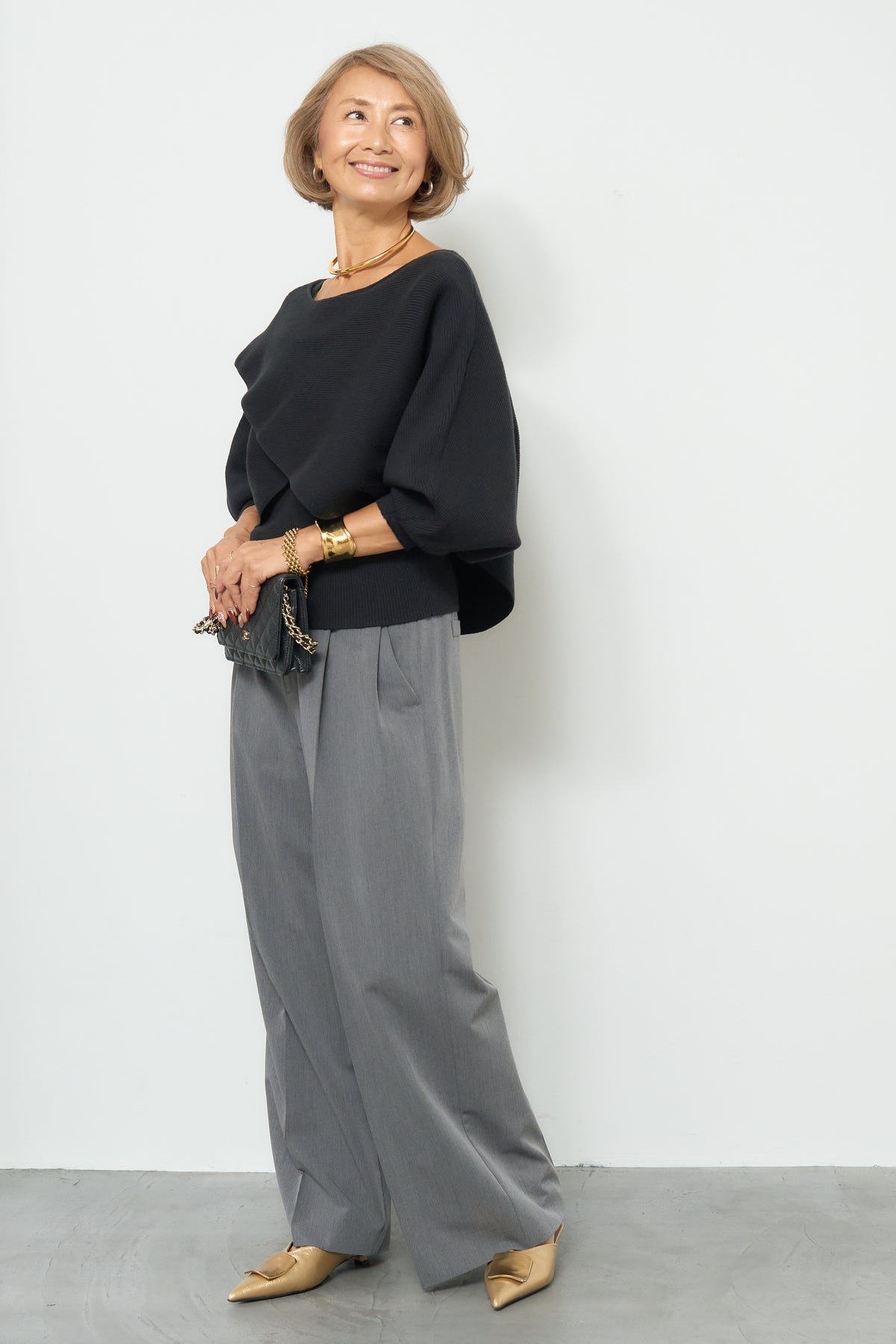 アシンメトリーなケープデザインが目を惹くニットと、シンプルなリブタンクトップの2点セット。レイヤードで着用すればモードな雰囲気を演出でき、単品使いでは幅広いコーディネートに活躍します。程よくゆとりのあるシルエットとリブ編みの伸縮性で、快適な着心地を実現。オンオフ問わずシーズンレスで使える万能アイテムです。