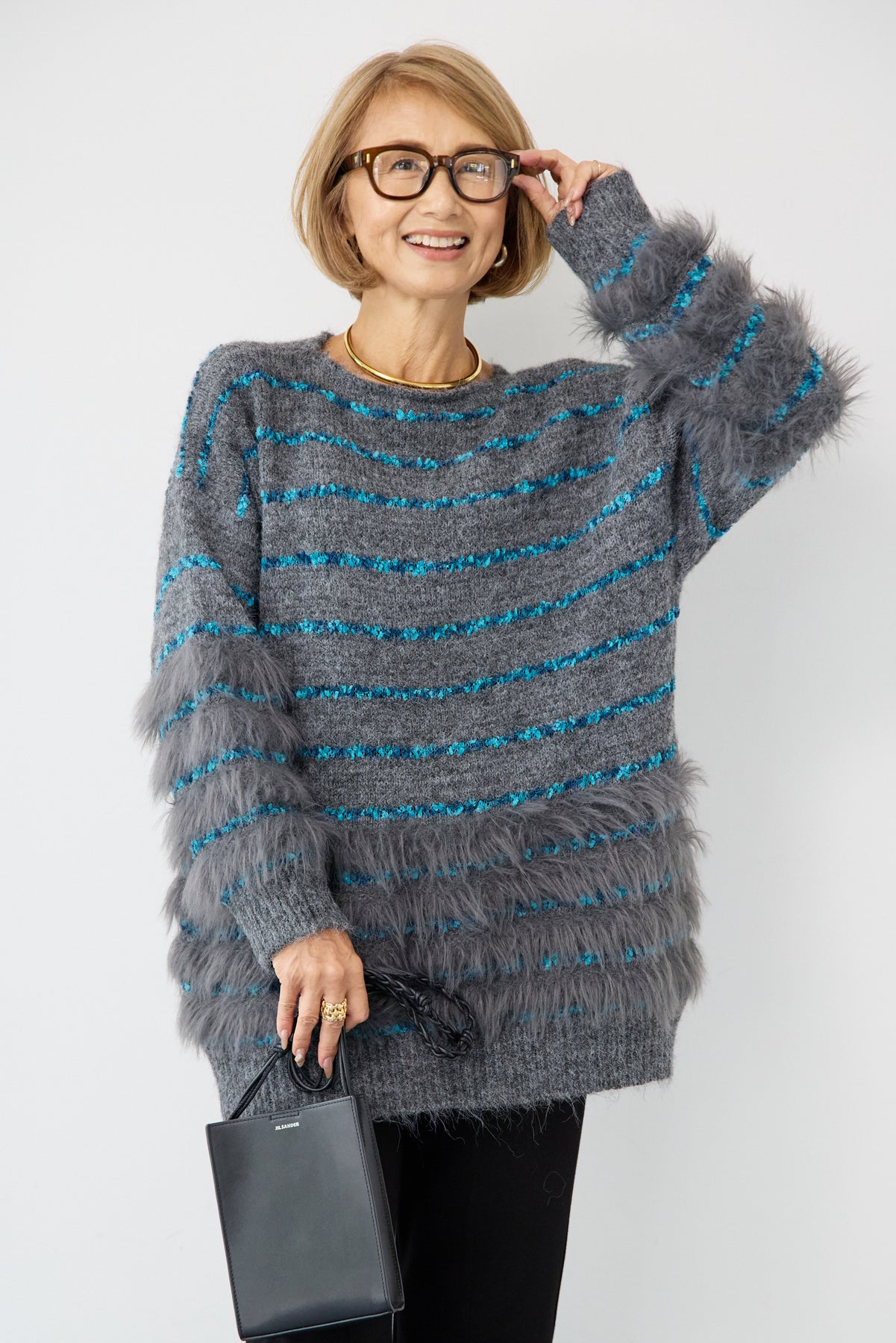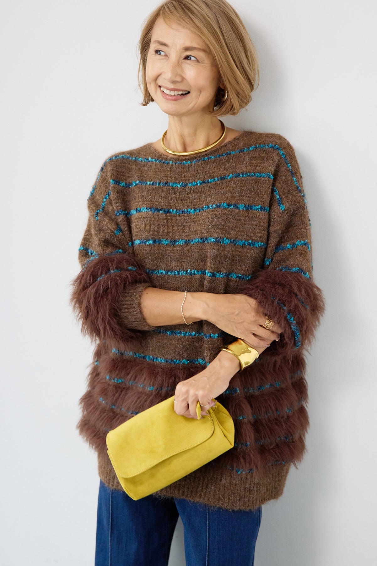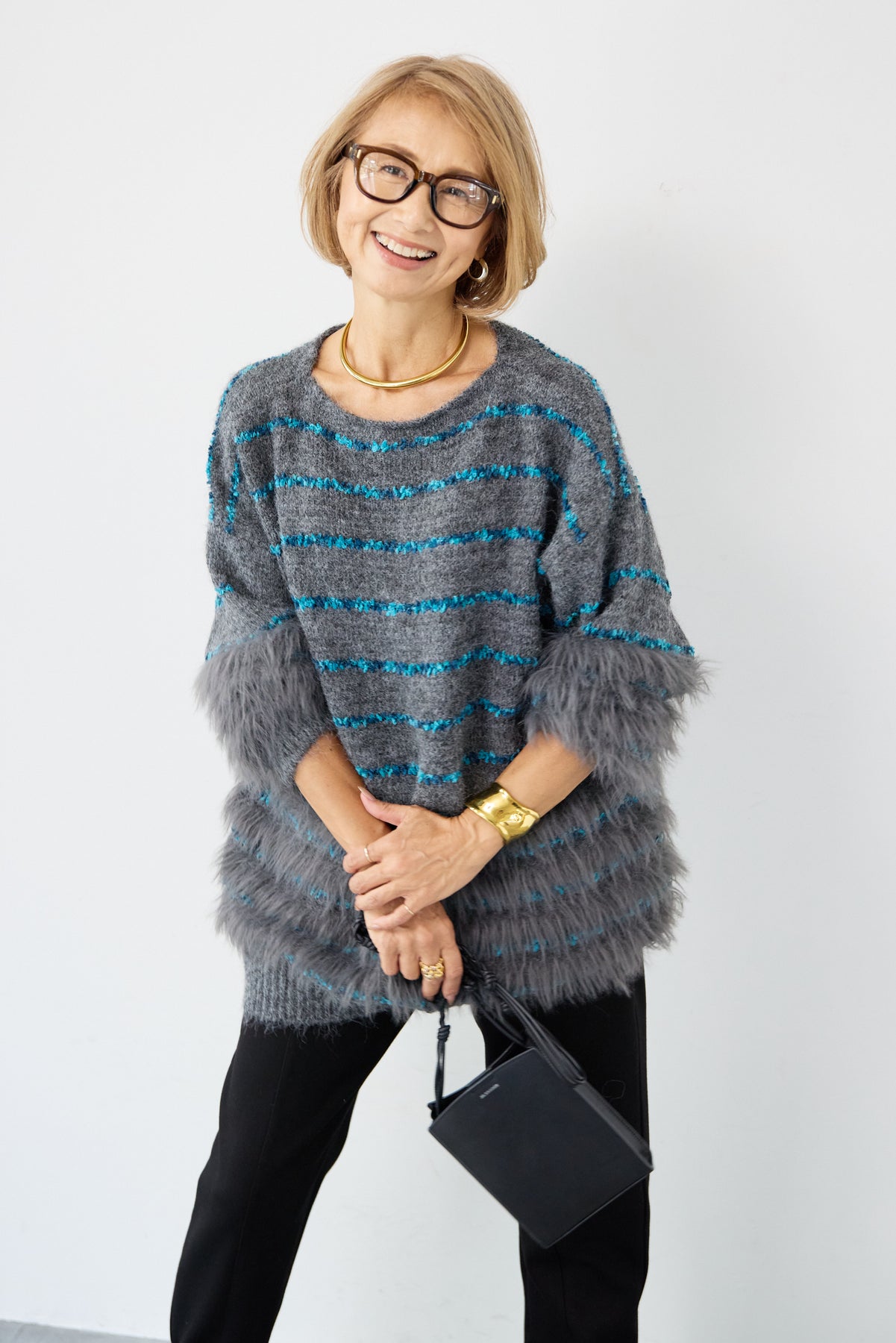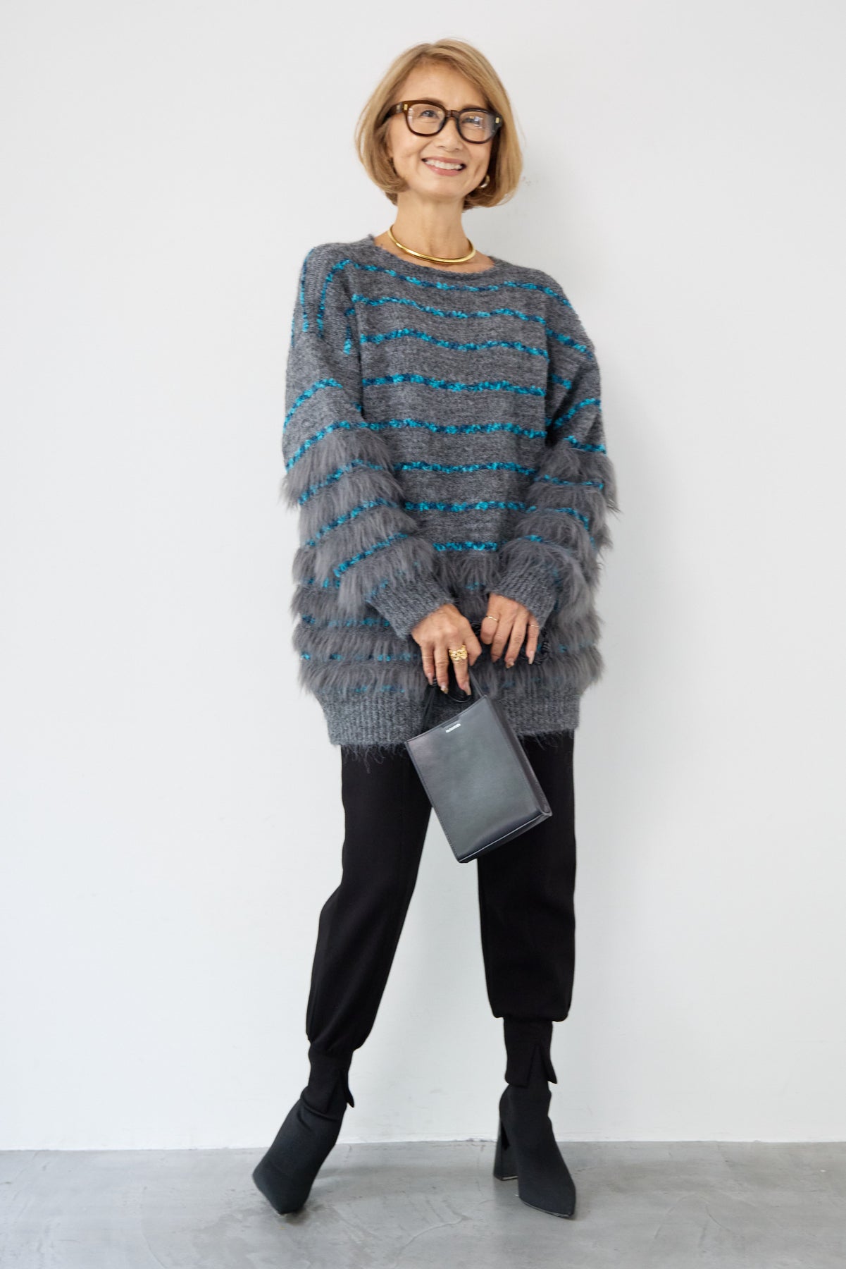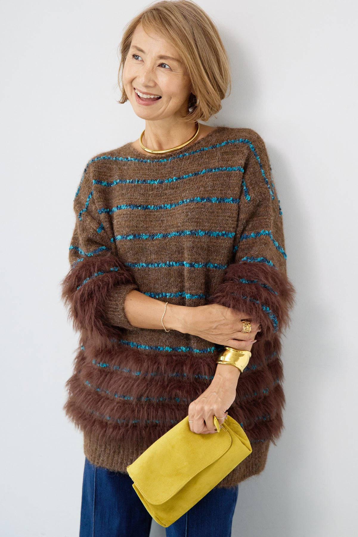 異素材の組み合わせが印象的な配色ラインシャギーニット。ふんわりとした毛足の長いシャギー素材を切り替え、立体感のあるストライプ柄に仕上げました。ゆとりのあるシルエットが体のラインを拾わず、ラフに着られるのも魅力。ボリューム感のある袖デザインがアクセントになり、一枚で主役になる存在感のあるニットです。デニムやワイドパンツと合わせて、抜け感のあるスタイリングに。
