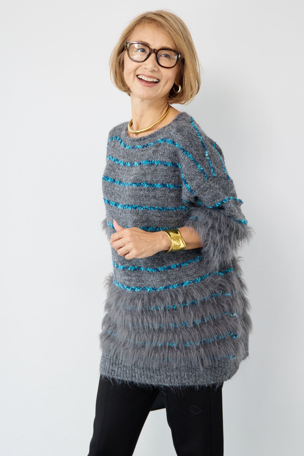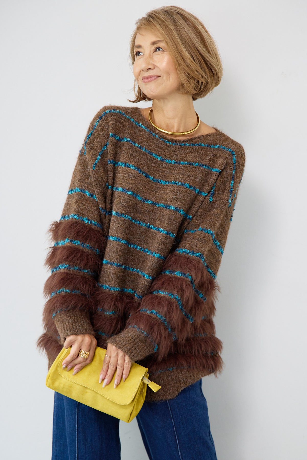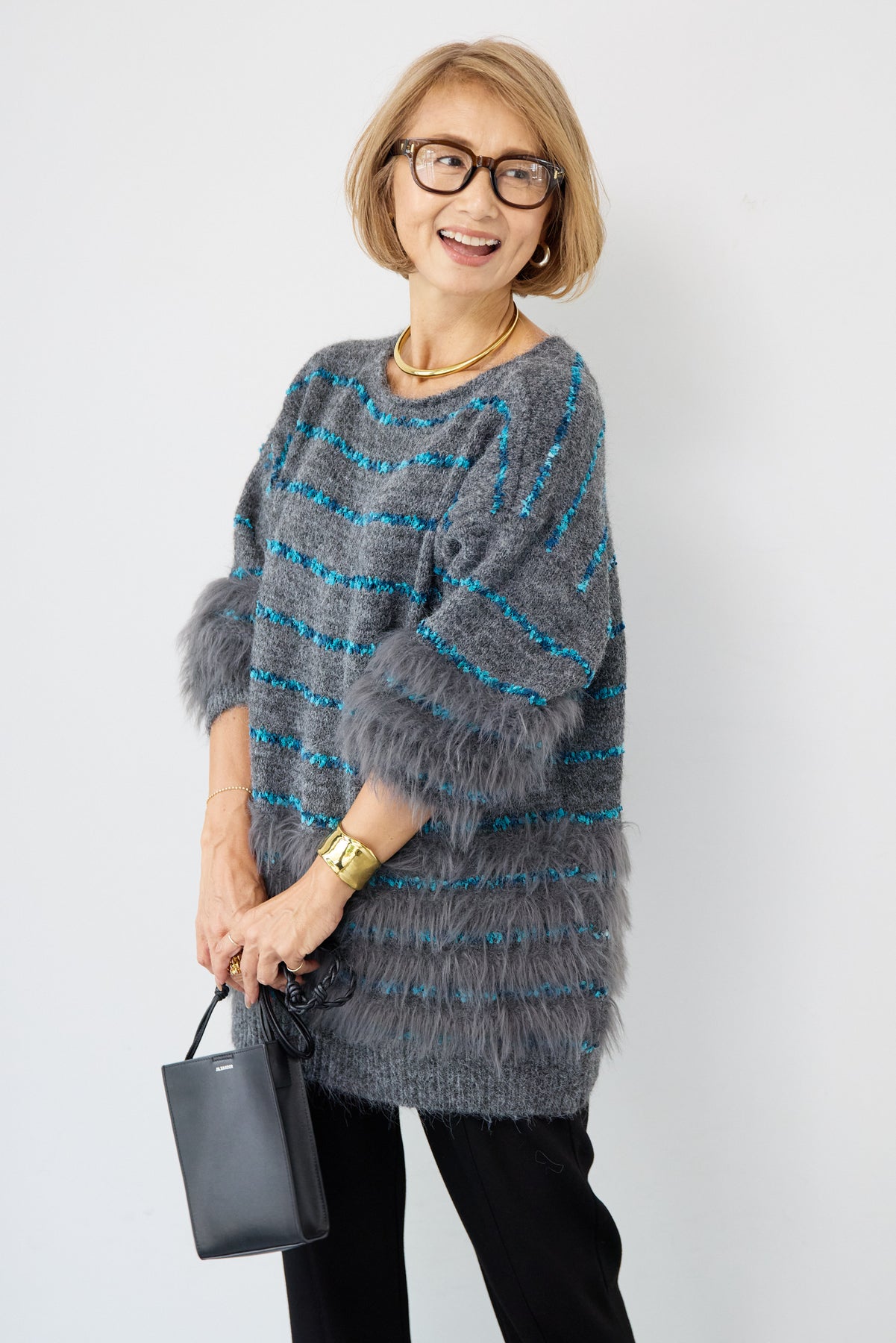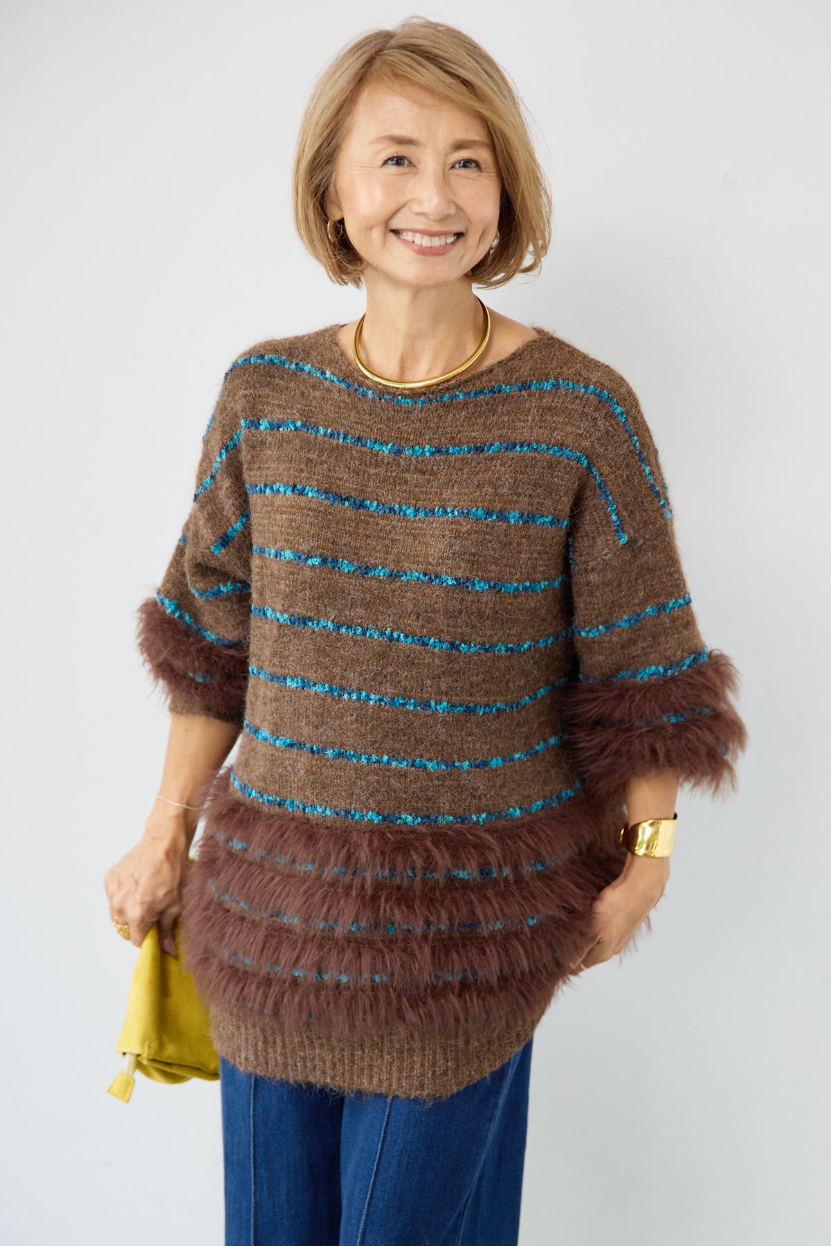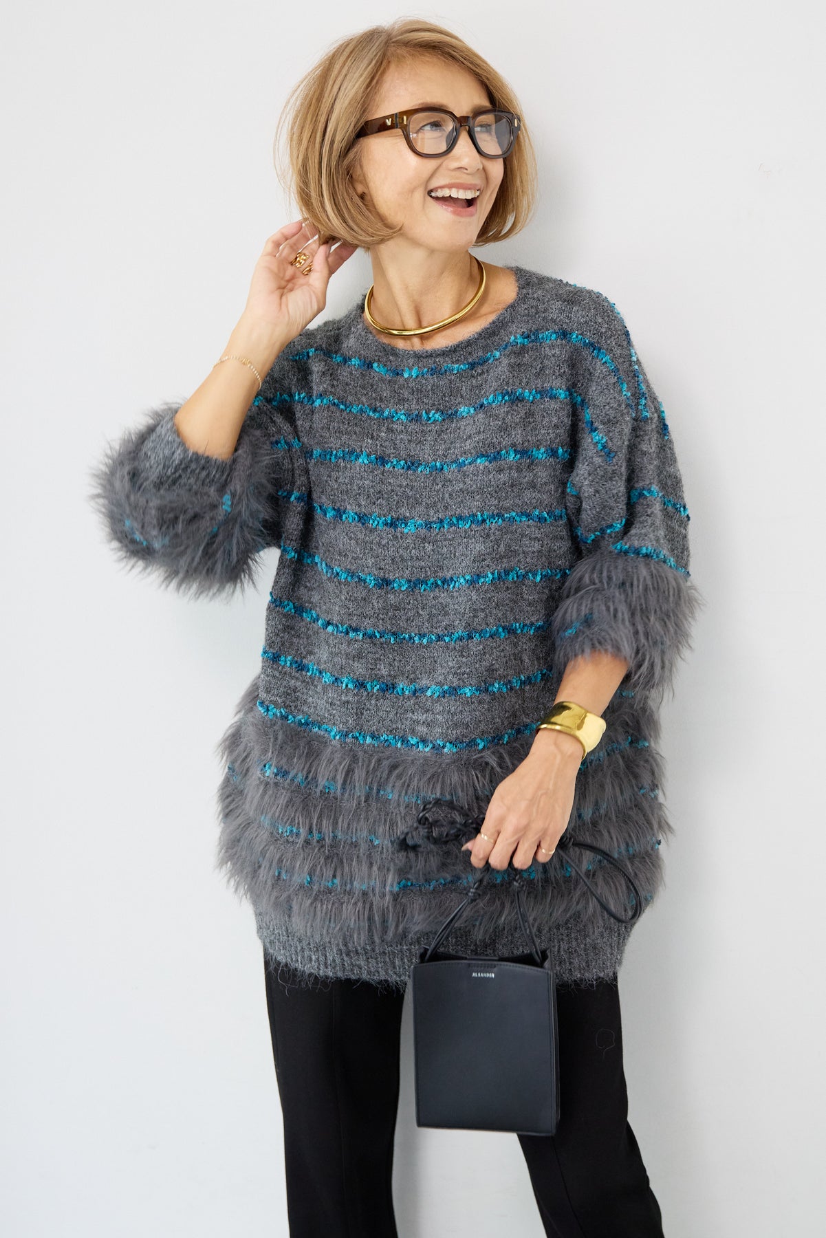 異素材の組み合わせが印象的な配色ラインシャギーニット。ふんわりとした毛足の長いシャギー素材を切り替え、立体感のあるストライプ柄に仕上げました。ゆとりのあるシルエットが体のラインを拾わず、ラフに着られるのも魅力。ボリューム感のある袖デザインがアクセントになり、一枚で主役になる存在感のあるニットです。デニムやワイドパンツと合わせて、抜け感のあるスタイリングに。