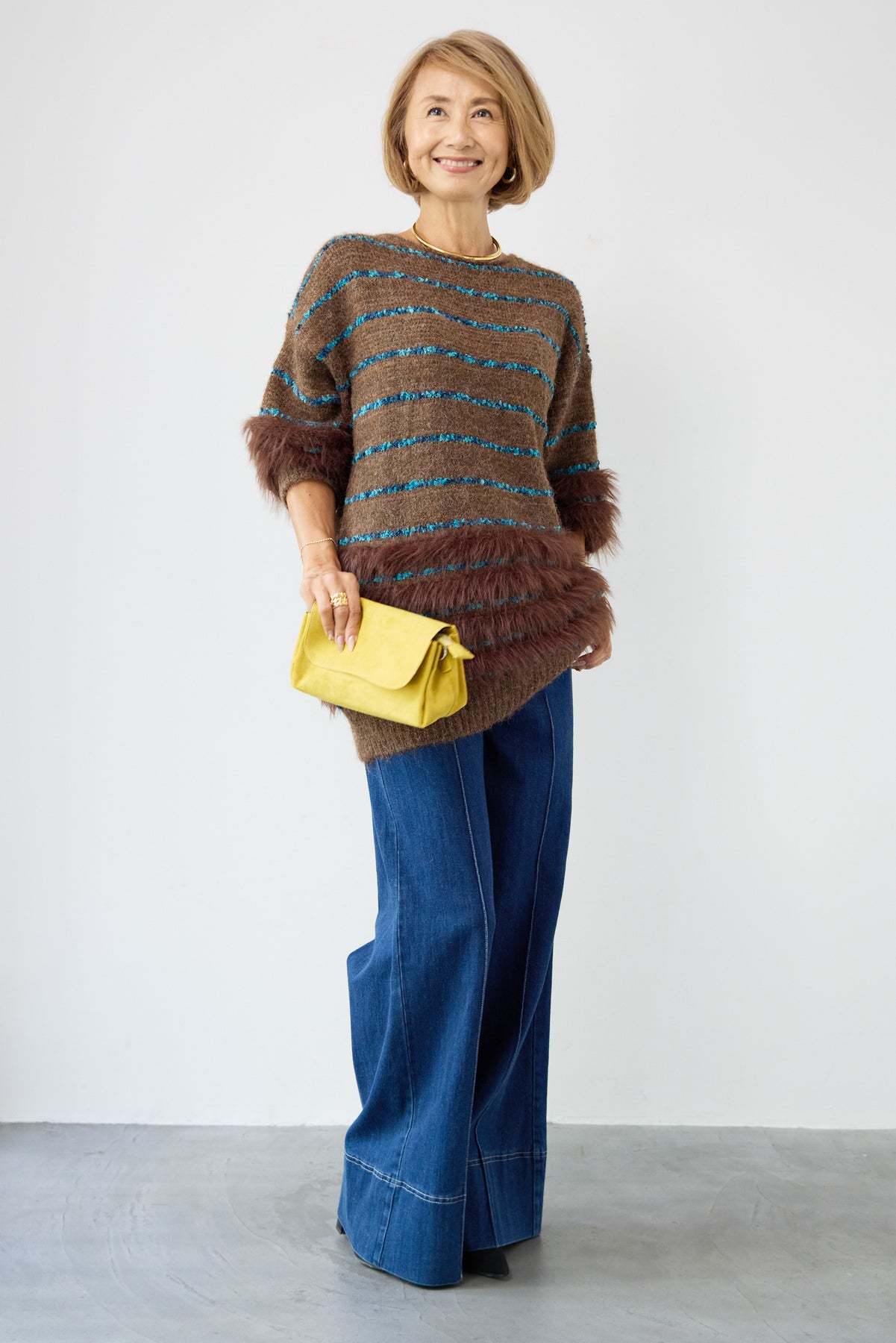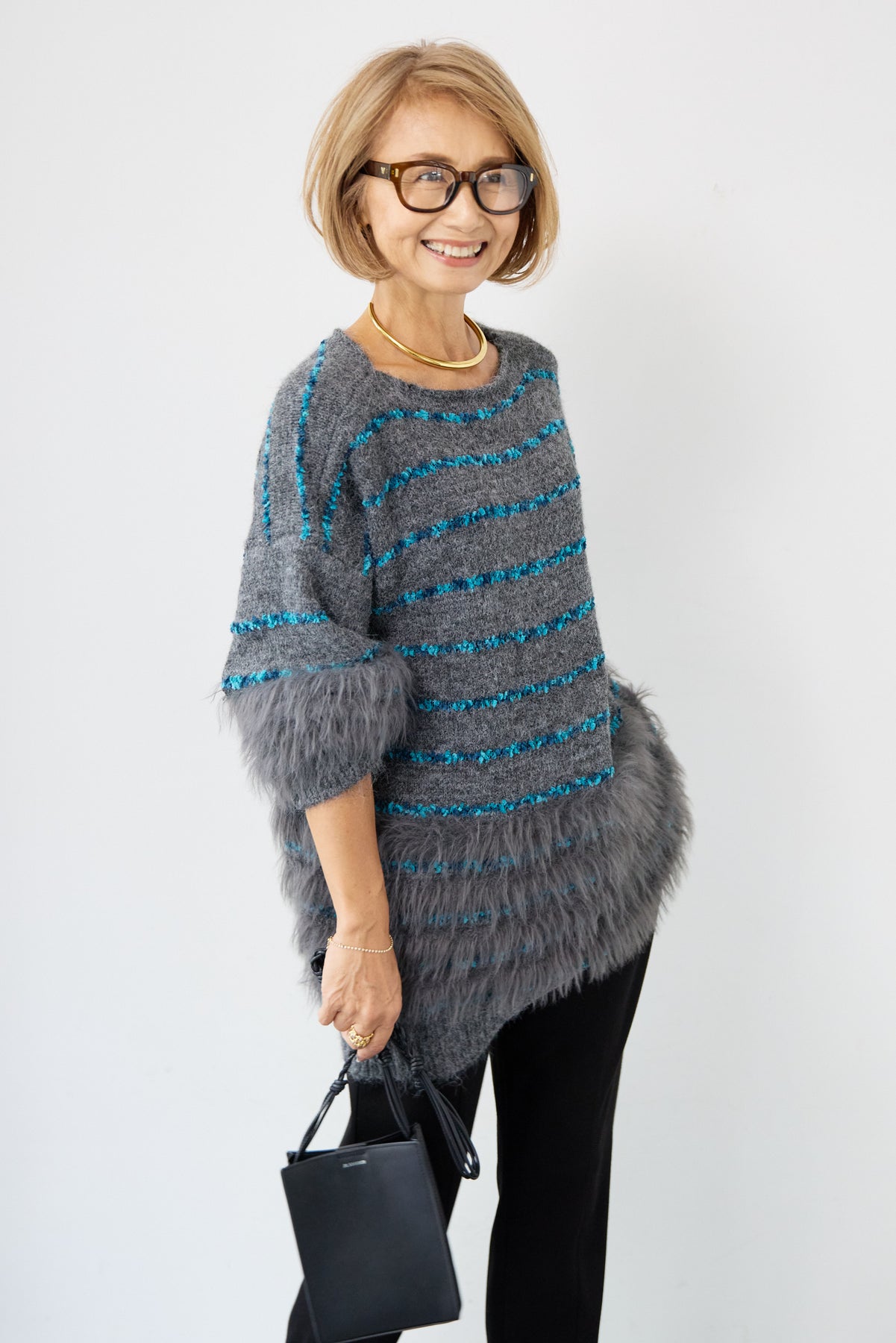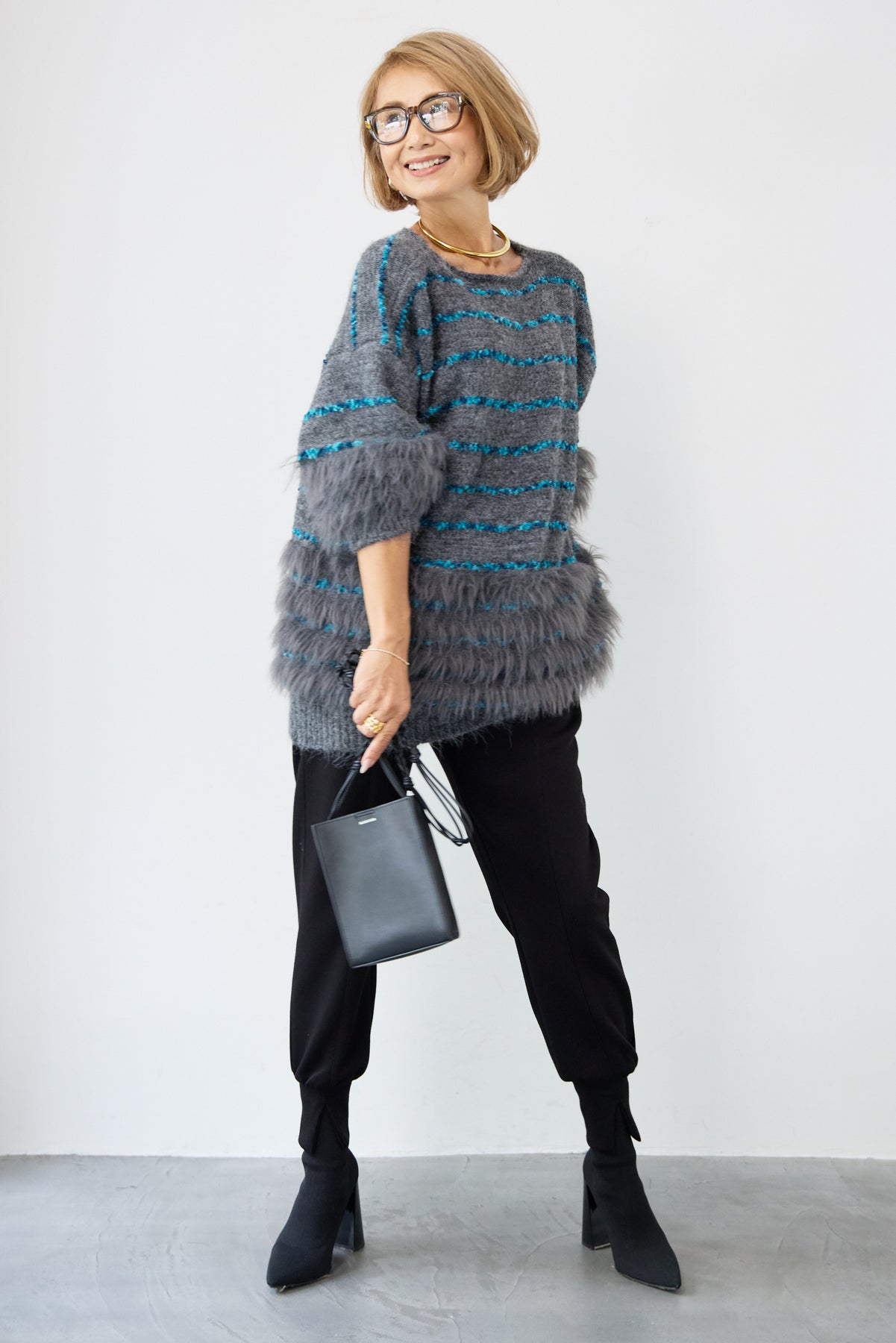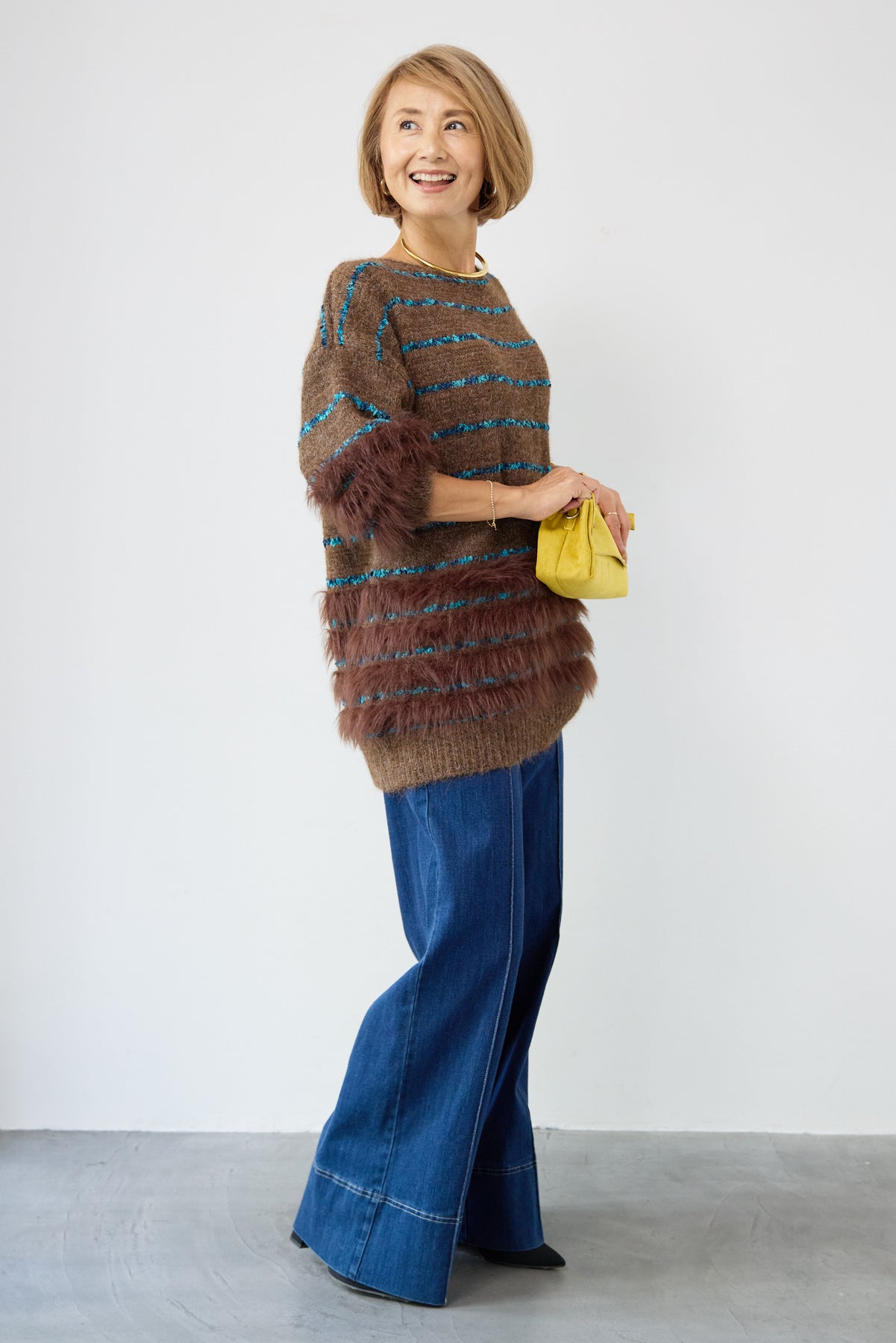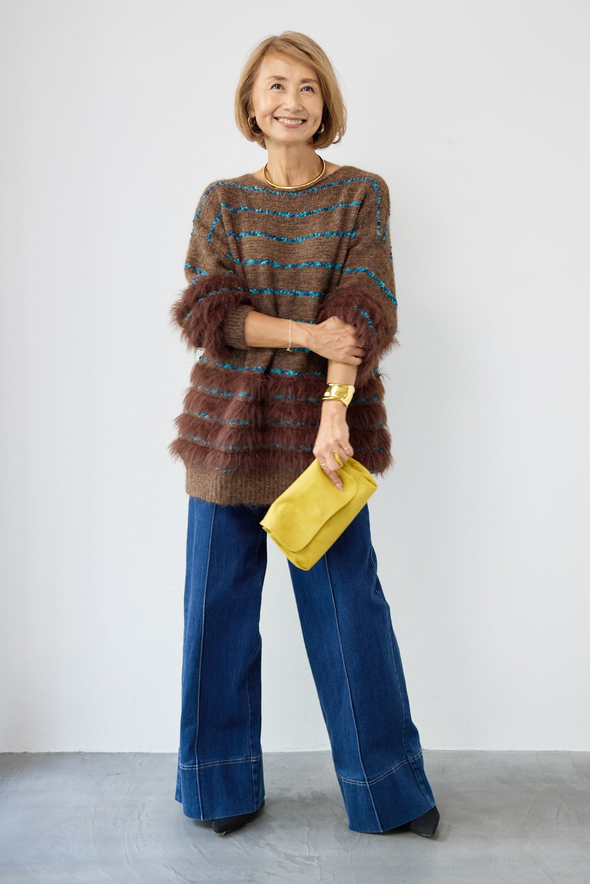 異素材の組み合わせが印象的な配色ラインシャギーニット。ふんわりとした毛足の長いシャギー素材を切り替え、立体感のあるストライプ柄に仕上げました。ゆとりのあるシルエットが体のラインを拾わず、ラフに着られるのも魅力。ボリューム感のある袖デザインがアクセントになり、一枚で主役になる存在感のあるニットです。デニムやワイドパンツと合わせて、抜け感のあるスタイリングに。