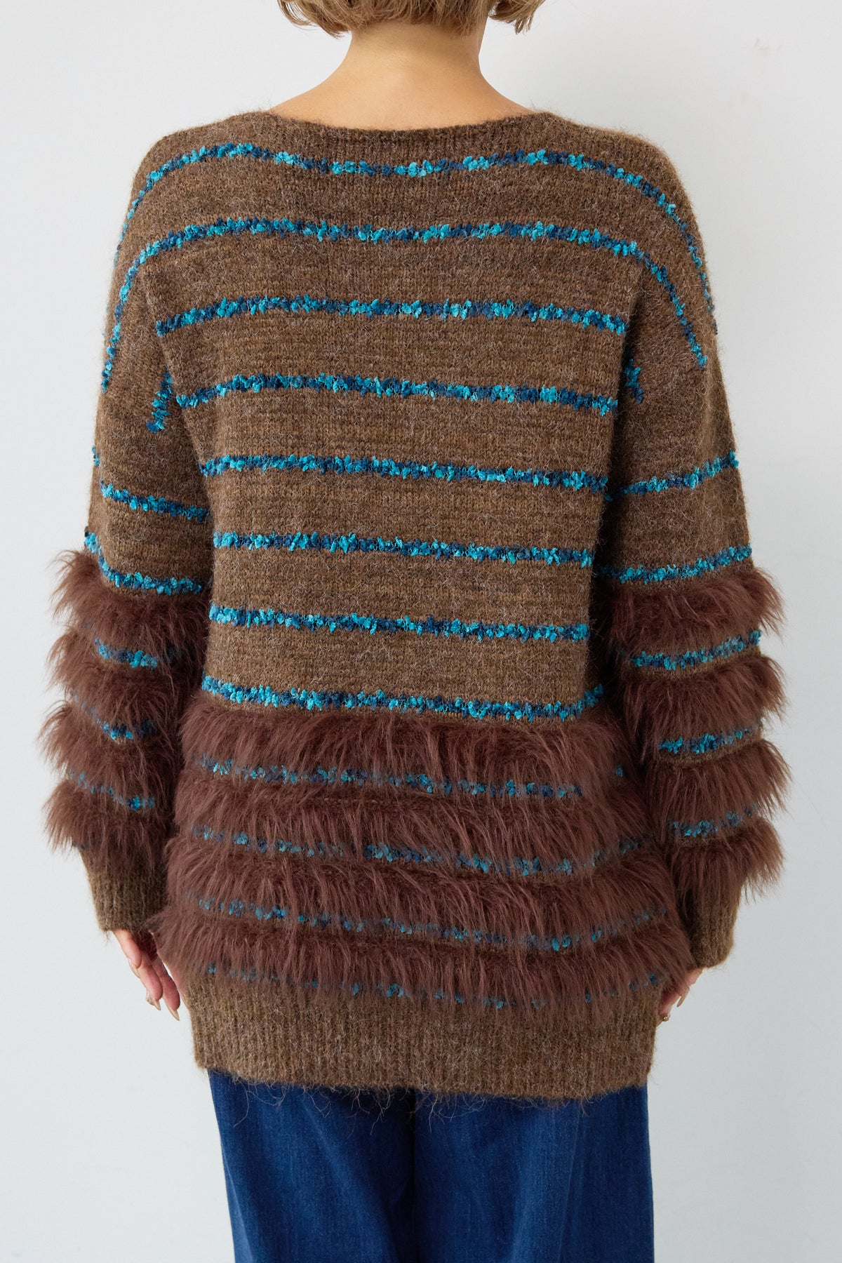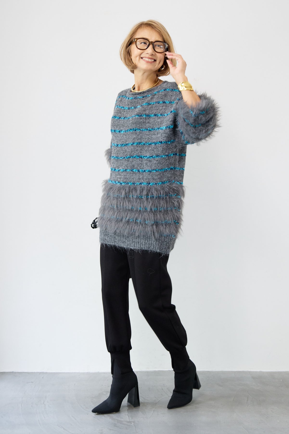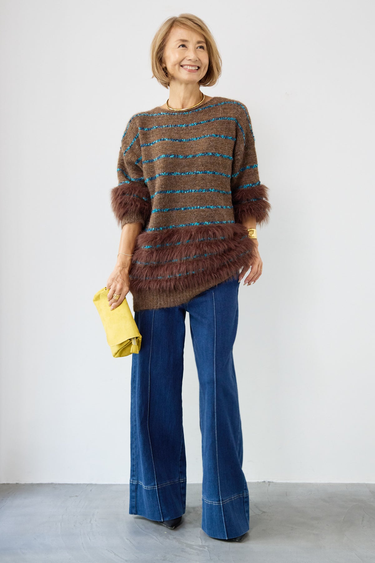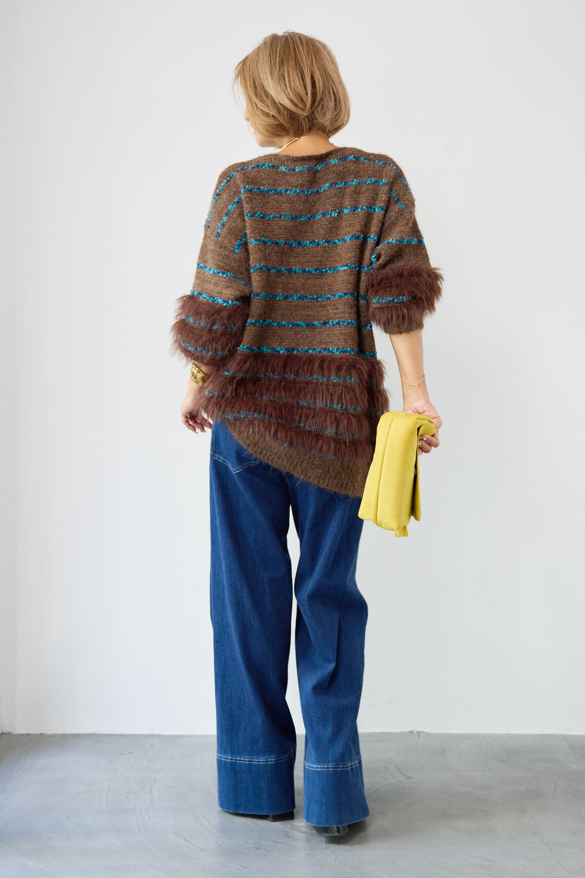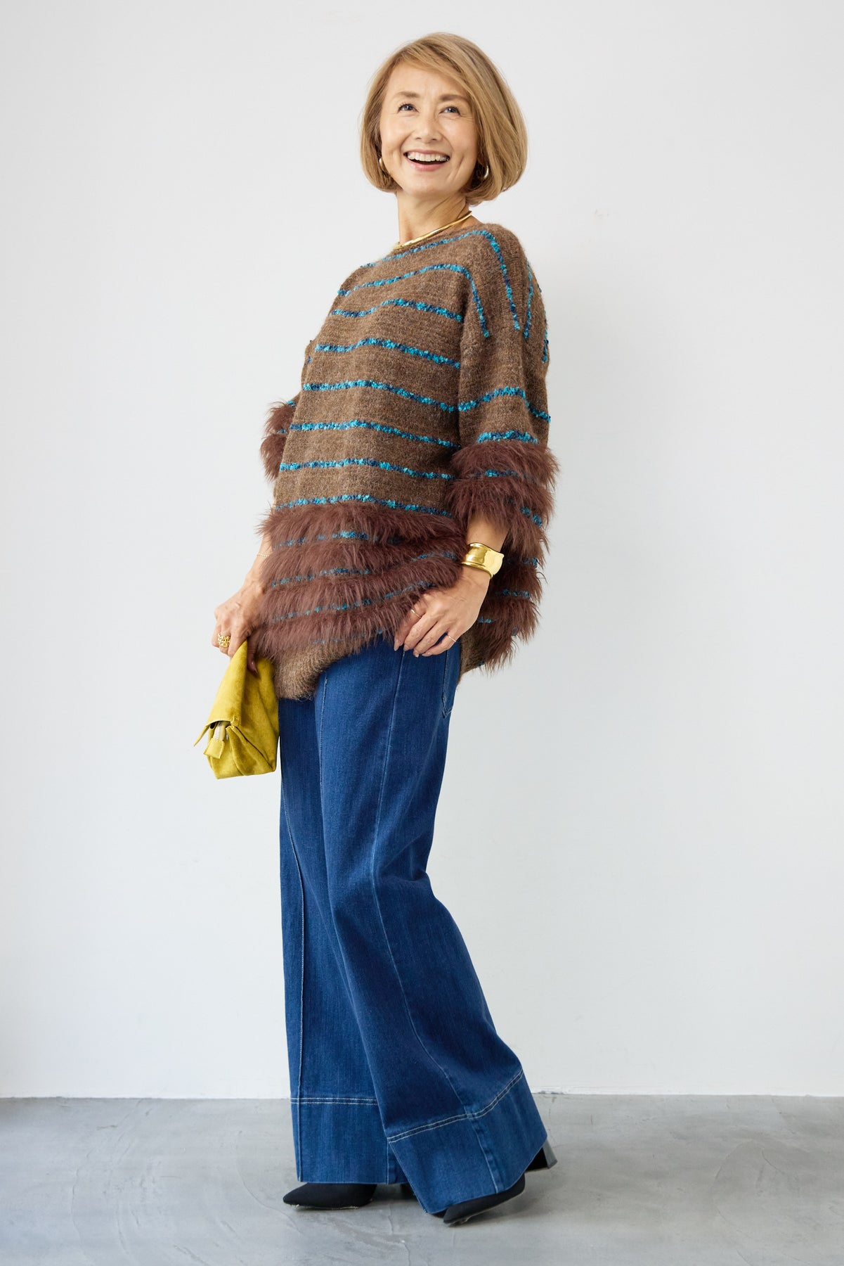 異素材の組み合わせが印象的な配色ラインシャギーニット。ふんわりとした毛足の長いシャギー素材を切り替え、立体感のあるストライプ柄に仕上げました。ゆとりのあるシルエットが体のラインを拾わず、ラフに着られるのも魅力。ボリューム感のある袖デザインがアクセントになり、一枚で主役になる存在感のあるニットです。デニムやワイドパンツと合わせて、抜け感のあるスタイリングに。