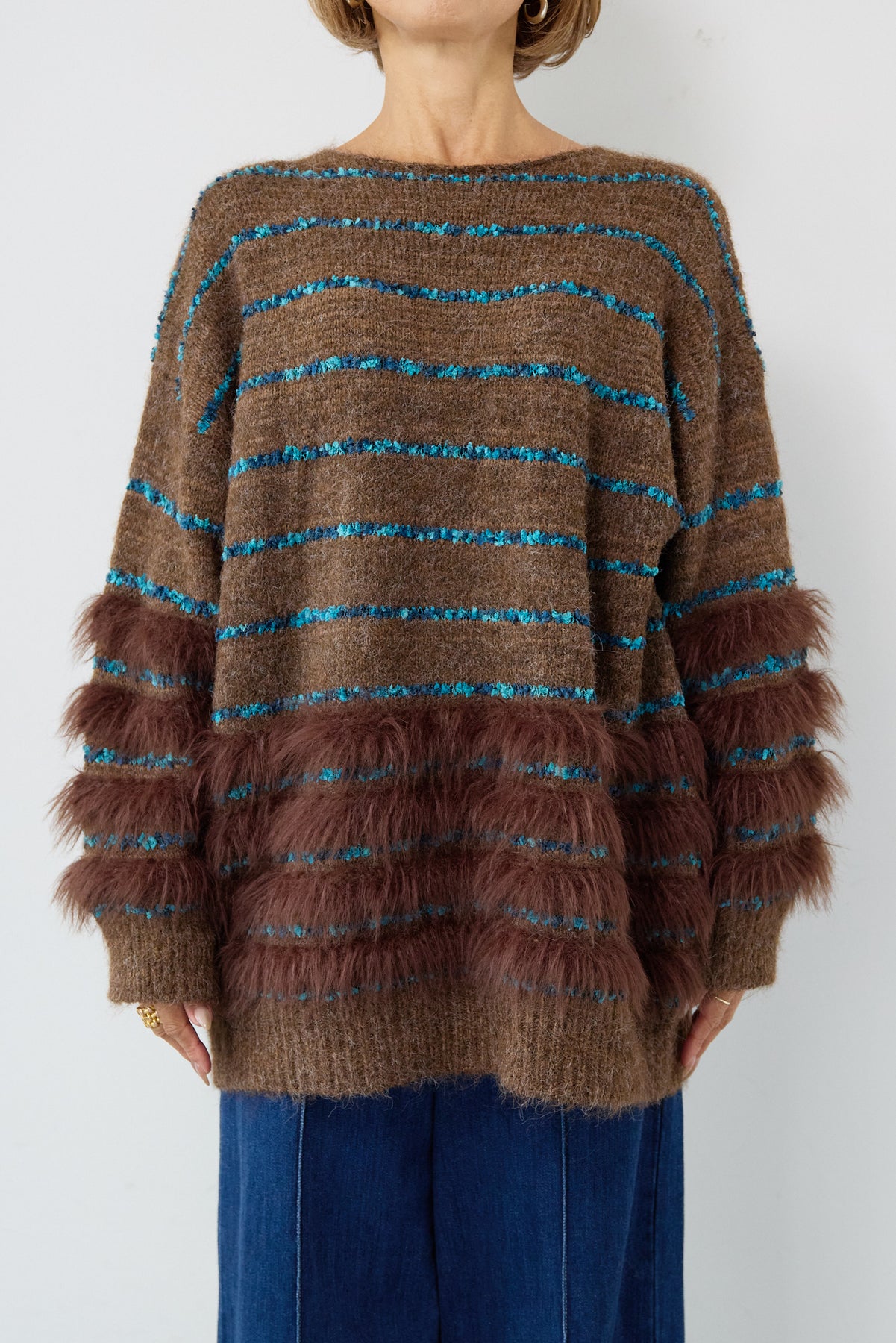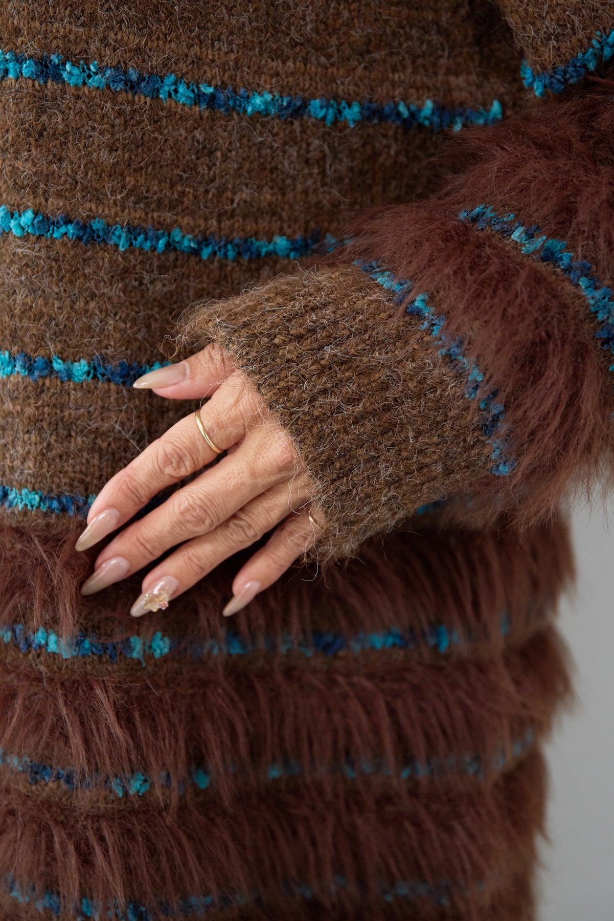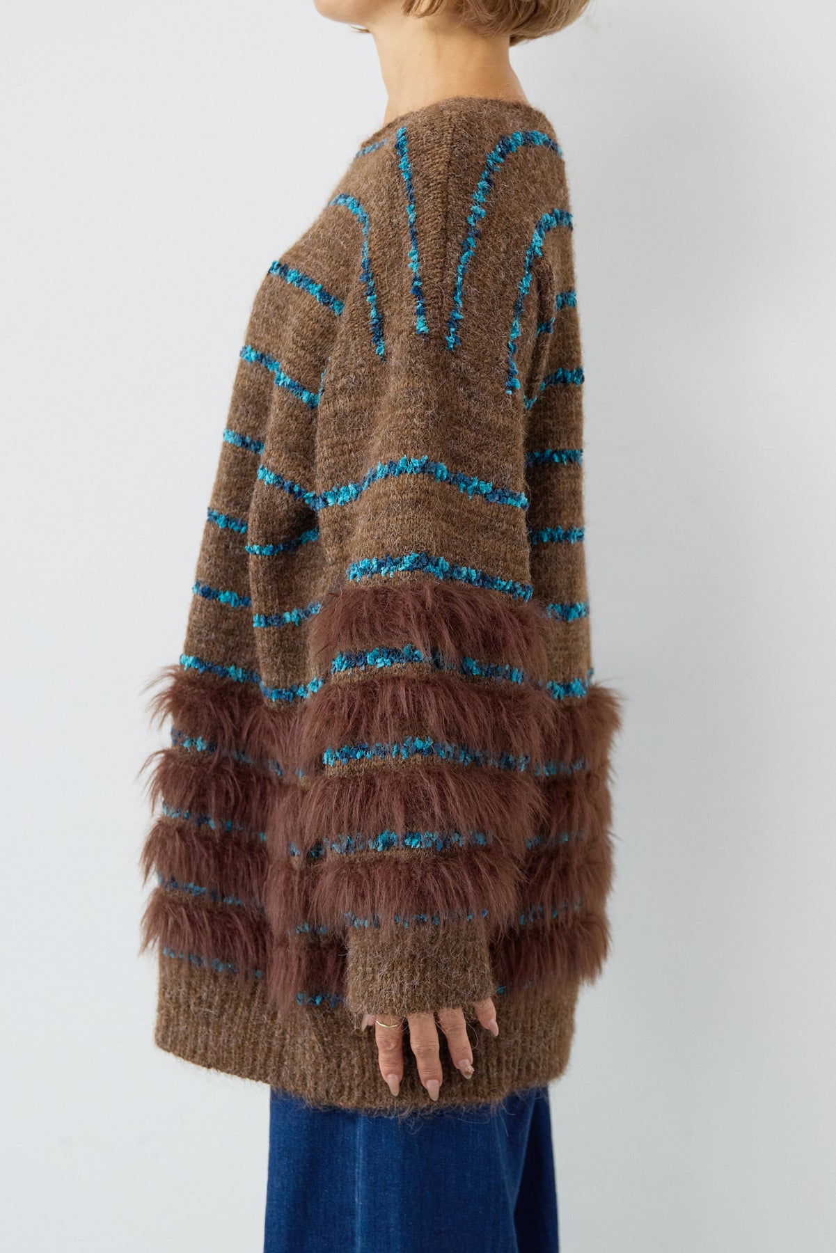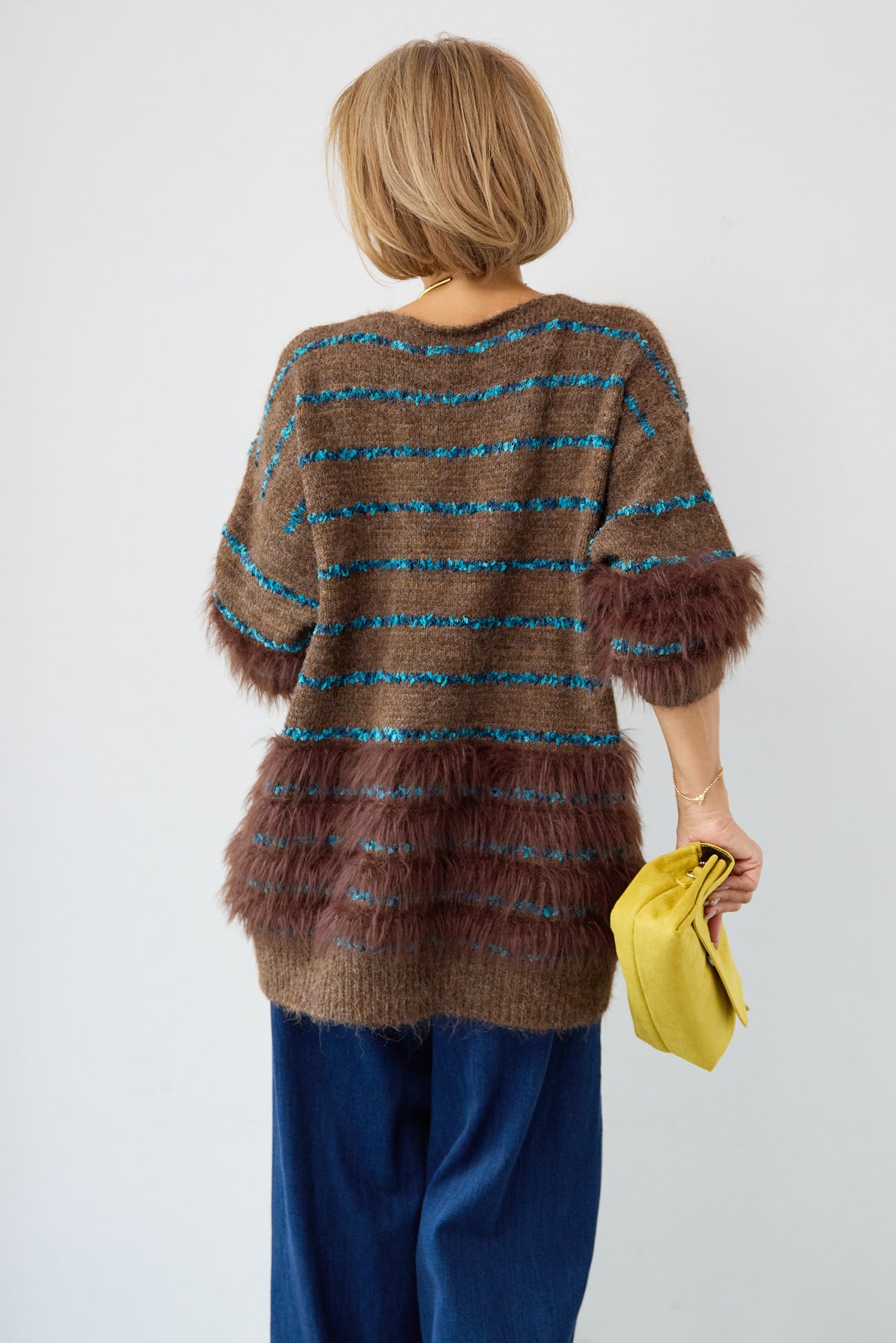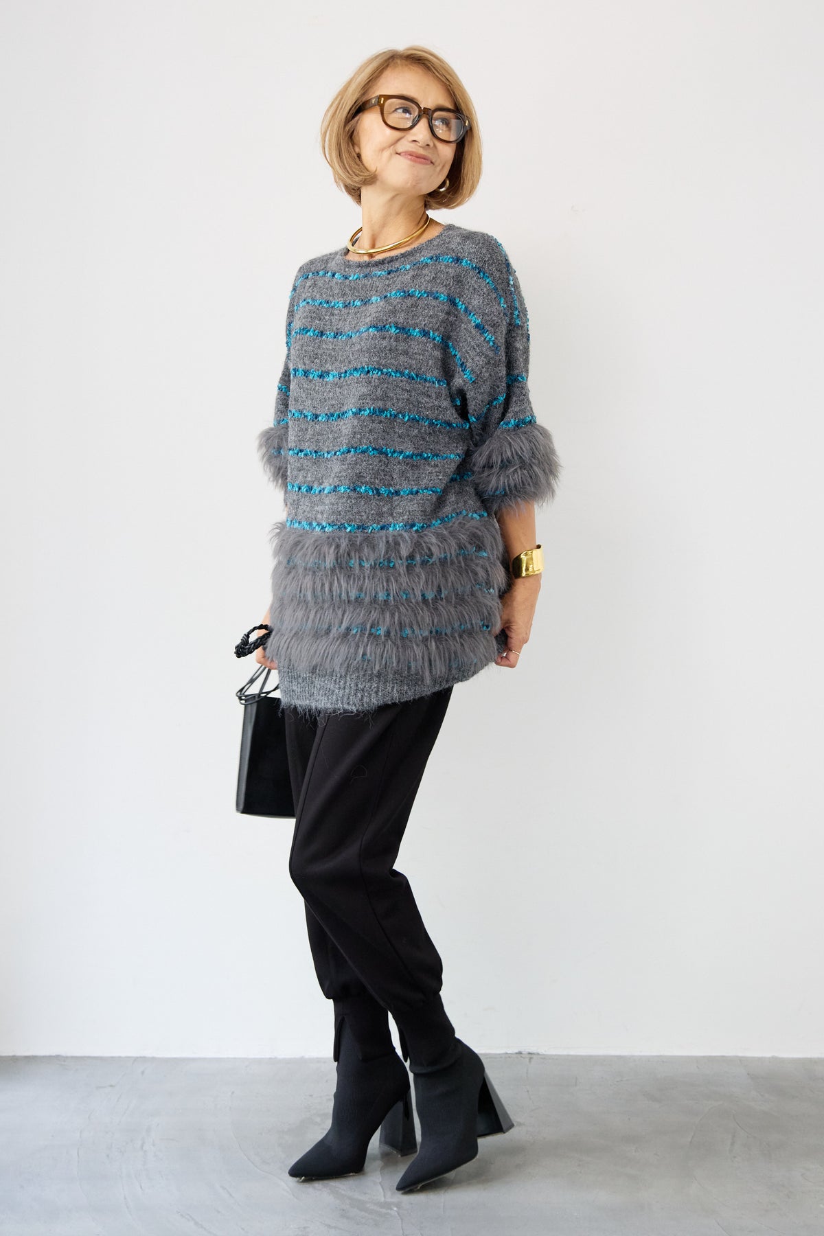 異素材の組み合わせが印象的な配色ラインシャギーニット。ふんわりとした毛足の長いシャギー素材を切り替え、立体感のあるストライプ柄に仕上げました。ゆとりのあるシルエットが体のラインを拾わず、ラフに着られるのも魅力。ボリューム感のある袖デザインがアクセントになり、一枚で主役になる存在感のあるニットです。デニムやワイドパンツと合わせて、抜け感のあるスタイリングに。