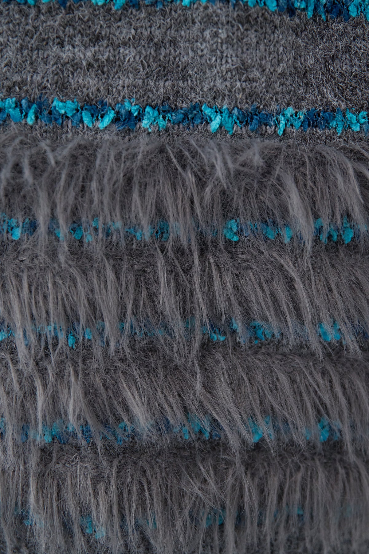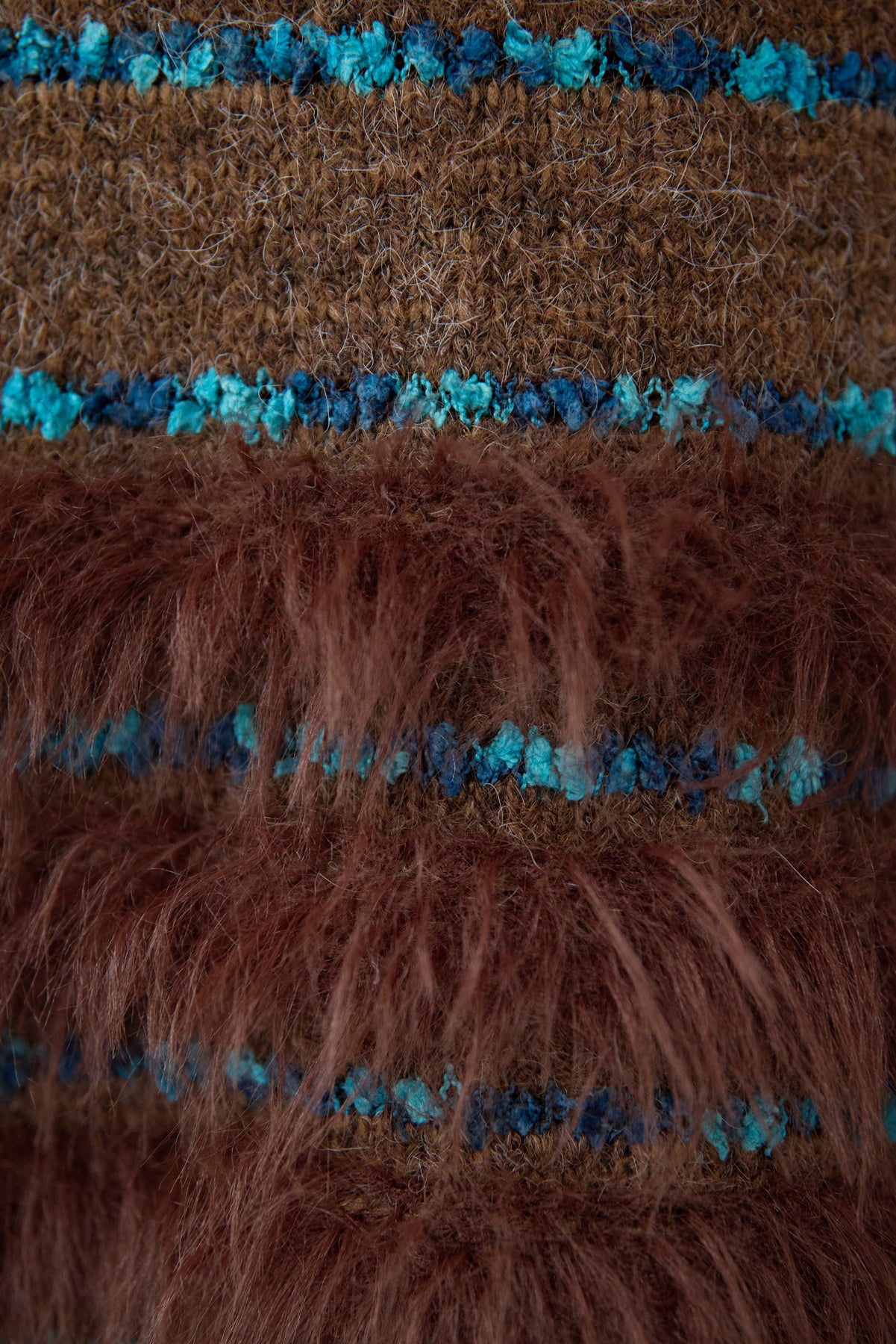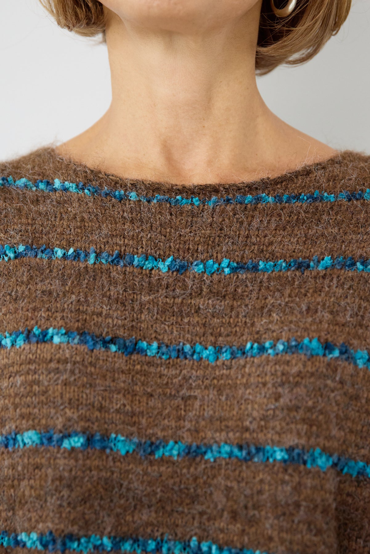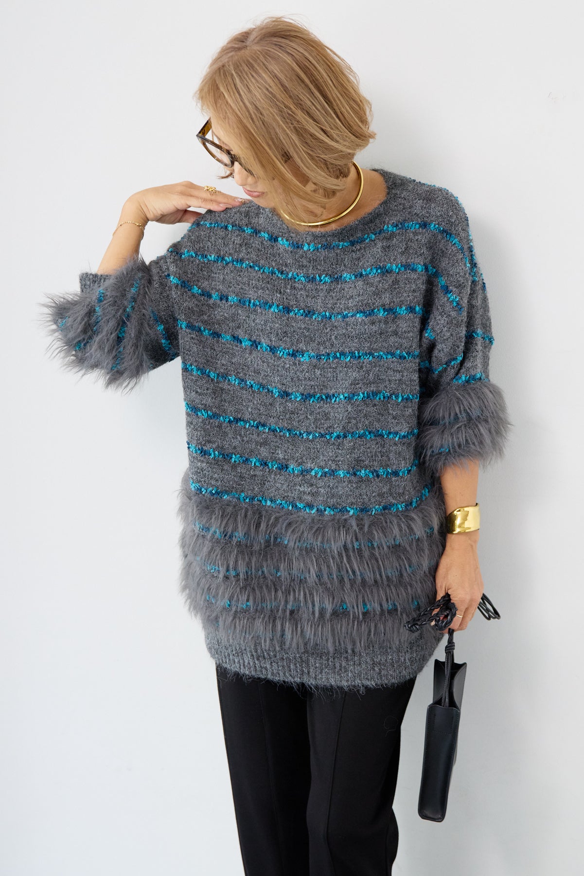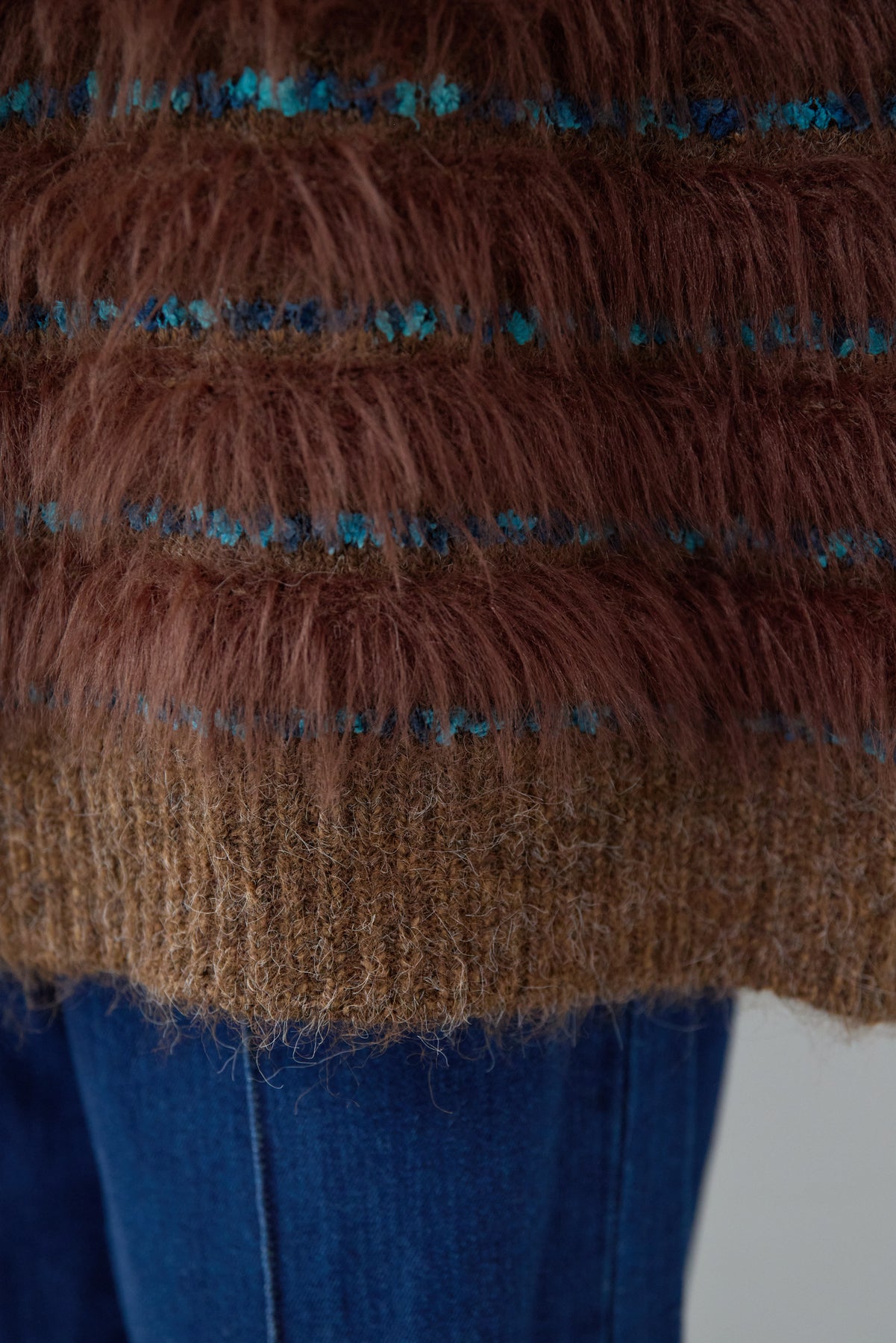 異素材の組み合わせが印象的な配色ラインシャギーニット。ふんわりとした毛足の長いシャギー素材を切り替え、立体感のあるストライプ柄に仕上げました。ゆとりのあるシルエットが体のラインを拾わず、ラフに着られるのも魅力。ボリューム感のある袖デザインがアクセントになり、一枚で主役になる存在感のあるニットです。デニムやワイドパンツと合わせて、抜け感のあるスタイリングに。