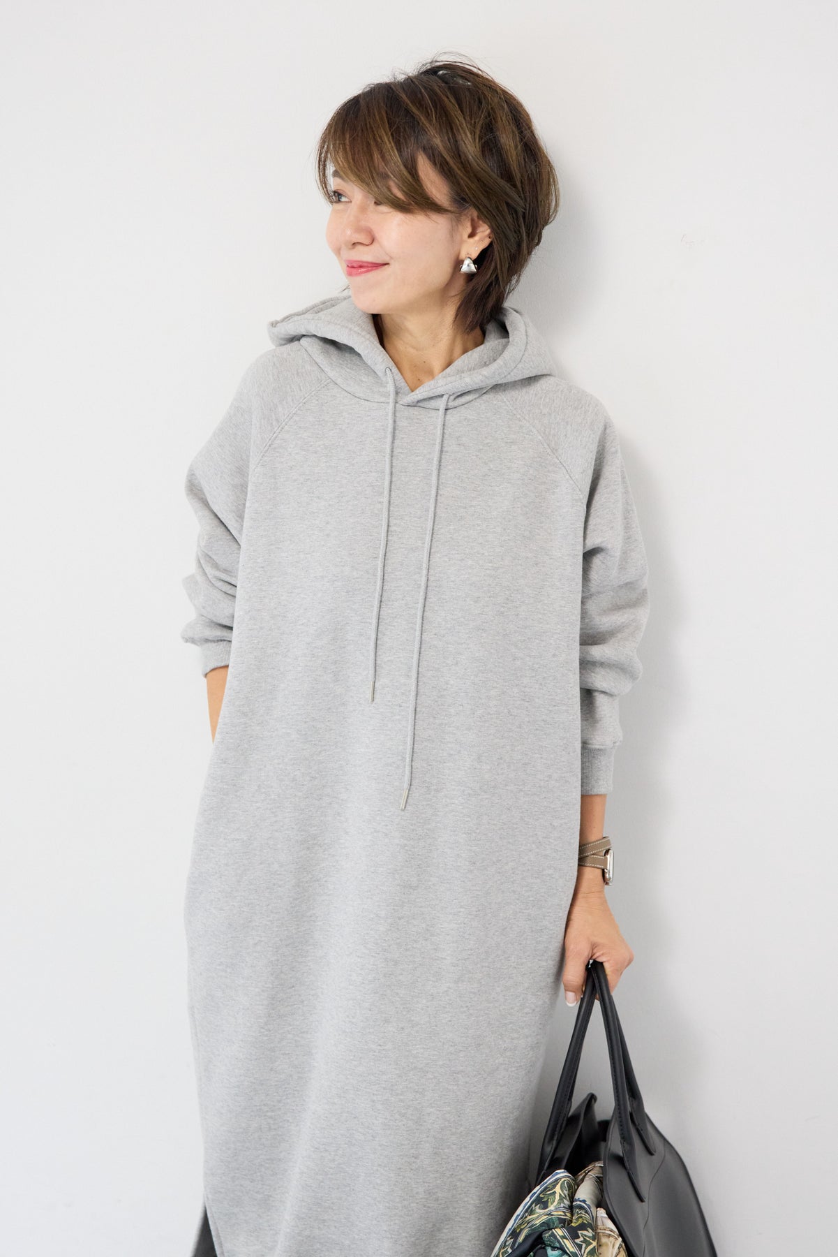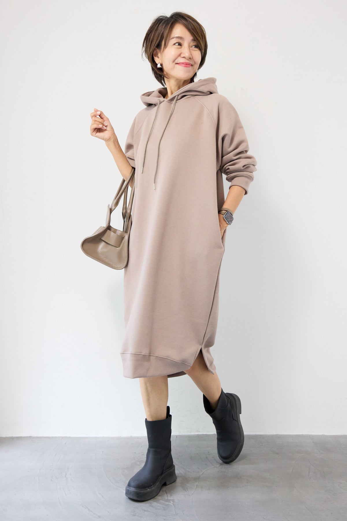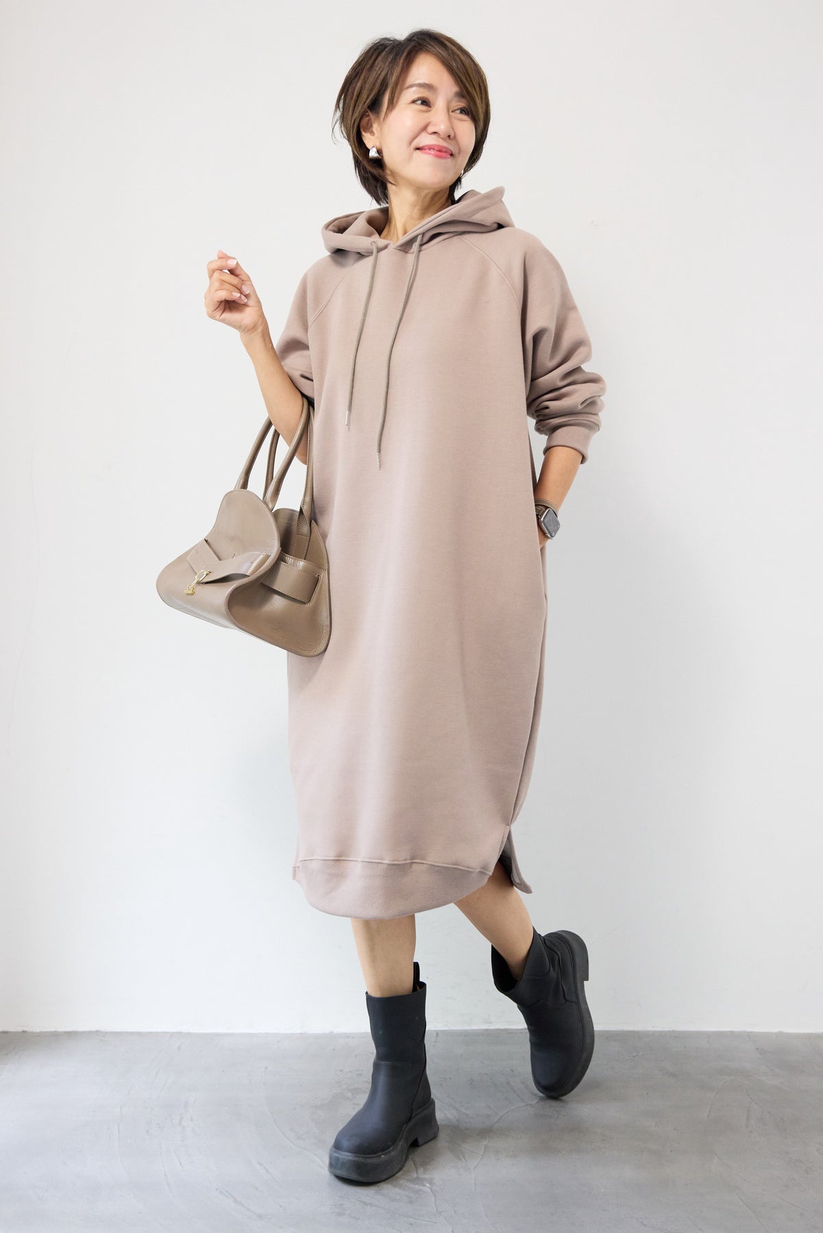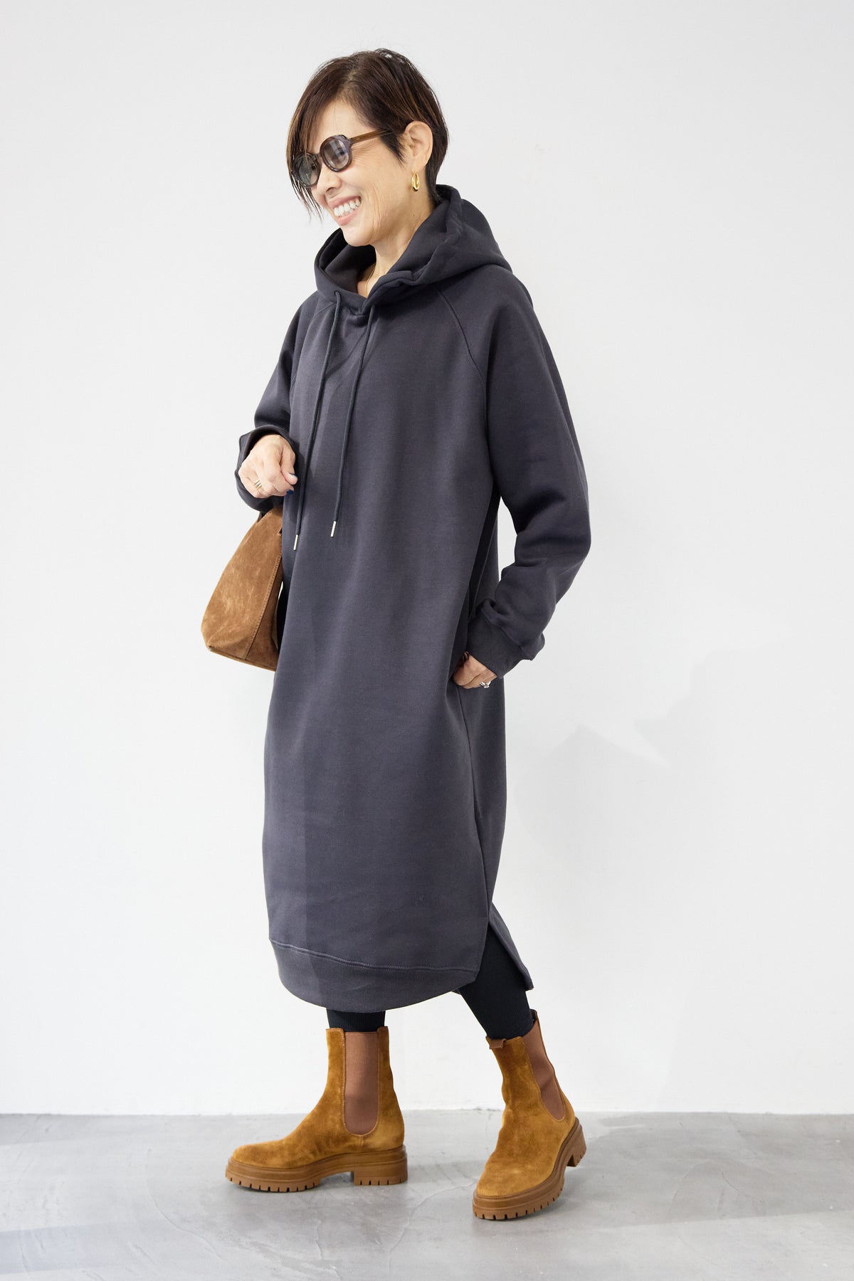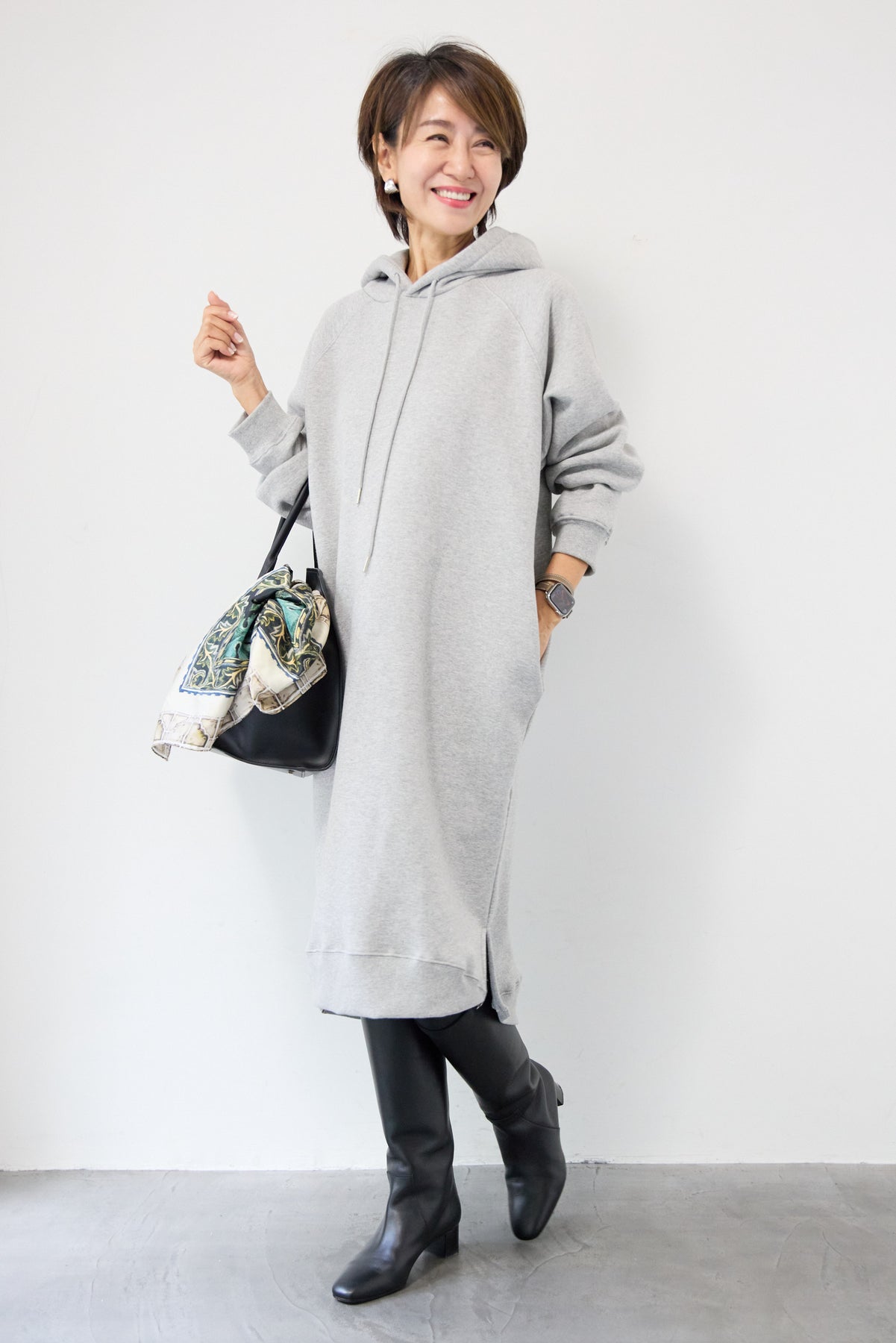リラクシーな着心地と大人の抜け感を両立した、裏起毛スウェット素材のフーディワンピース。ゆったりとしたシルエットながらも、ラグランスリーブや程よいIラインがすっきりとした印象を演出します。両サイドのスリットが軽やかな動きを生み、ロングブーツとの相性も抜群。 デイリーはもちろん、ワンマイルウェアとしても活躍する万能アイテムです。