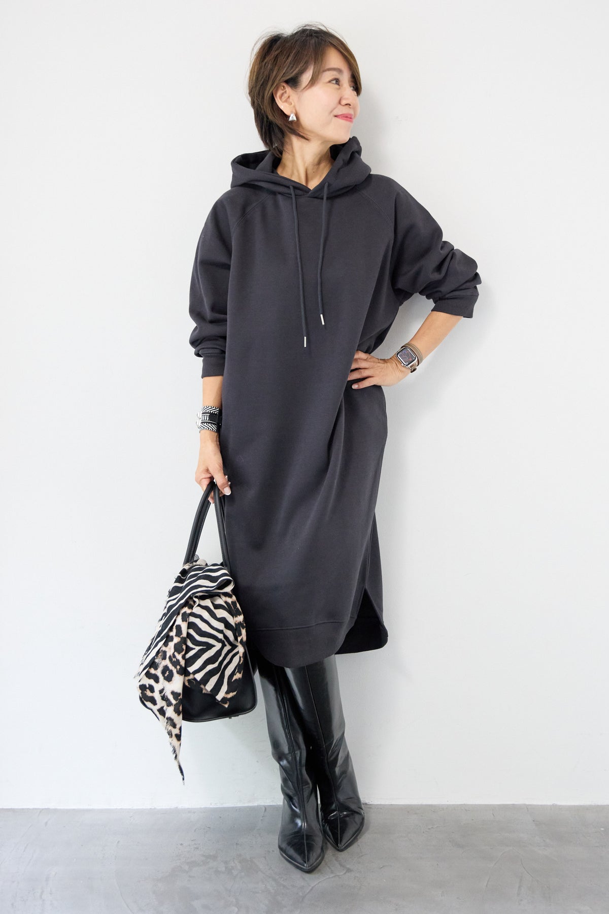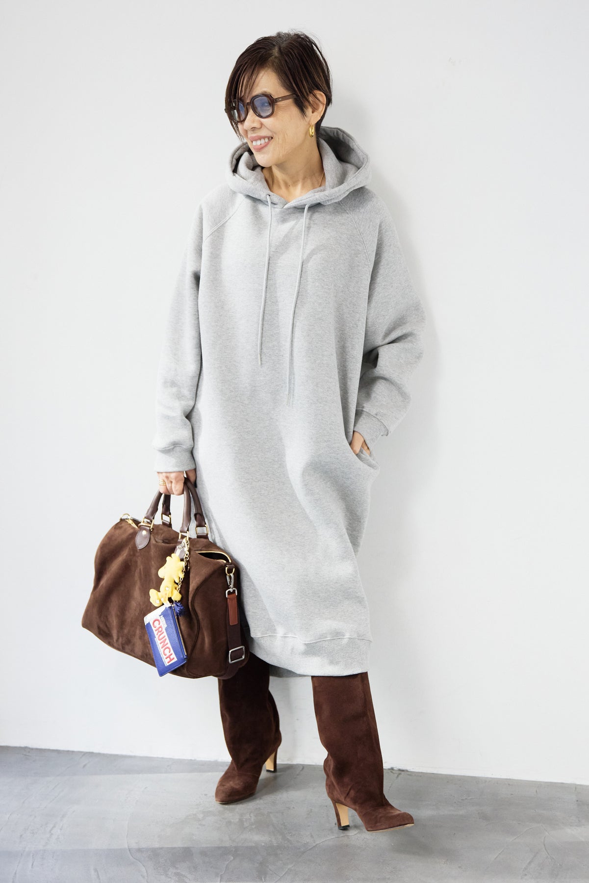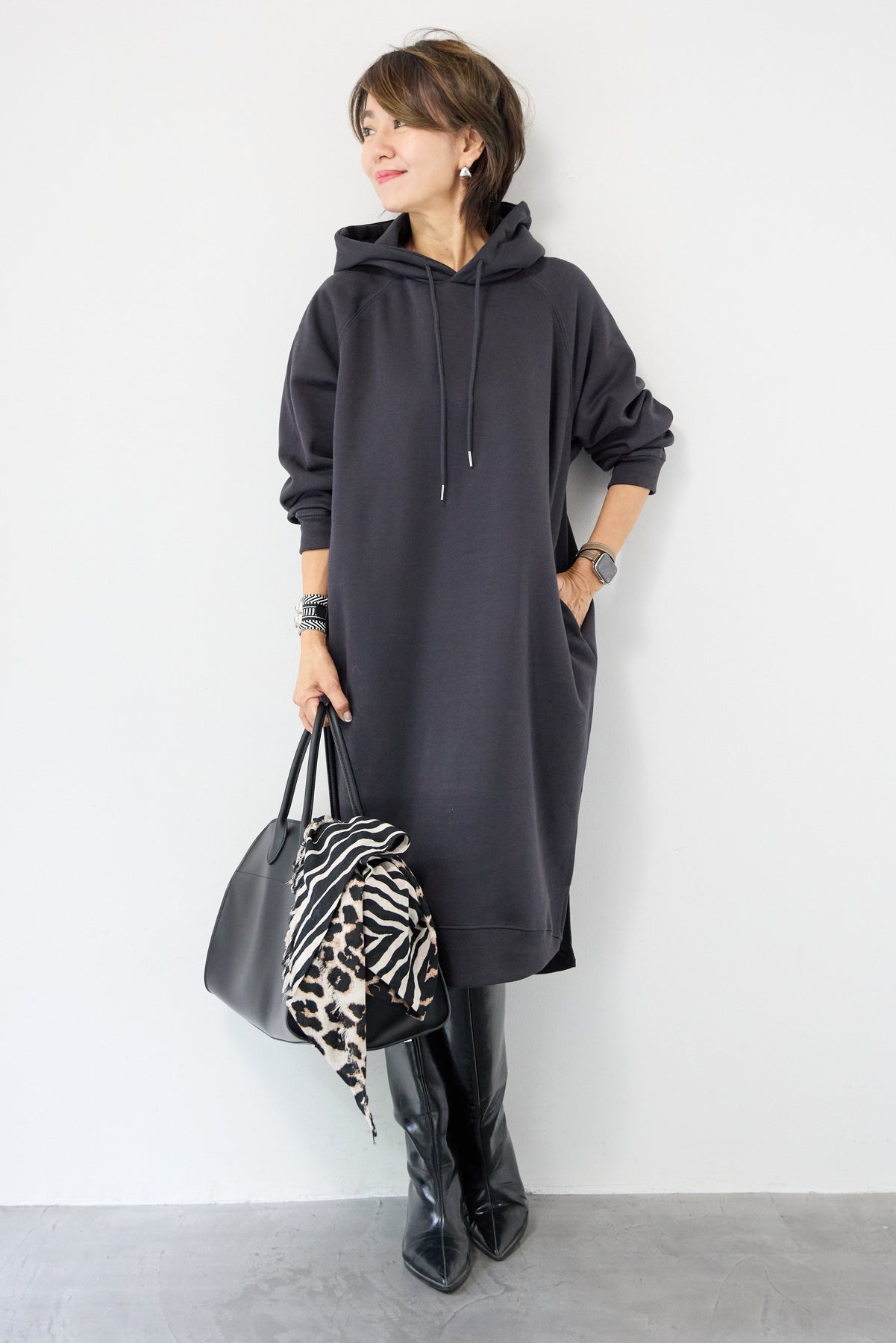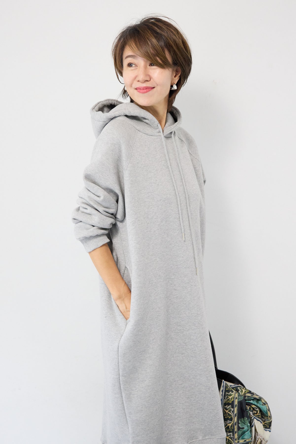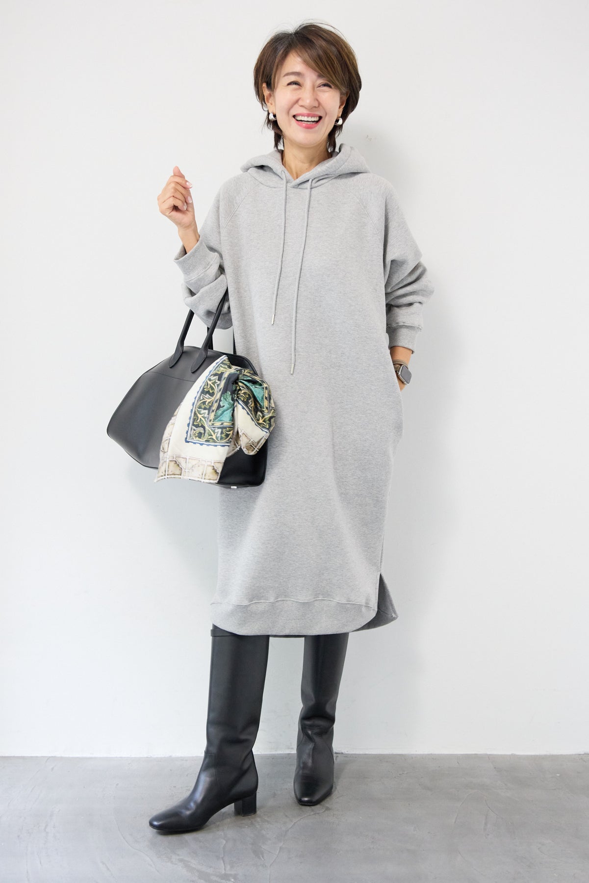 リラクシーな着心地と大人の抜け感を両立した、裏起毛スウェット素材のフーディワンピース。ゆったりとしたシルエットながらも、ラグランスリーブや程よいIラインがすっきりとした印象を演出します。両サイドのスリットが軽やかな動きを生み、ロングブーツとの相性も抜群。 デイリーはもちろん、ワンマイルウェアとしても活躍する万能アイテムです。