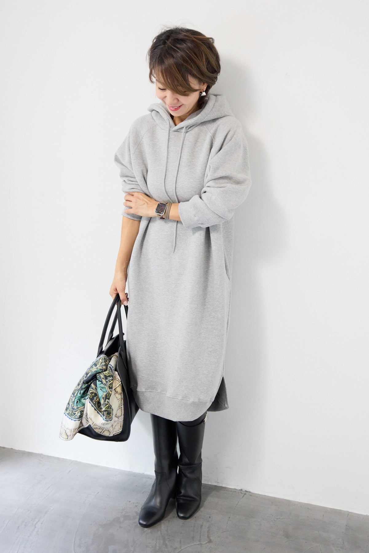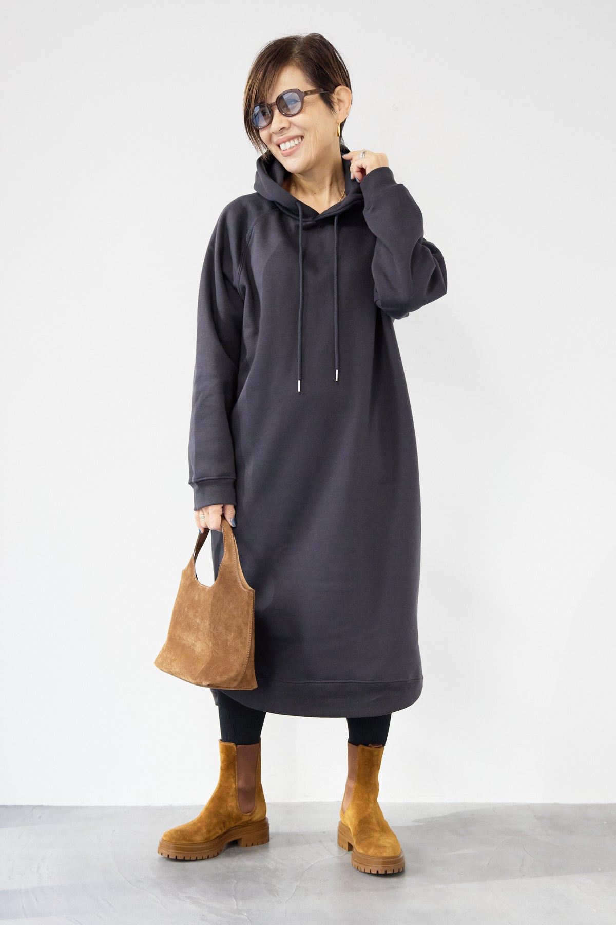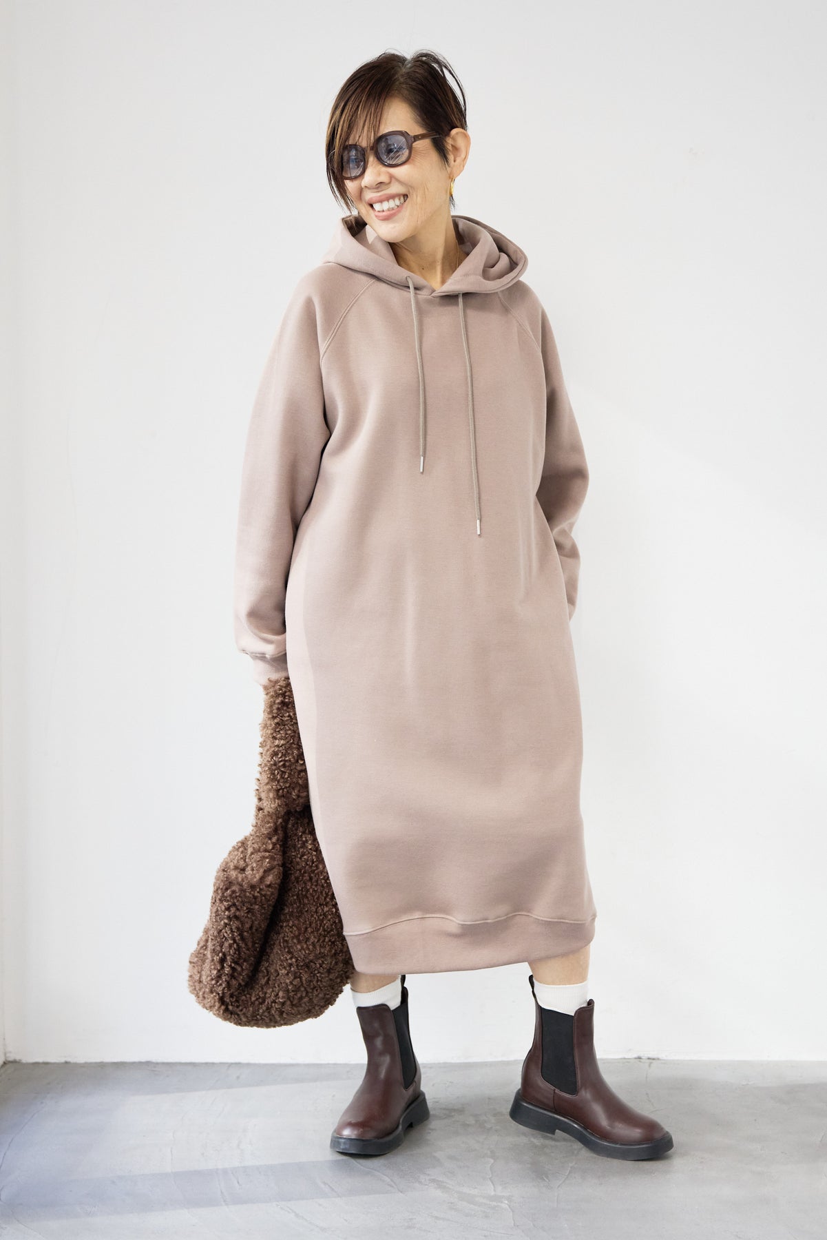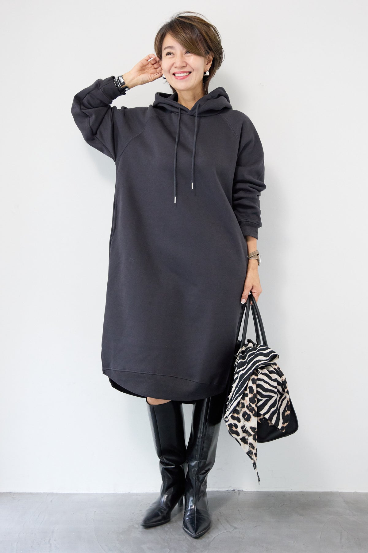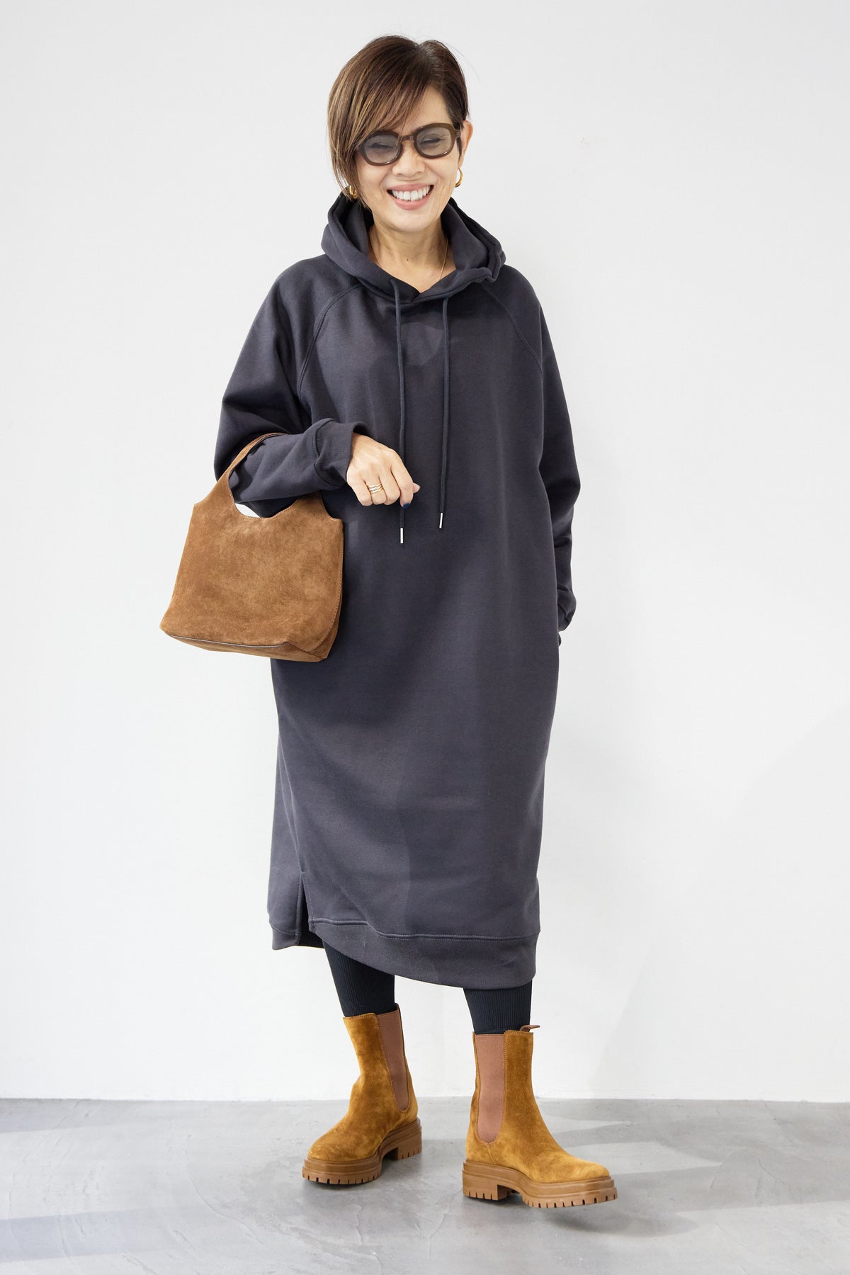 リラクシーな着心地と大人の抜け感を両立した、裏起毛スウェット素材のフーディワンピース。ゆったりとしたシルエットながらも、ラグランスリーブや程よいIラインがすっきりとした印象を演出します。両サイドのスリットが軽やかな動きを生み、ロングブーツとの相性も抜群。 デイリーはもちろん、ワンマイルウェアとしても活躍する万能アイテムです。