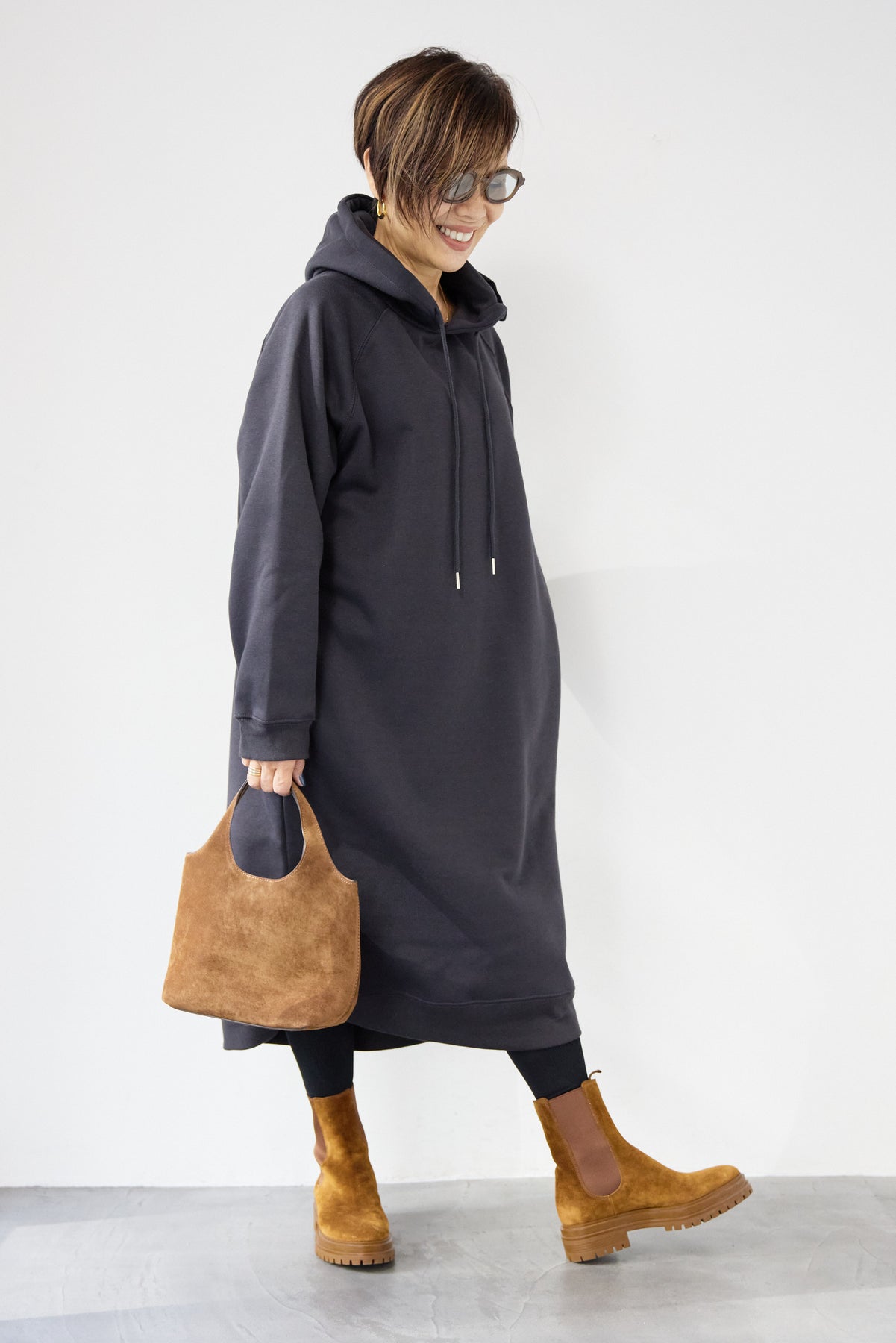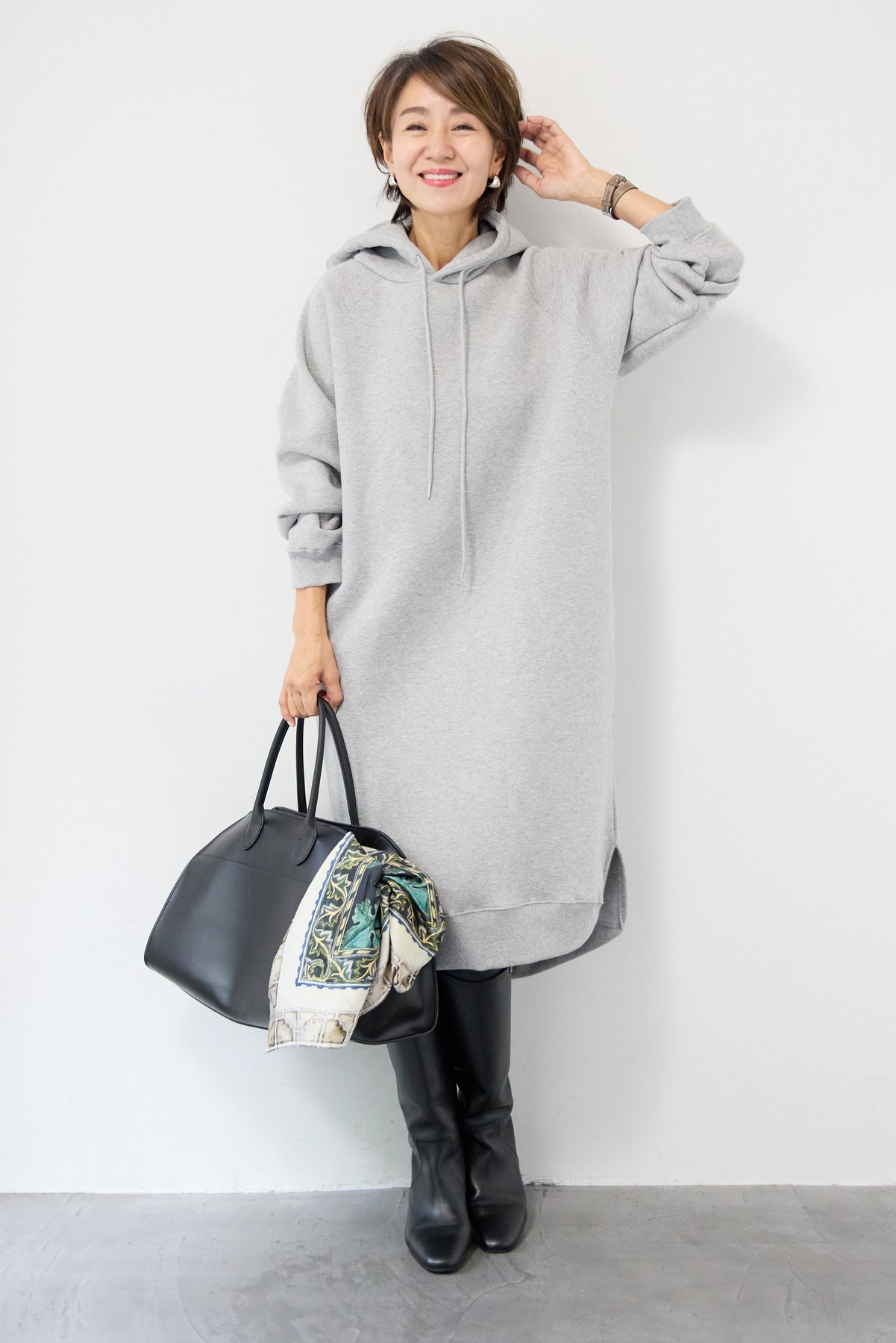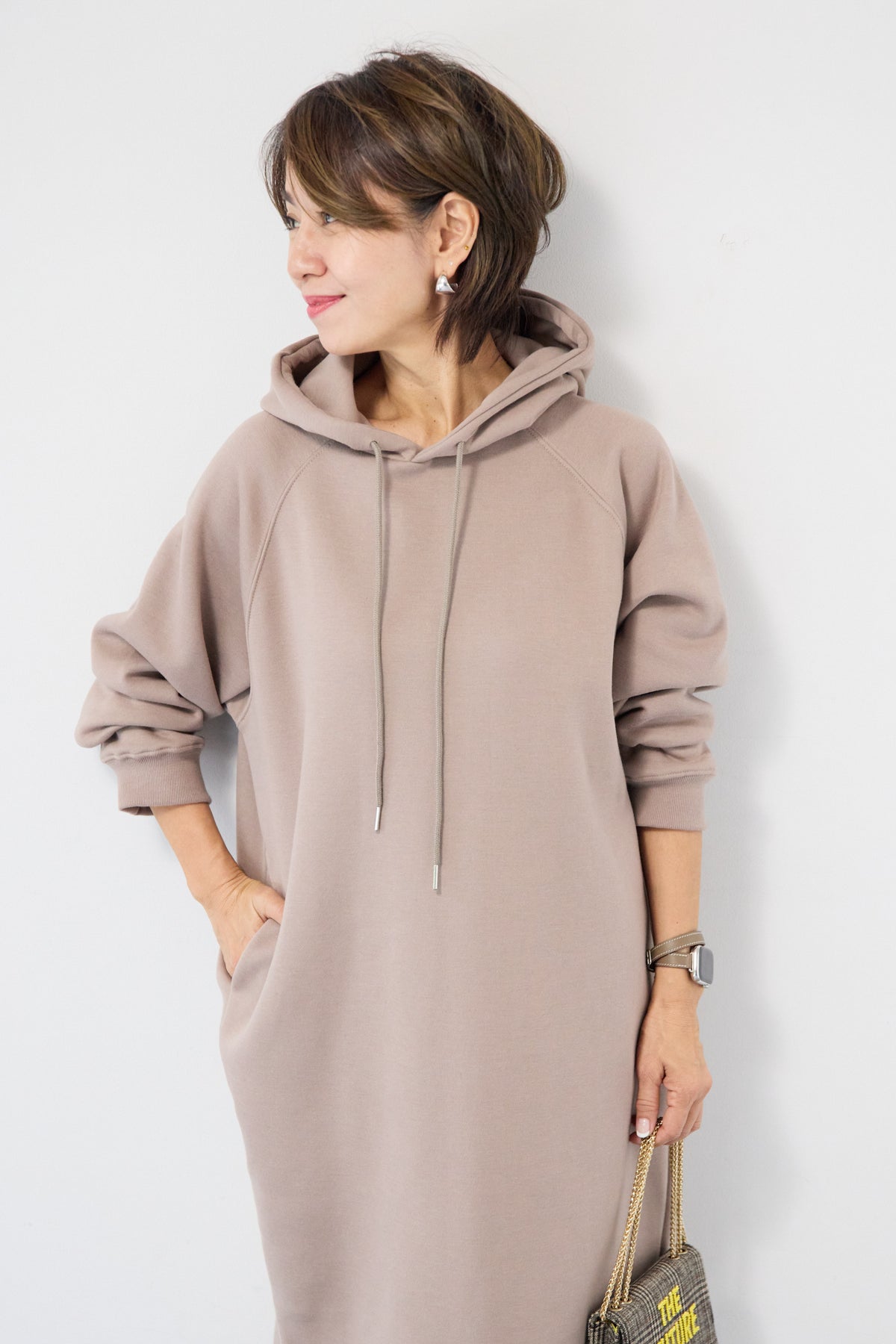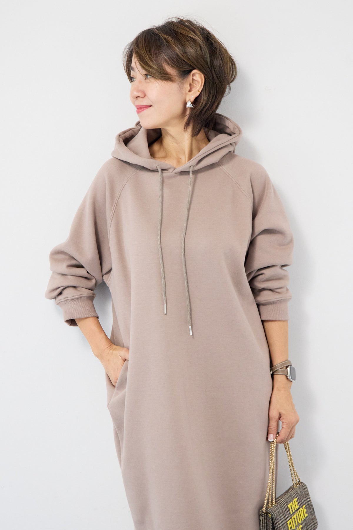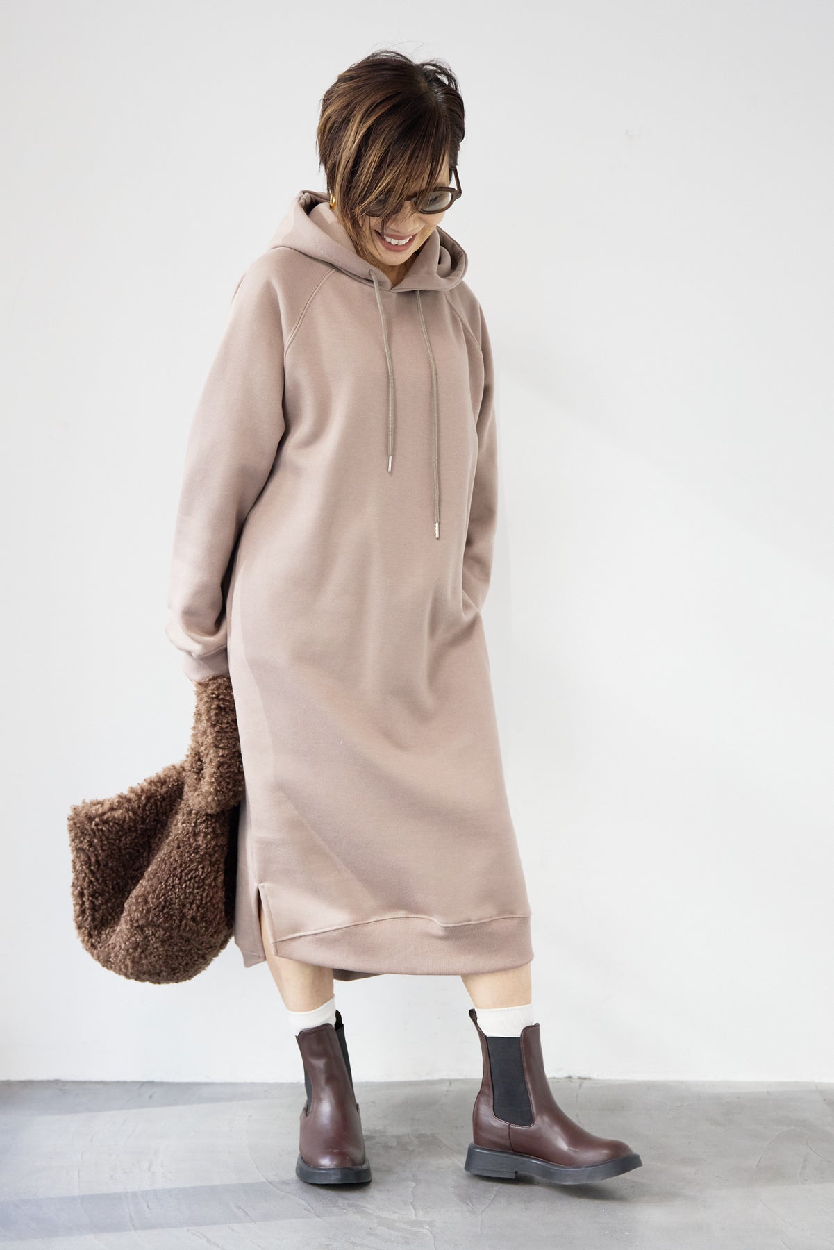 リラクシーな着心地と大人の抜け感を両立した、裏起毛スウェット素材のフーディワンピース。ゆったりとしたシルエットながらも、ラグランスリーブや程よいIラインがすっきりとした印象を演出します。両サイドのスリットが軽やかな動きを生み、ロングブーツとの相性も抜群。 デイリーはもちろん、ワンマイルウェアとしても活躍する万能アイテムです。