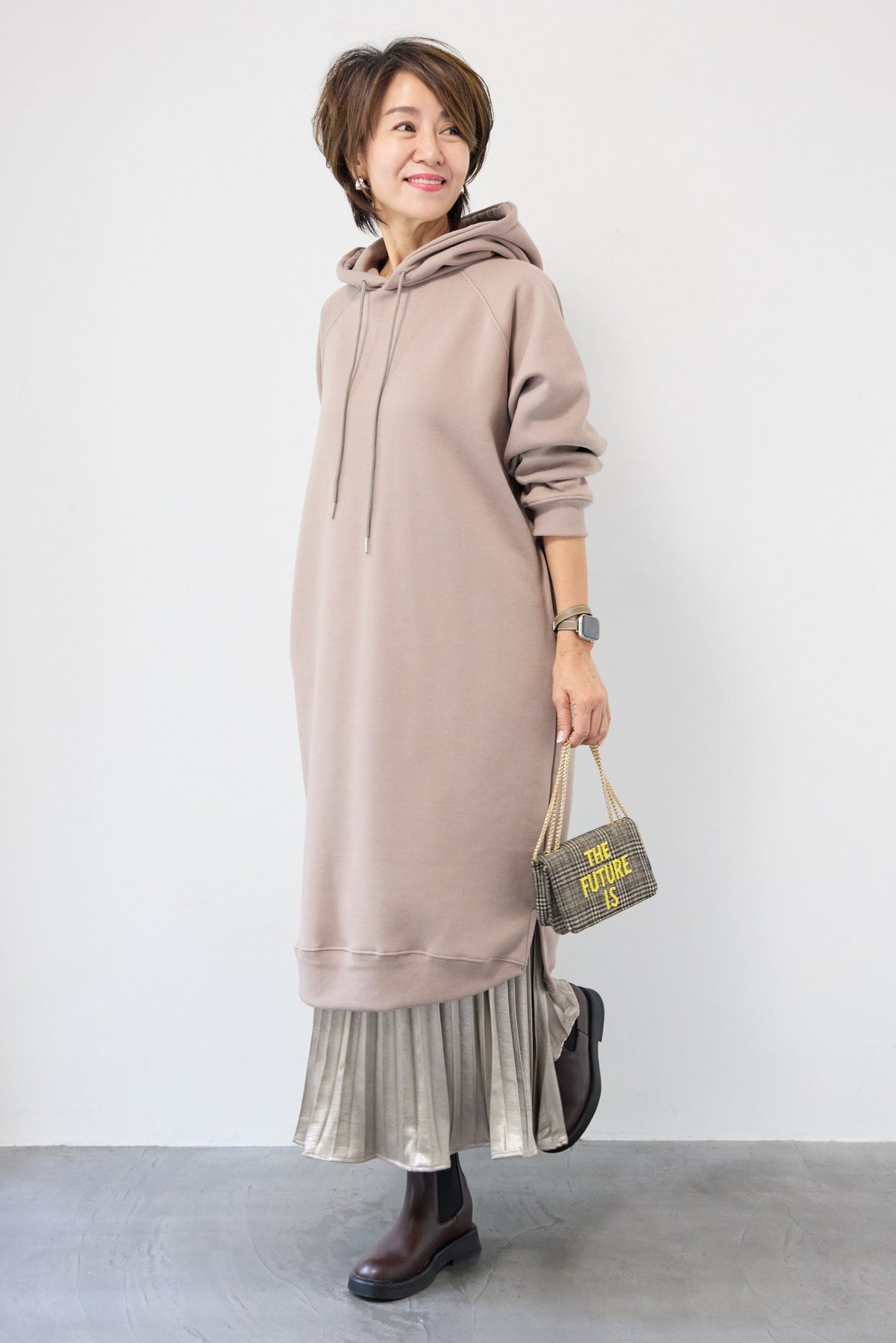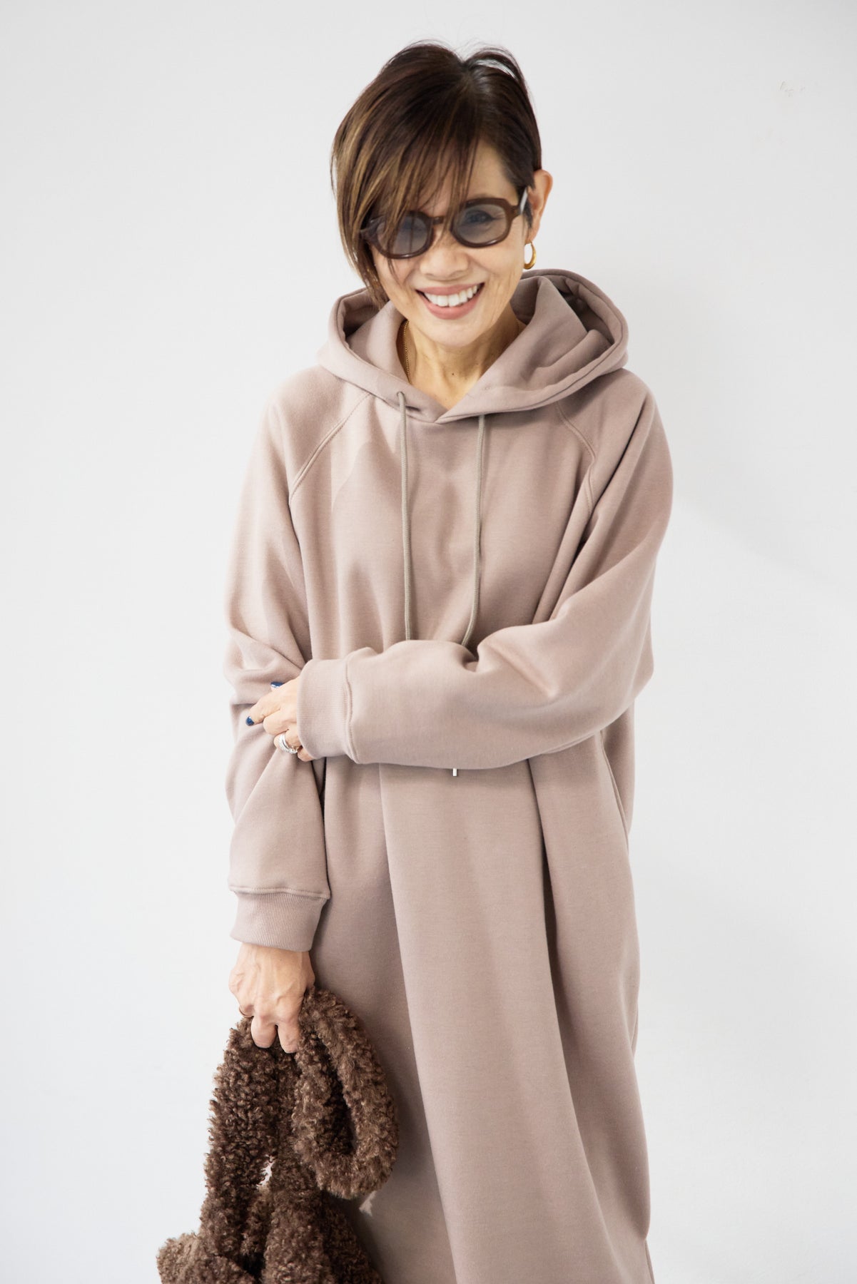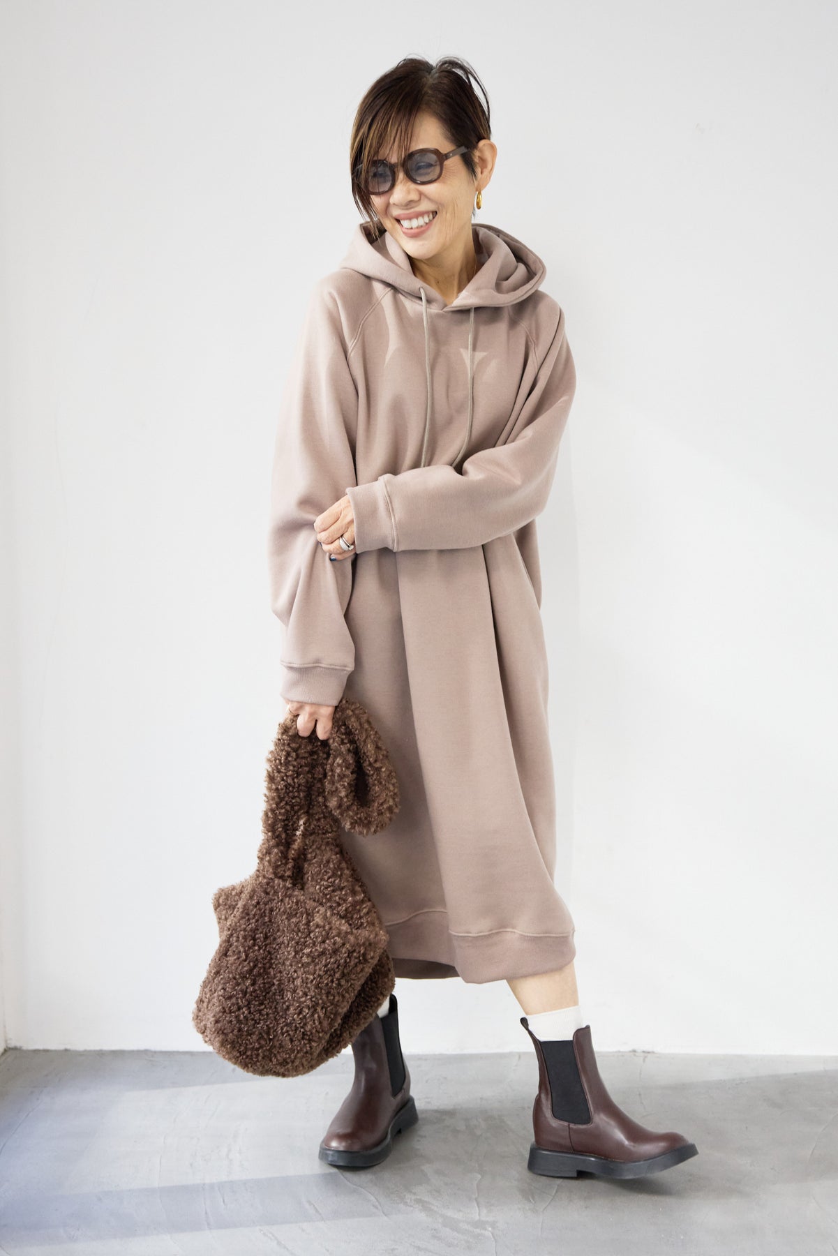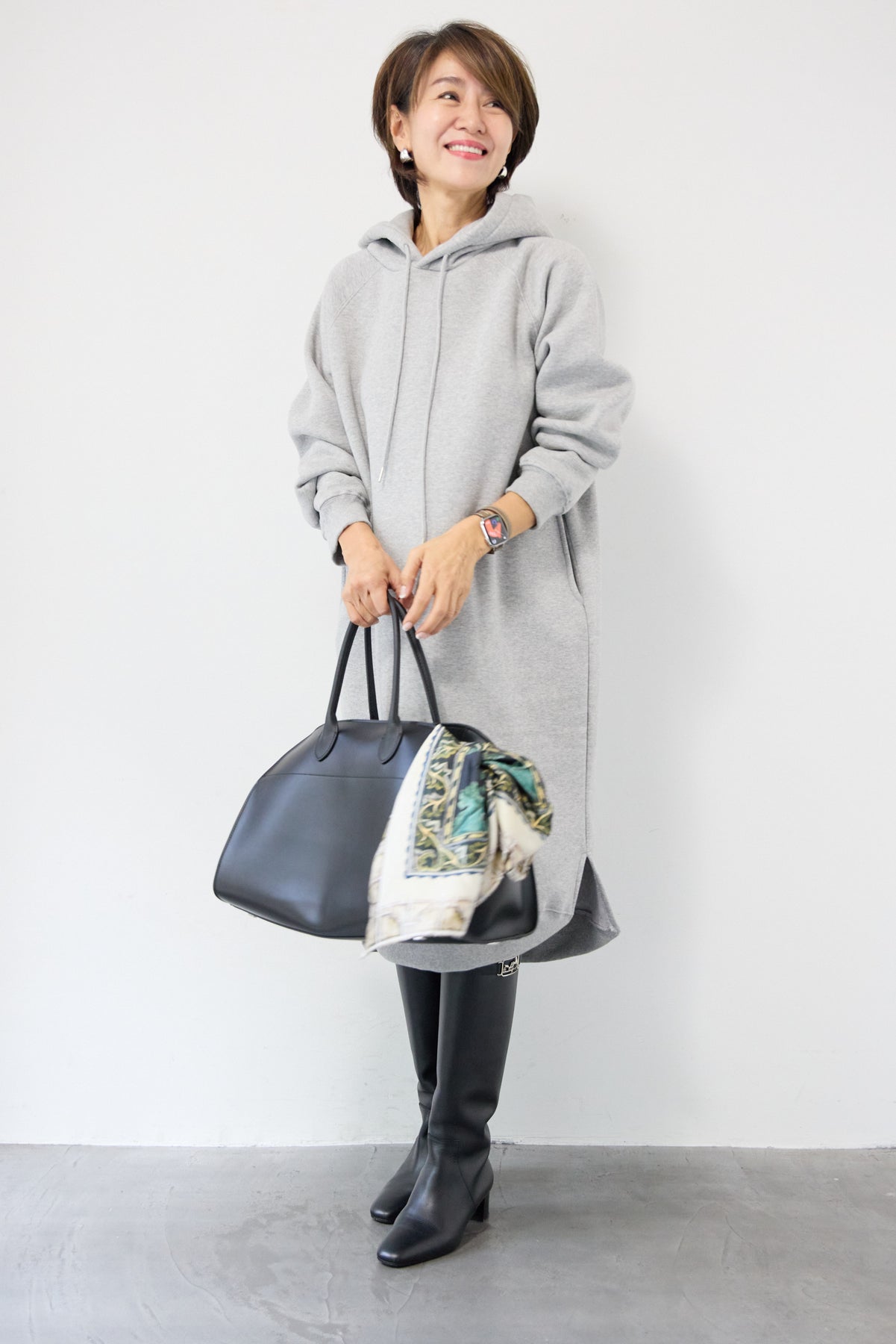 リラクシーな着心地と大人の抜け感を両立した、裏起毛スウェット素材のフーディワンピース。ゆったりとしたシルエットながらも、ラグランスリーブや程よいIラインがすっきりとした印象を演出します。両サイドのスリットが軽やかな動きを生み、ロングブーツとの相性も抜群。 デイリーはもちろん、ワンマイルウェアとしても活躍する万能アイテムです。