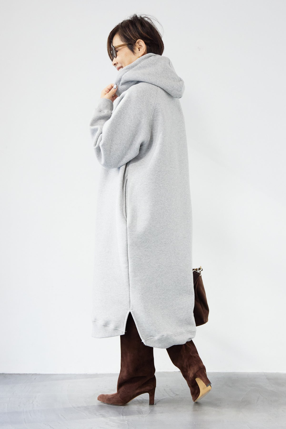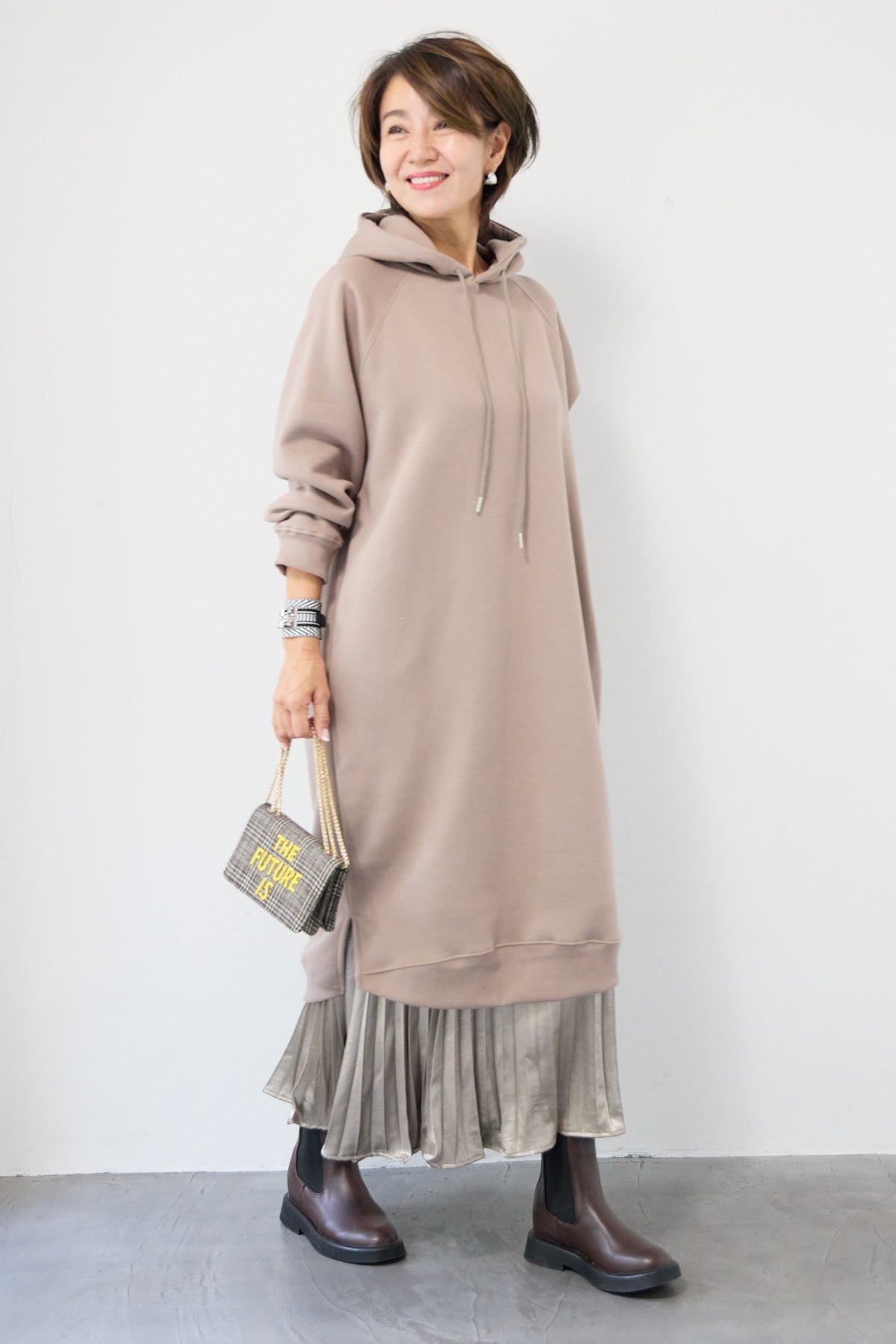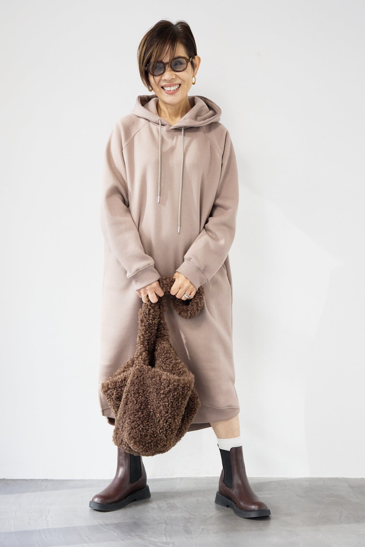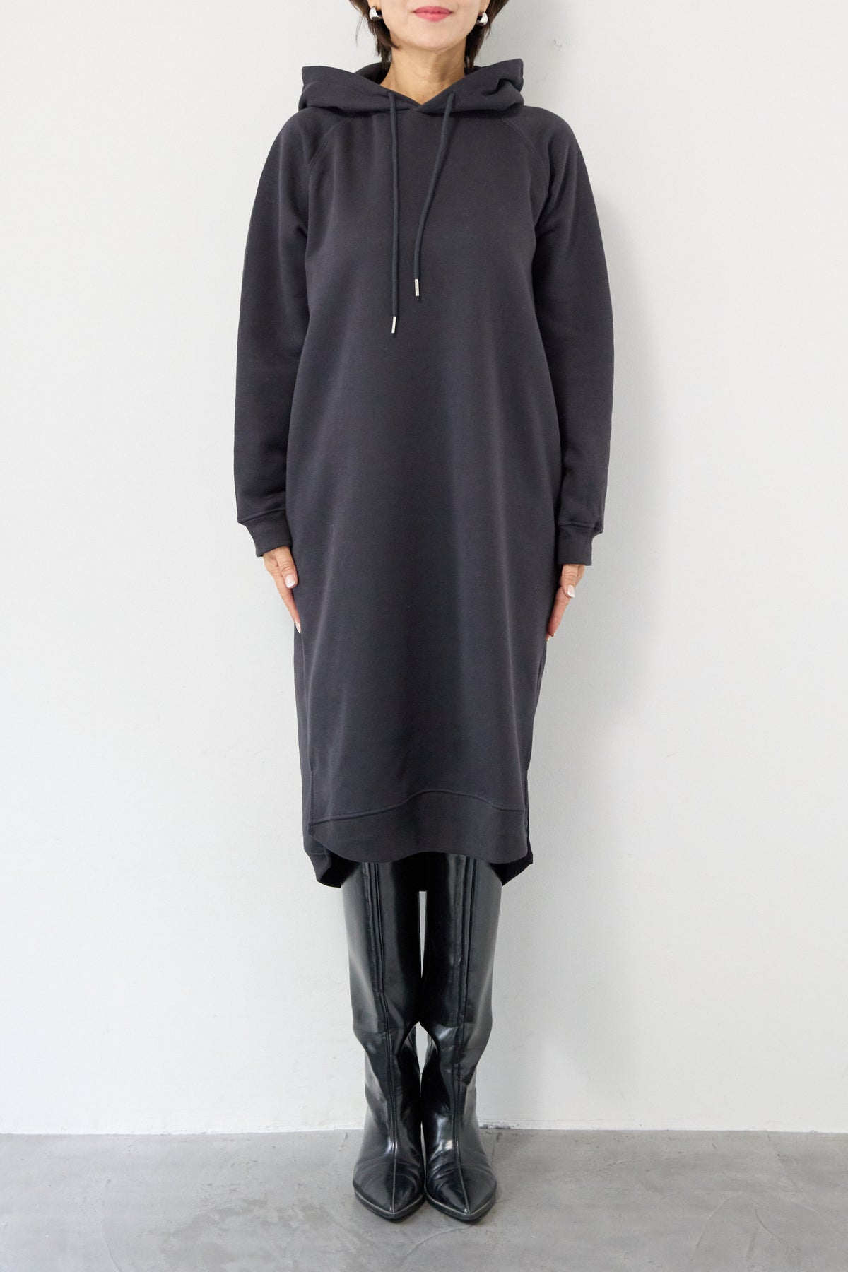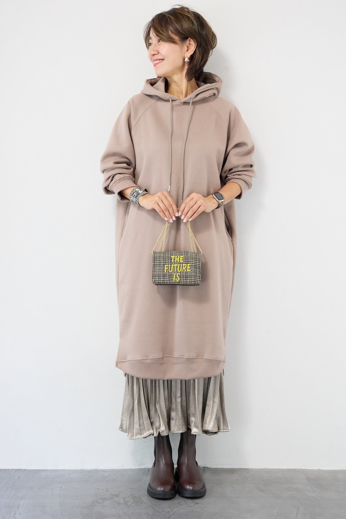 リラクシーな着心地と大人の抜け感を両立した、裏起毛スウェット素材のフーディワンピース。ゆったりとしたシルエットながらも、ラグランスリーブや程よいIラインがすっきりとした印象を演出します。両サイドのスリットが軽やかな動きを生み、ロングブーツとの相性も抜群。 デイリーはもちろん、ワンマイルウェアとしても活躍する万能アイテムです。