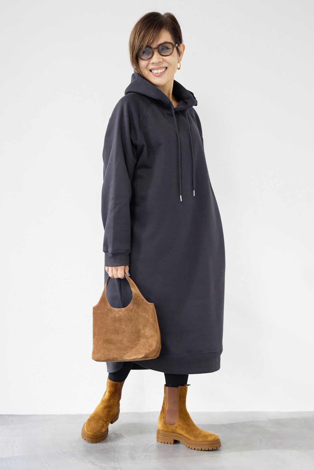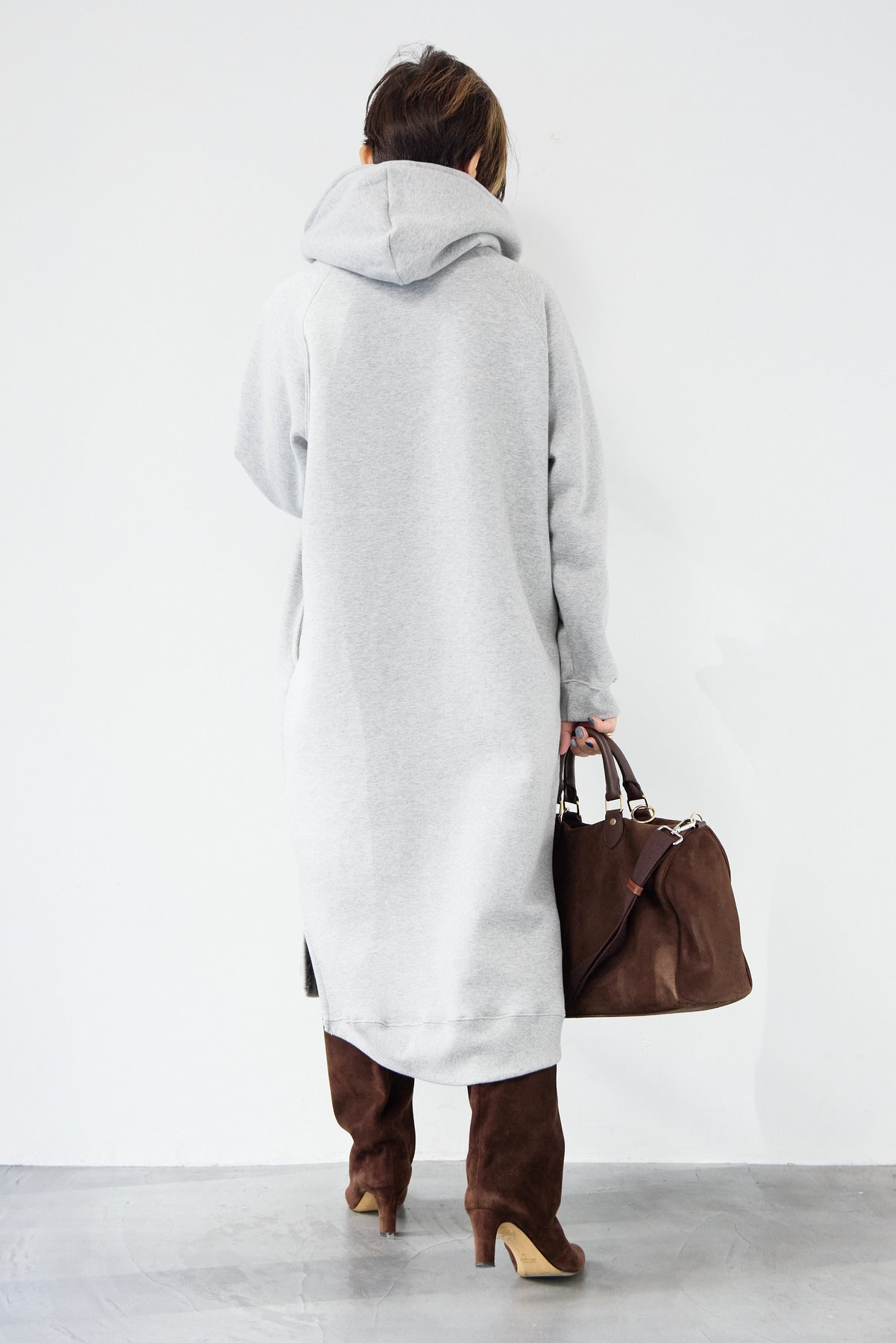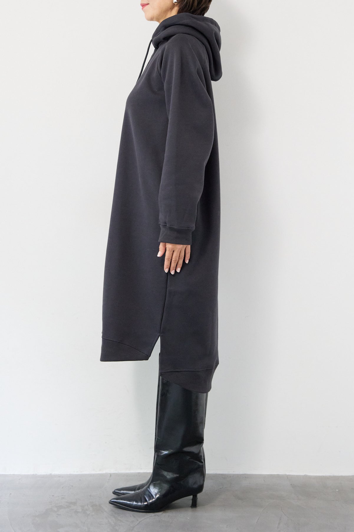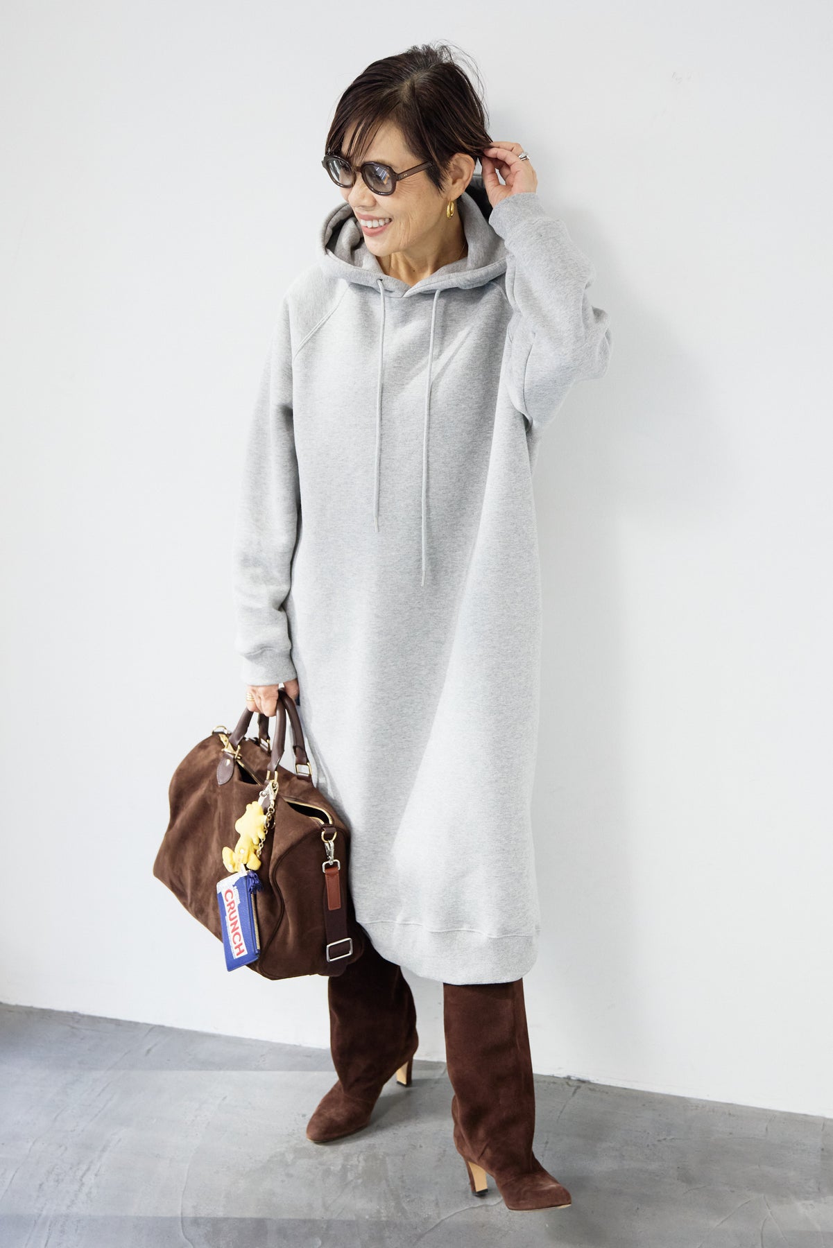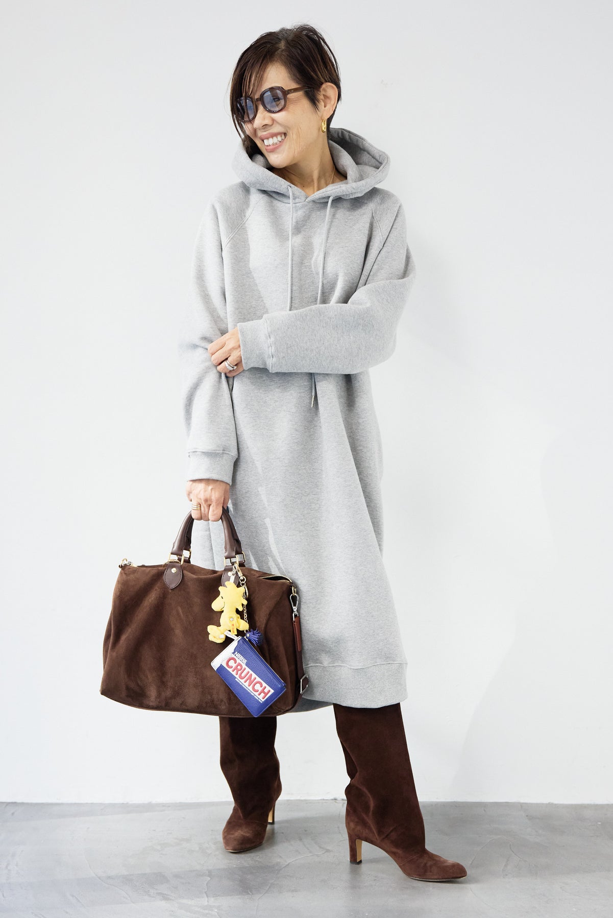 リラクシーな着心地と大人の抜け感を両立した、裏起毛スウェット素材のフーディワンピース。ゆったりとしたシルエットながらも、ラグランスリーブや程よいIラインがすっきりとした印象を演出します。両サイドのスリットが軽やかな動きを生み、ロングブーツとの相性も抜群。 デイリーはもちろん、ワンマイルウェアとしても活躍する万能アイテムです。