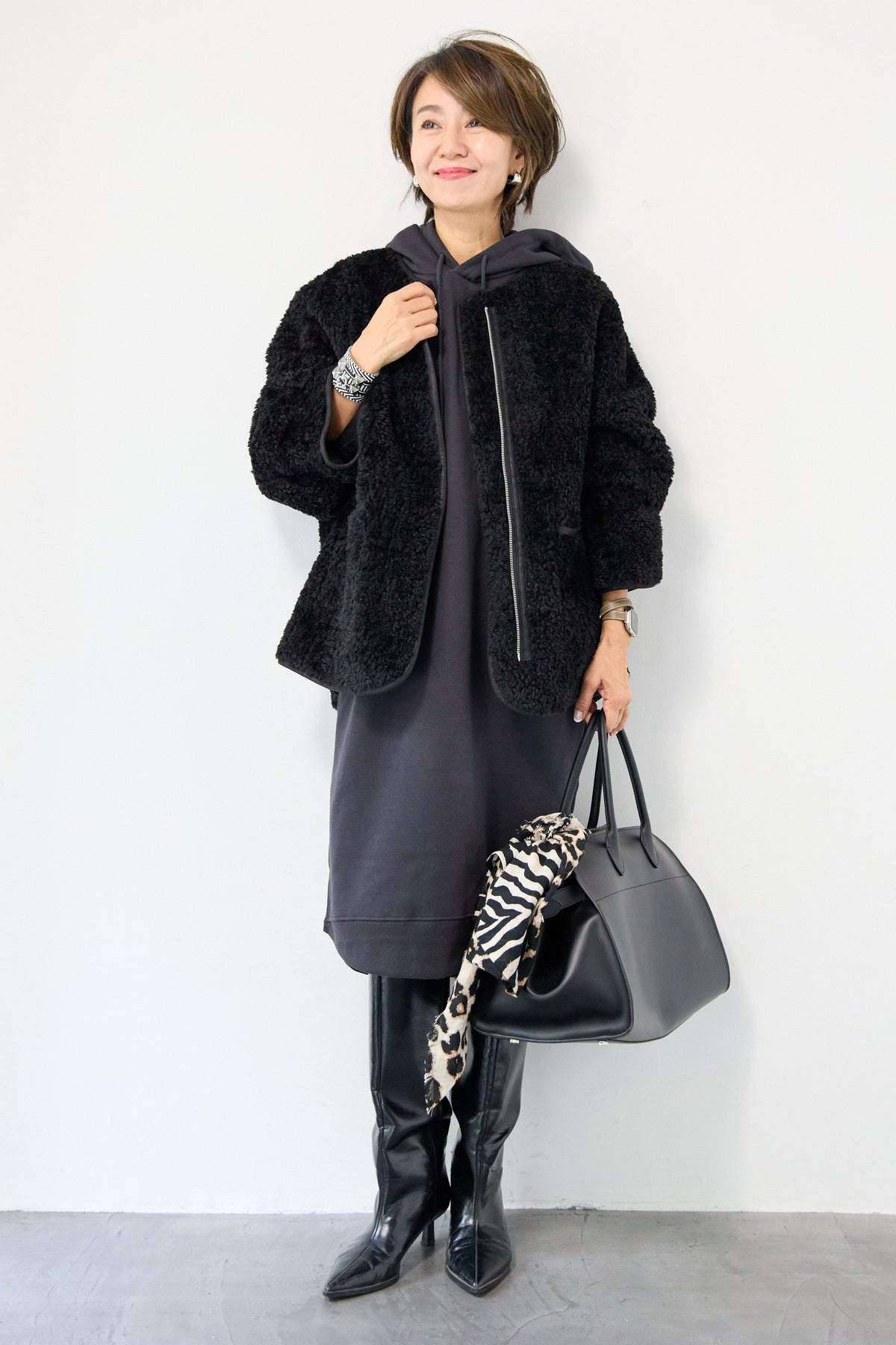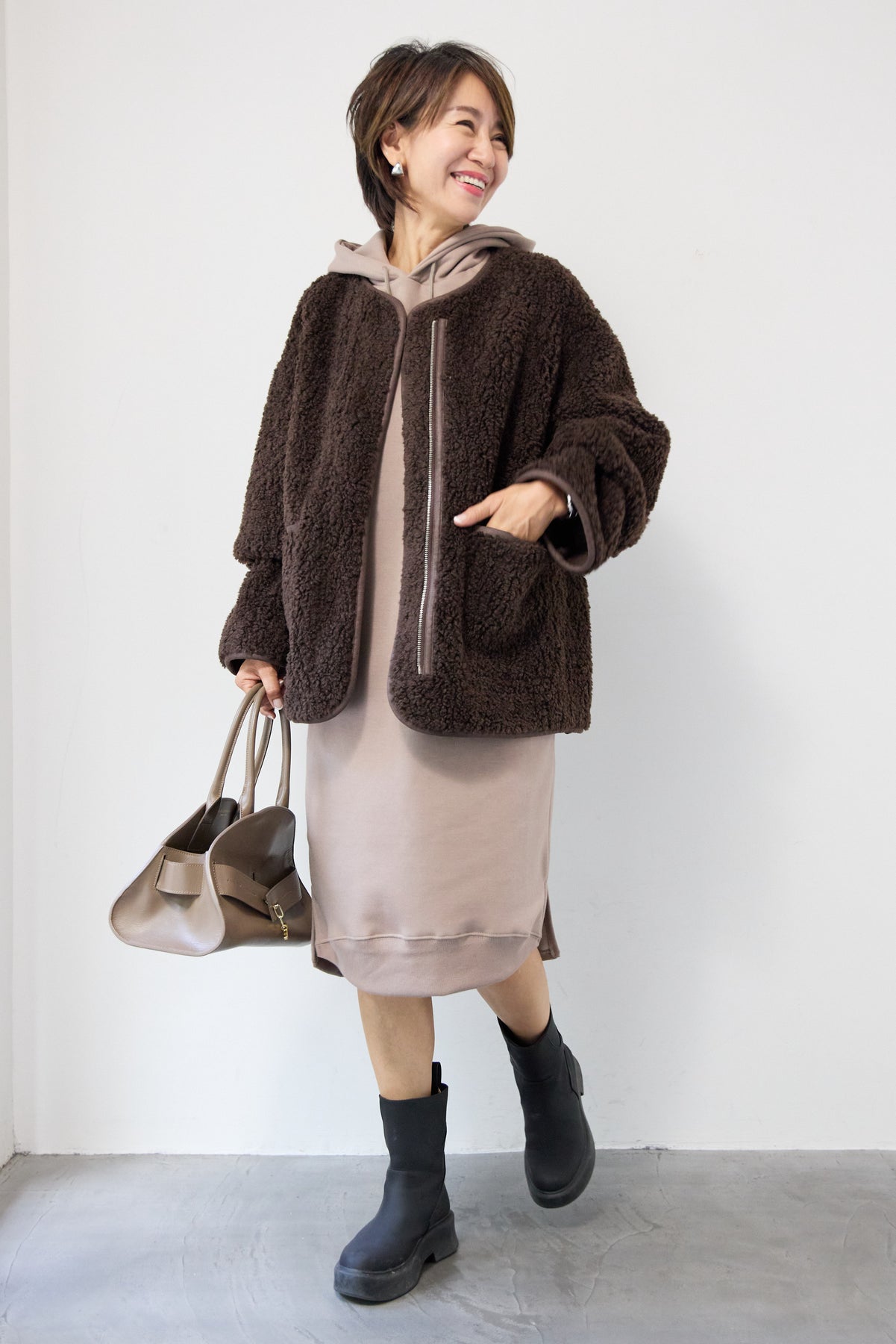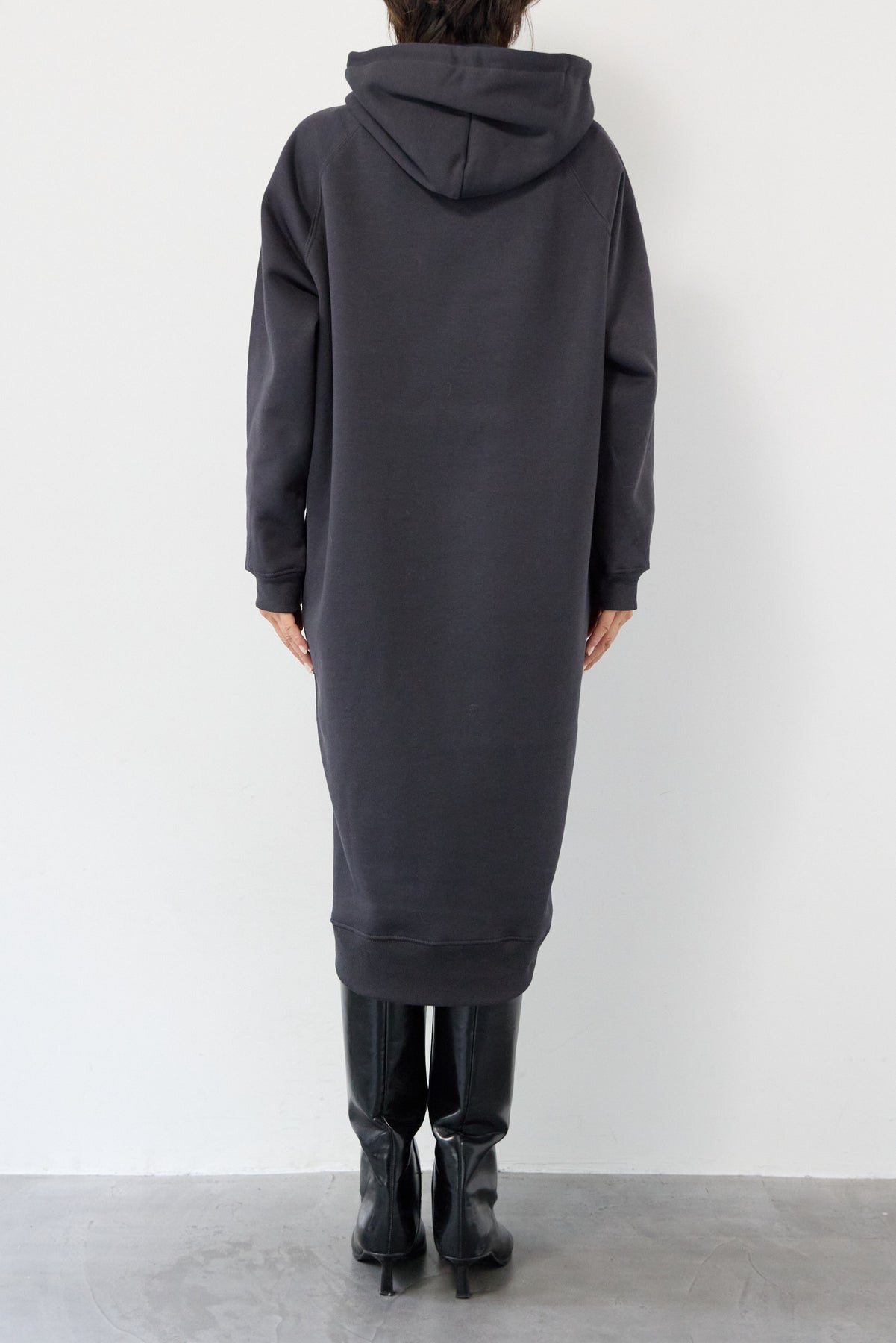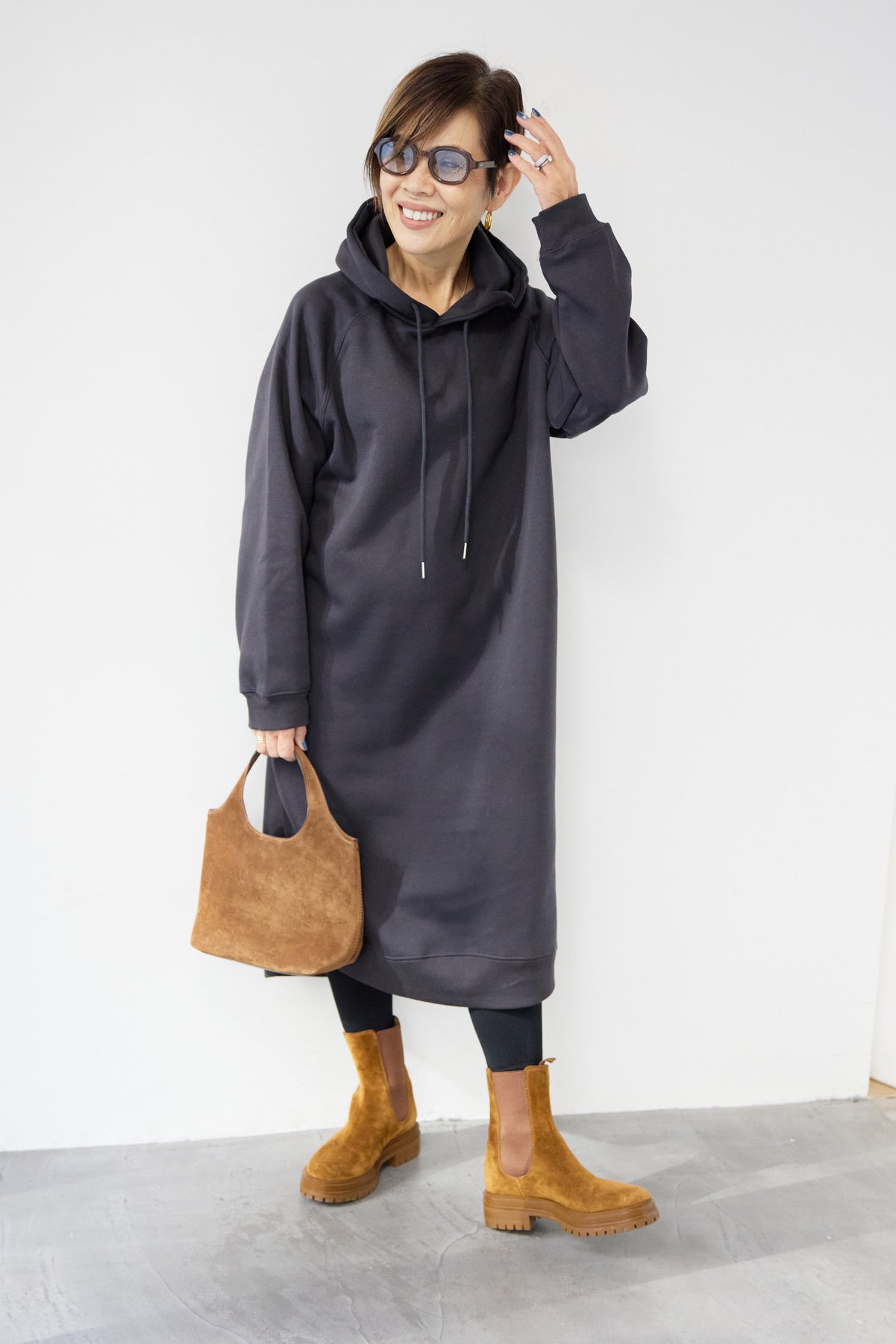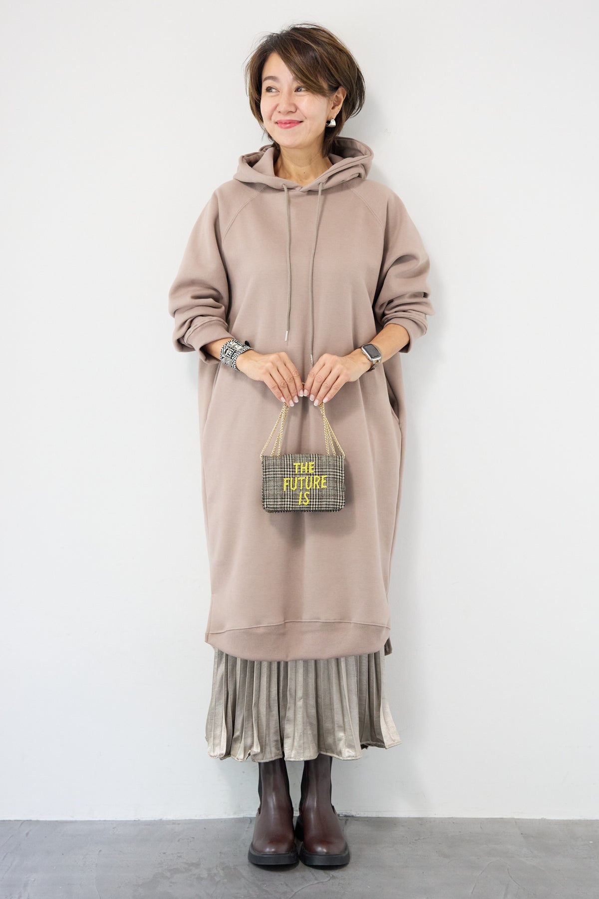 リラクシーな着心地と大人の抜け感を両立した、裏起毛スウェット素材のフーディワンピース。ゆったりとしたシルエットながらも、ラグランスリーブや程よいIラインがすっきりとした印象を演出します。両サイドのスリットが軽やかな動きを生み、ロングブーツとの相性も抜群。 デイリーはもちろん、ワンマイルウェアとしても活躍する万能アイテムです。