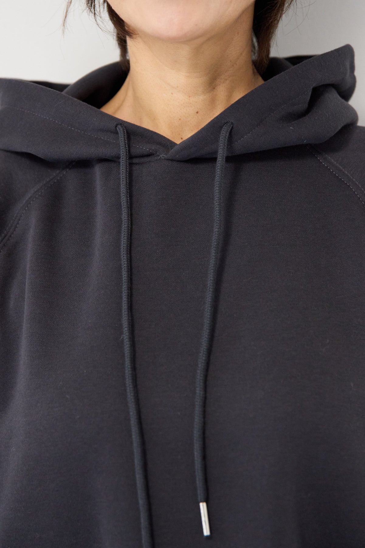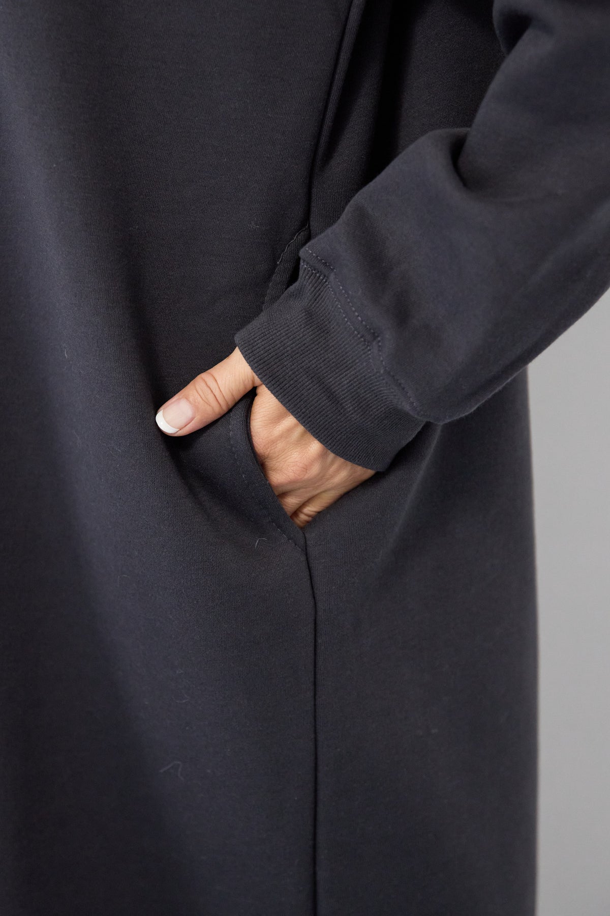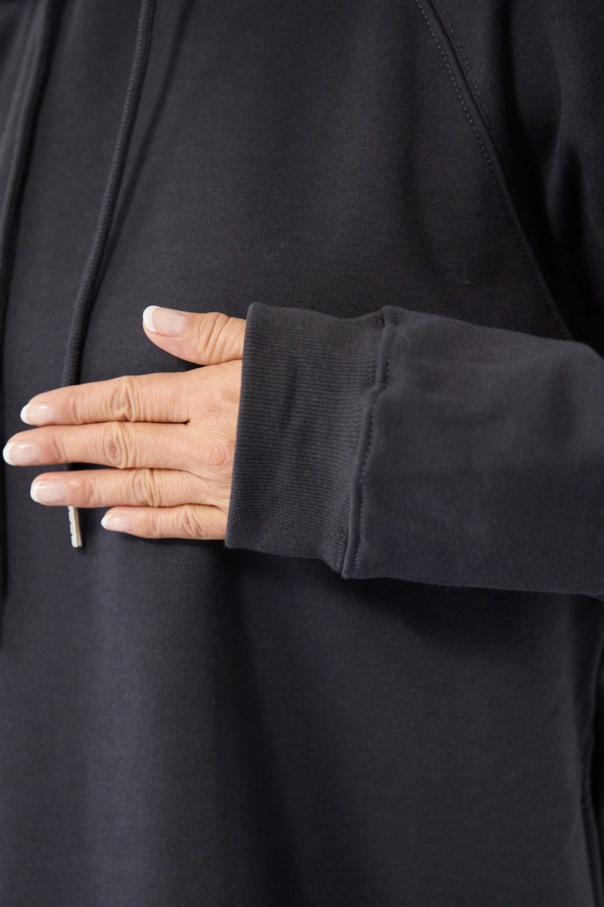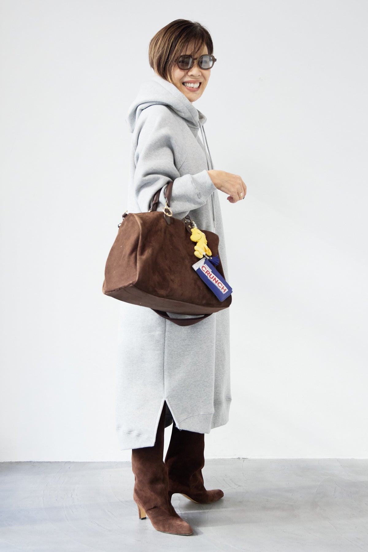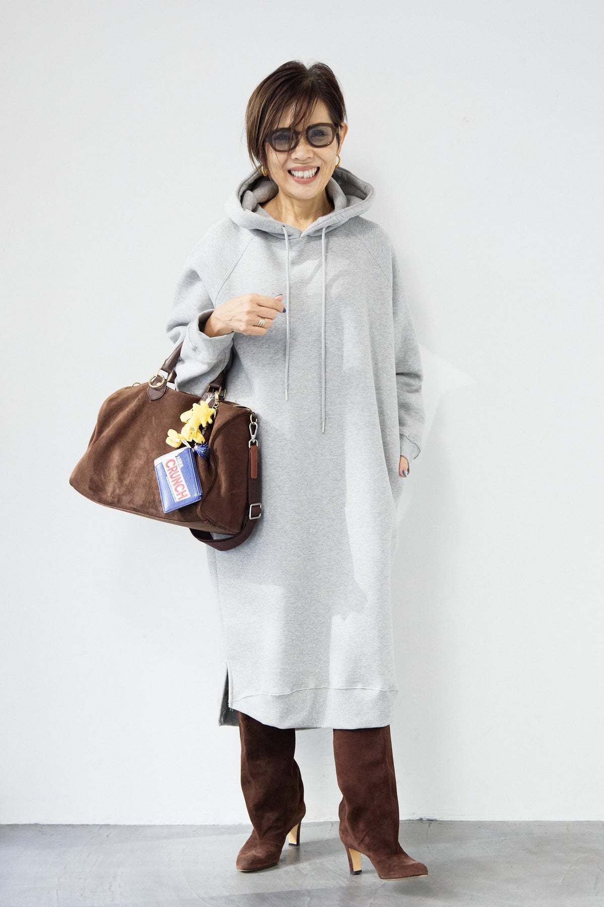 リラクシーな着心地と大人の抜け感を両立した、裏起毛スウェット素材のフーディワンピース。ゆったりとしたシルエットながらも、ラグランスリーブや程よいIラインがすっきりとした印象を演出します。両サイドのスリットが軽やかな動きを生み、ロングブーツとの相性も抜群。 デイリーはもちろん、ワンマイルウェアとしても活躍する万能アイテムです。